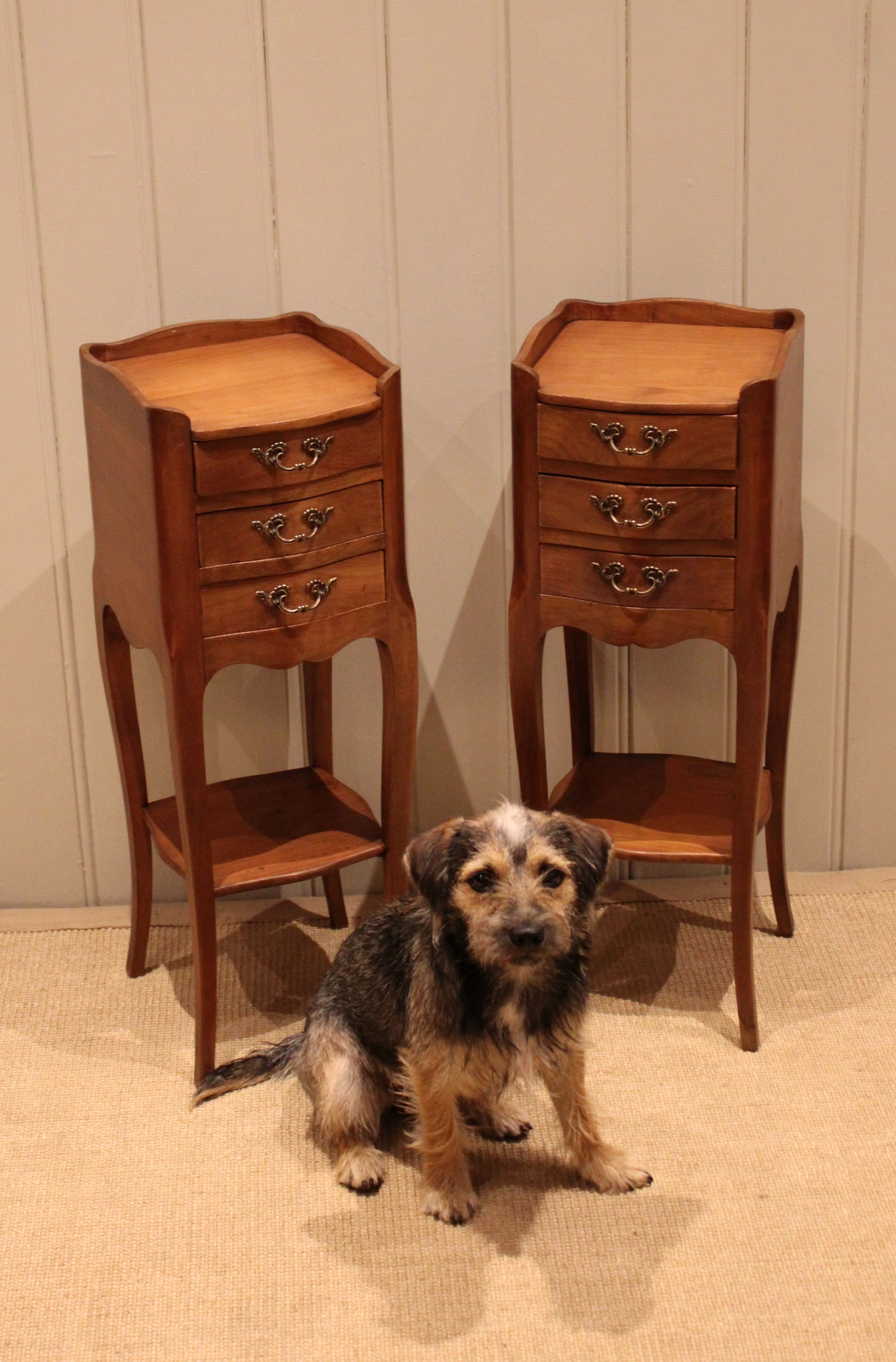 Pair of French cherry wood small proportioned bedside cabinets having three drawers , with an undertier ,raised on outsplayed legs .