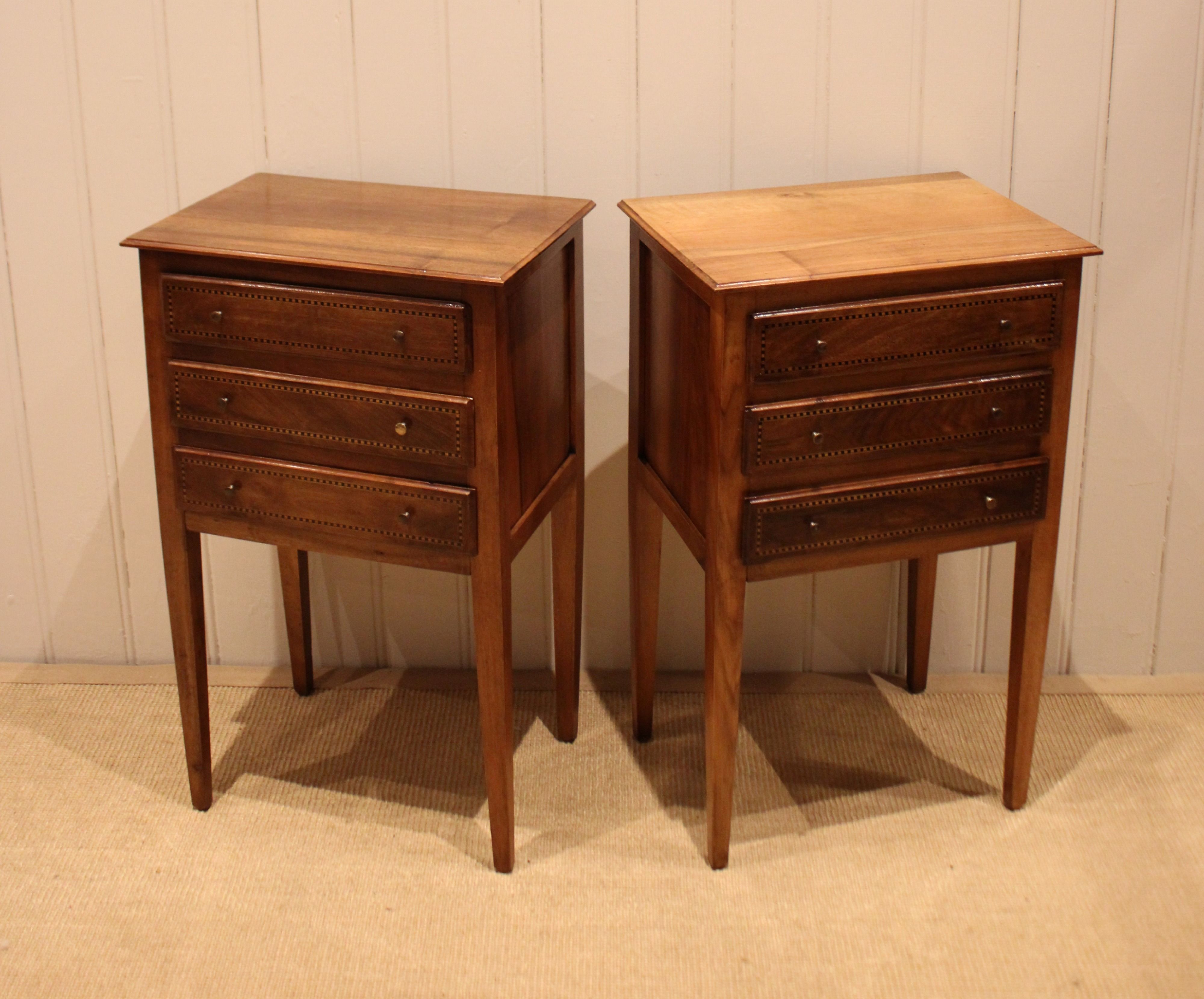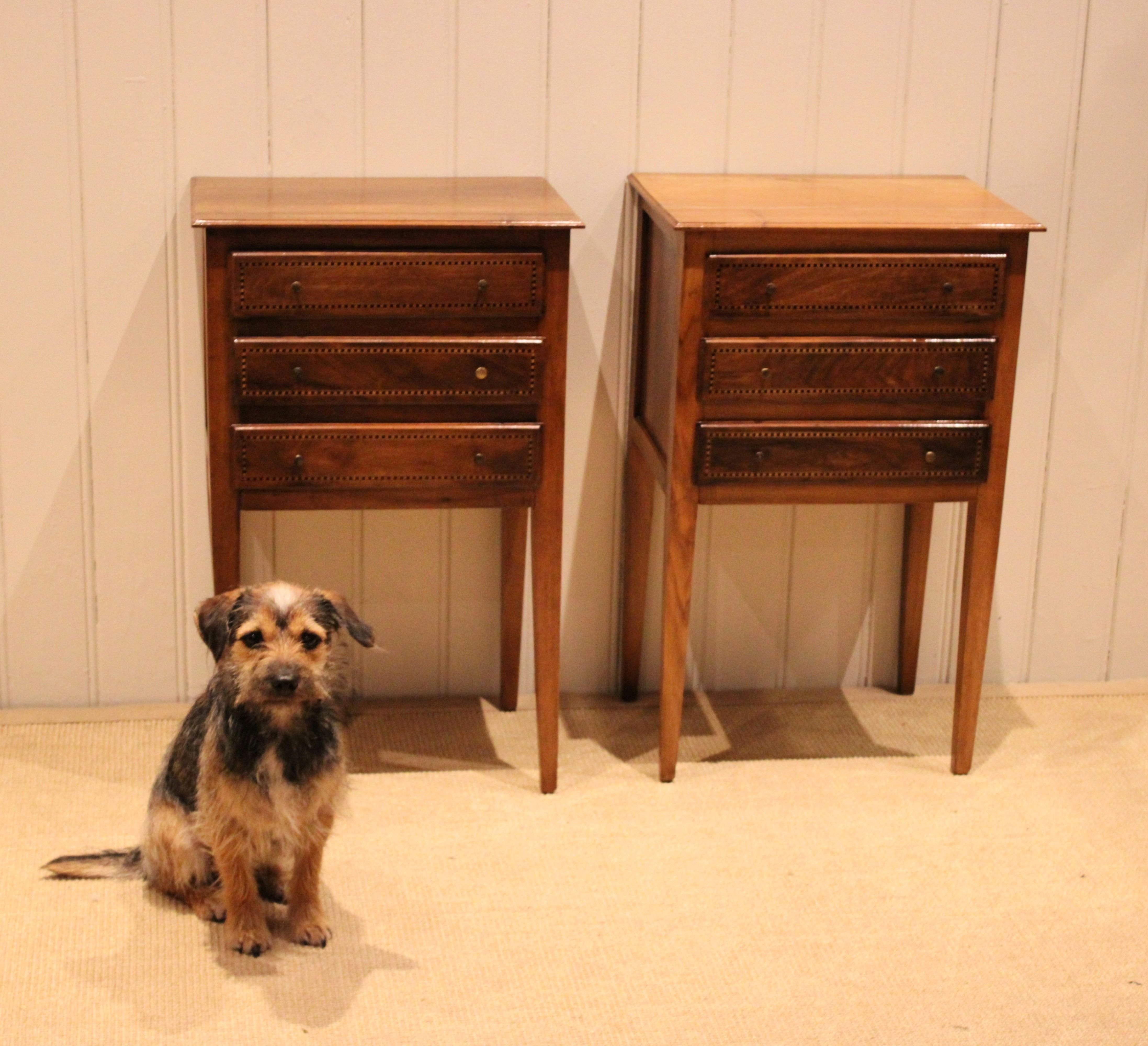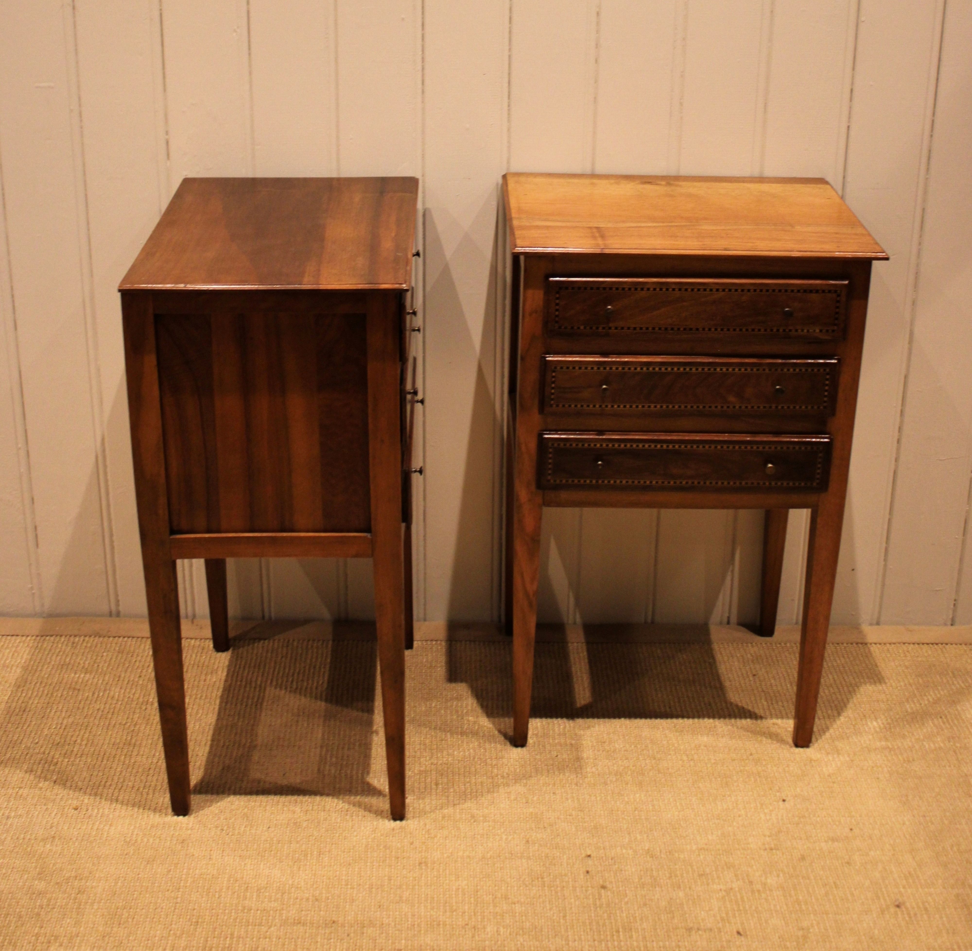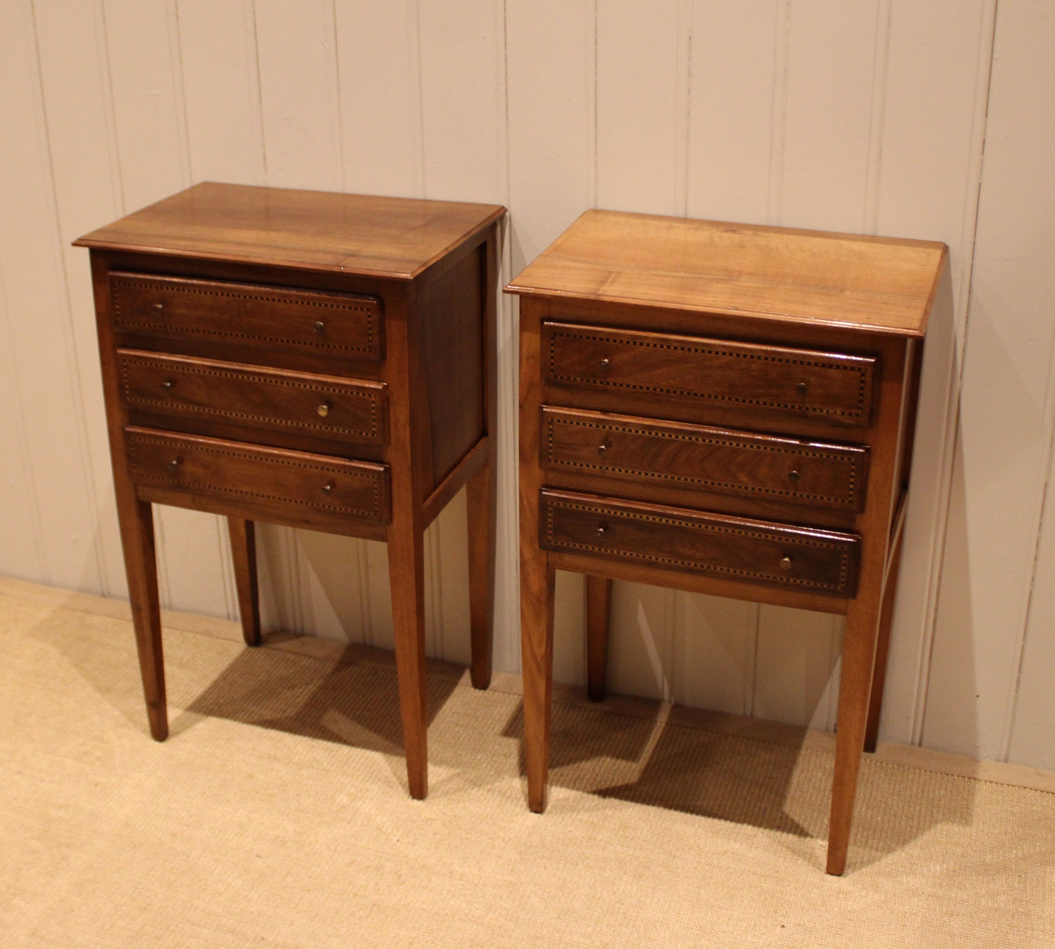 Pair of walnut bedside cabinets having three drawers each with inlaid edges and brass handles, raised on straight tapering legs .