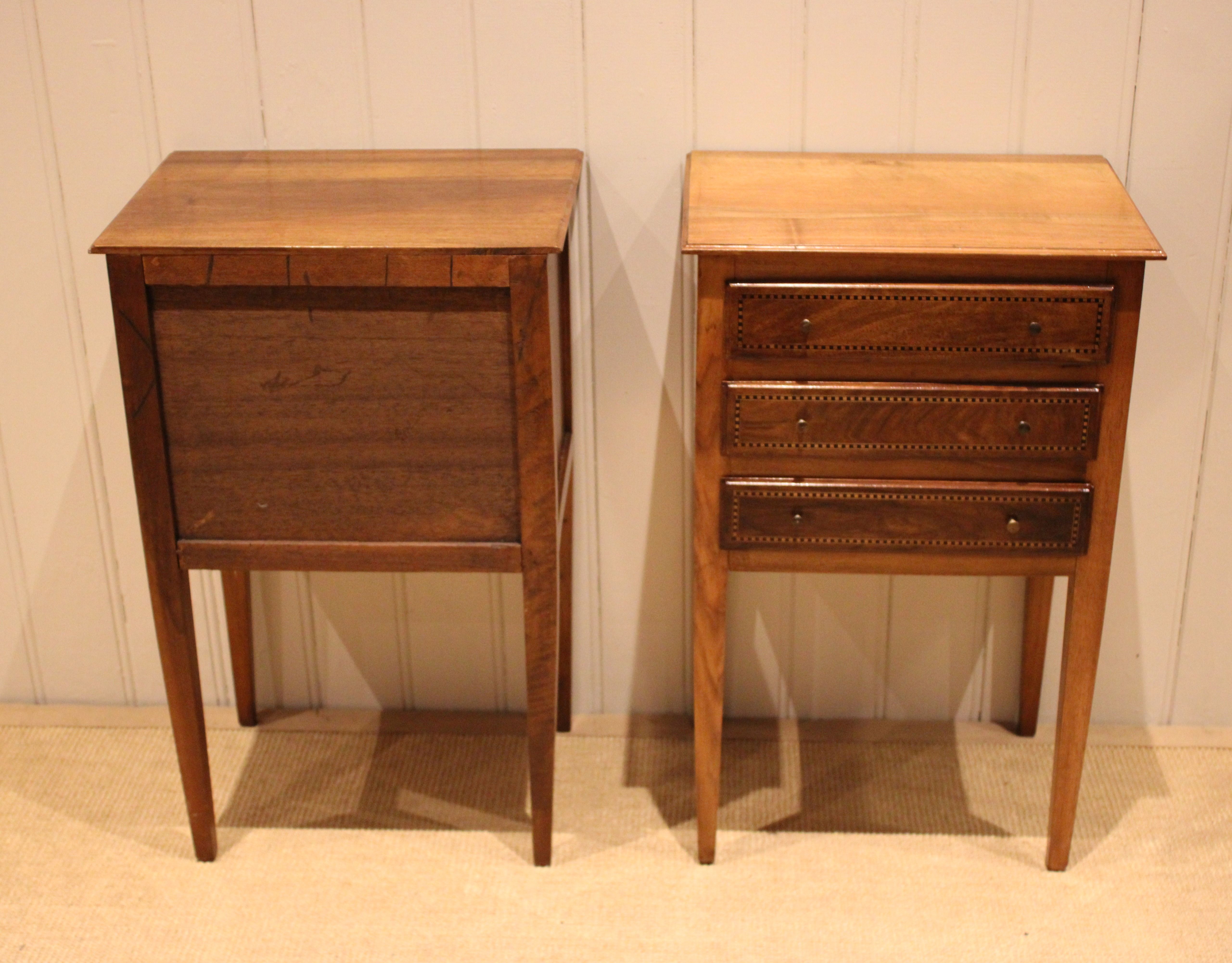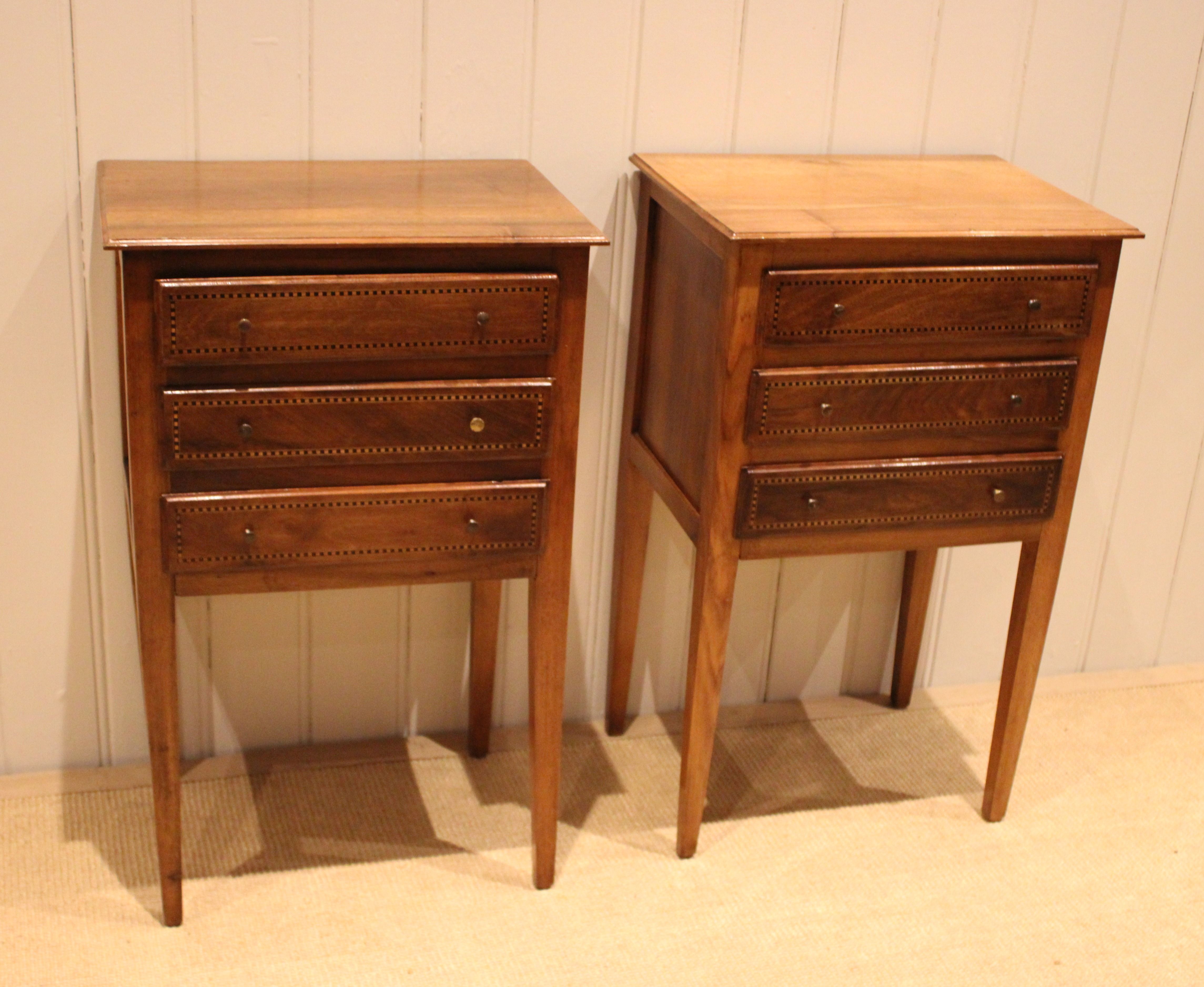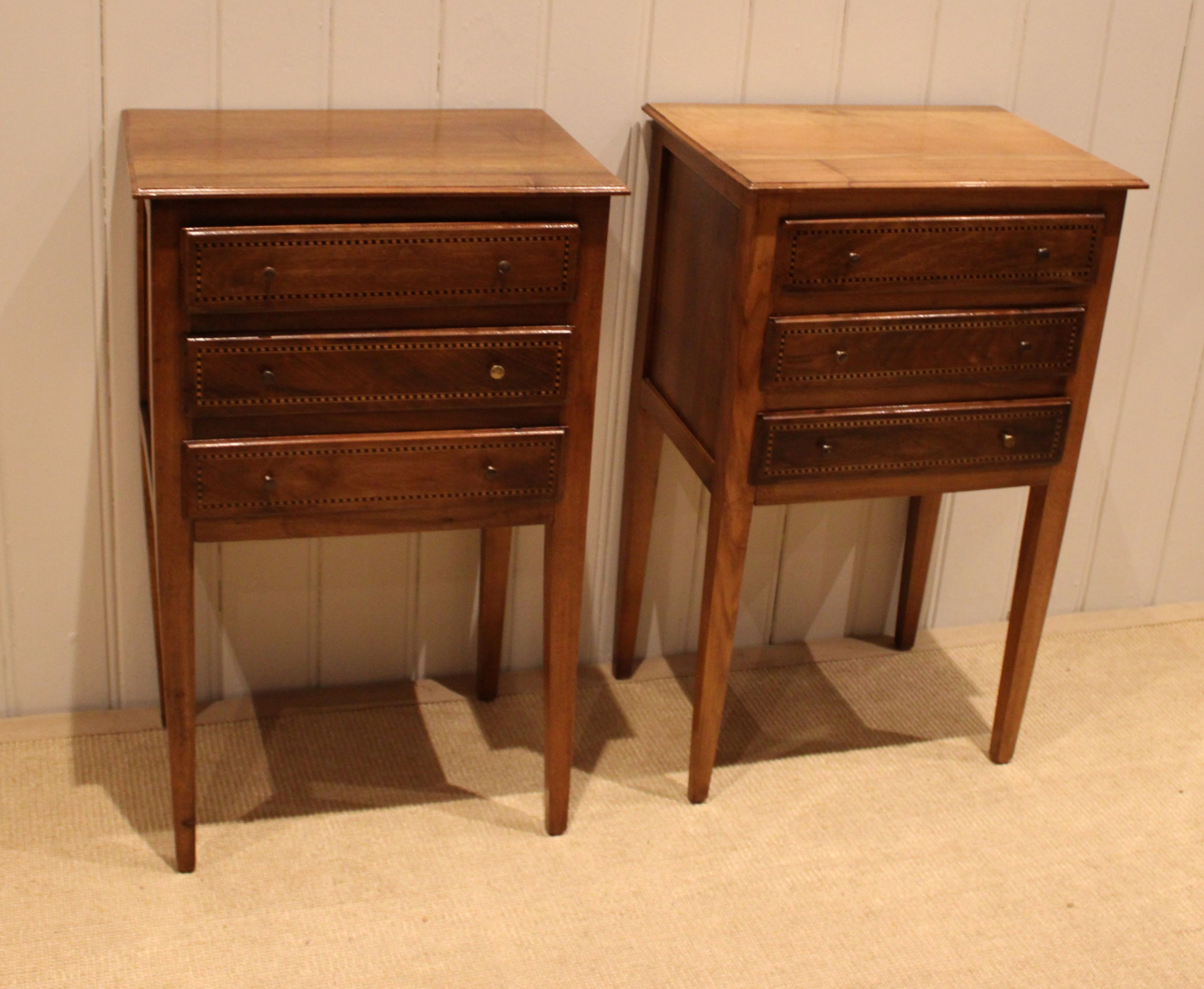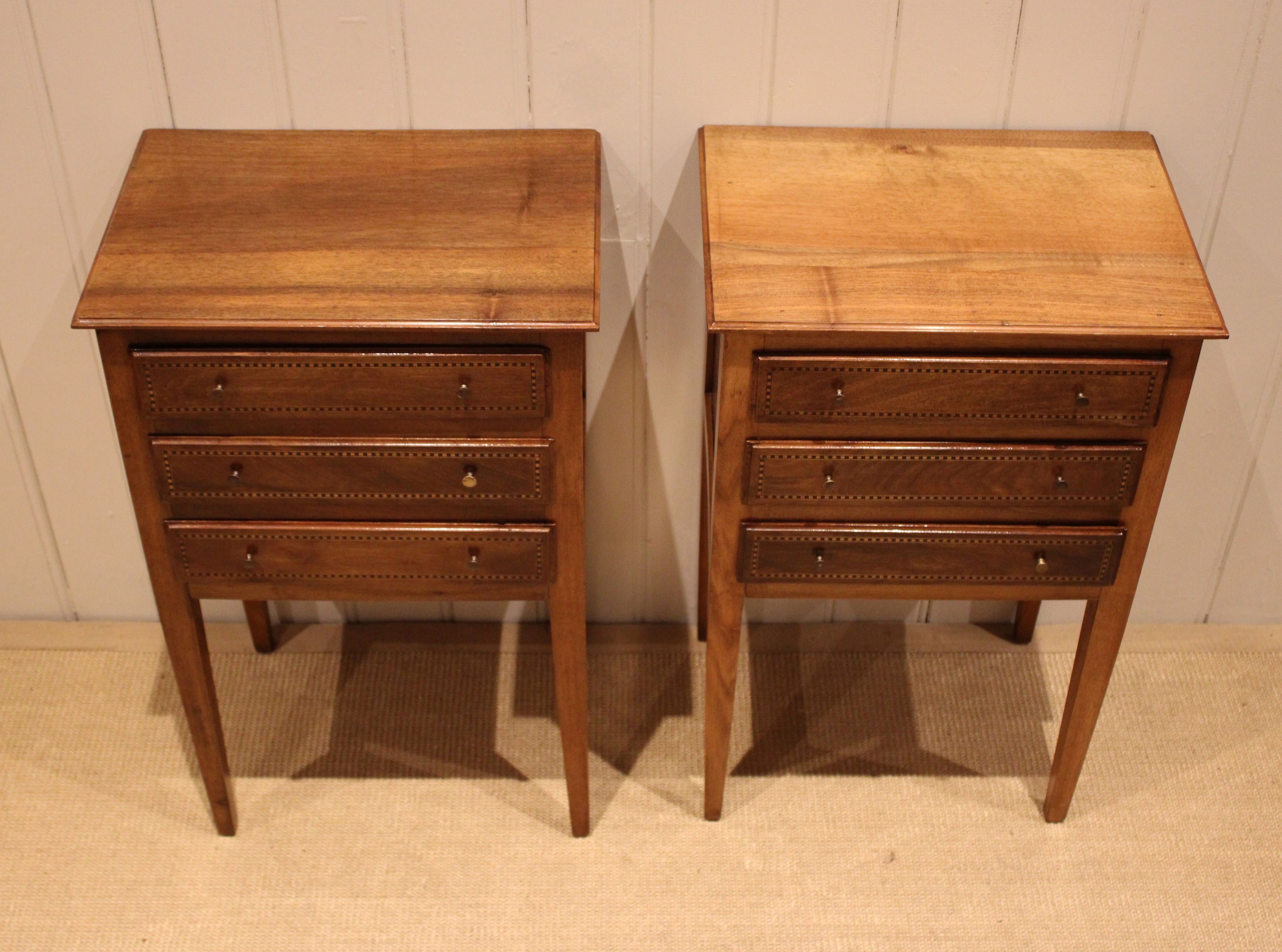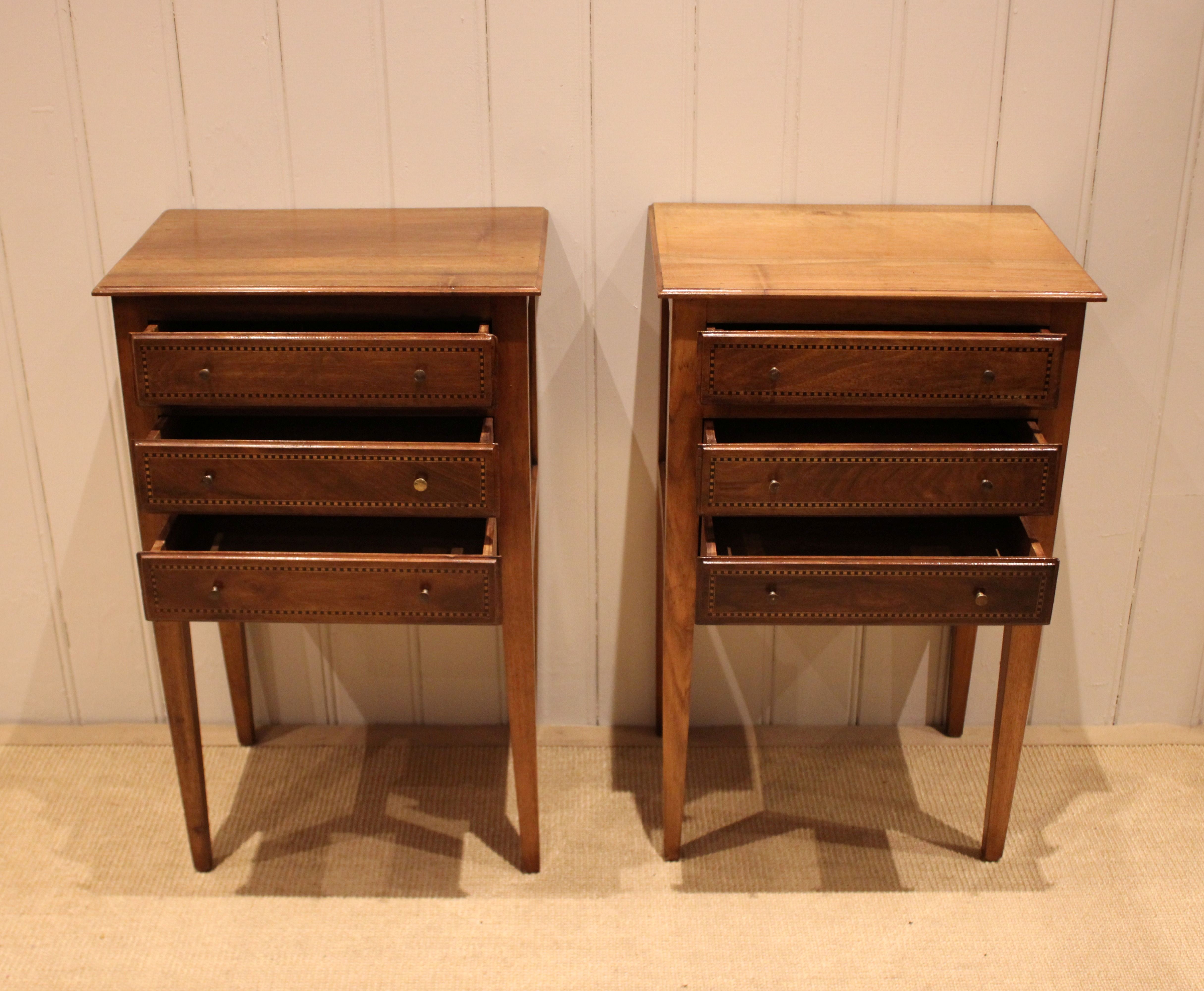 Pair of walnut bedside cabinets having three drawers each with inlaid edges and brass handles, raised on straight tapering legs .