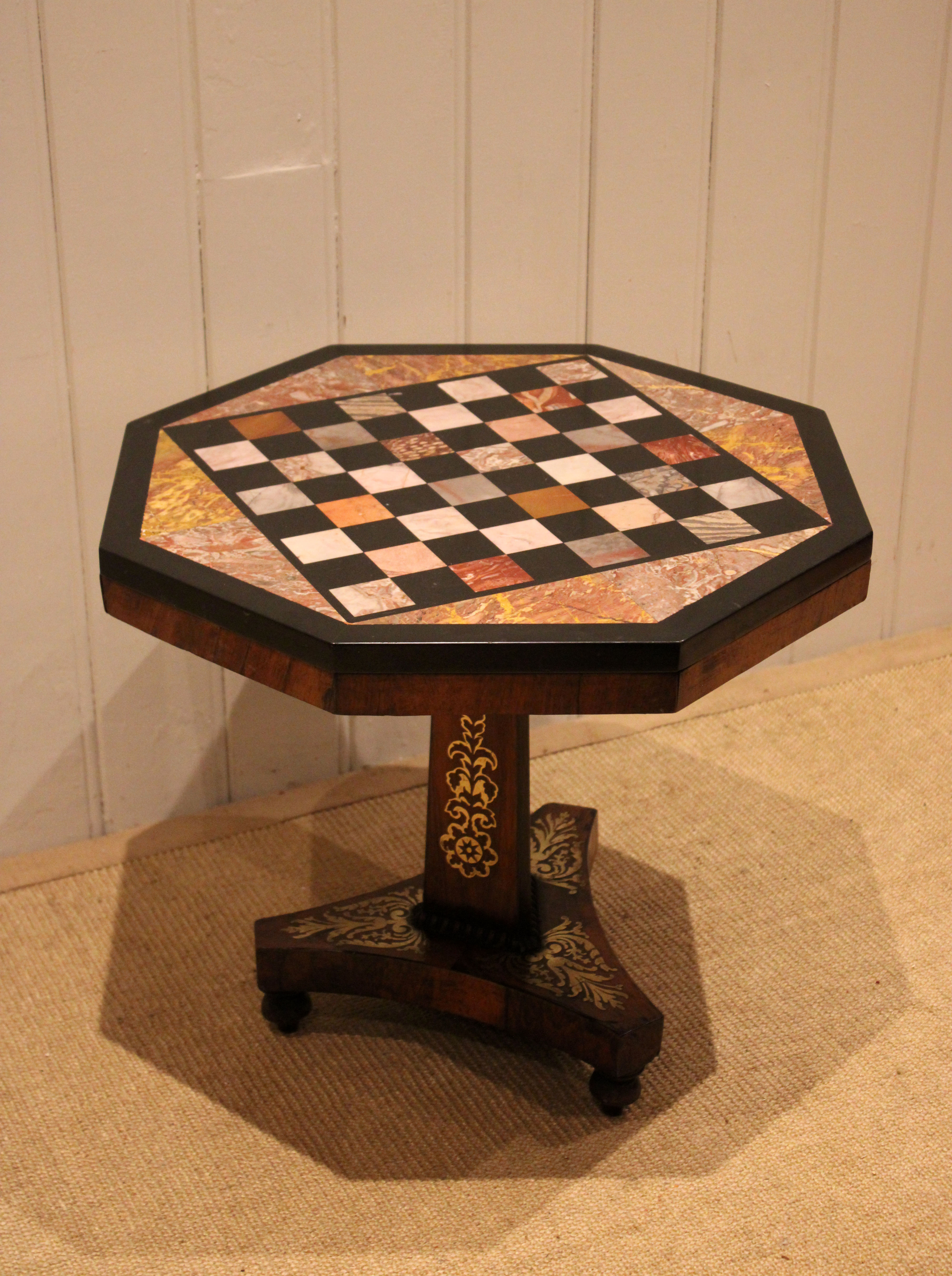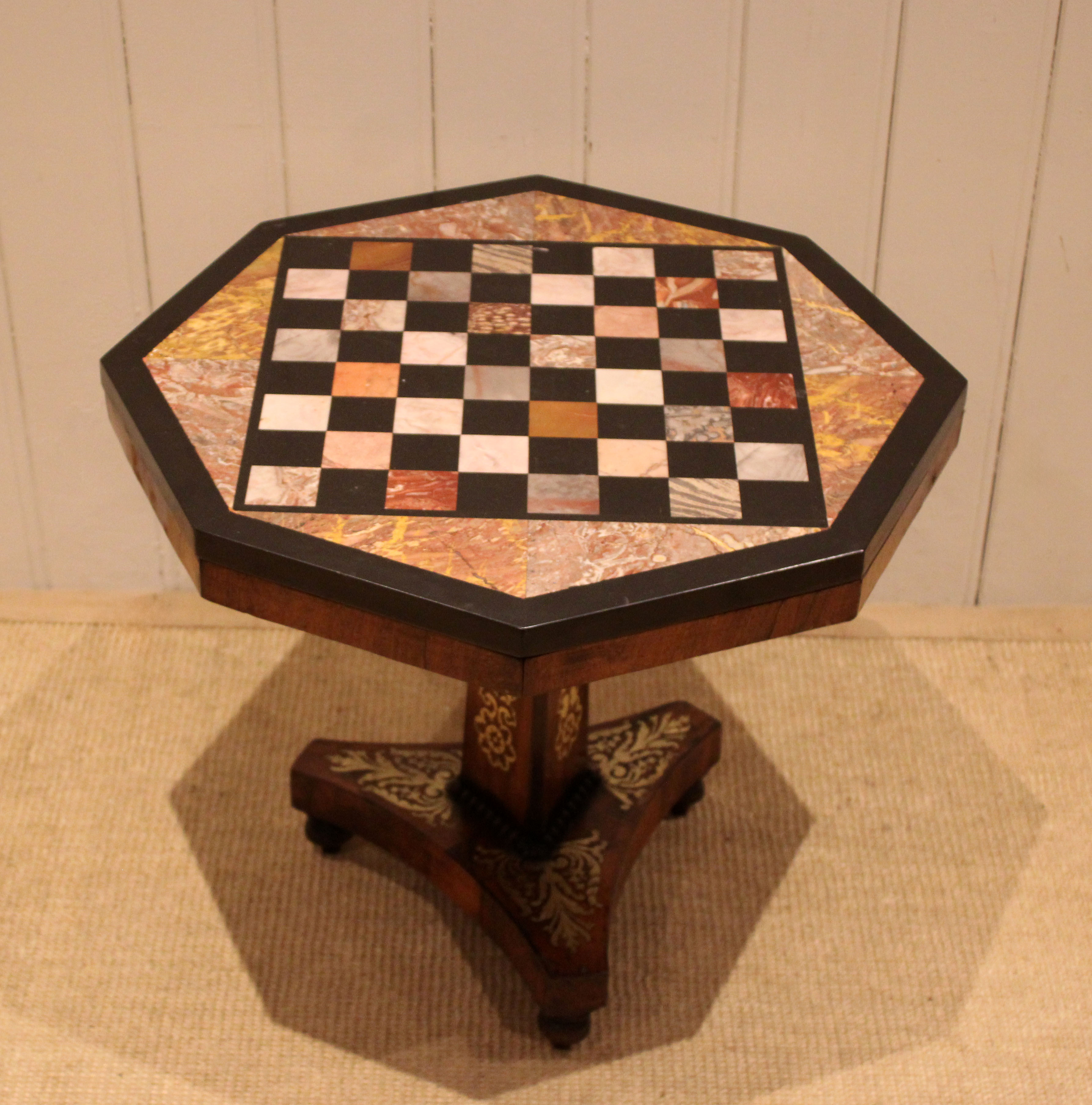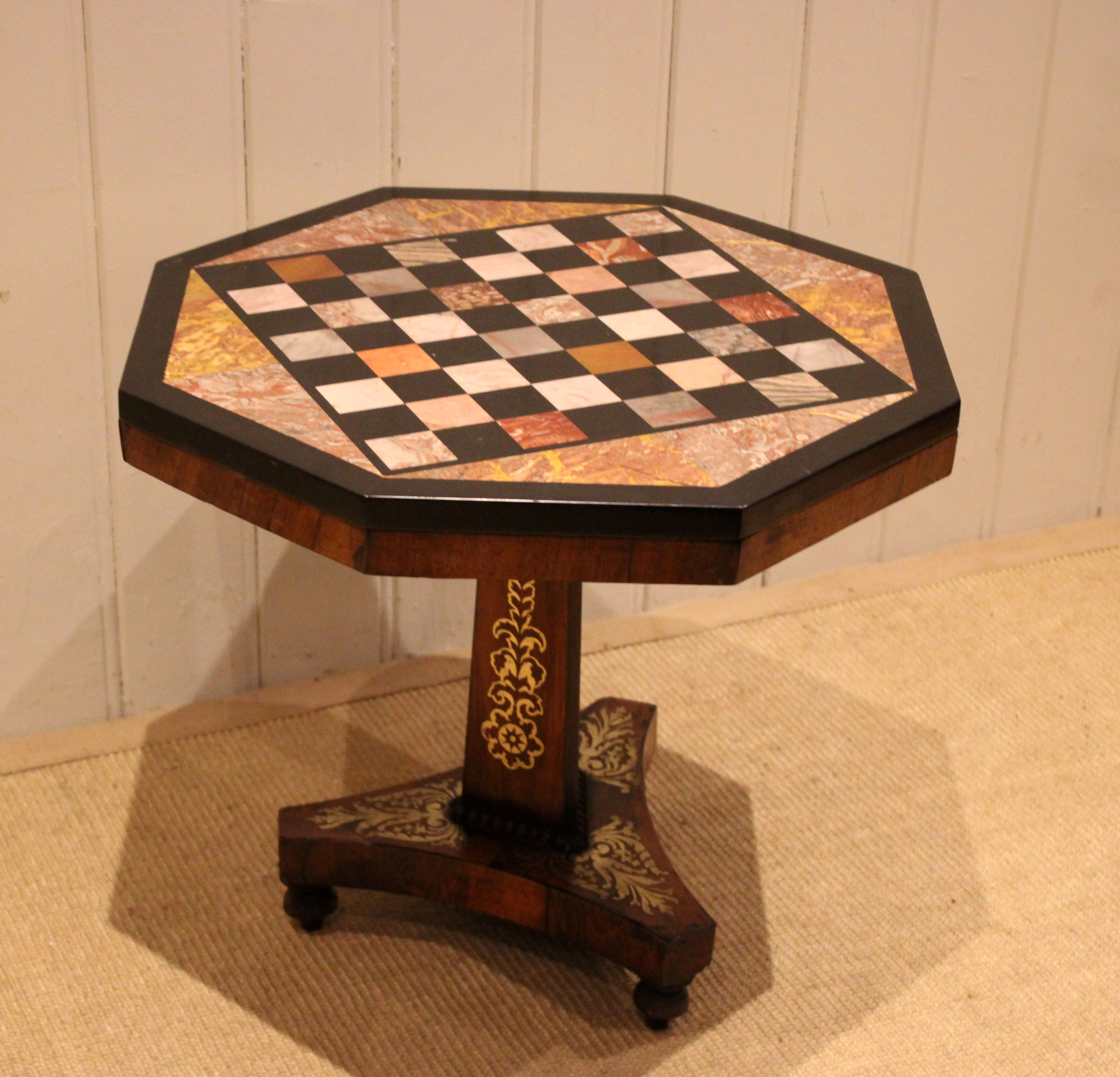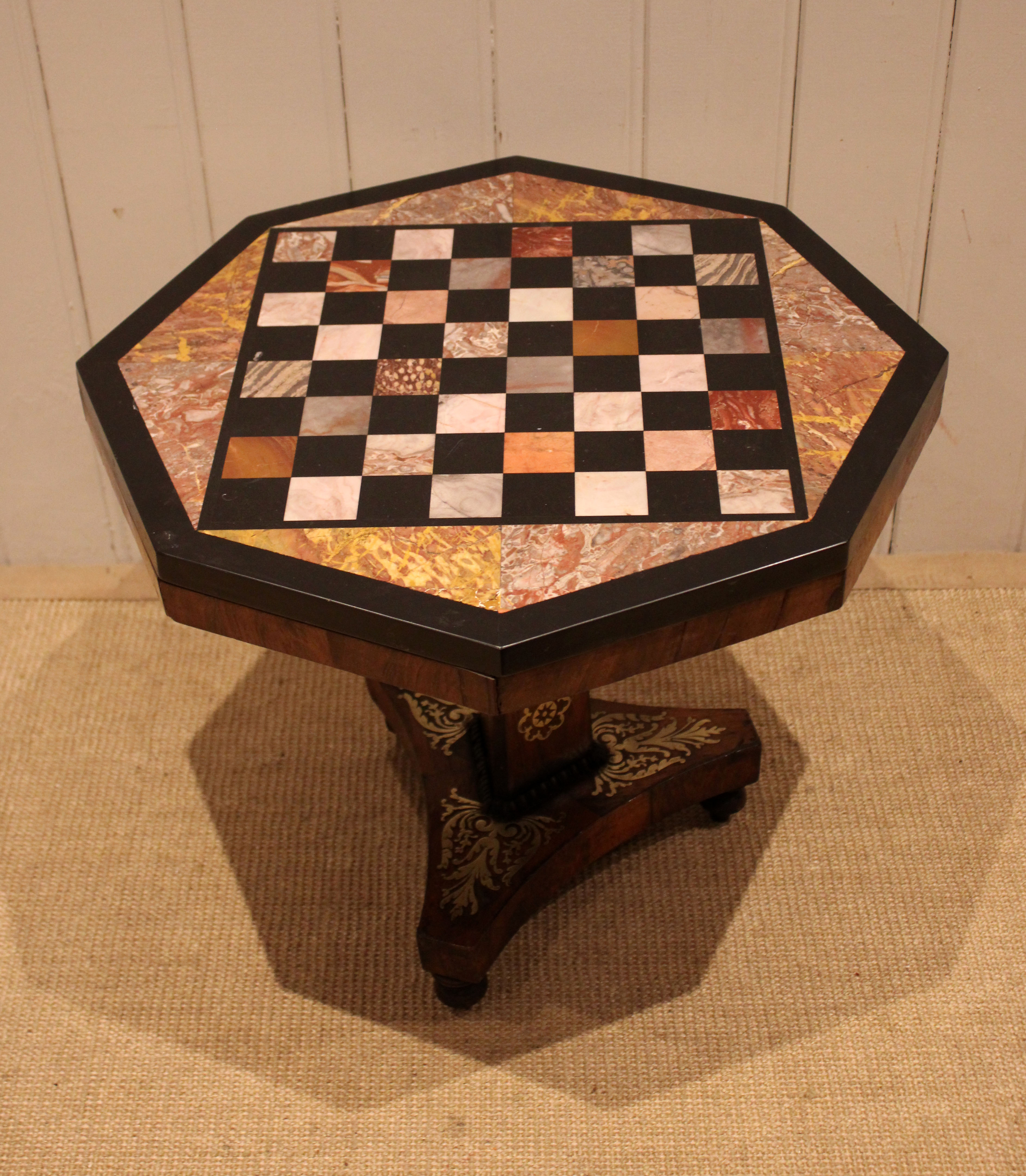 Regency rosewood table having brass inlay to the triform platform base with an octagonal top inset with a specimen marble chess board .