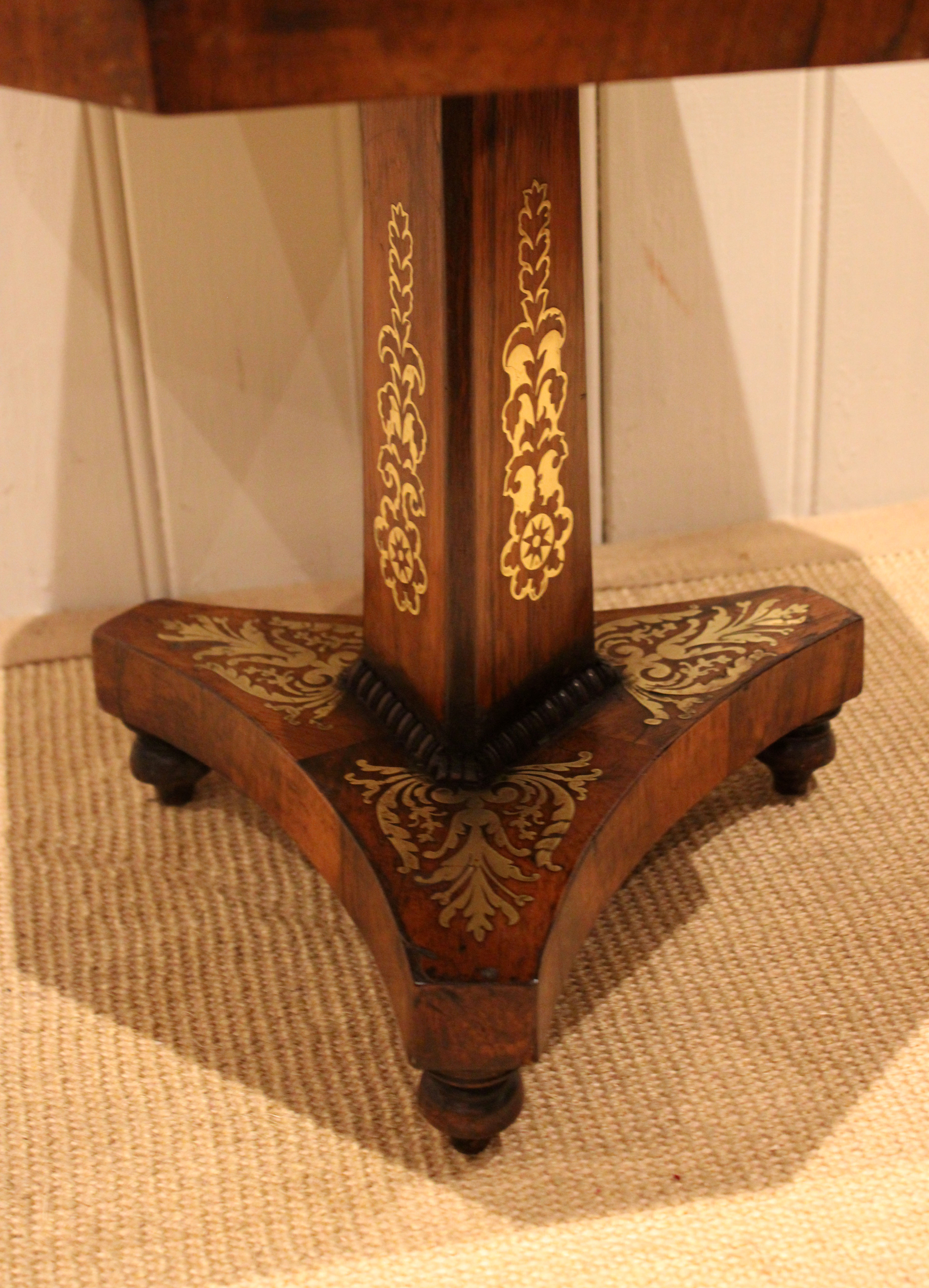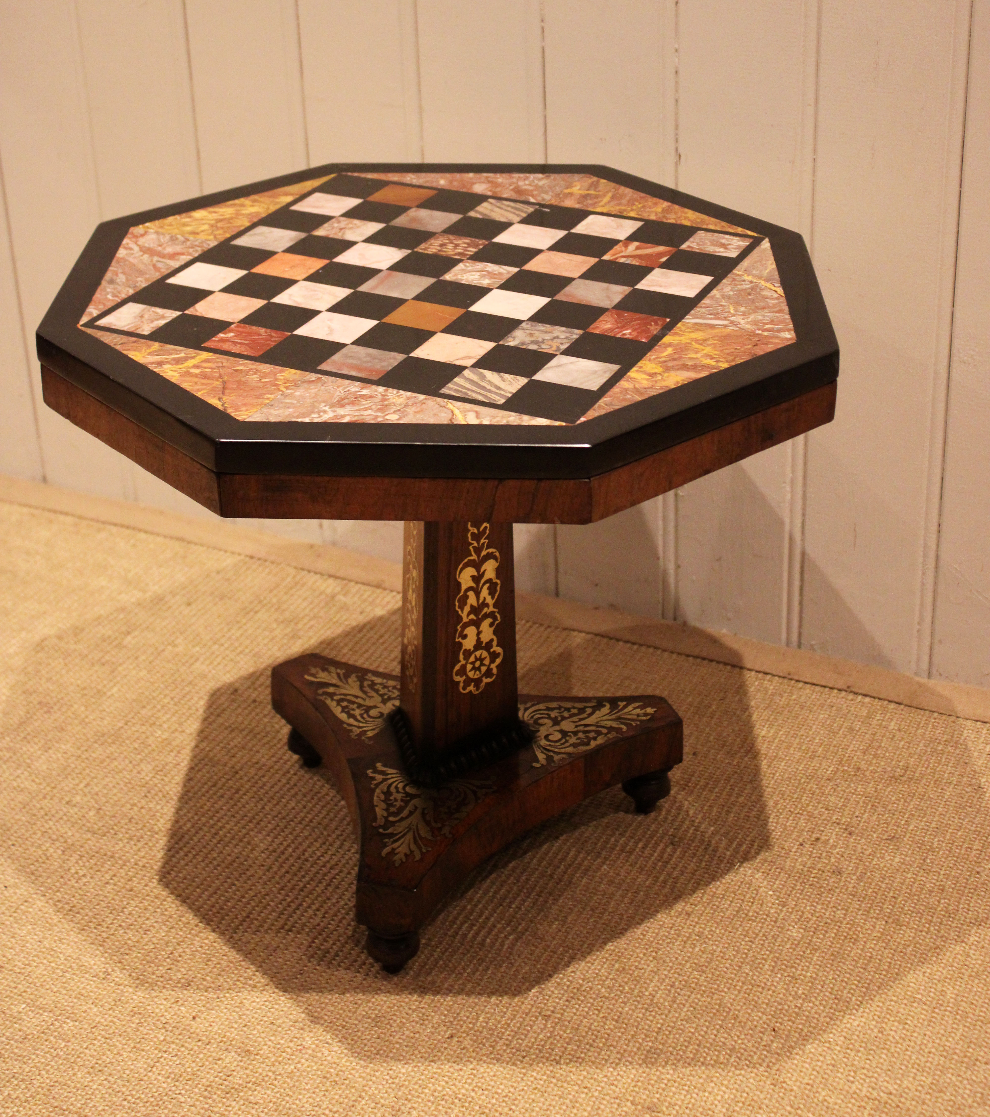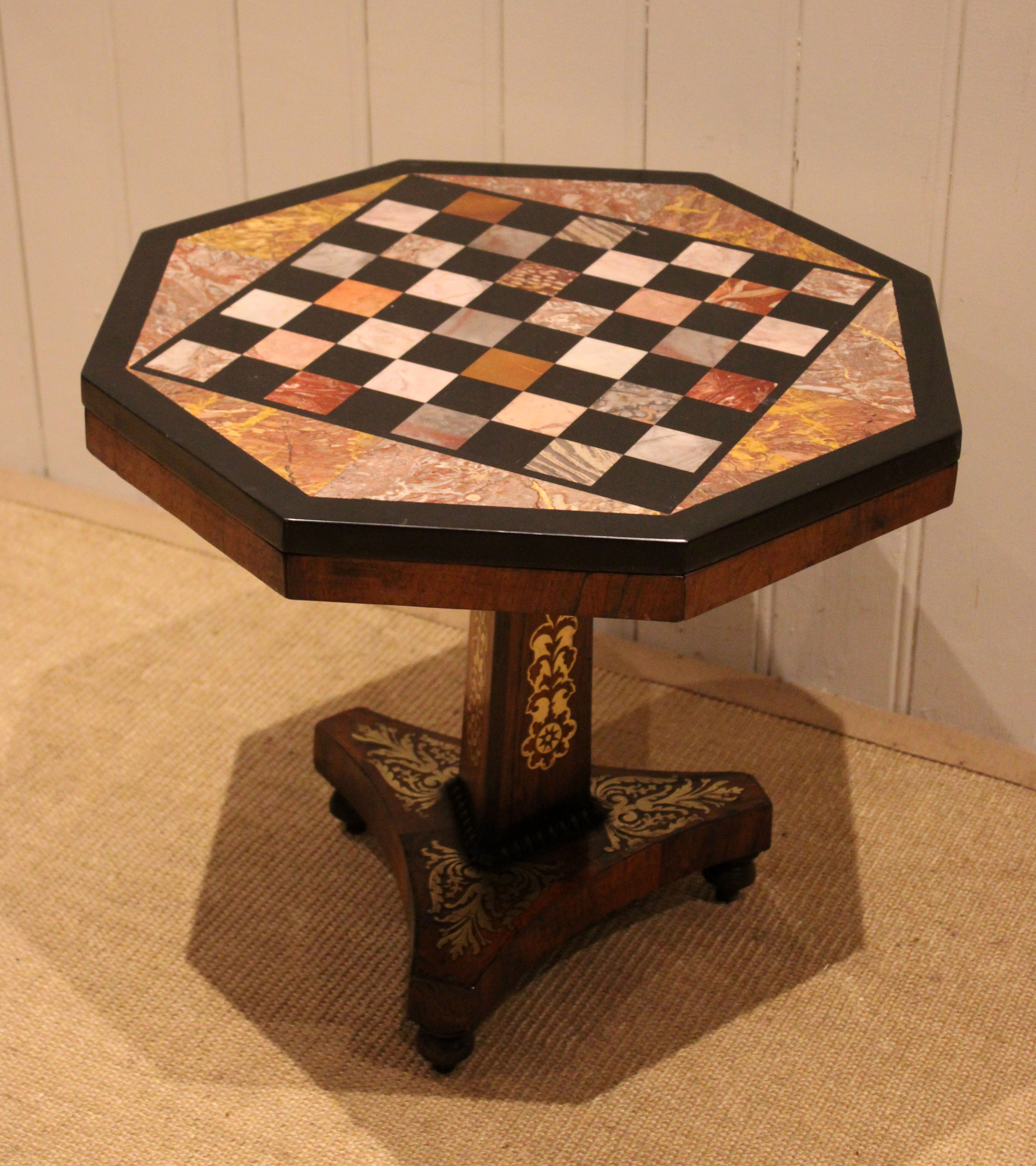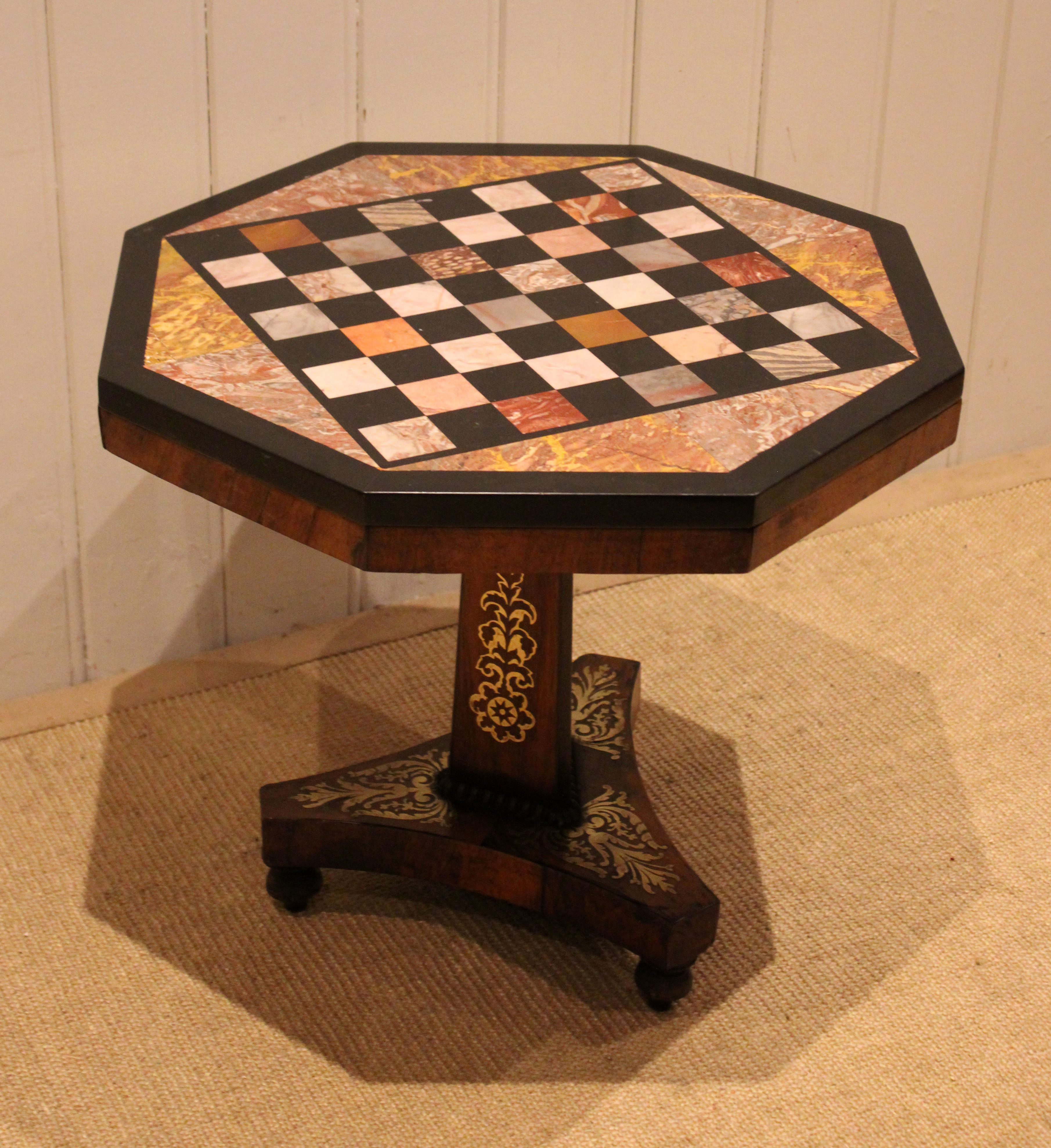 Regency rosewood table having brass inlay to the triform platform base with an octagonal top inset with a specimen marble chess board .