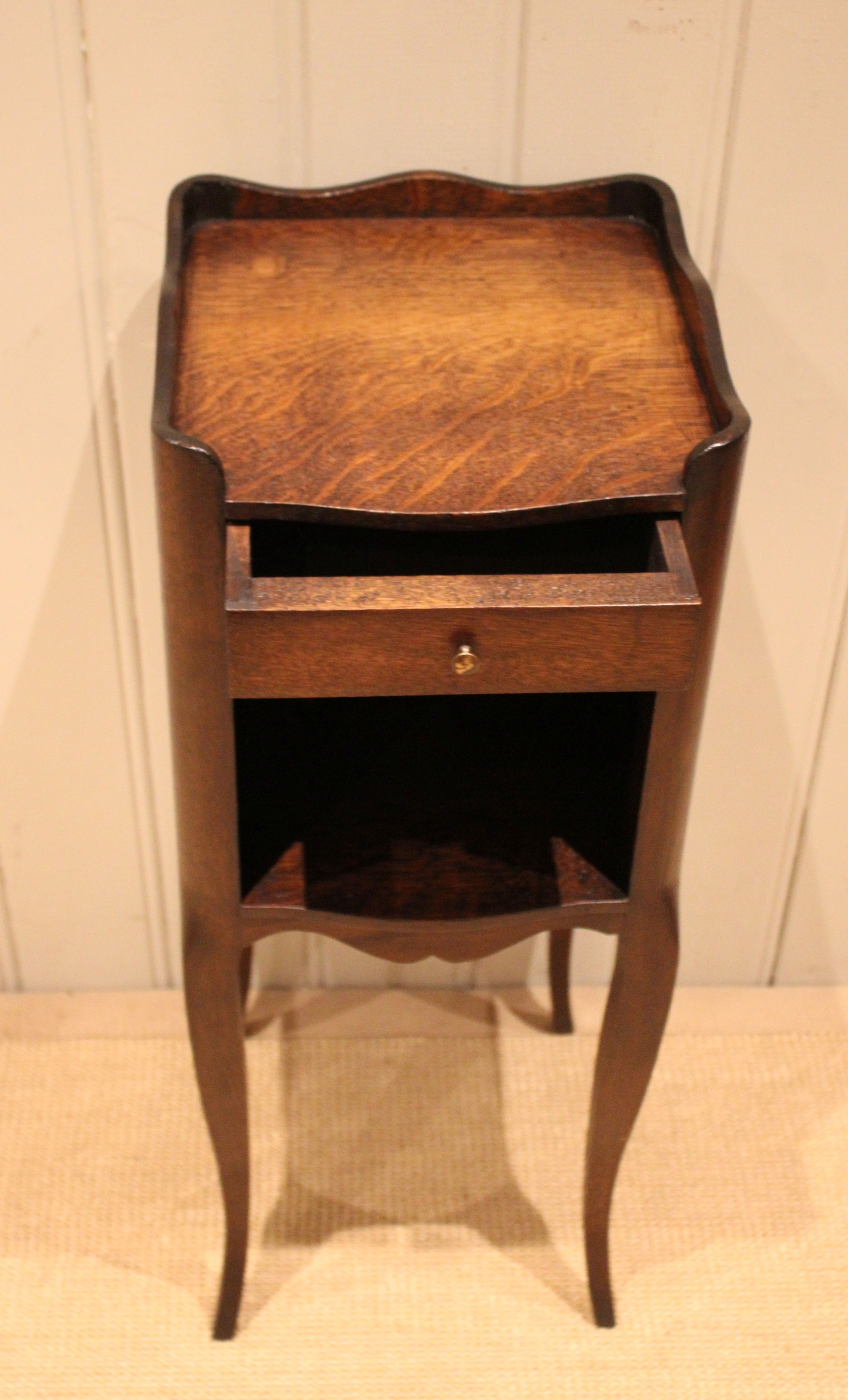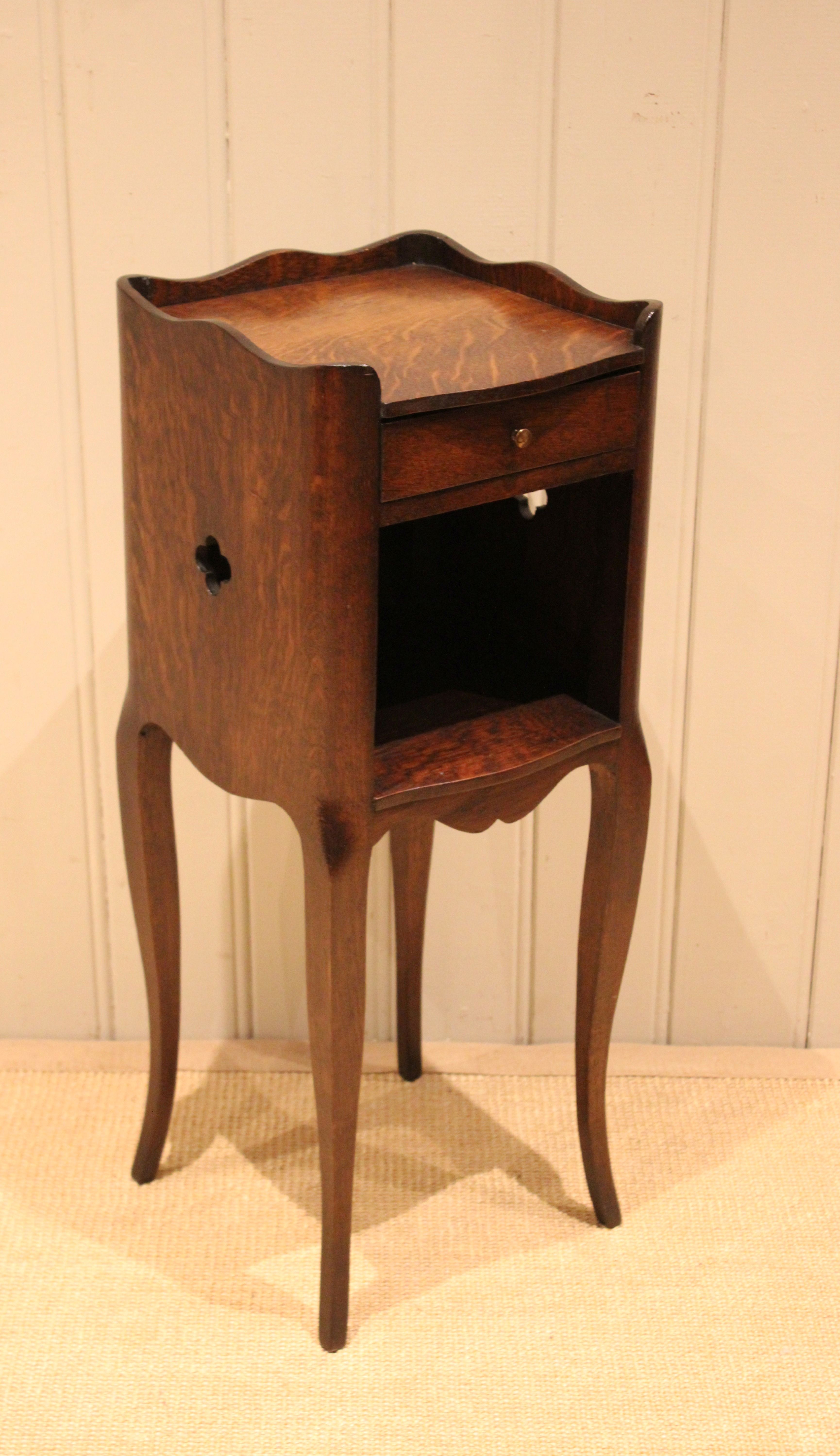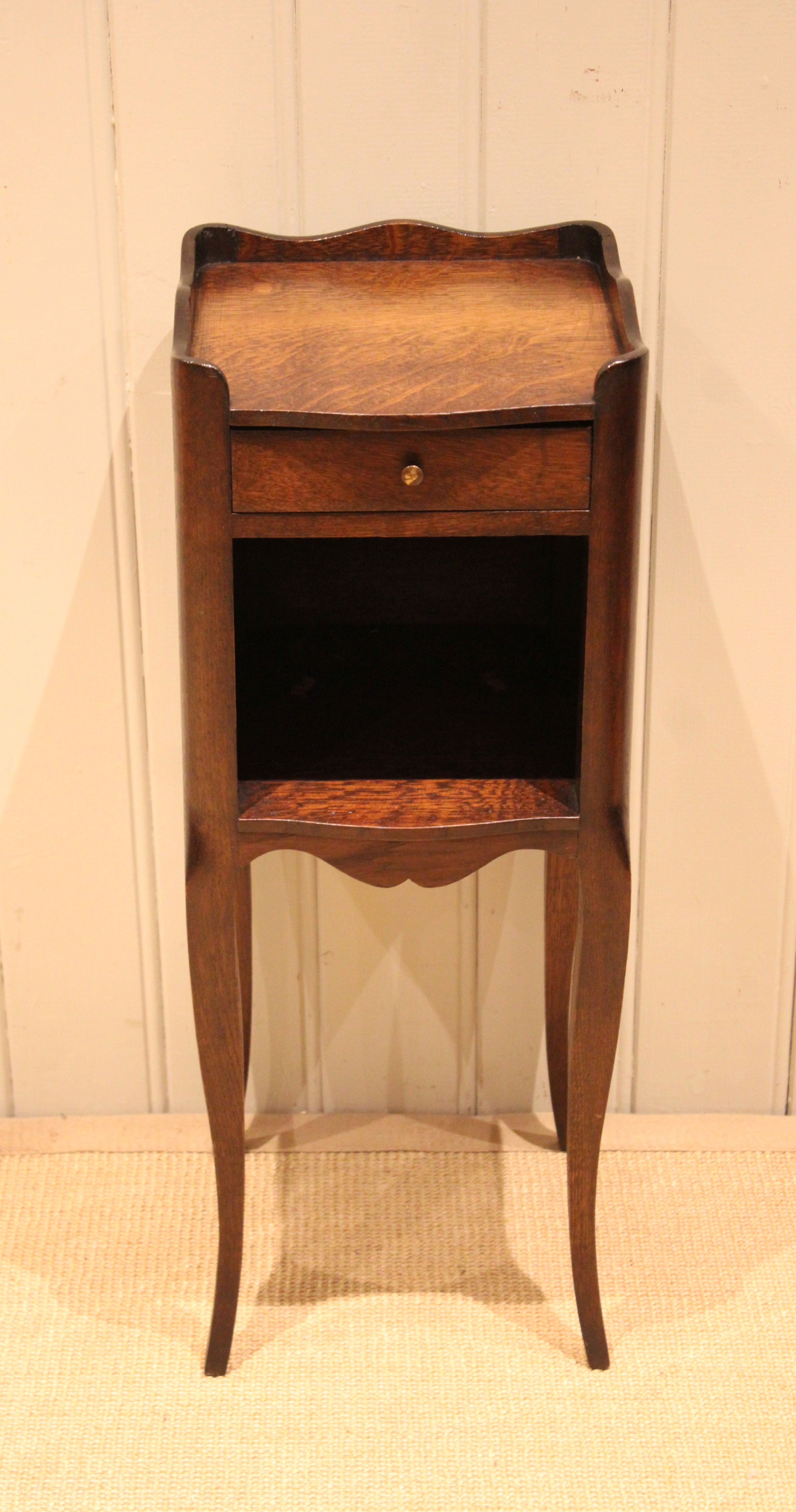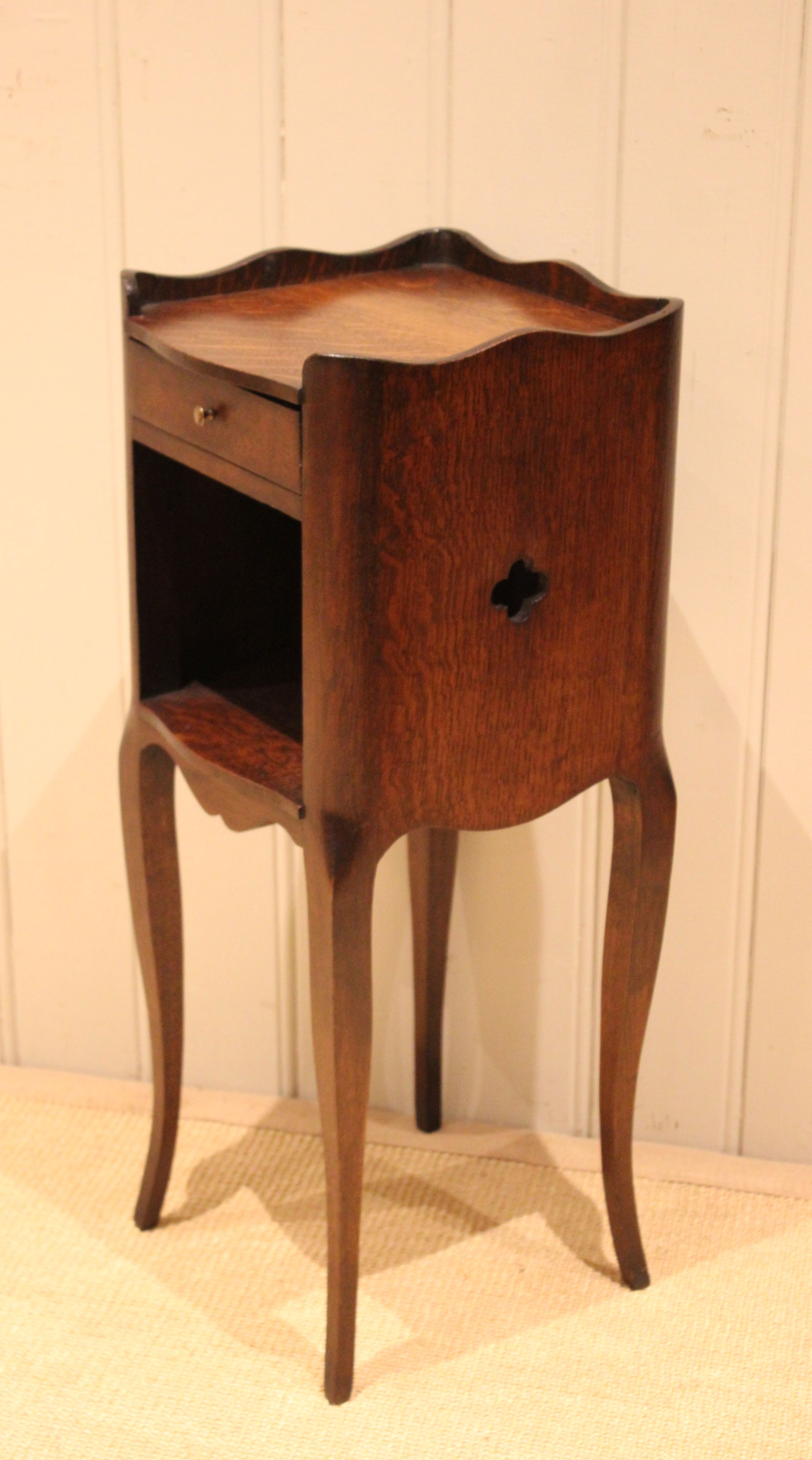 Single oak bedside cabinet having a pierced clover leaf to each side with a single drawer above an open cupboard base , raised on cabriole legs .
