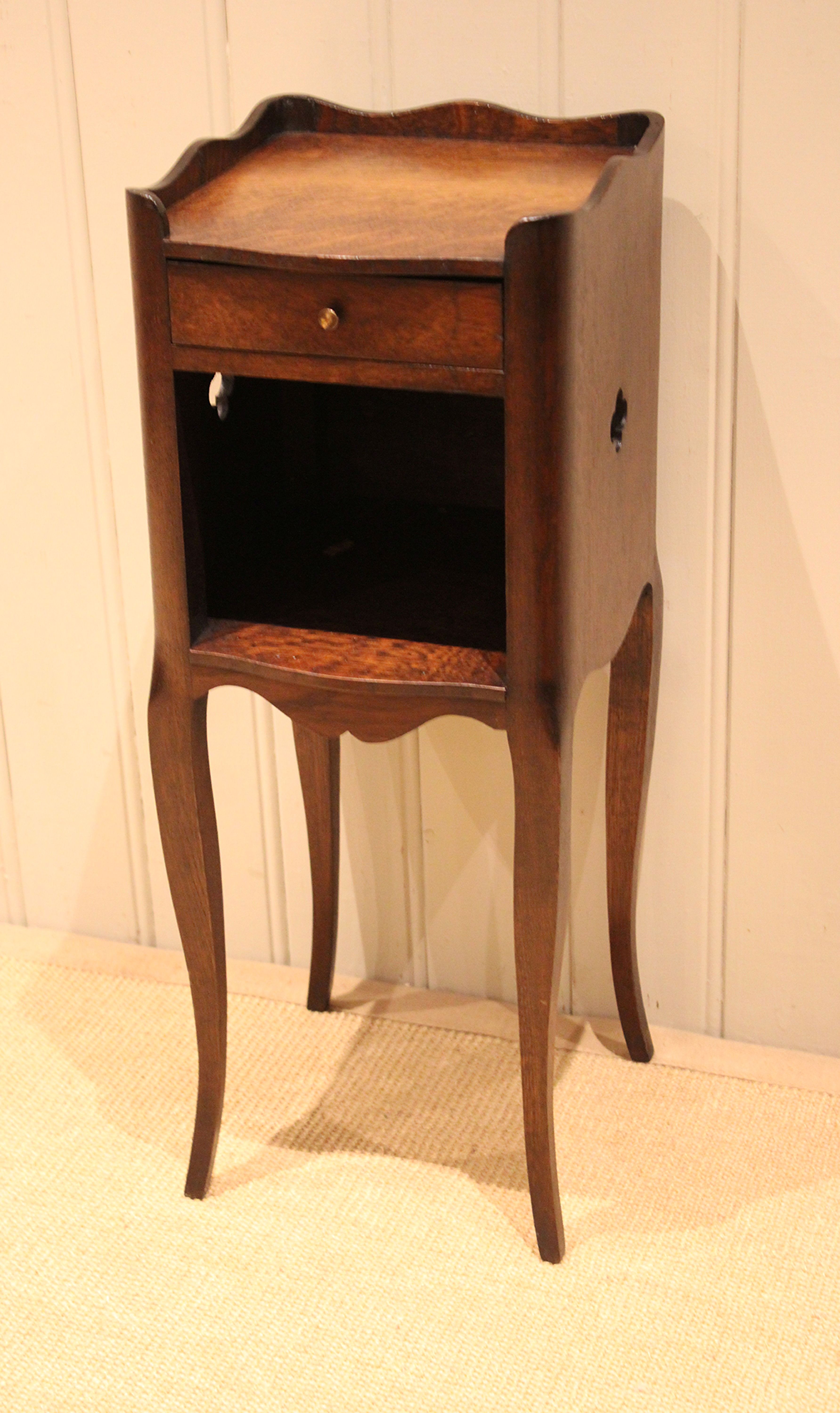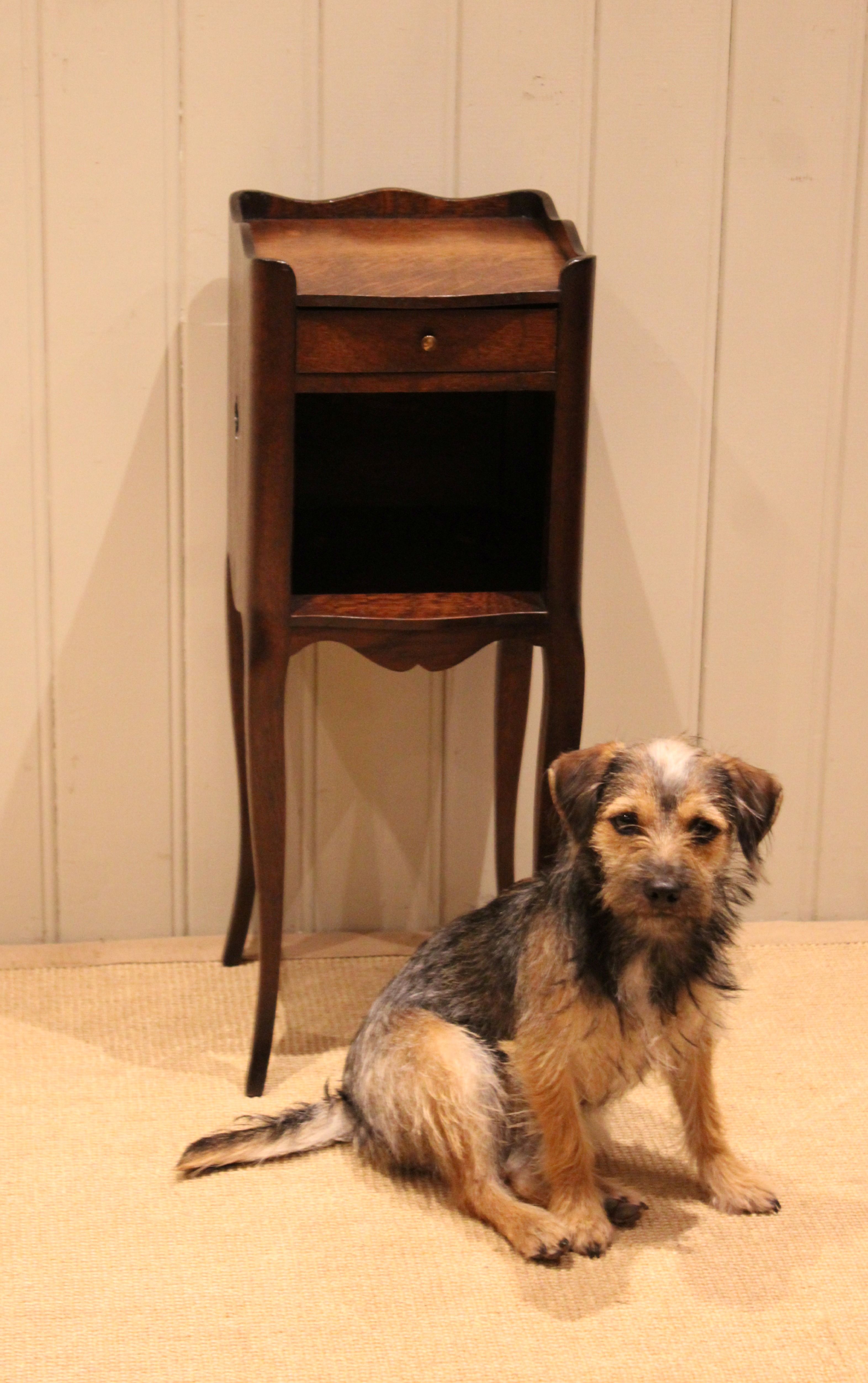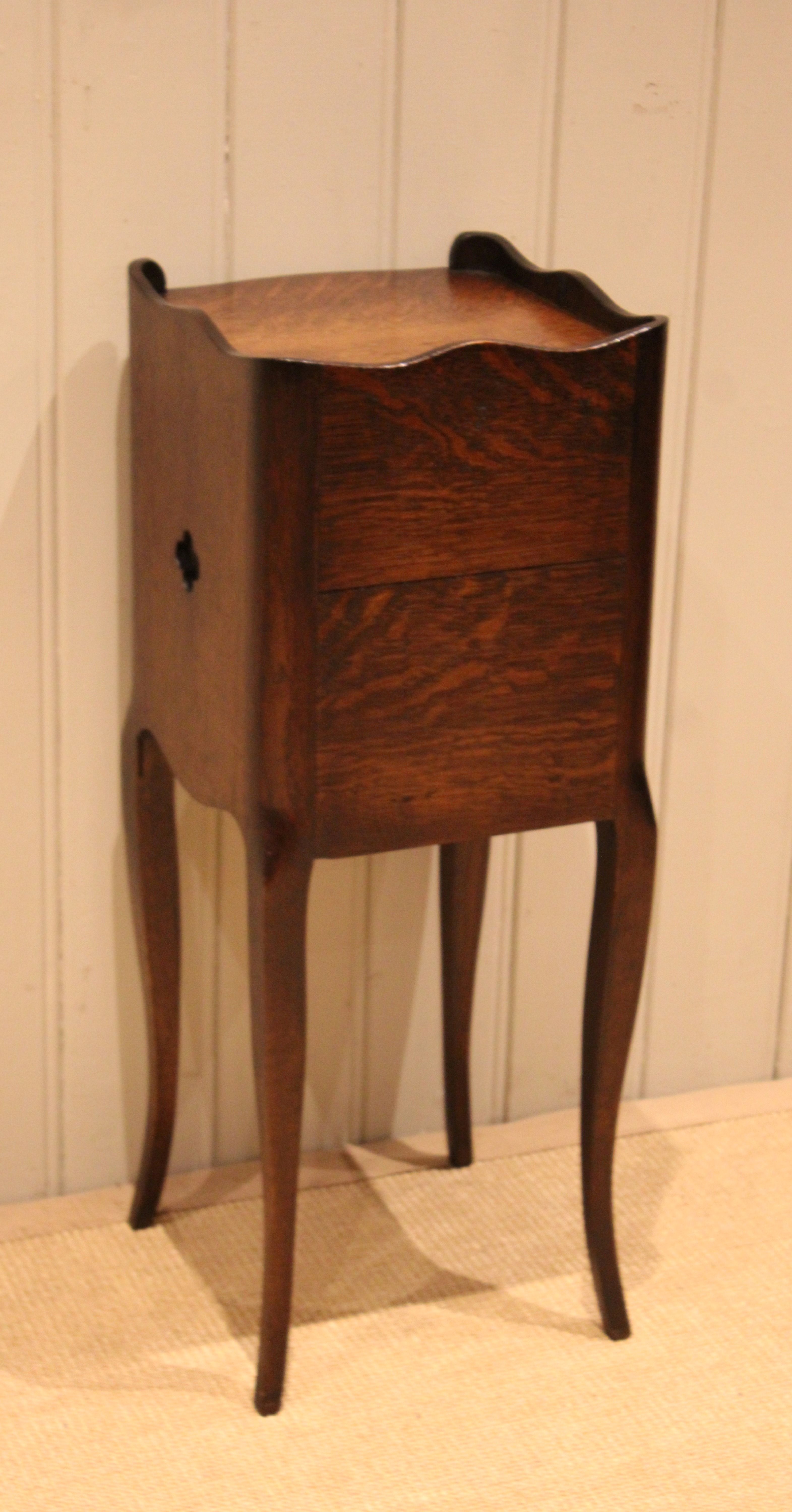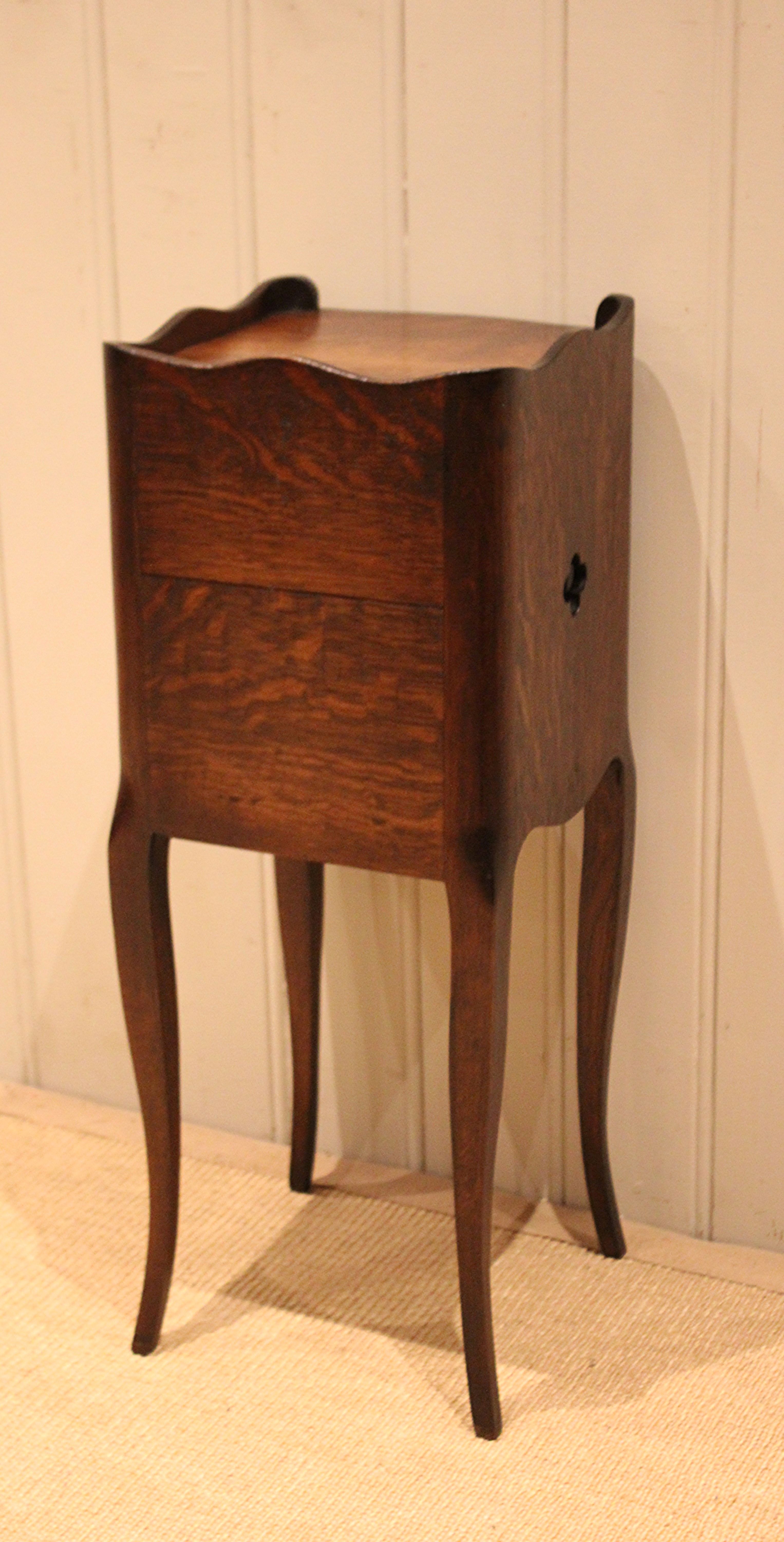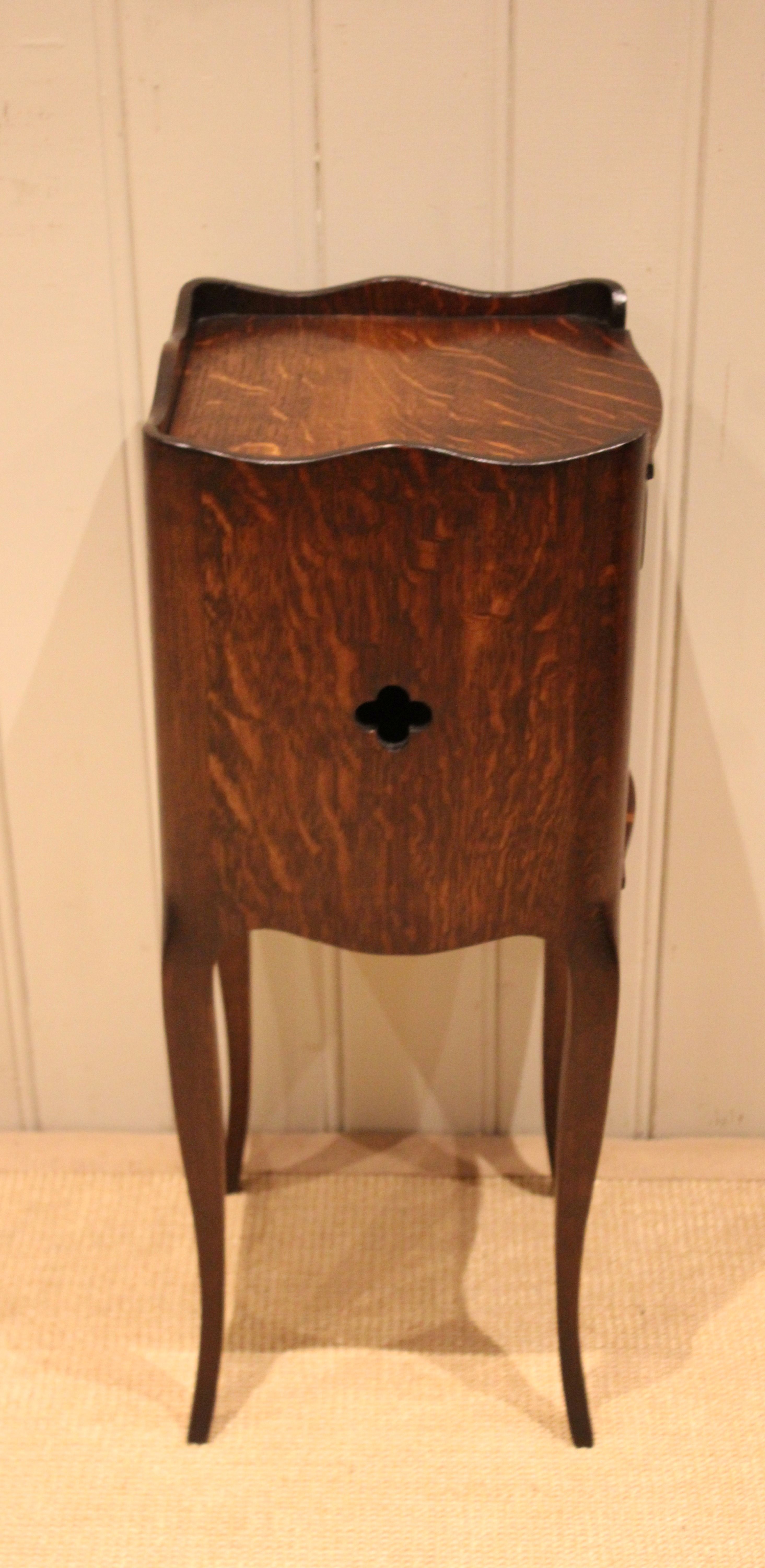Single oak bedside cabinet having a pierced clover leaf to each side with a single drawer above an open cupboard base , raised on cabriole legs .