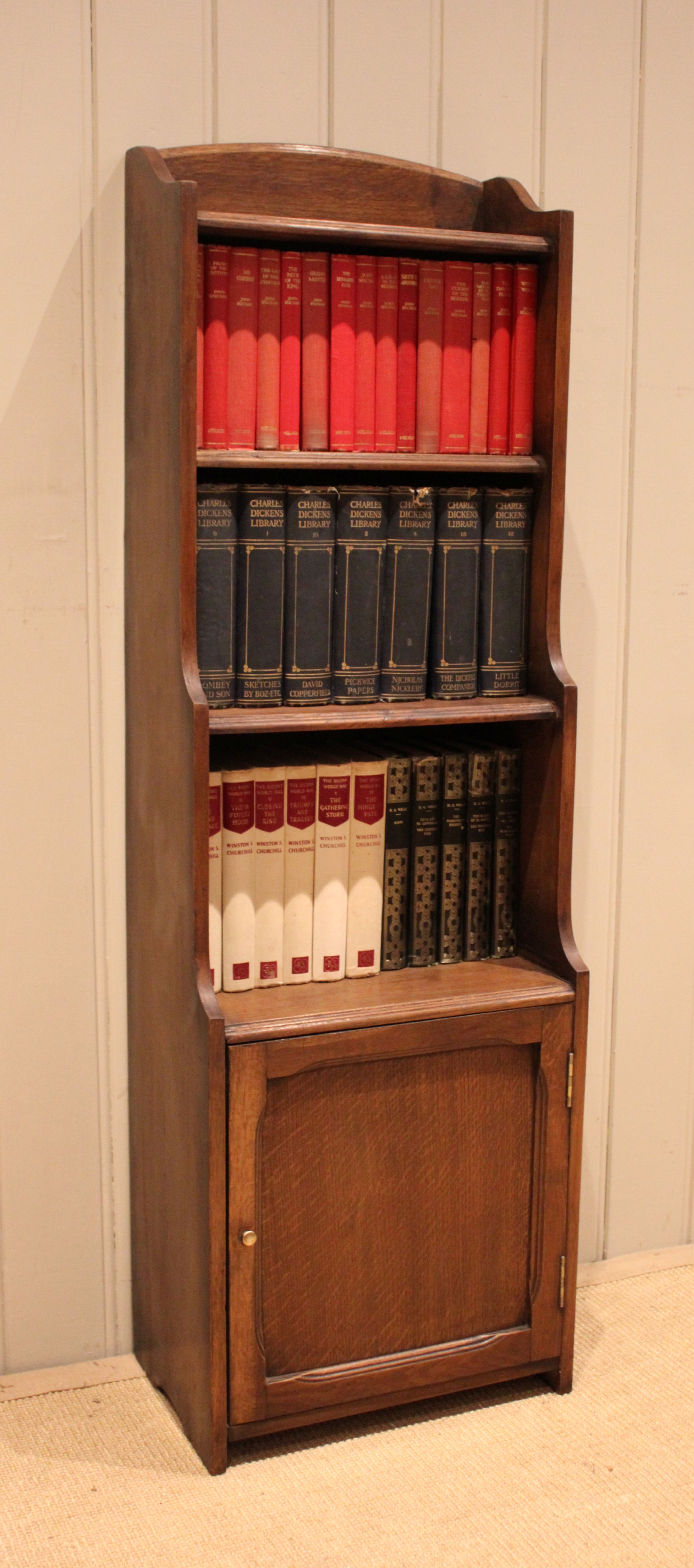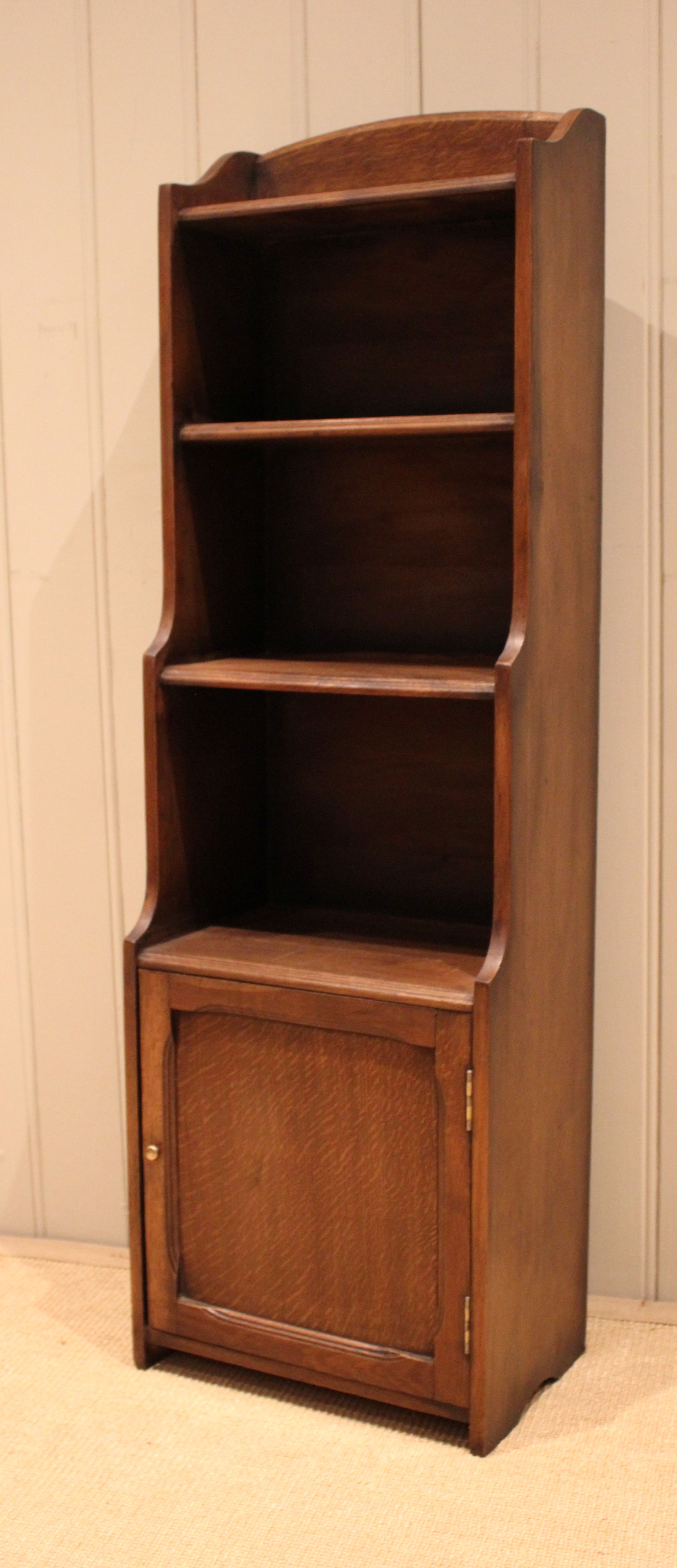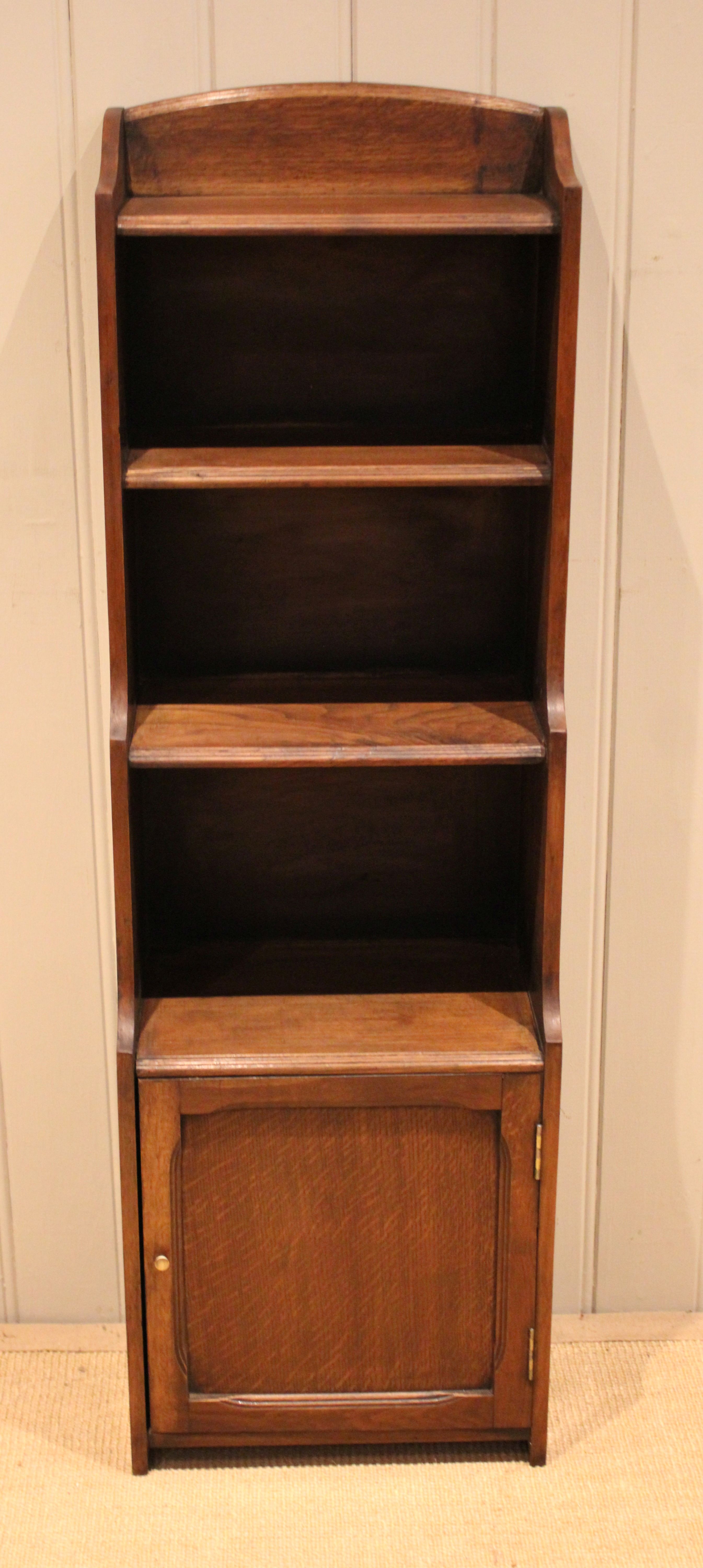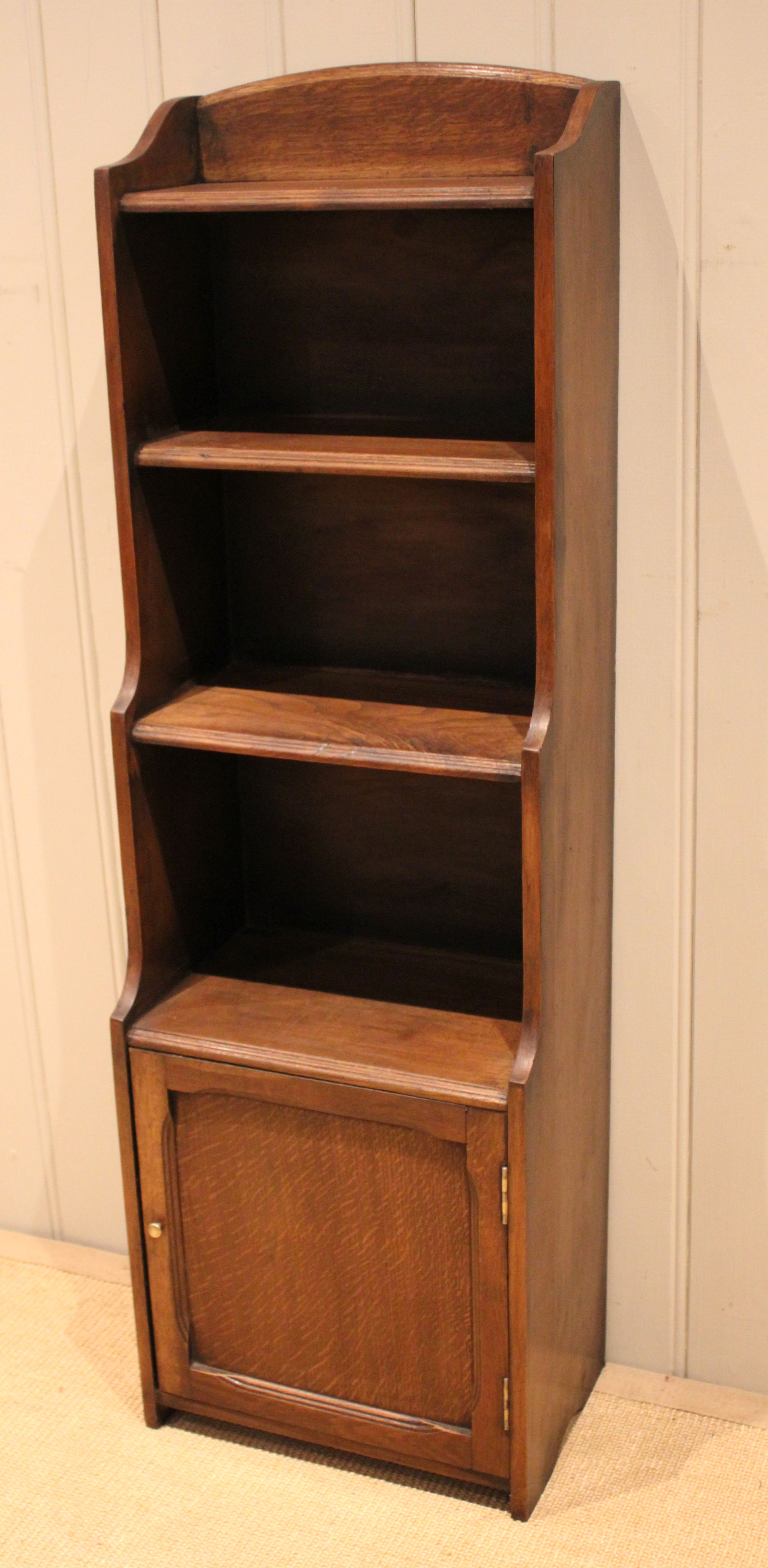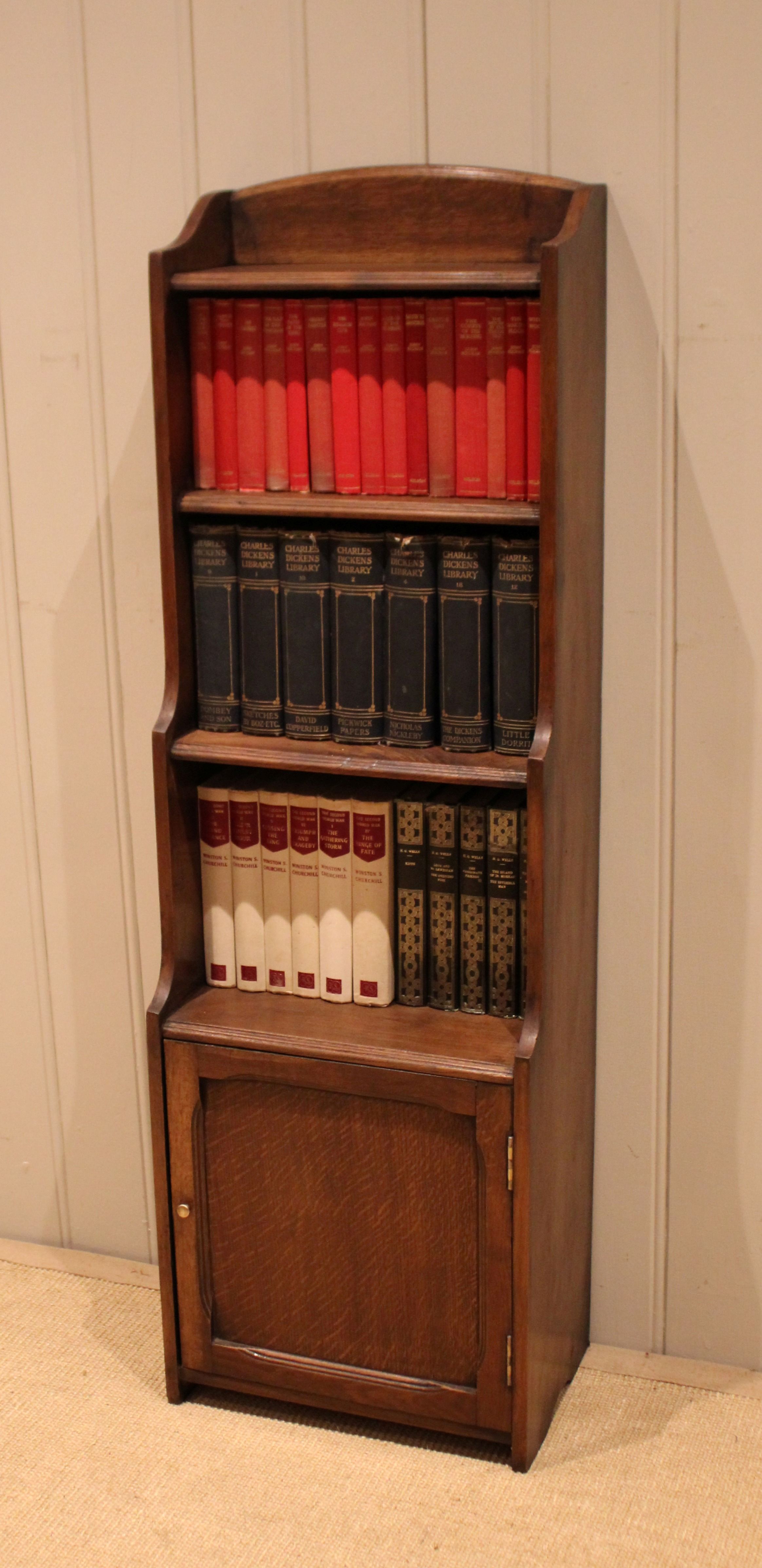 Small oak open cabinet bookcase having three fixed shelves above a small cupboard to the base . The shelf dimensions are 34 cm wide and from the bottom upwards 22.5 cm deep x 24 cm high , 17.5 cm deep x 20.5 cm high and at the top 14 cm deep x 18 cm high .