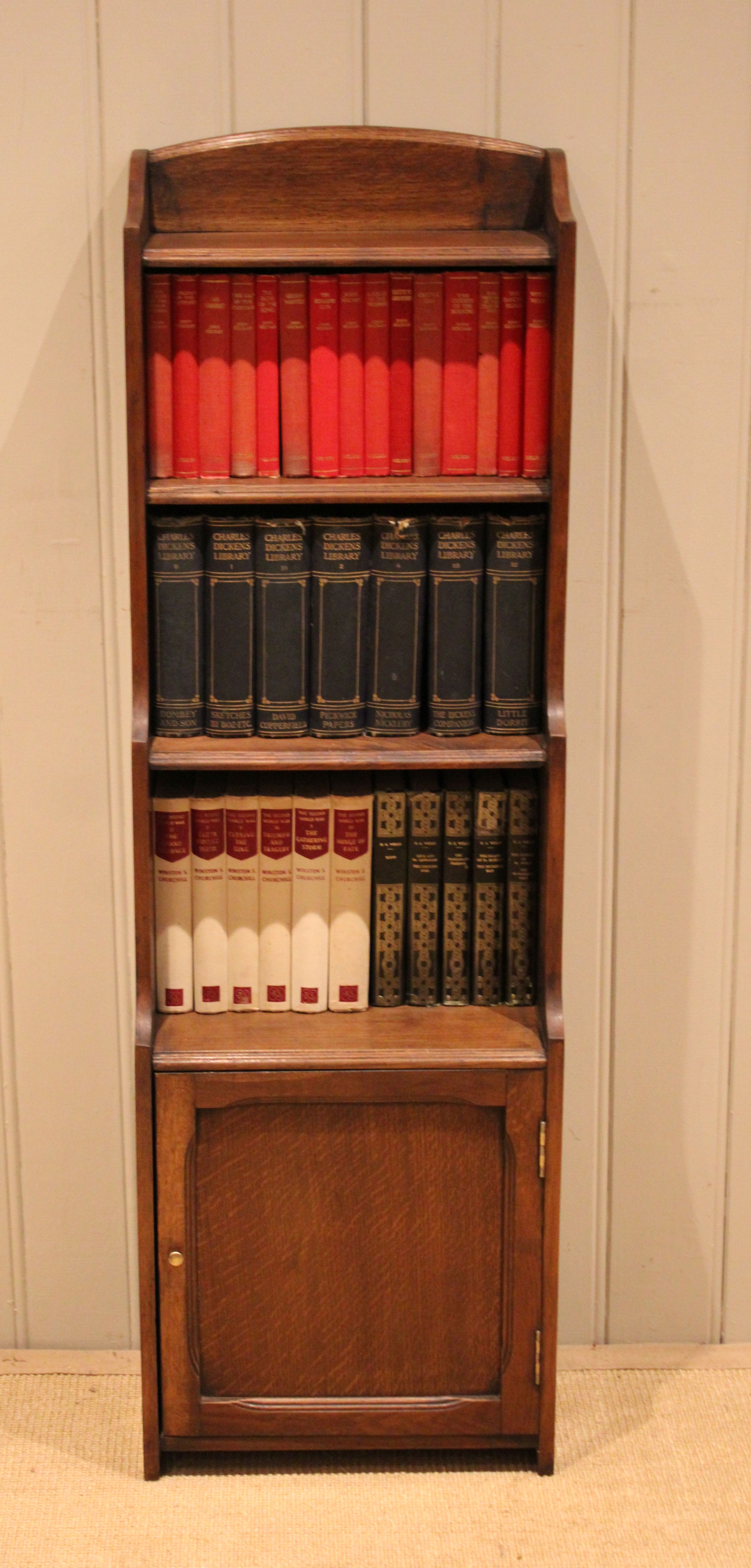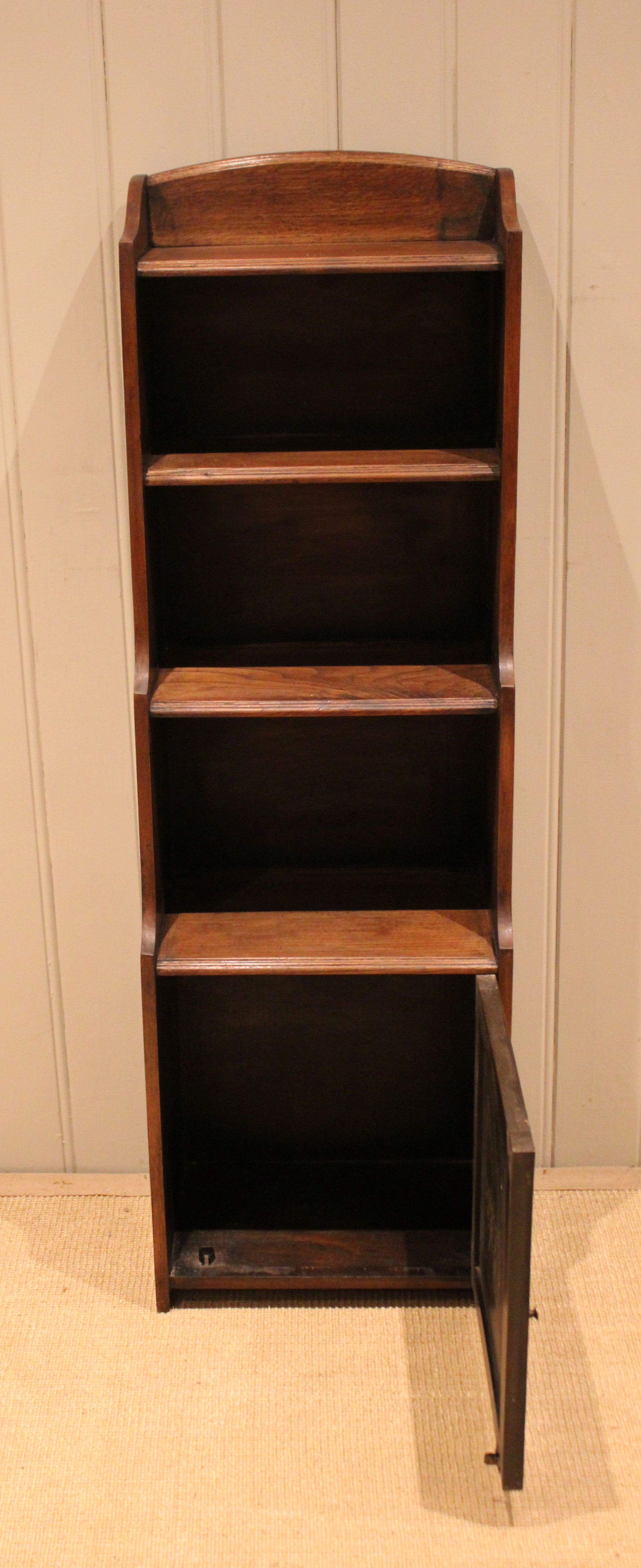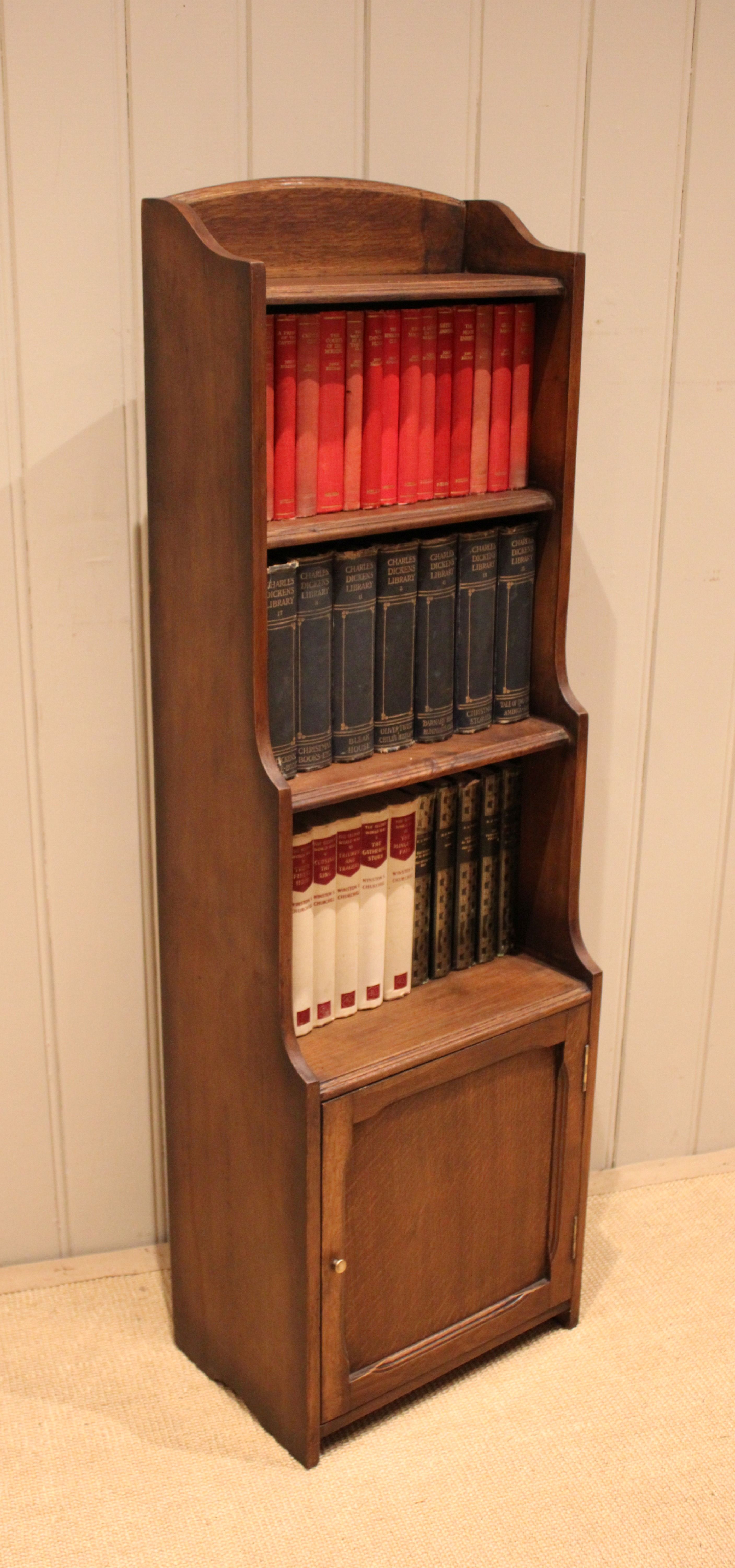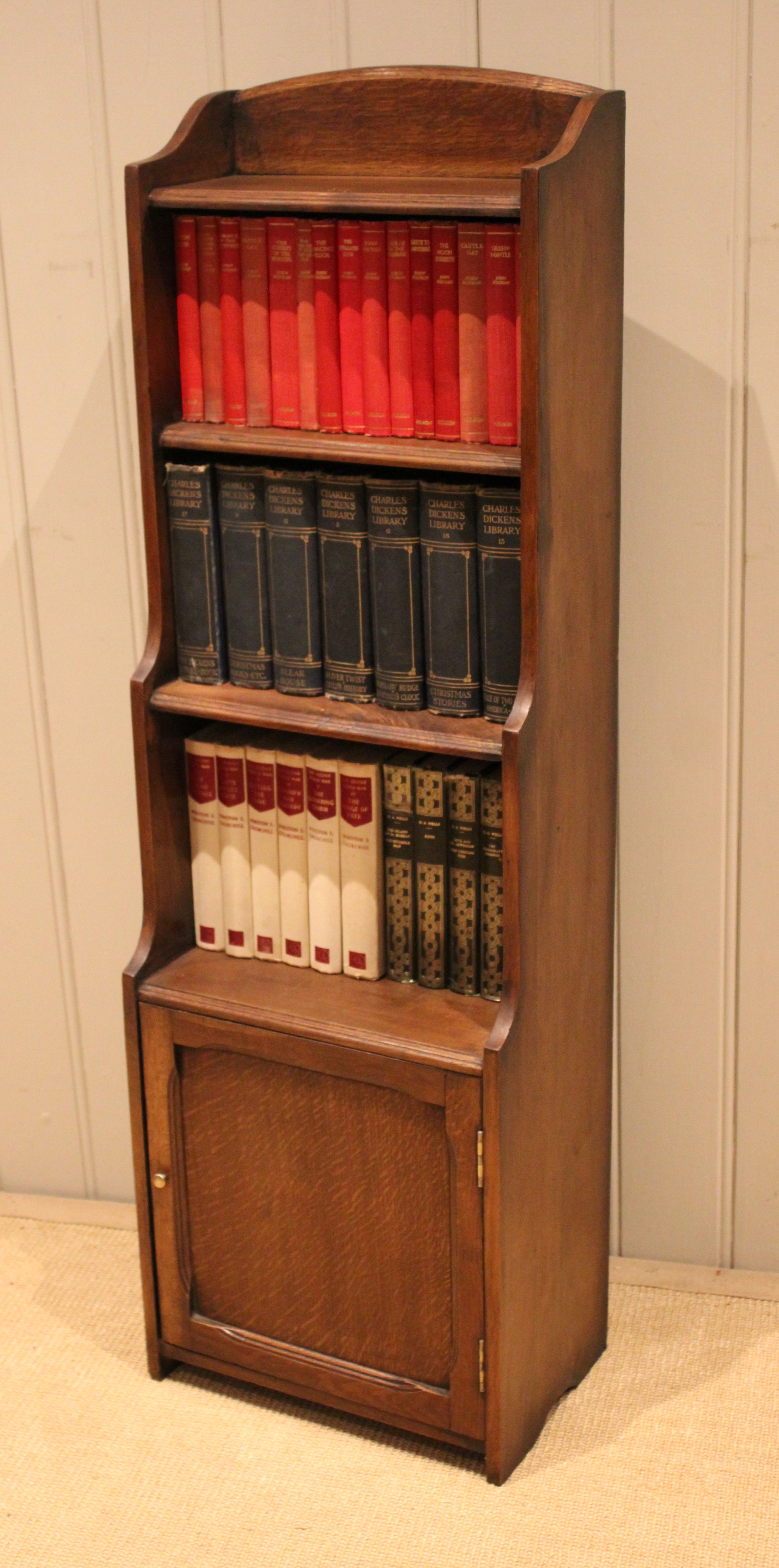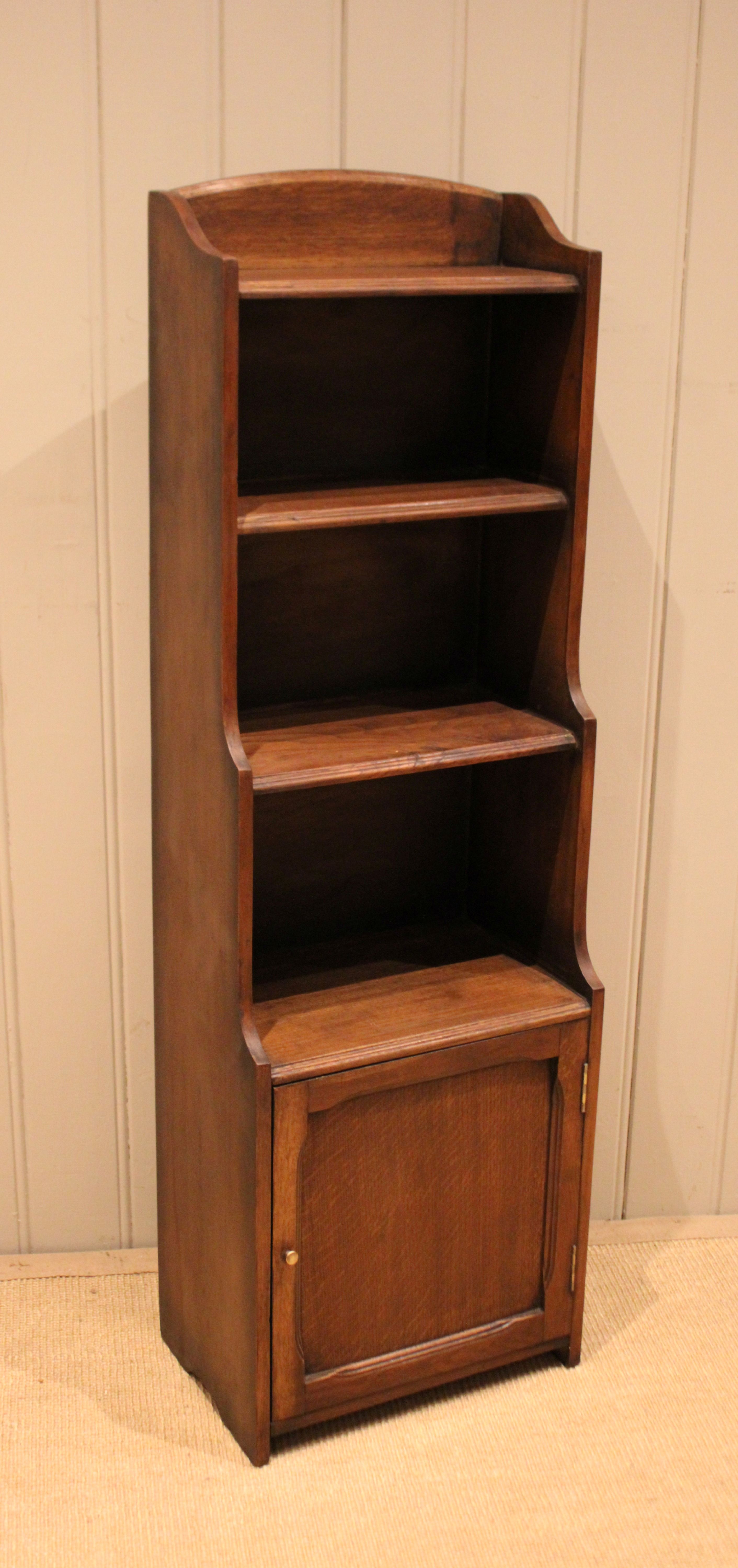 Small oak open cabinet bookcase having three fixed shelves above a small cupboard to the base . The shelf dimensions are 34 cm wide and from the bottom upwards 22.5 cm deep x 24 cm high , 17.5 cm deep x 20.5 cm high and at the top 14 cm deep x 18 cm high .
