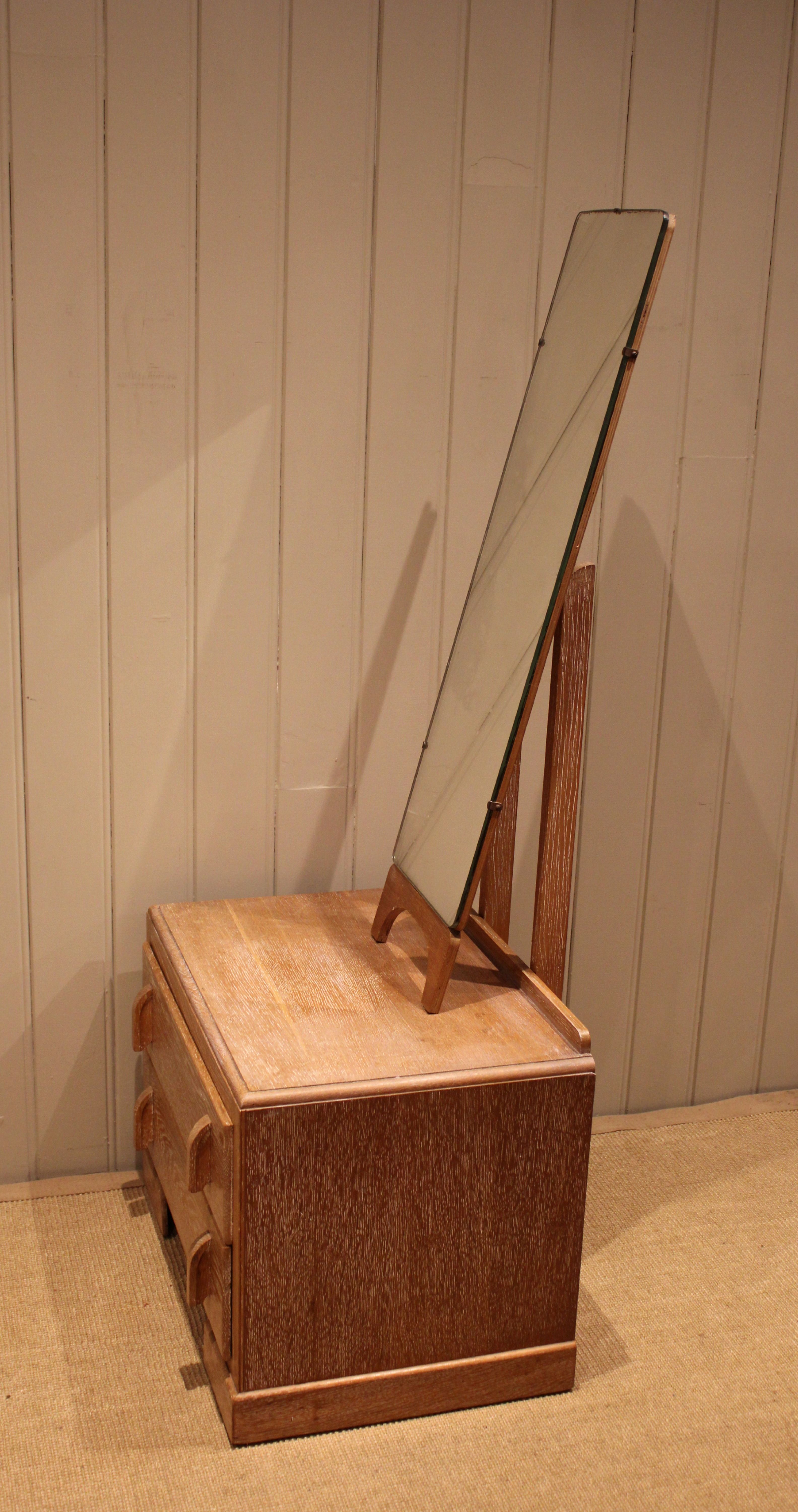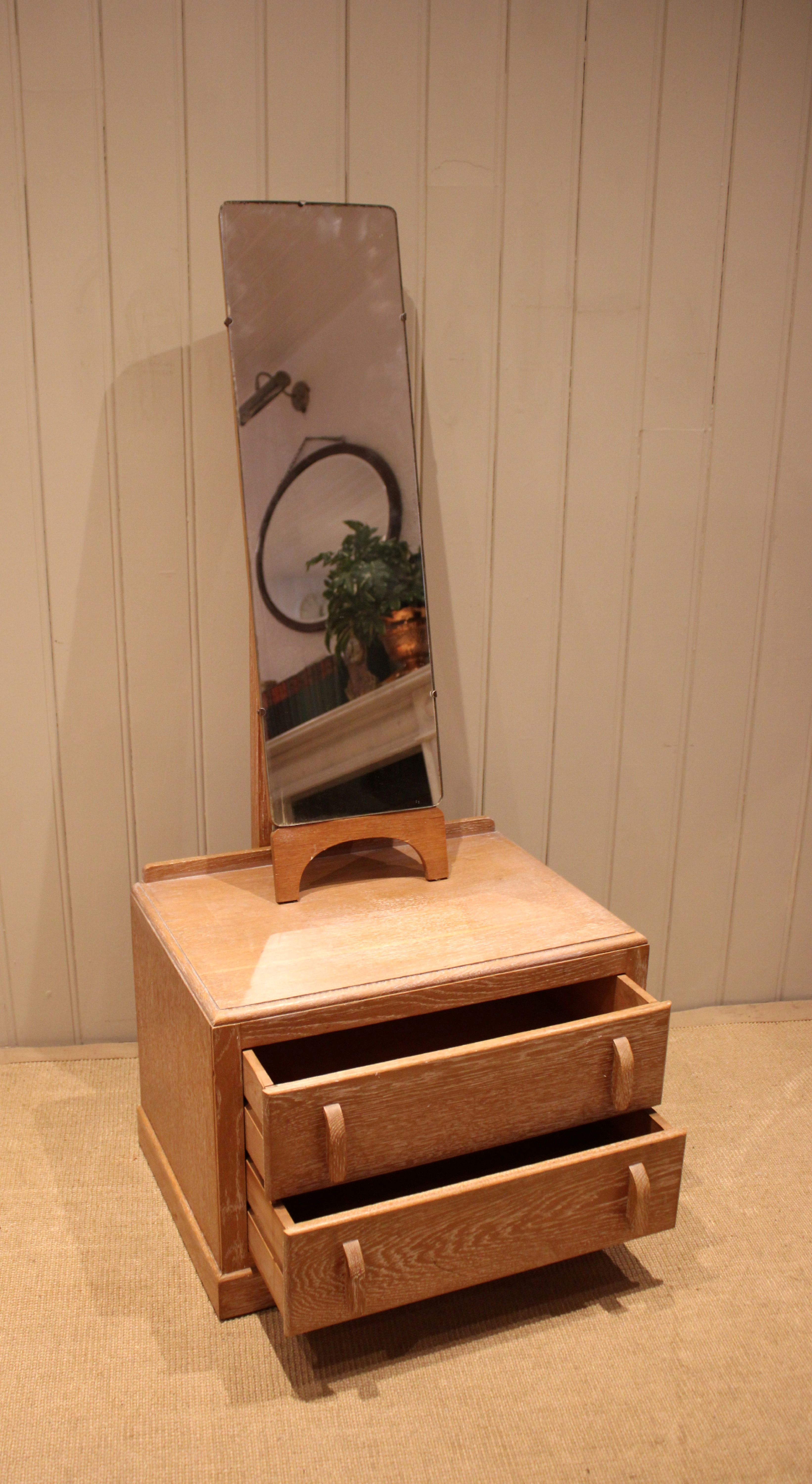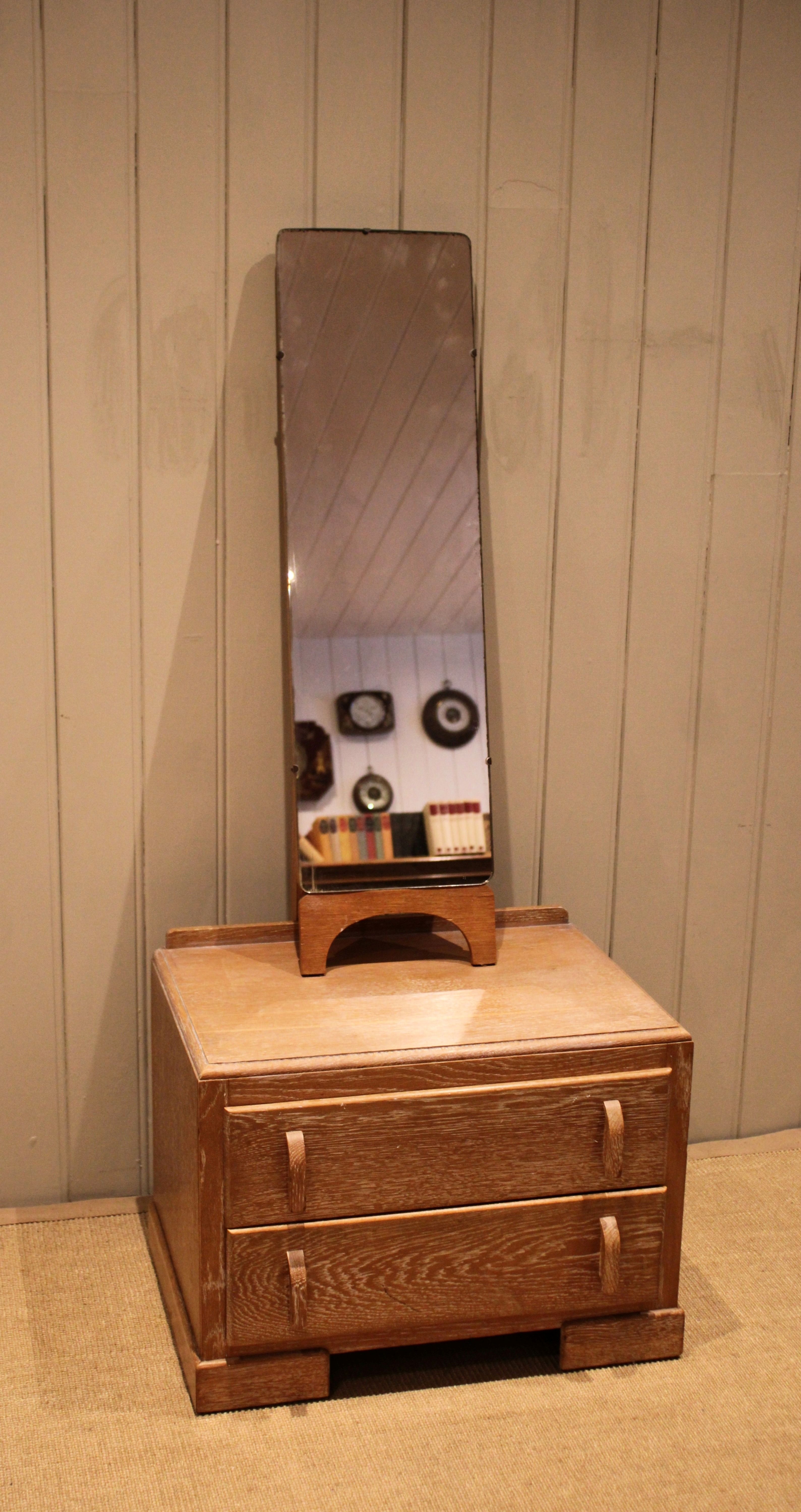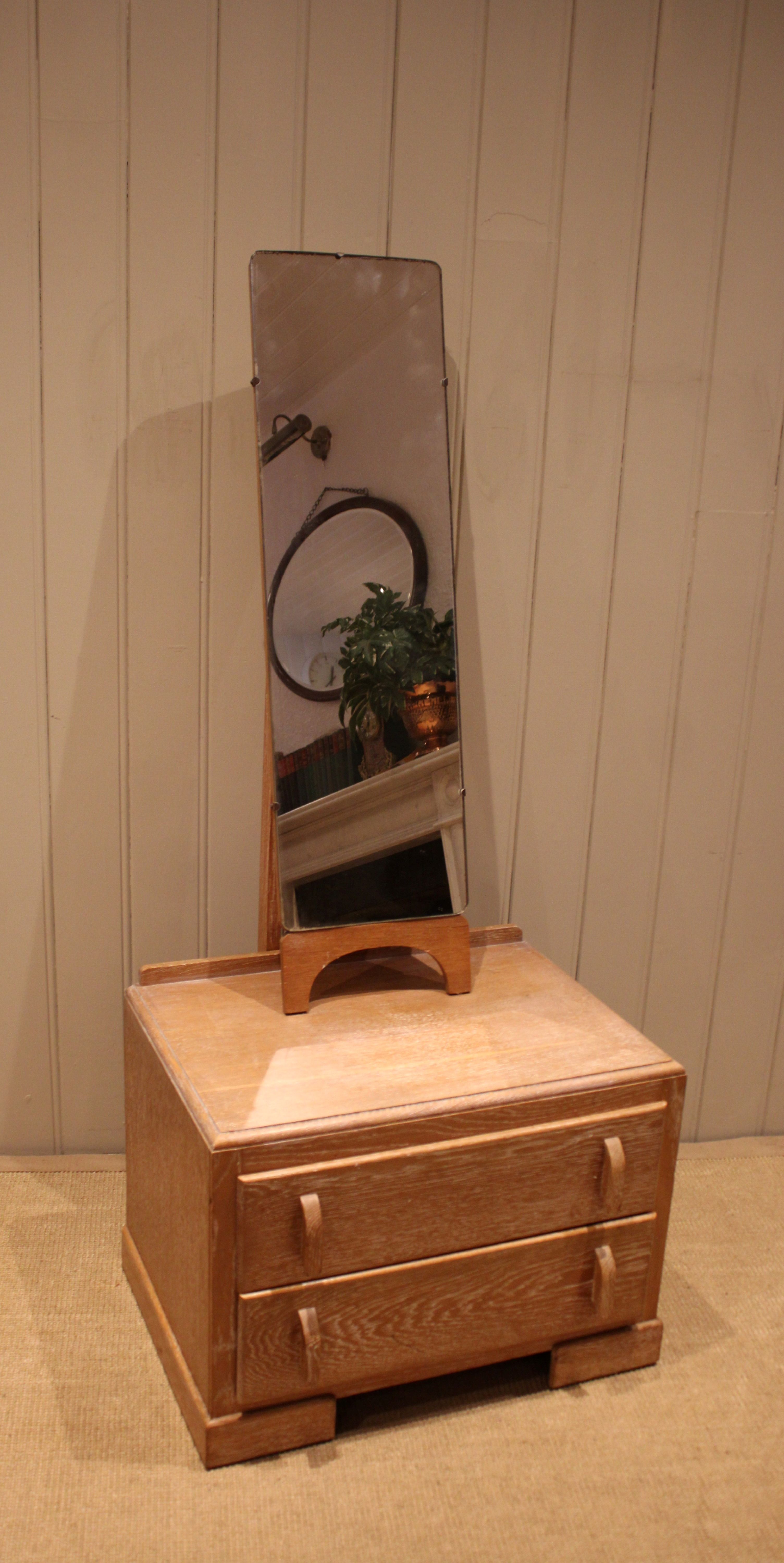 Small limed oak cabinet having two drawers with a mirror mounted to the top , raised on bracket feet .