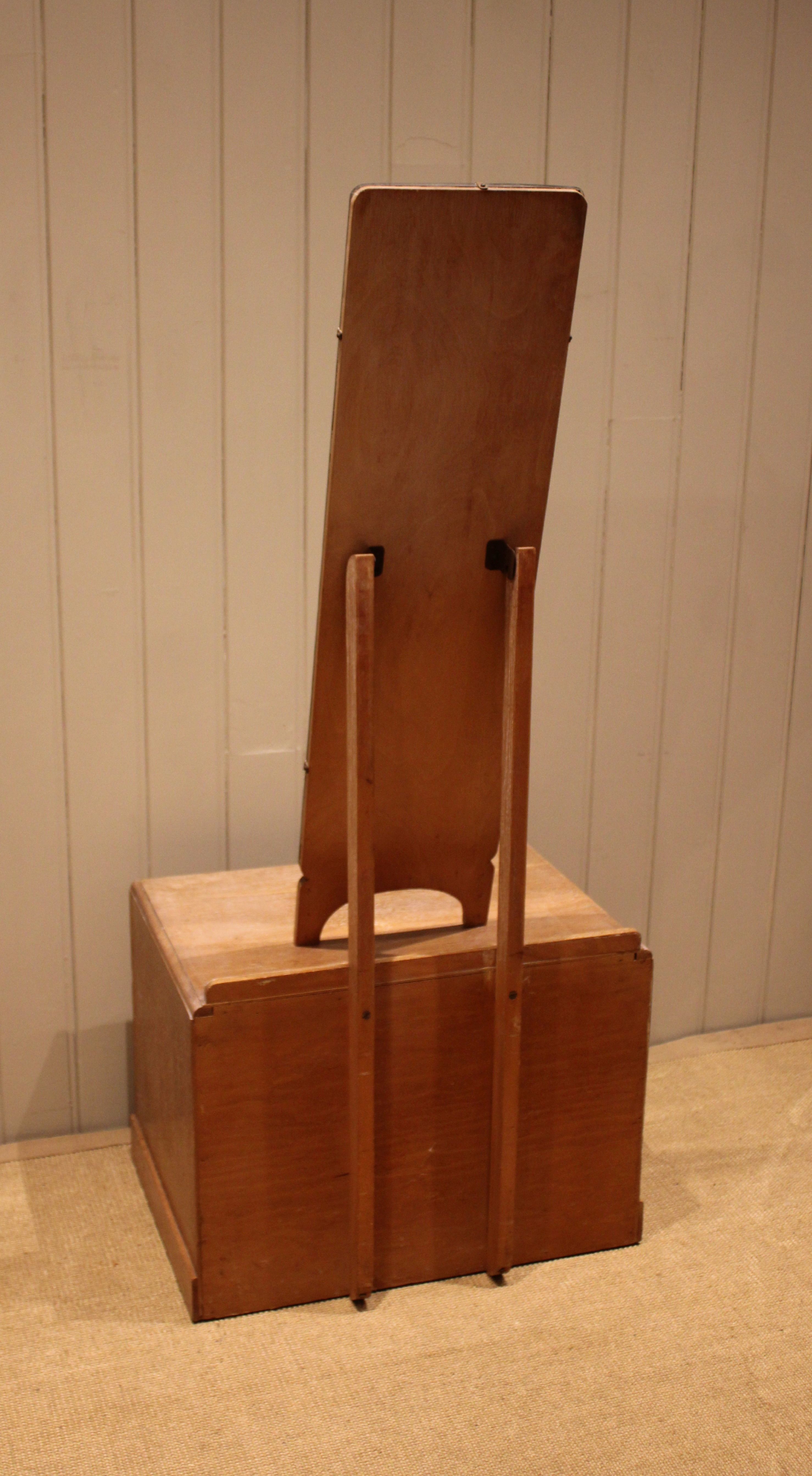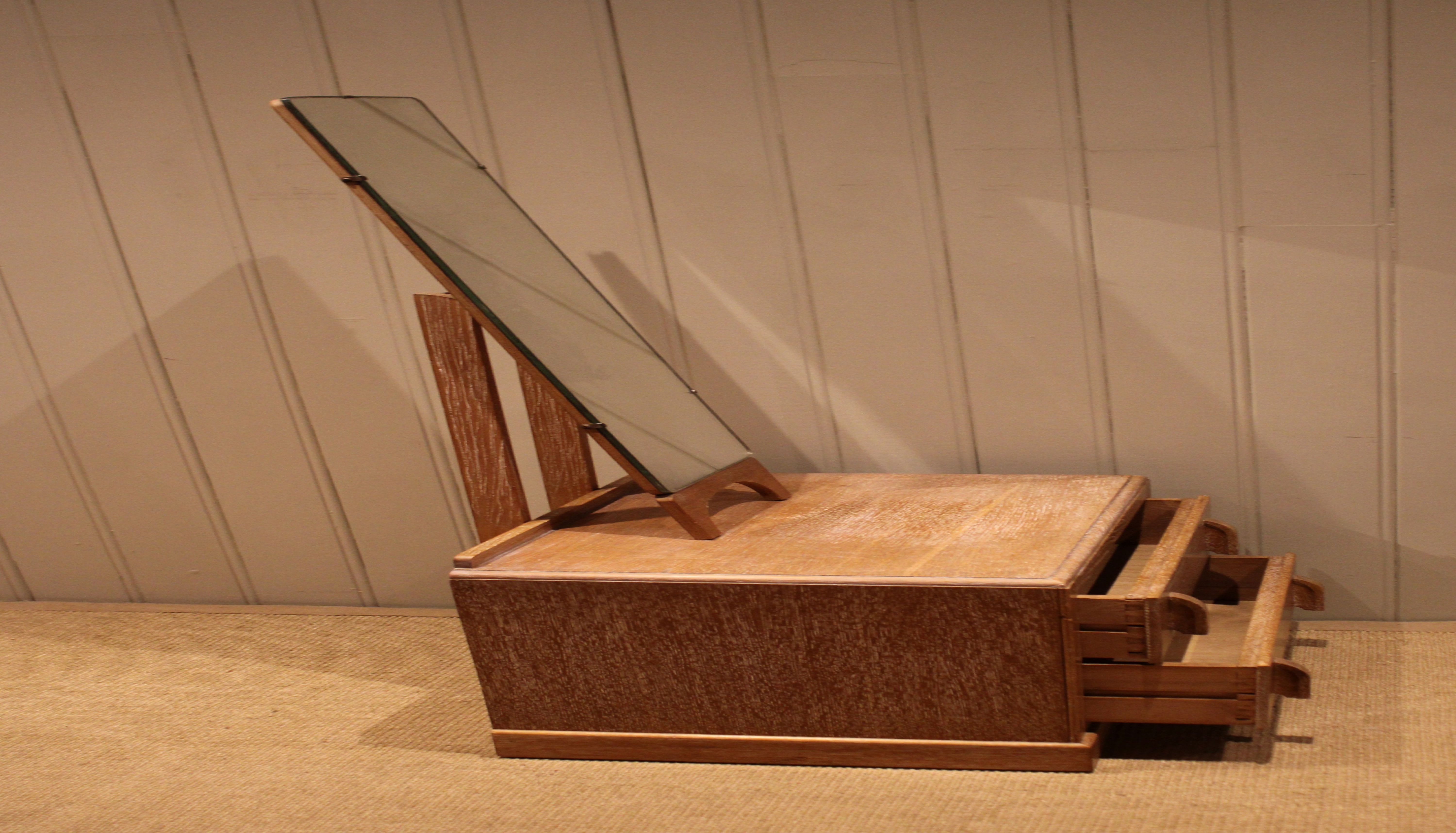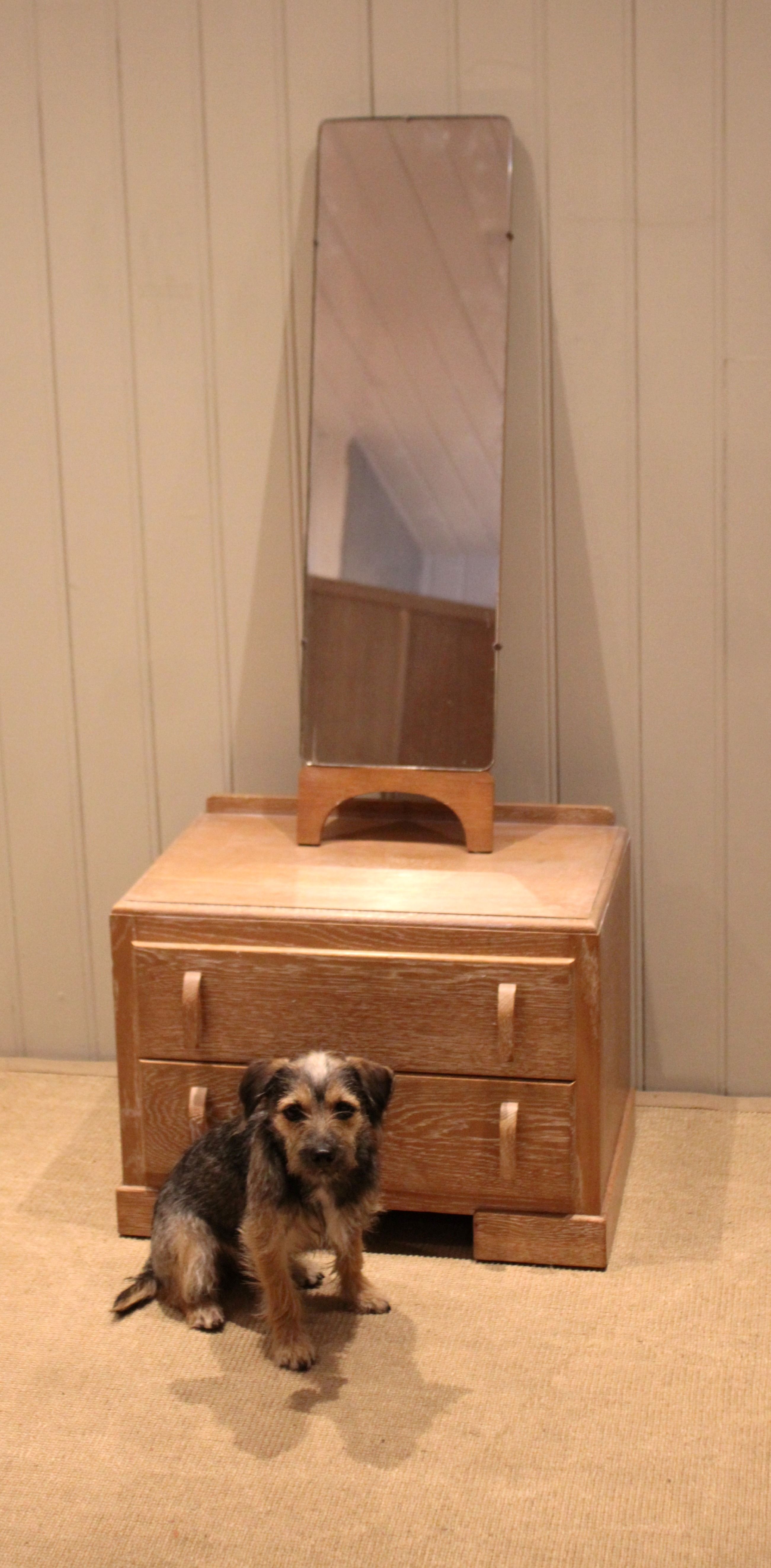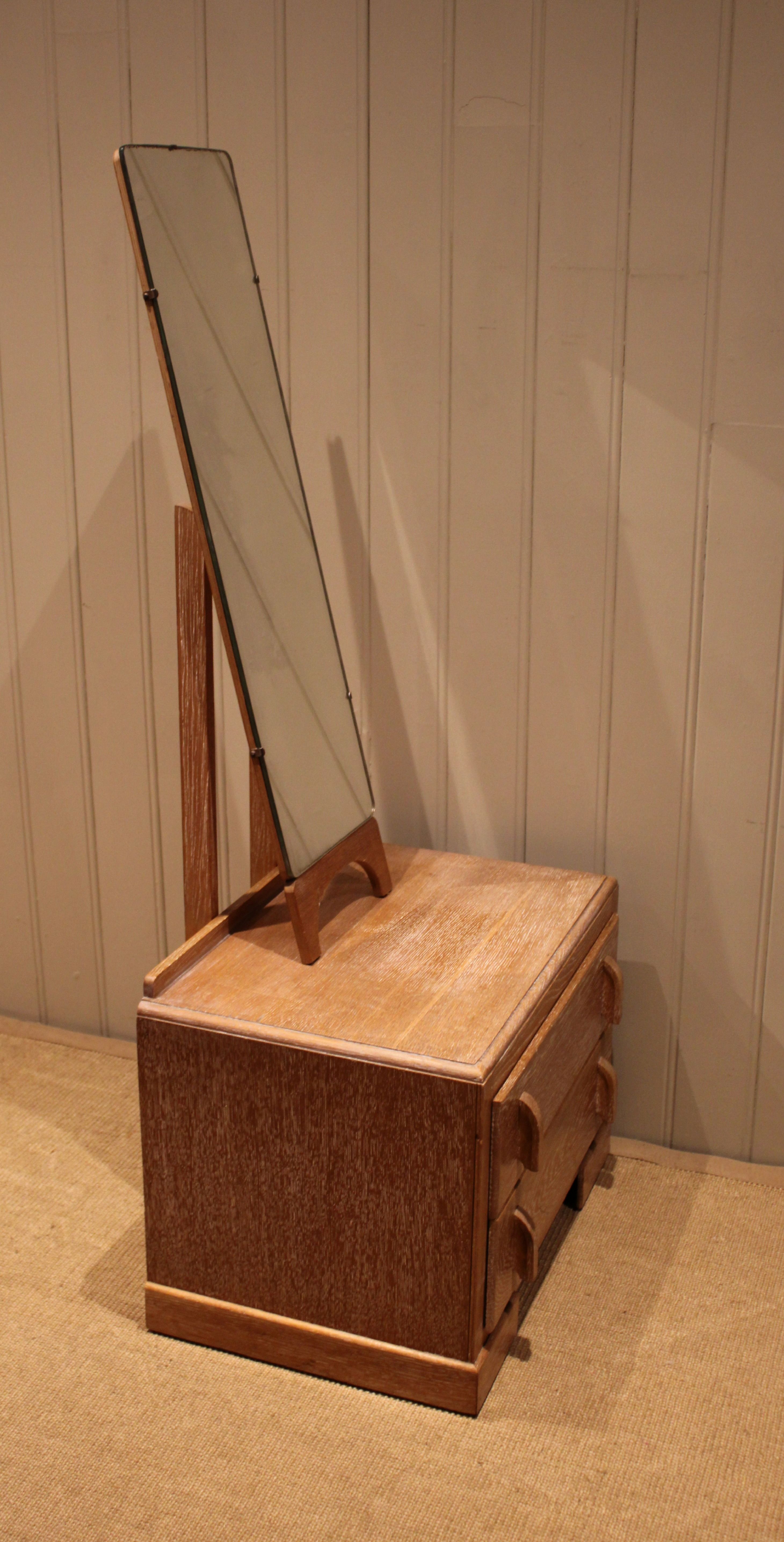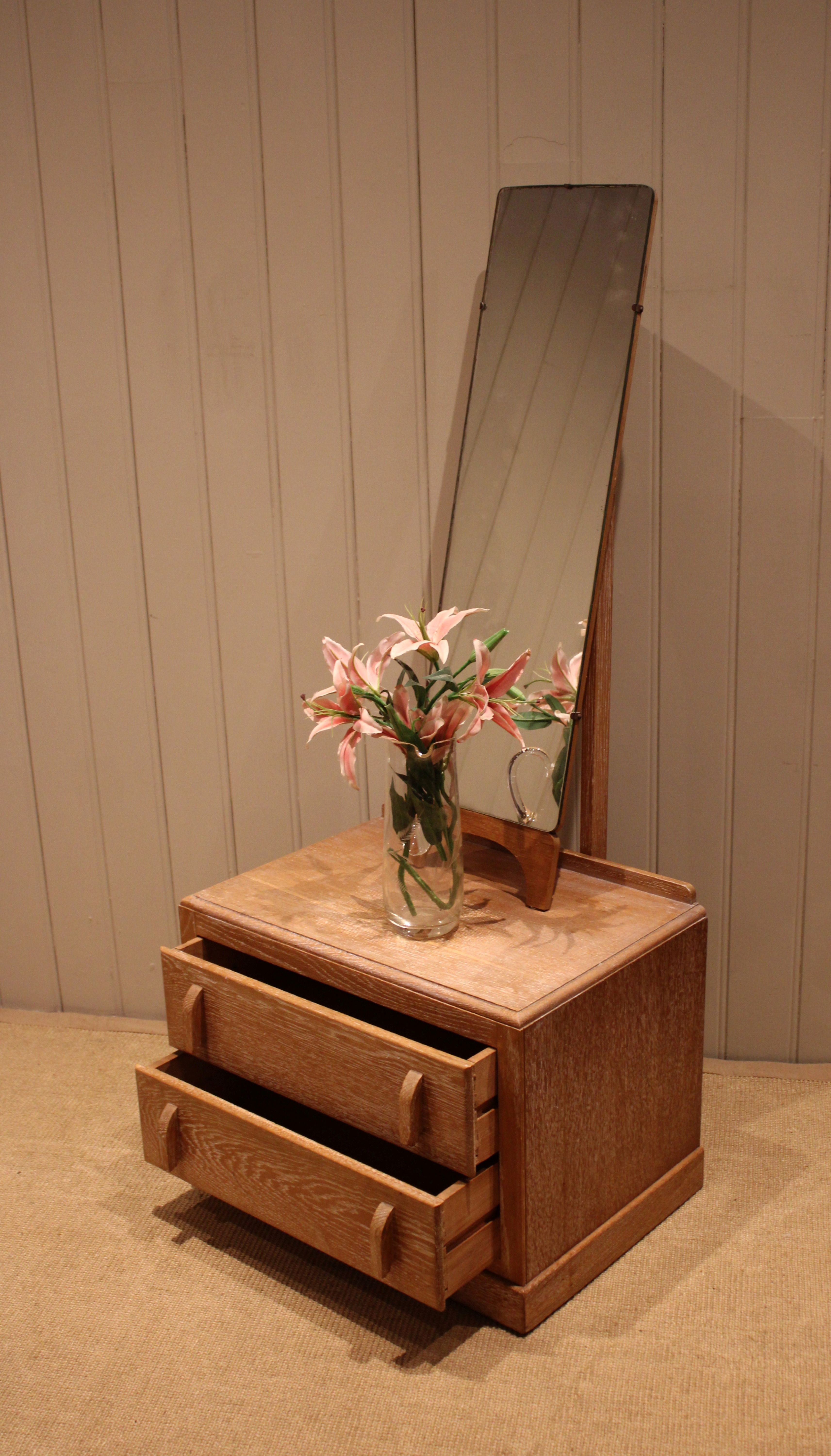 Small limed oak cabinet having two drawers with a mirror mounted to the top , raised on bracket feet .