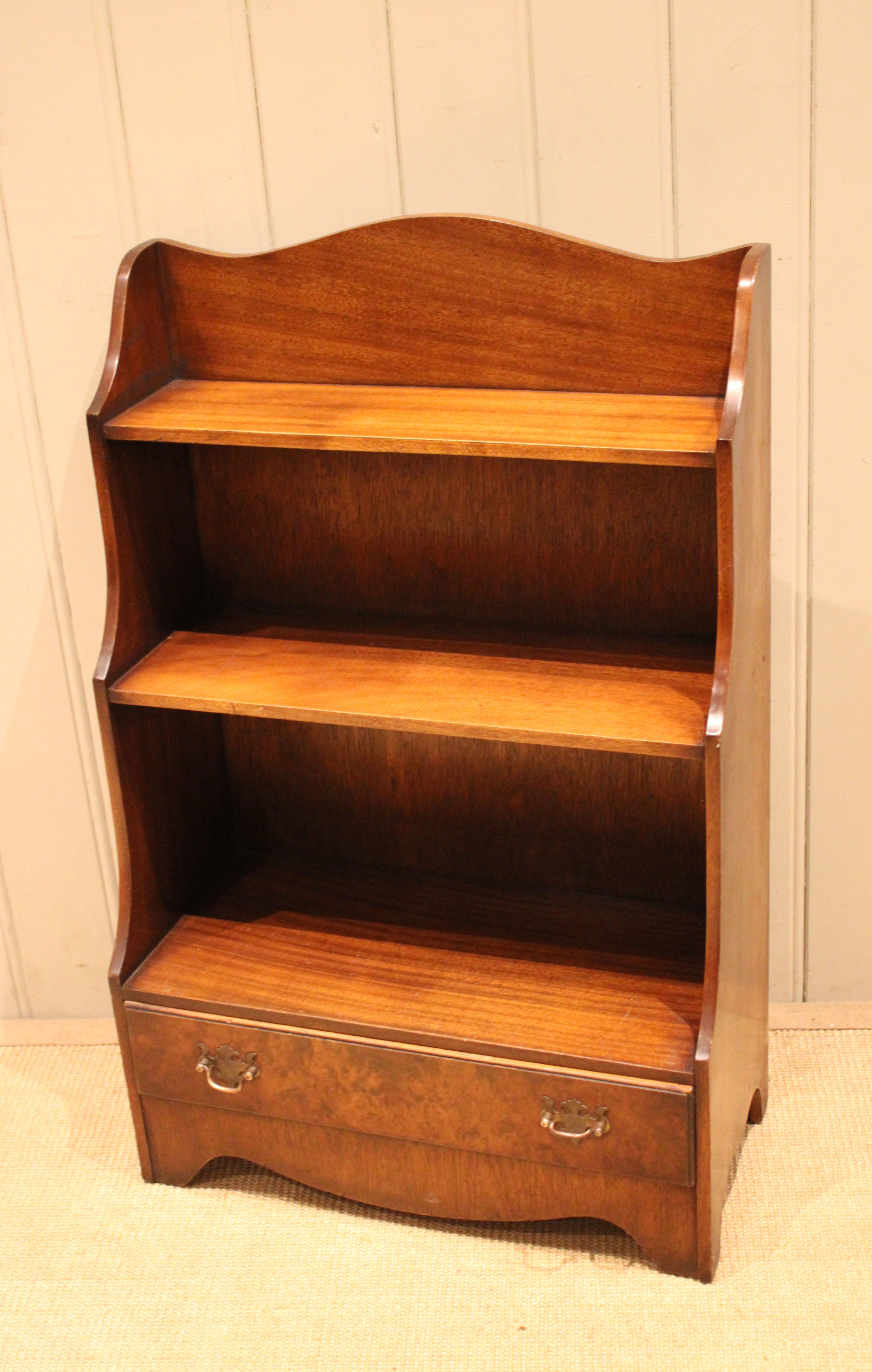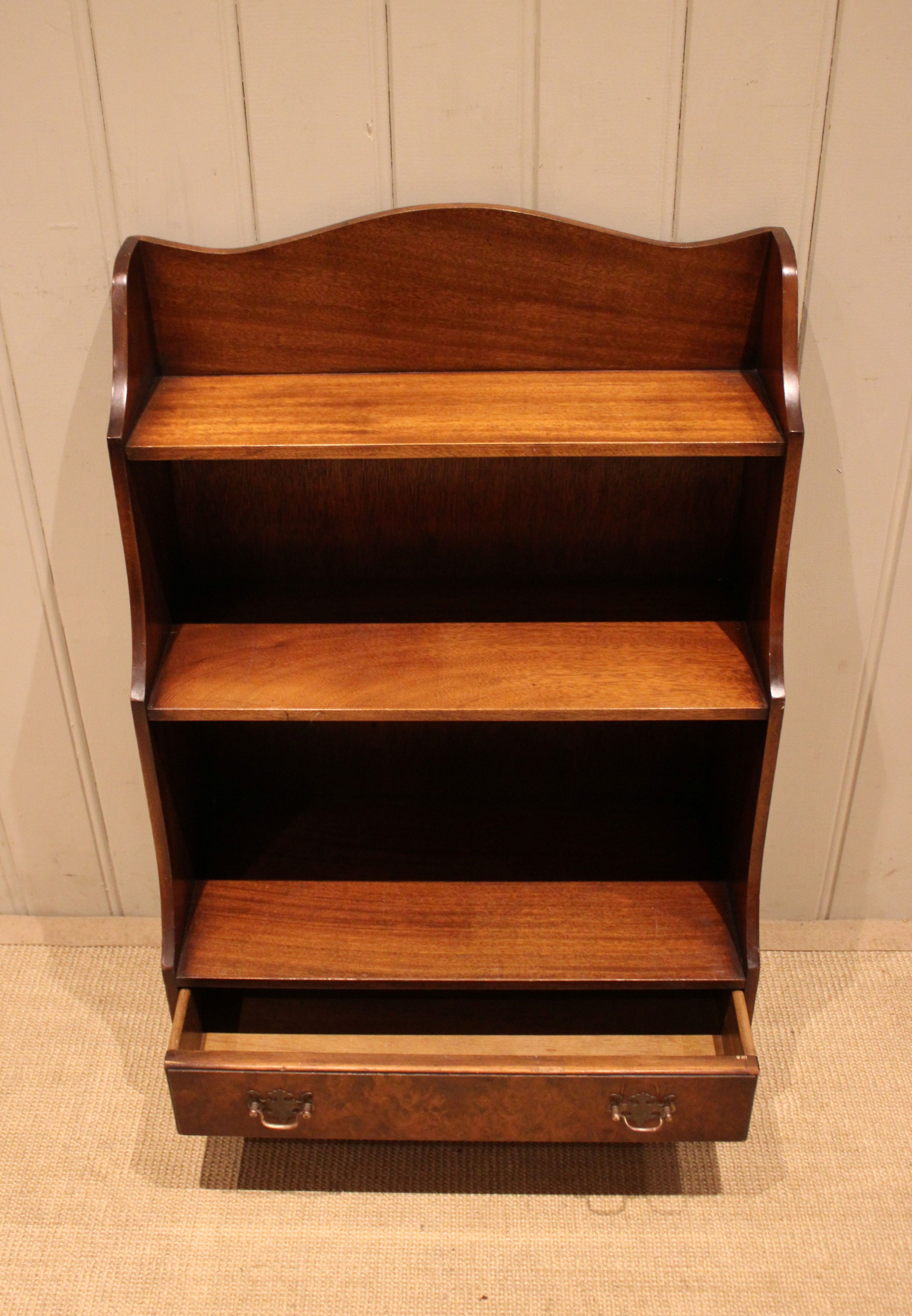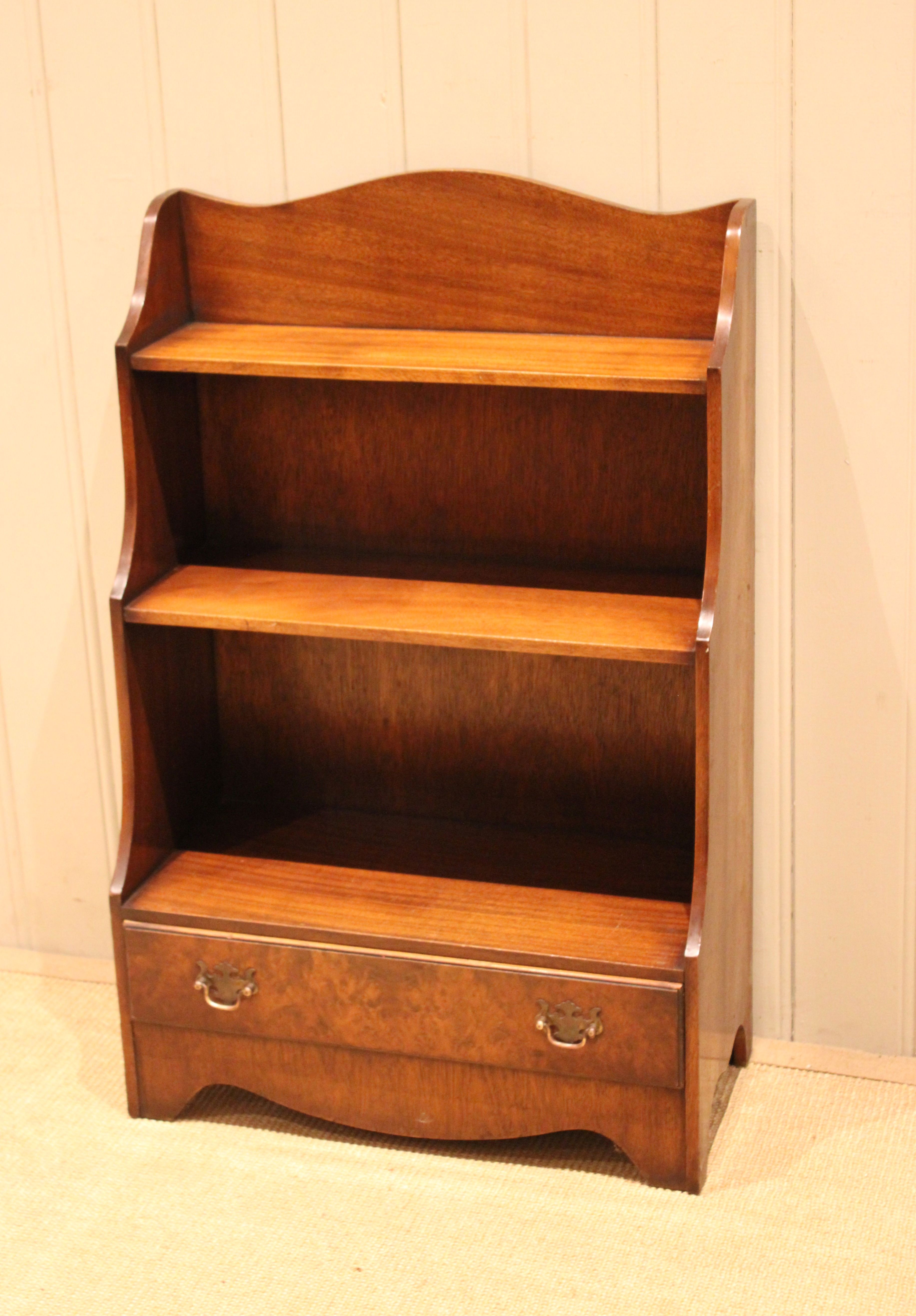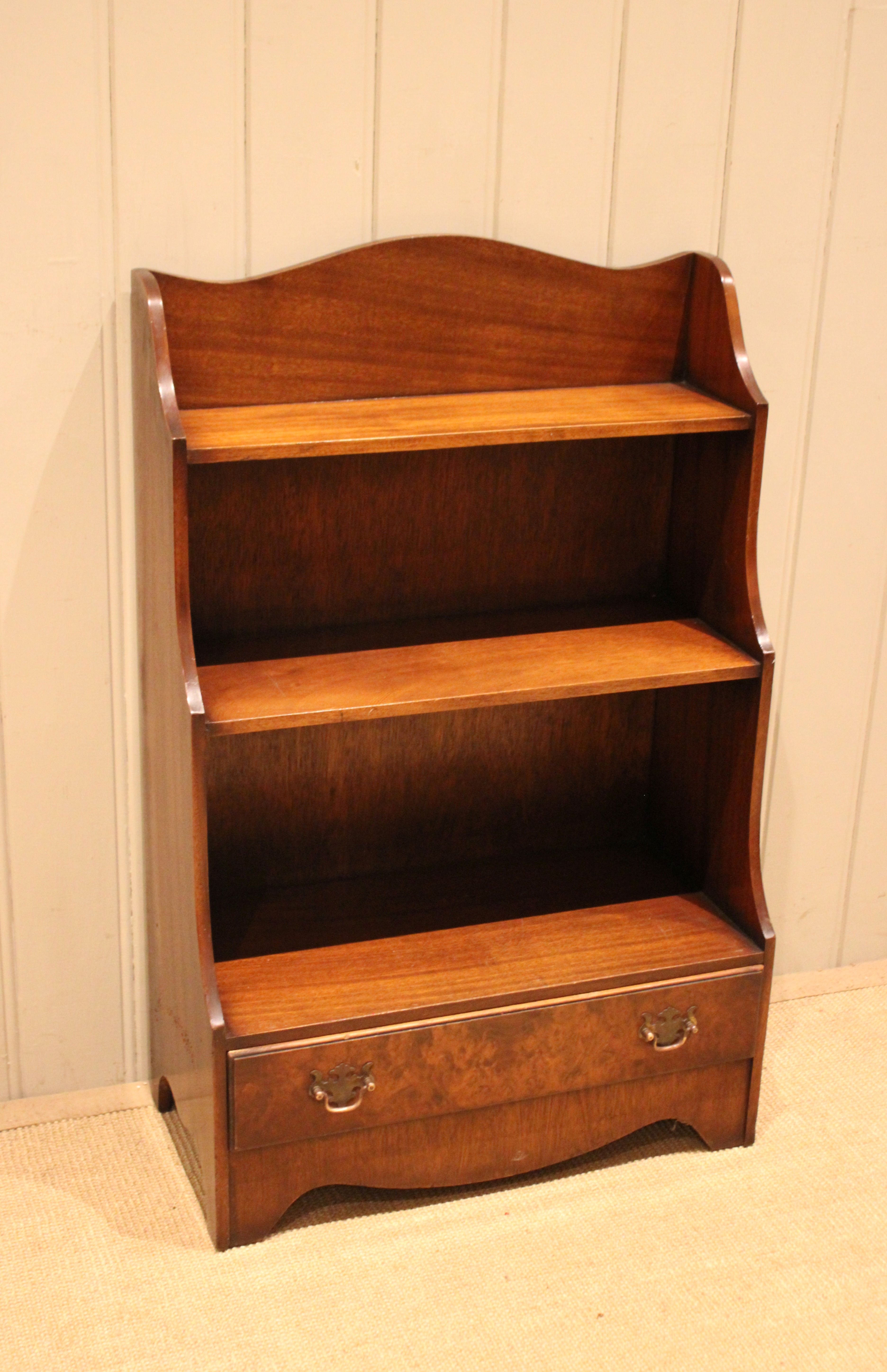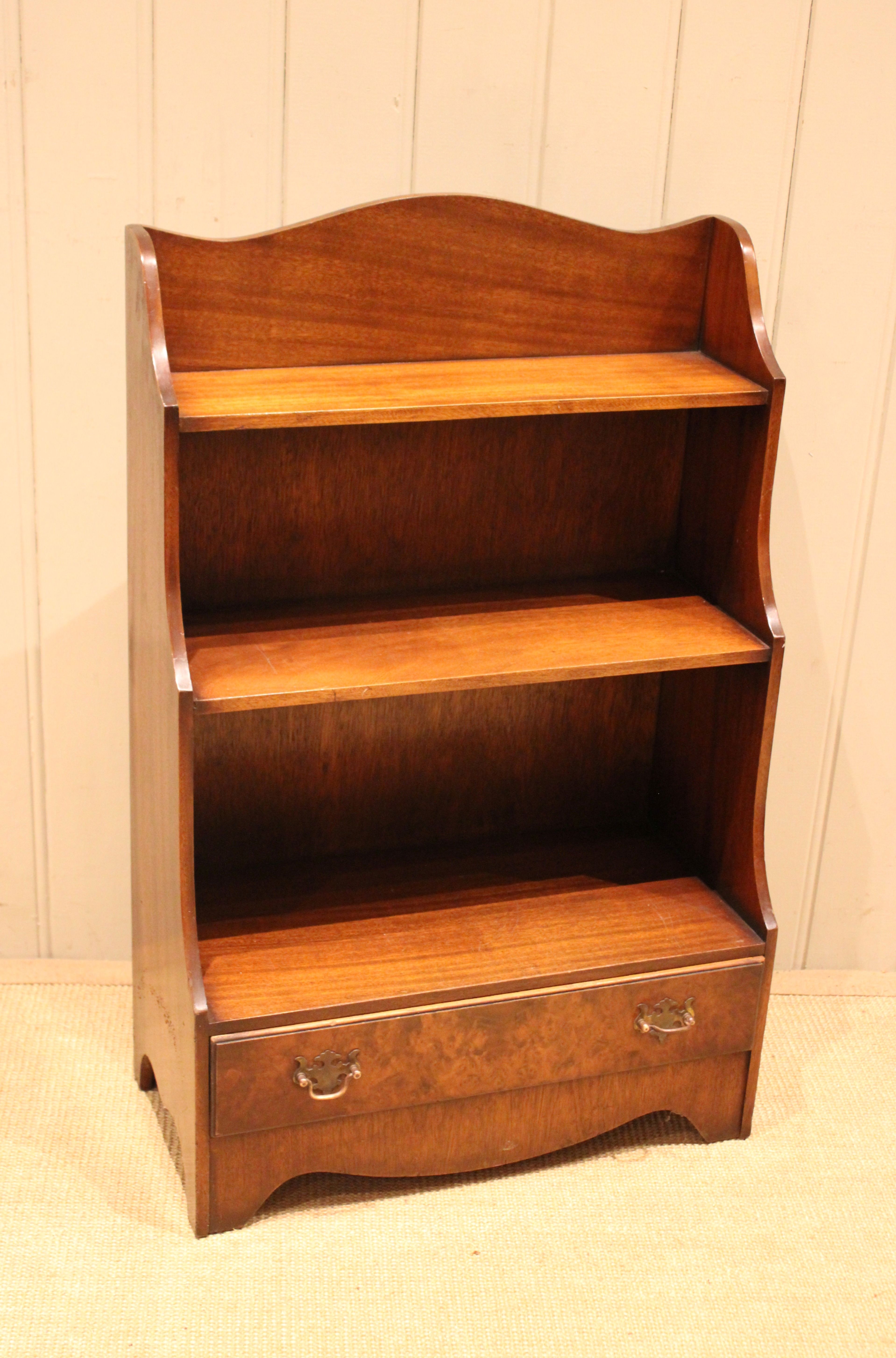 Small open mahogany and burr walnut bookcase having three fixed shelves above a burr walnut drawer to the base , raised on bracket feet . The shelf dimensions are 50.5 cm wide , and from the botton up 25 cm highx 24.5 cm deep and 20 cm high x 19 cm deep .