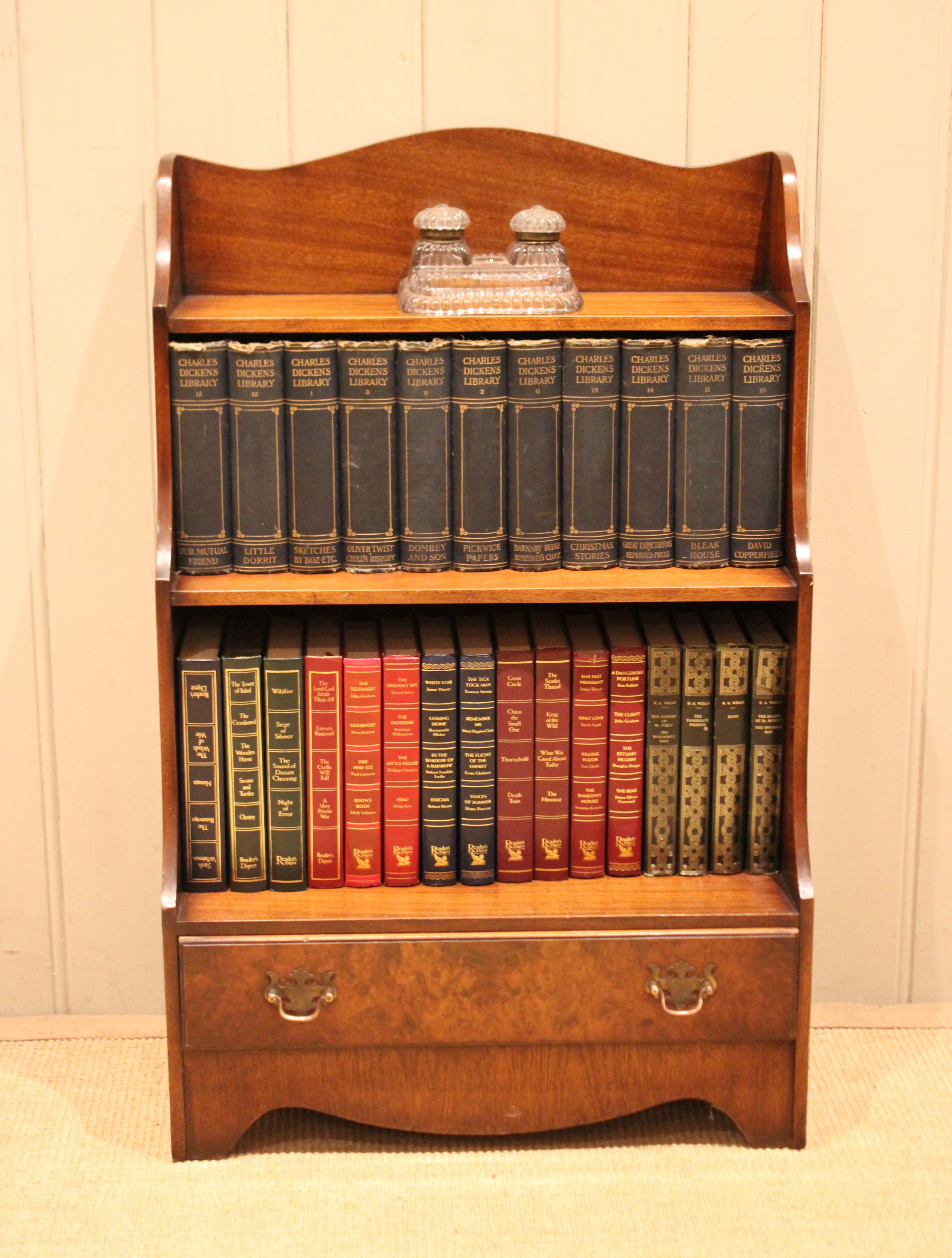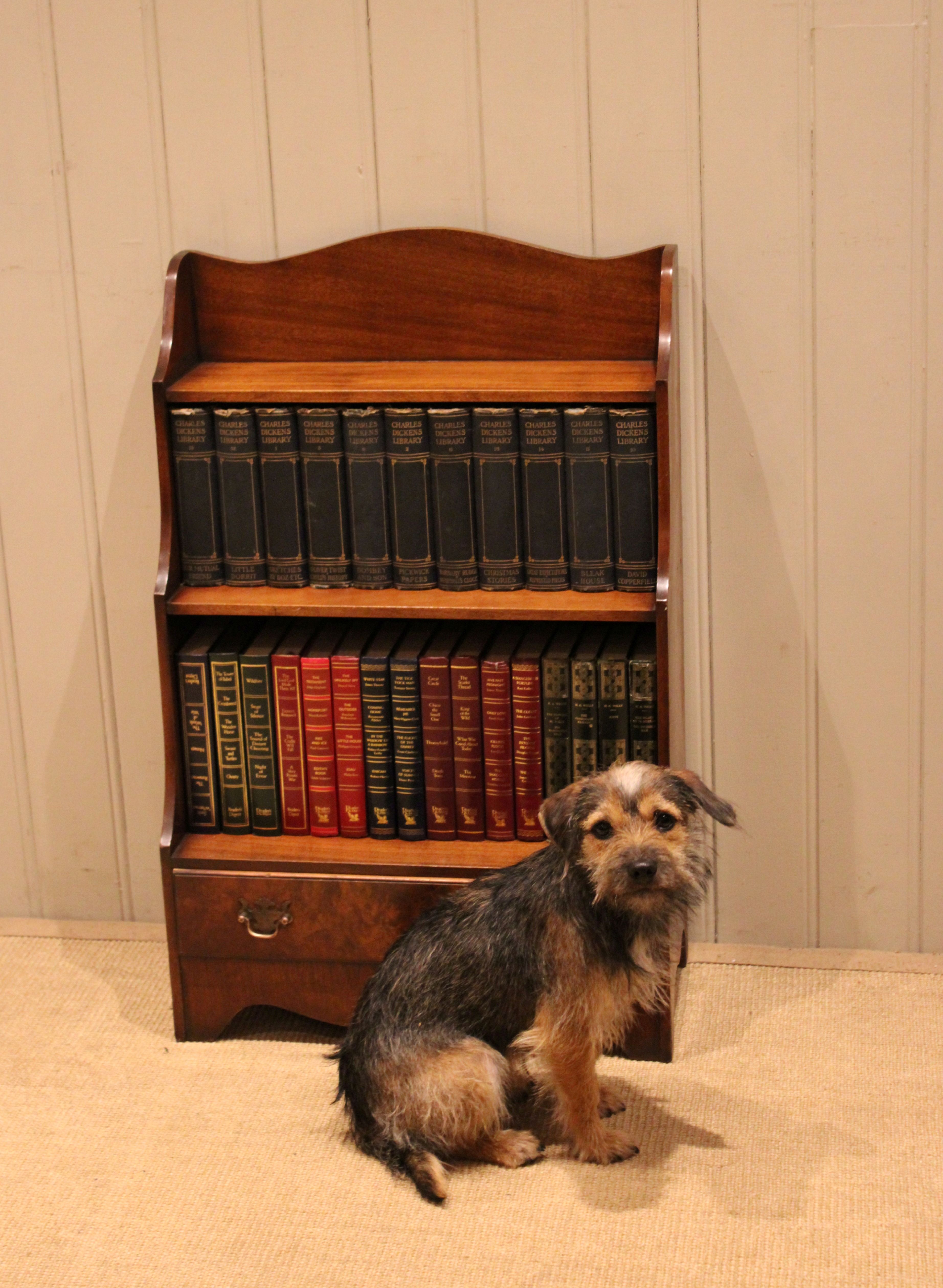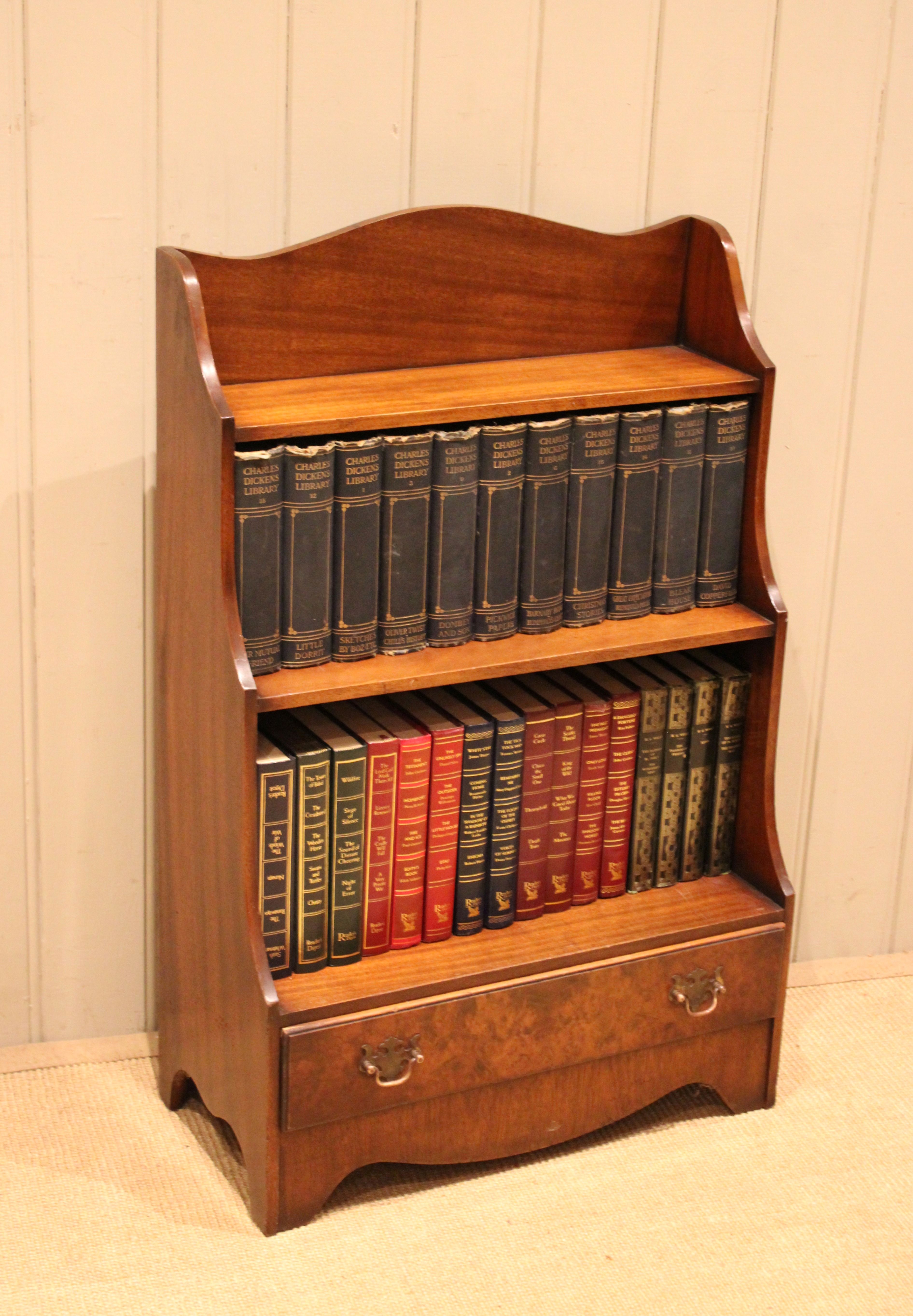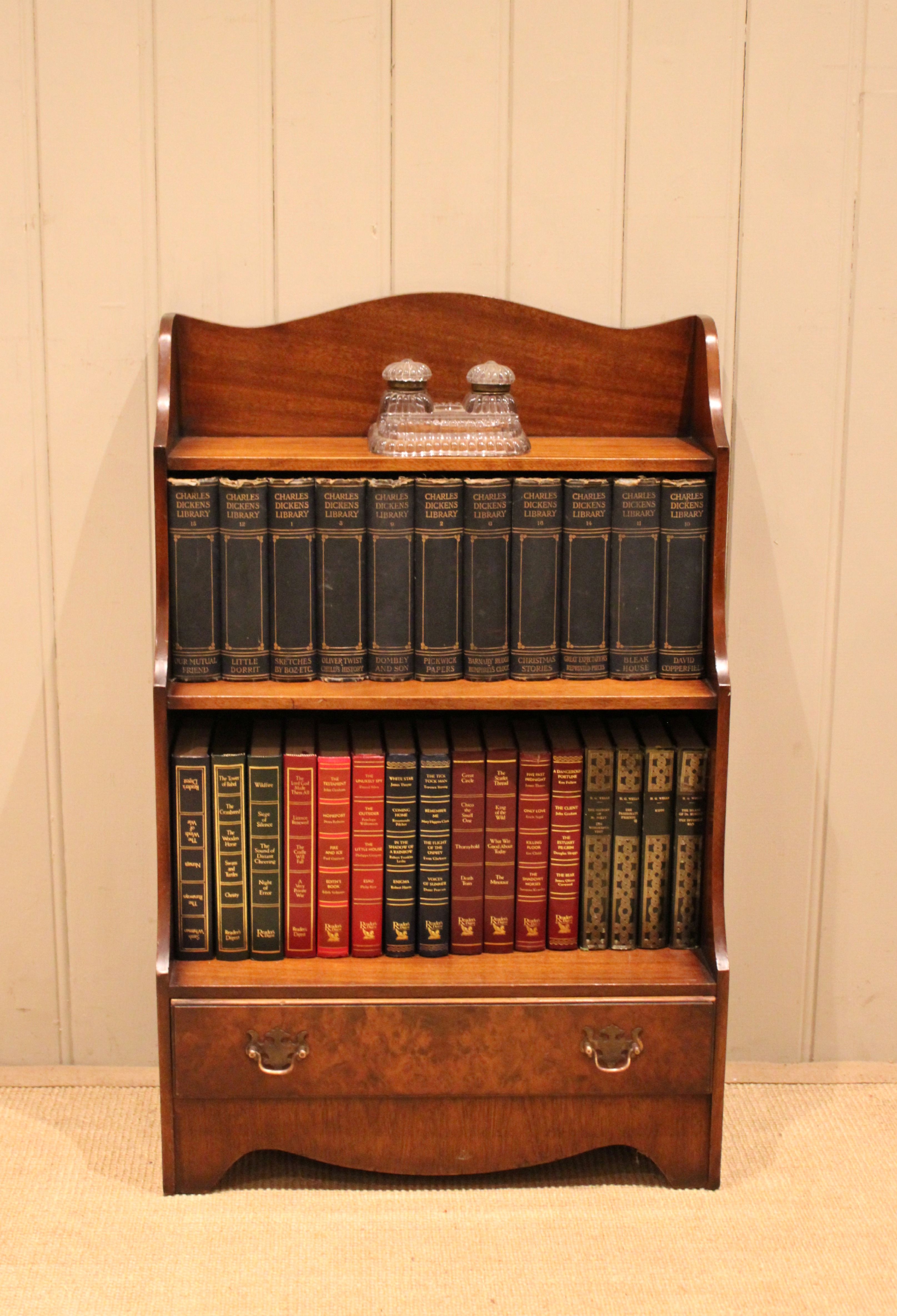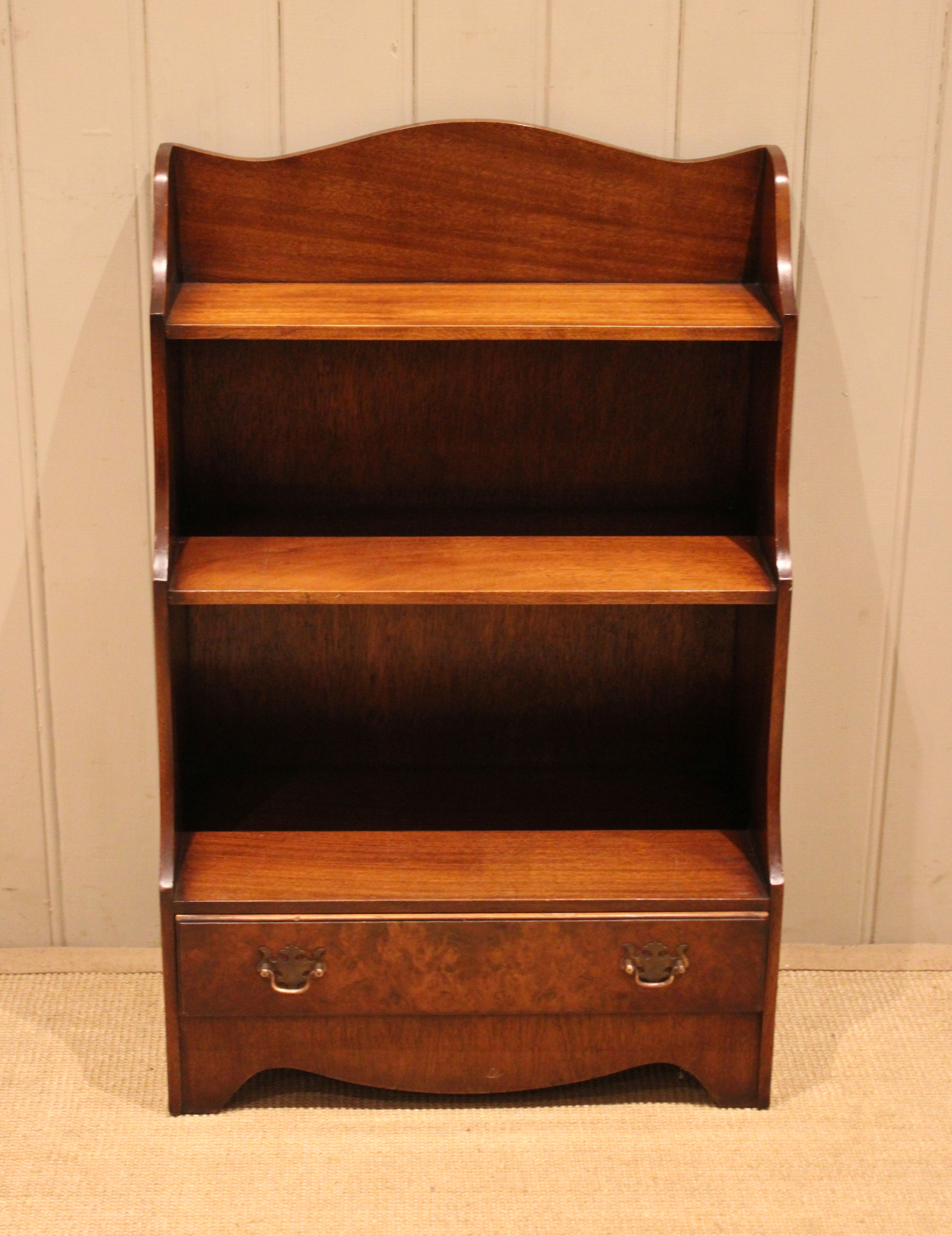 Small open mahogany and burr walnut bookcase having three fixed shelves above a burr walnut drawer to the base , raised on bracket feet . The shelf dimensions are 50.5 cm wide , and from the botton up 25 cm highx 24.5 cm deep and 20 cm high x 19 cm deep .