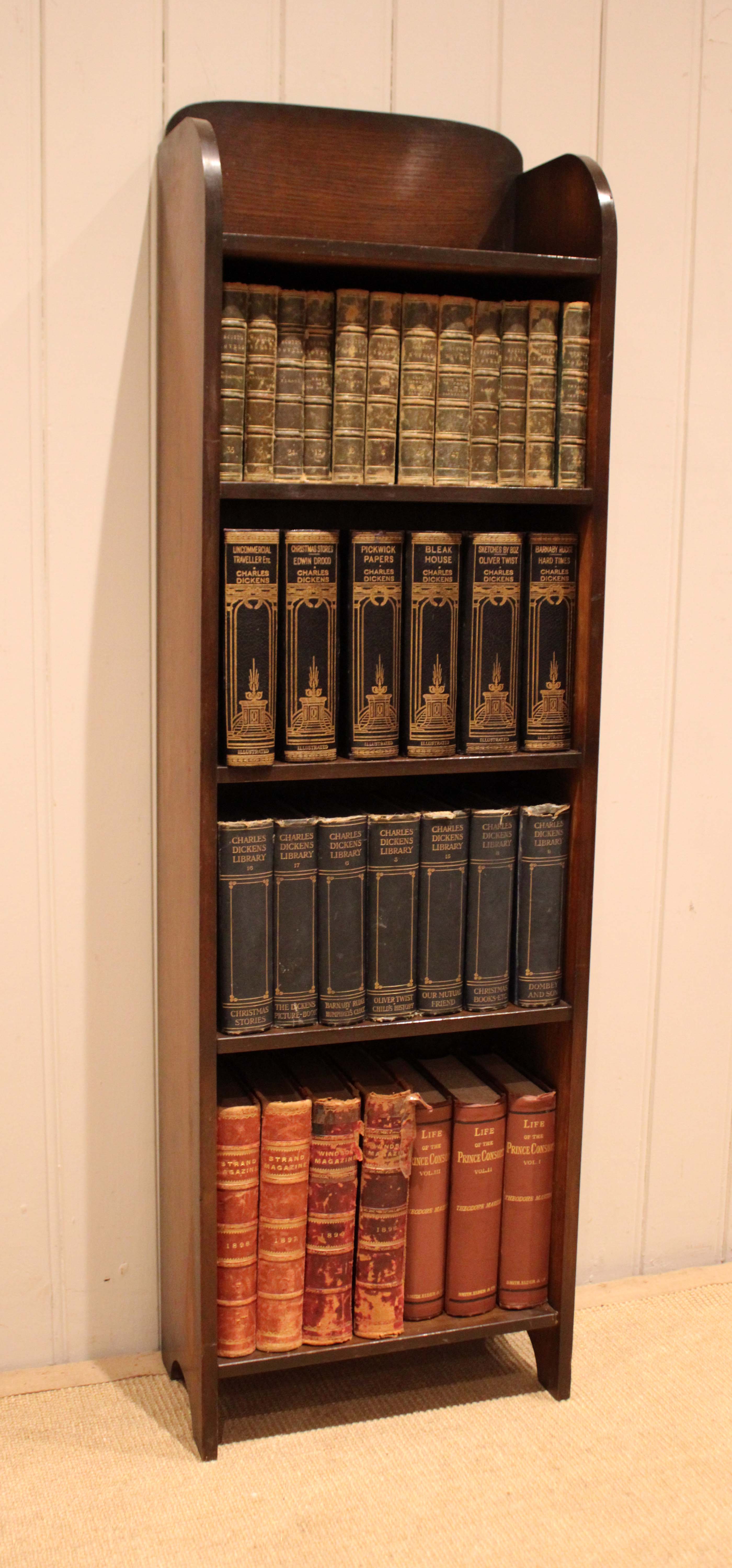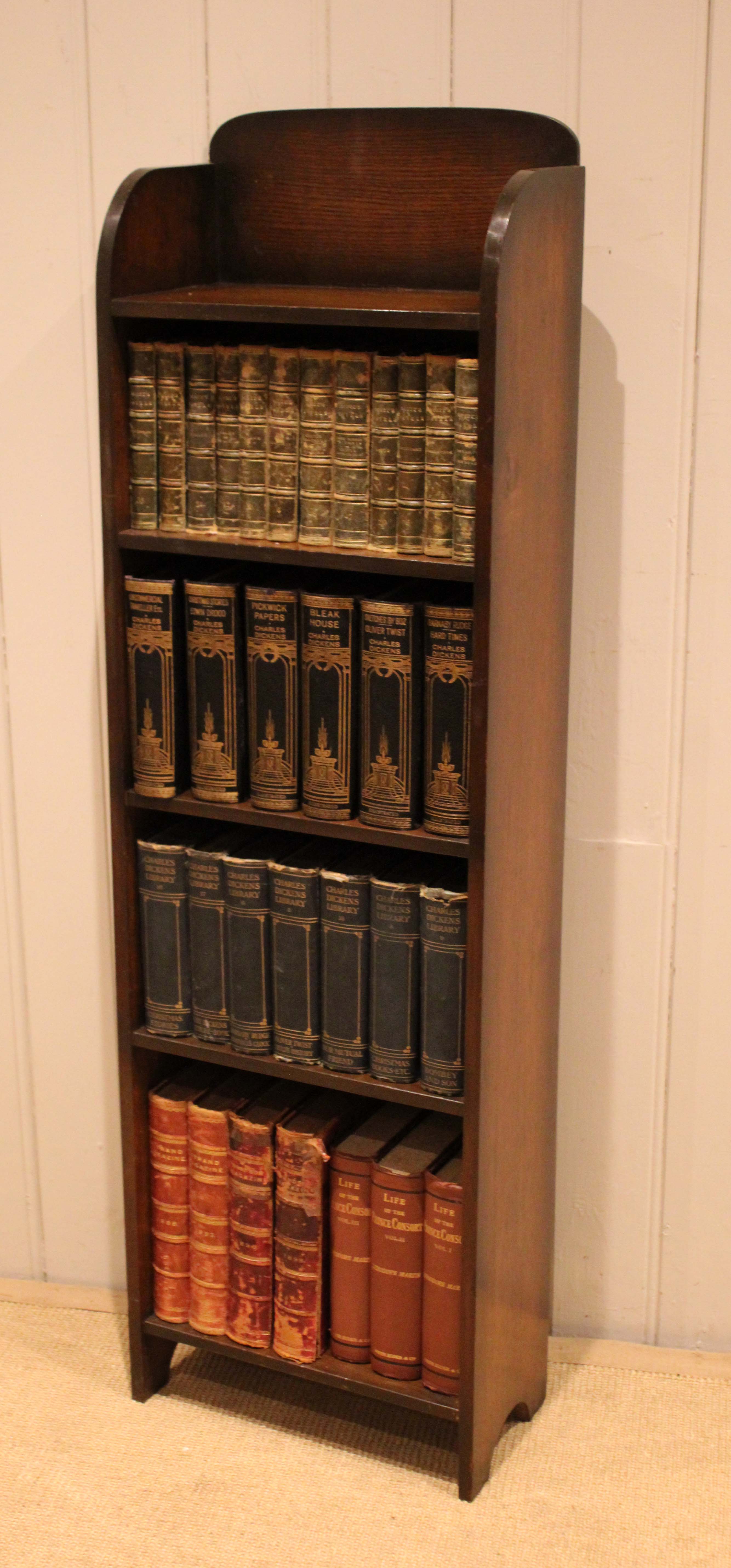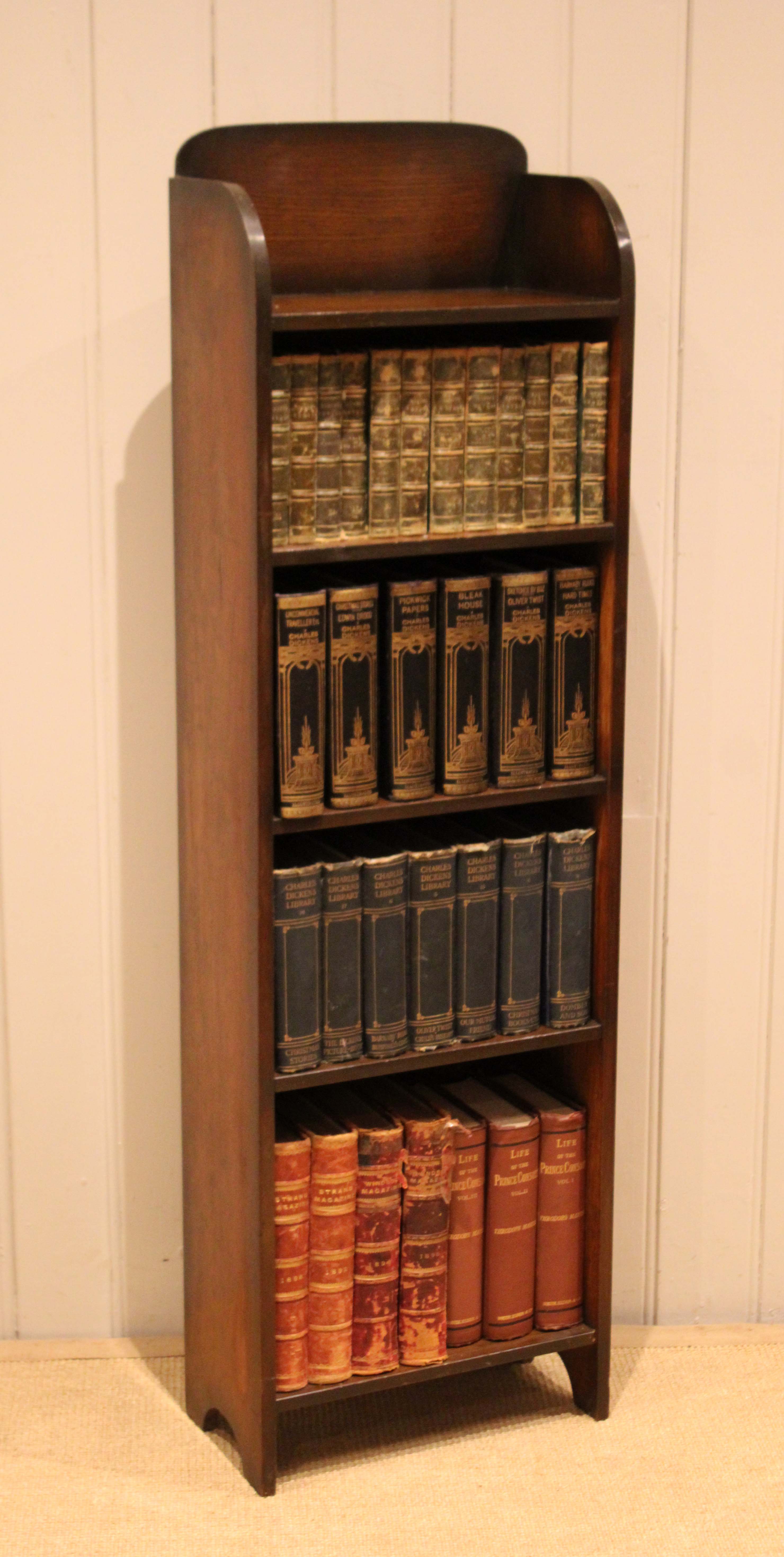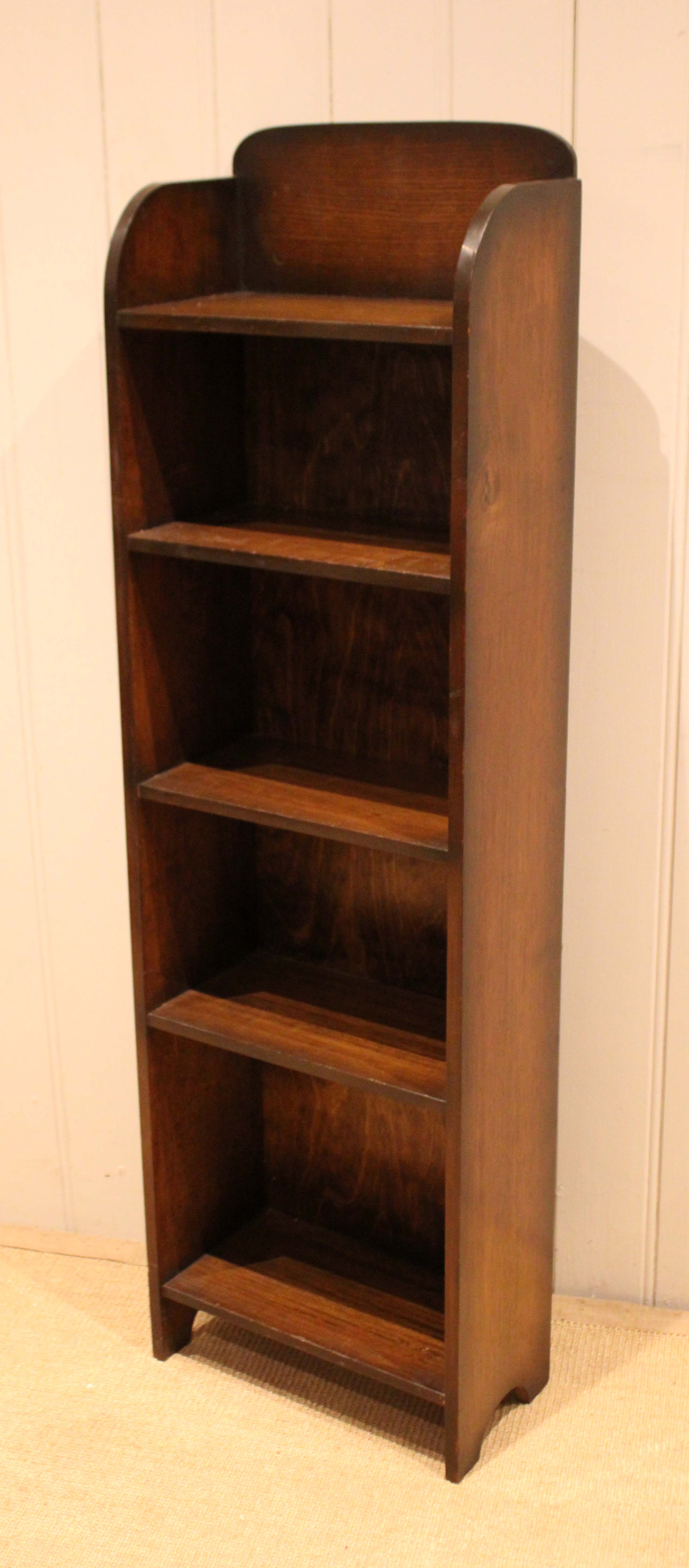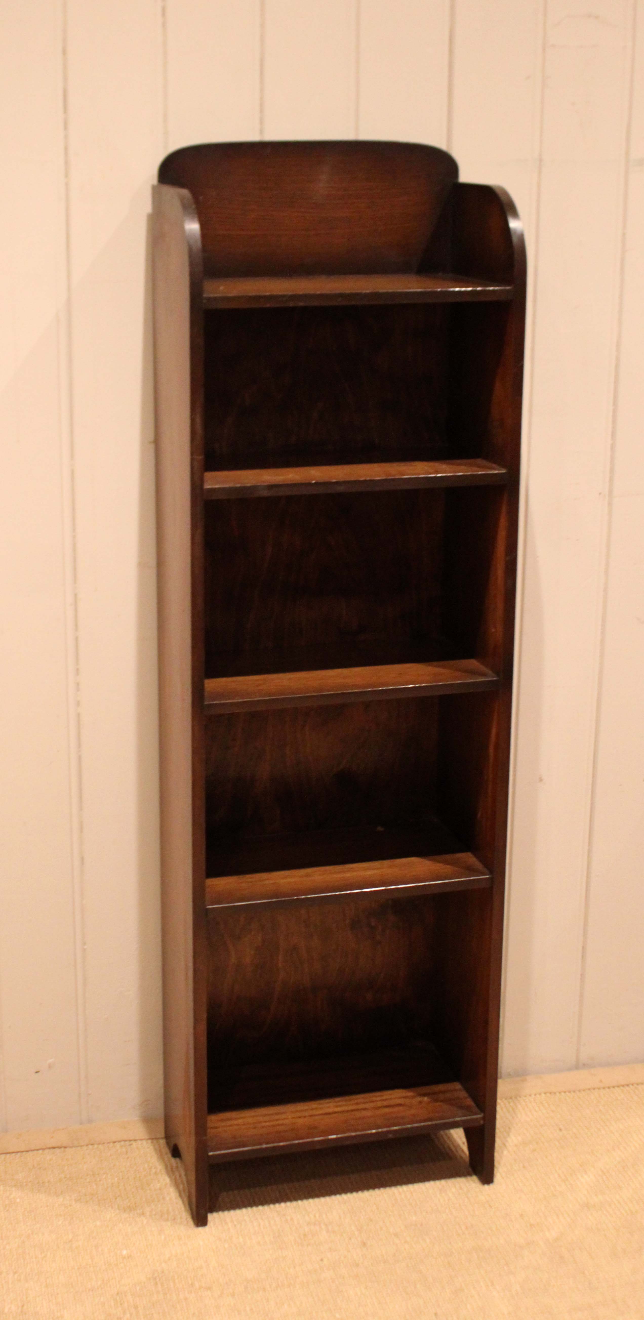 Small oak open bookcase having four fixed shelves , an arch top , raised on side bracket supports .