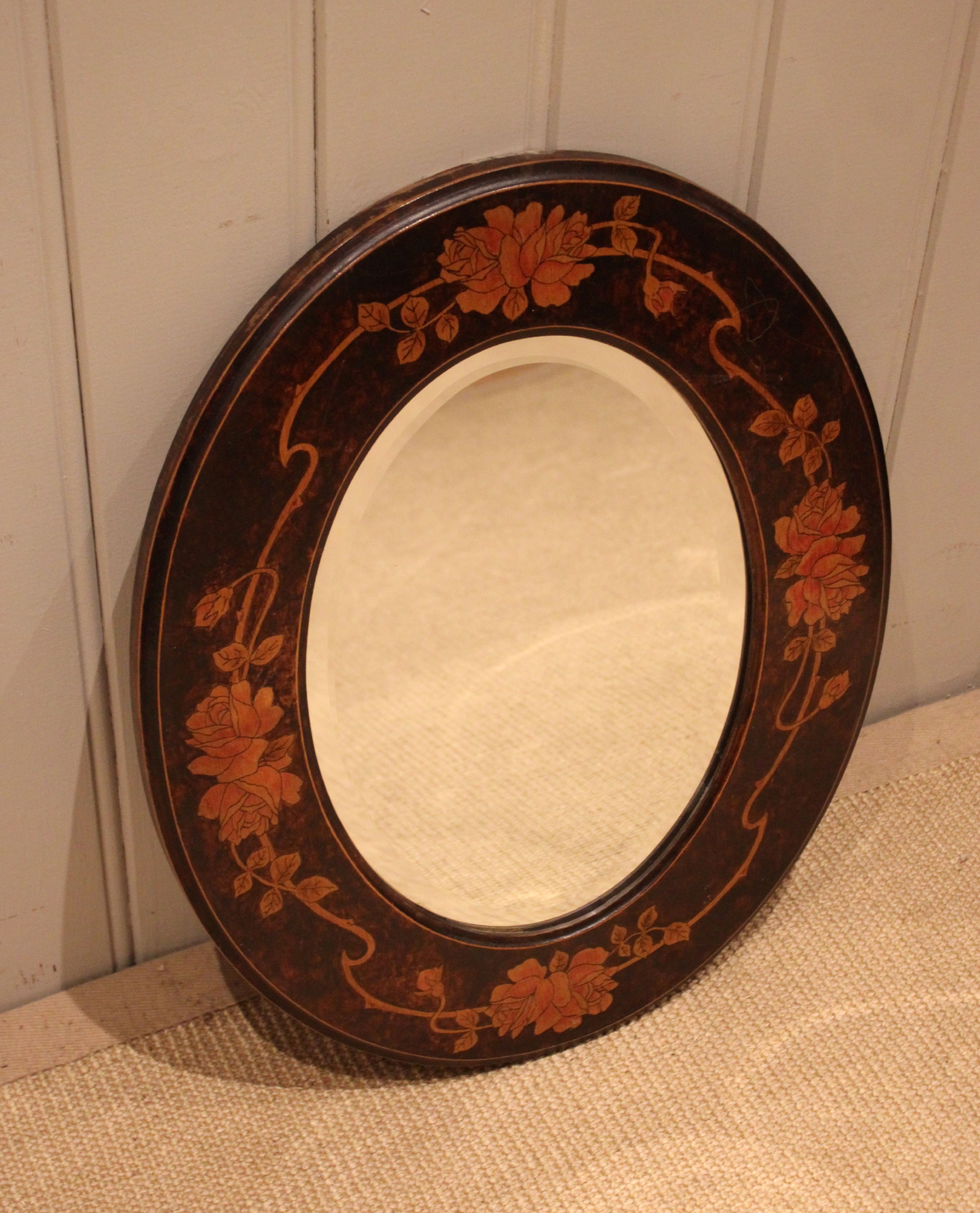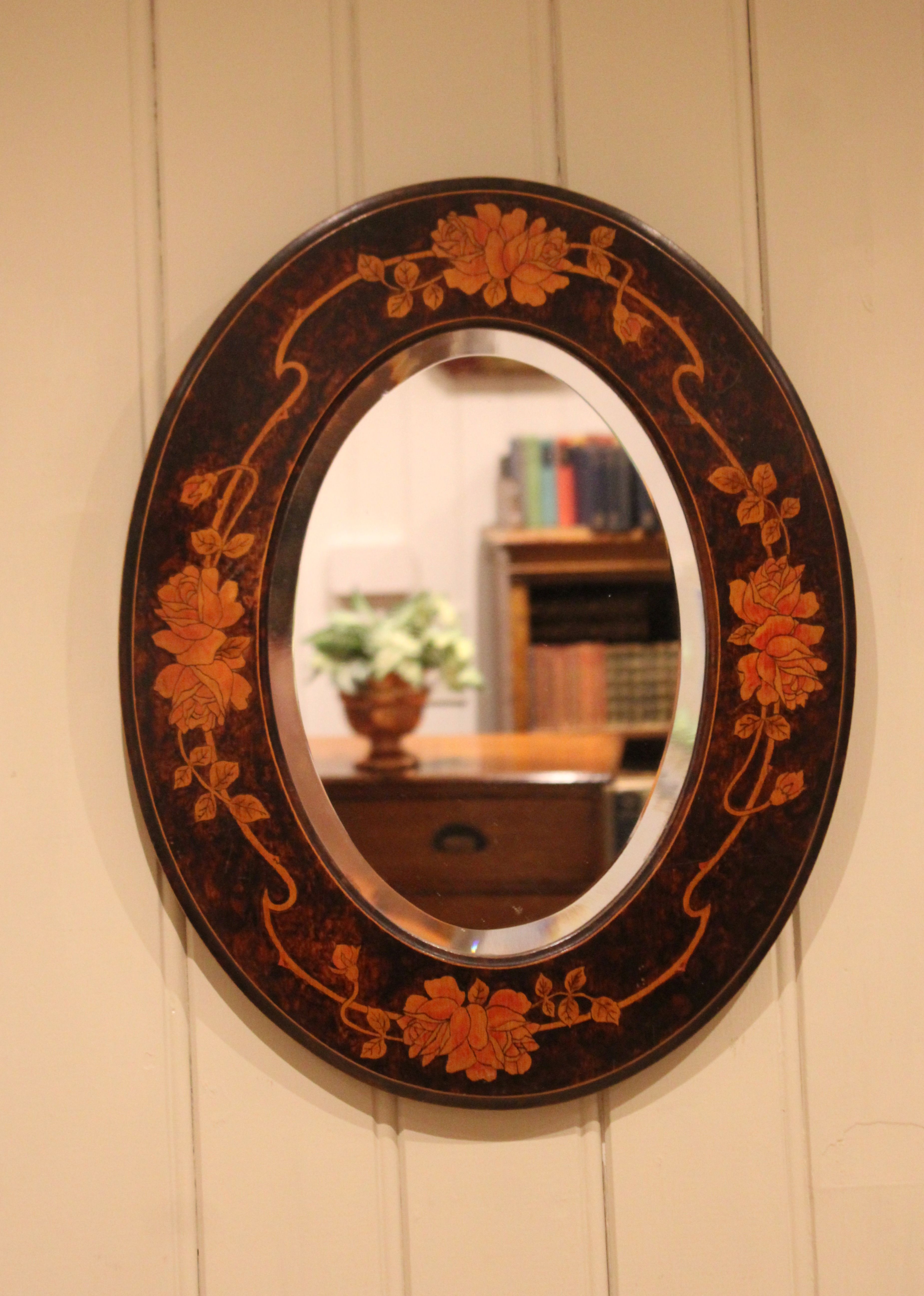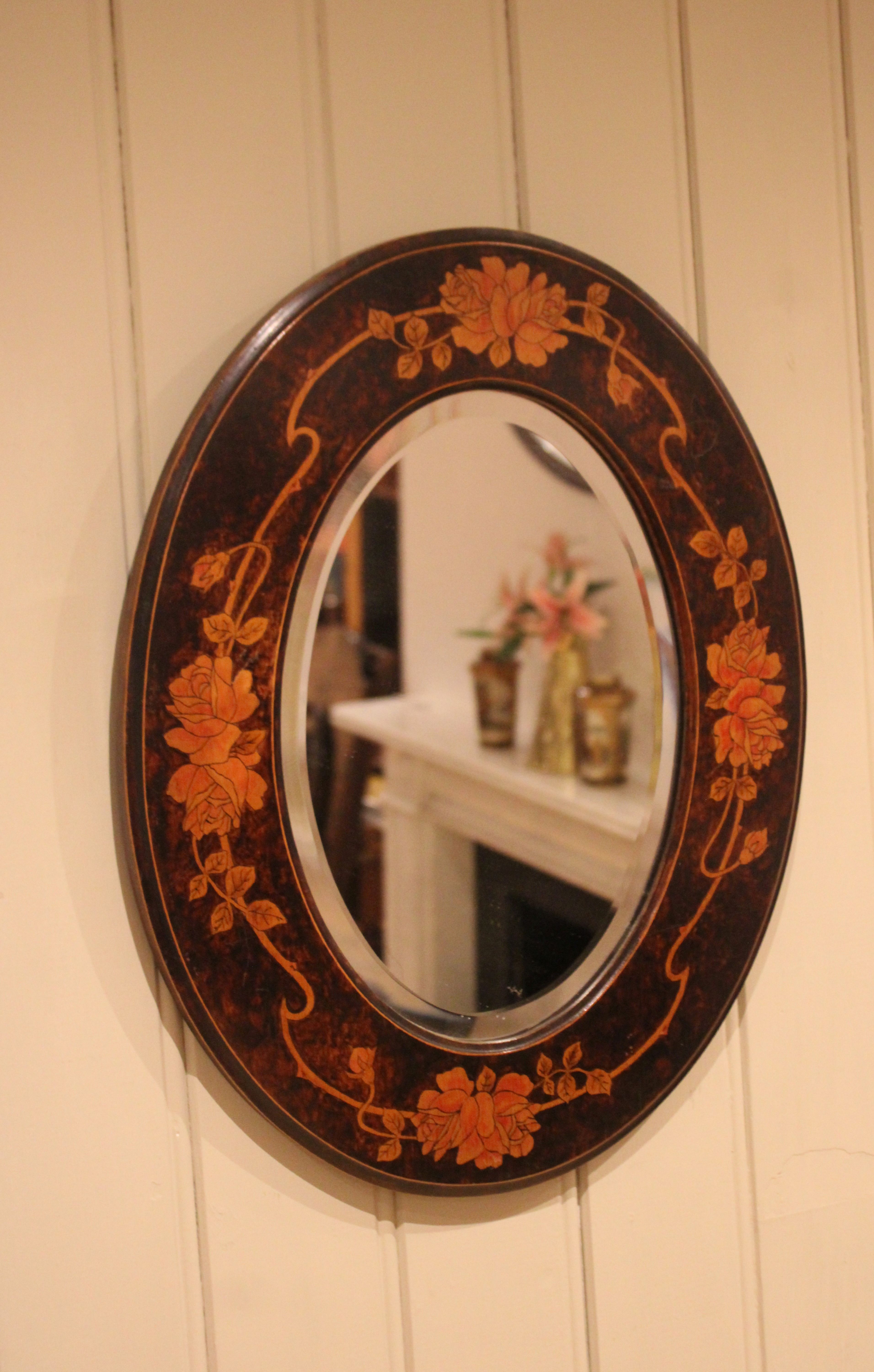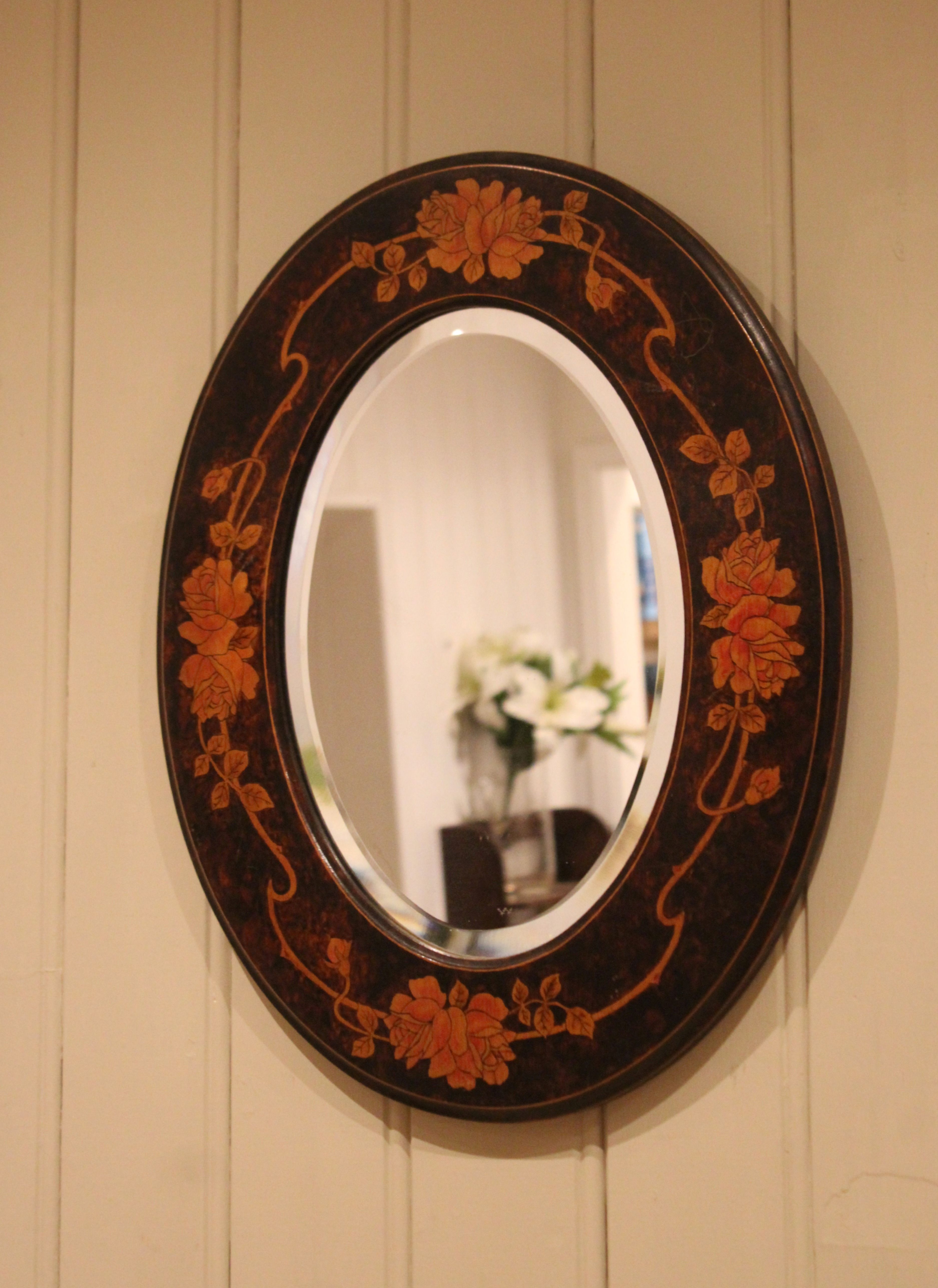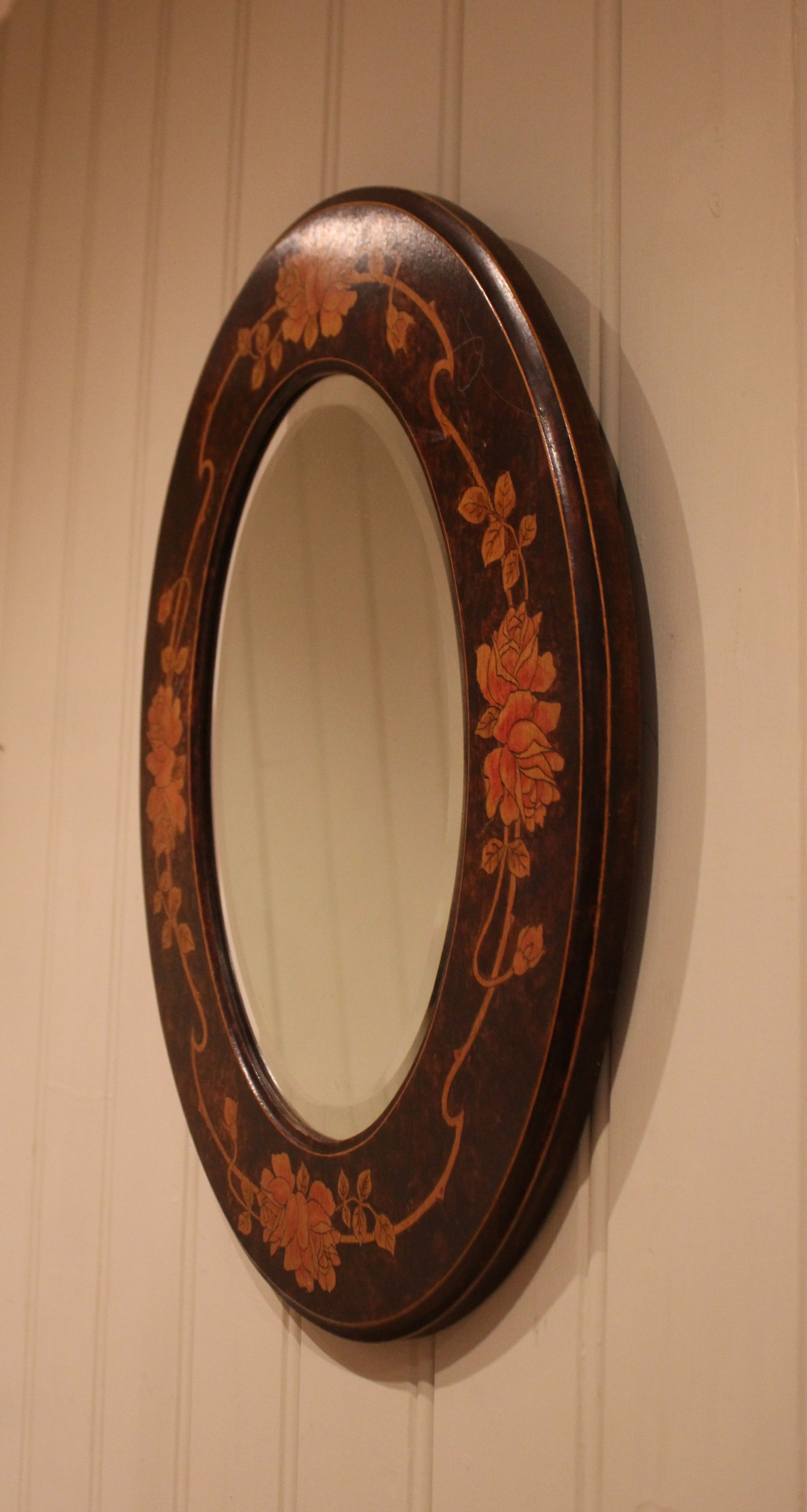 Attractive small oval beech wood wall mirror having floral decoration throughout with an inset bevel edge mirror.