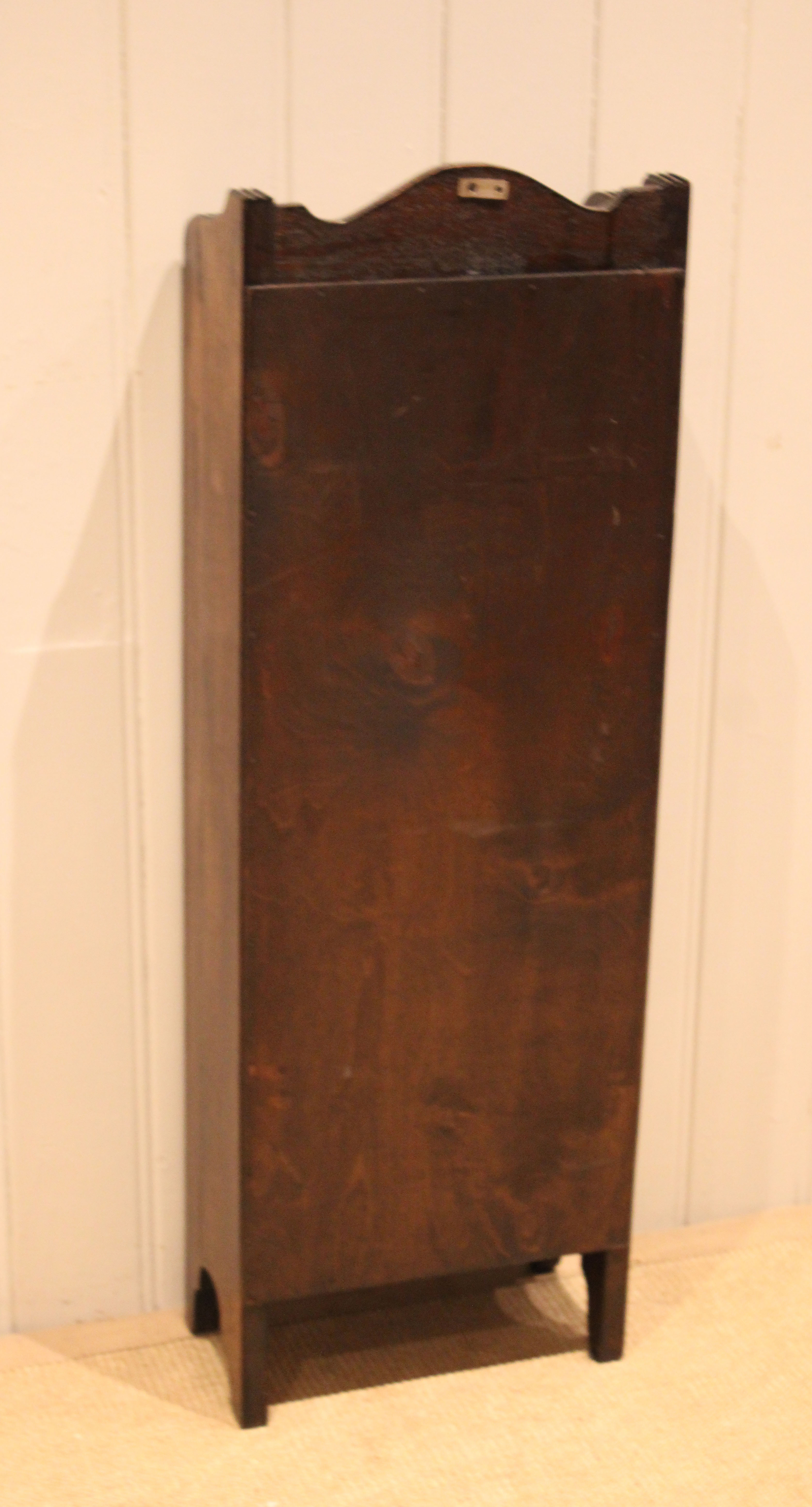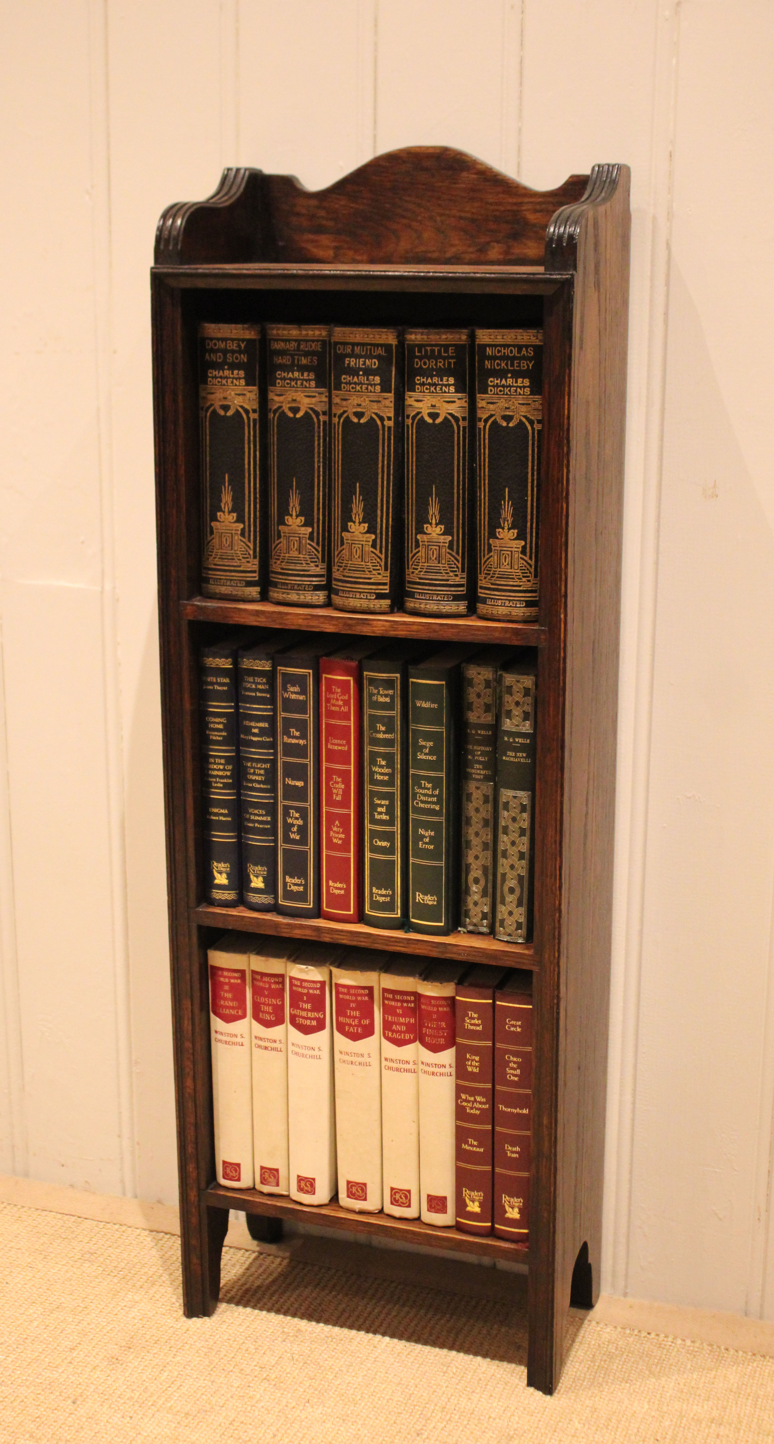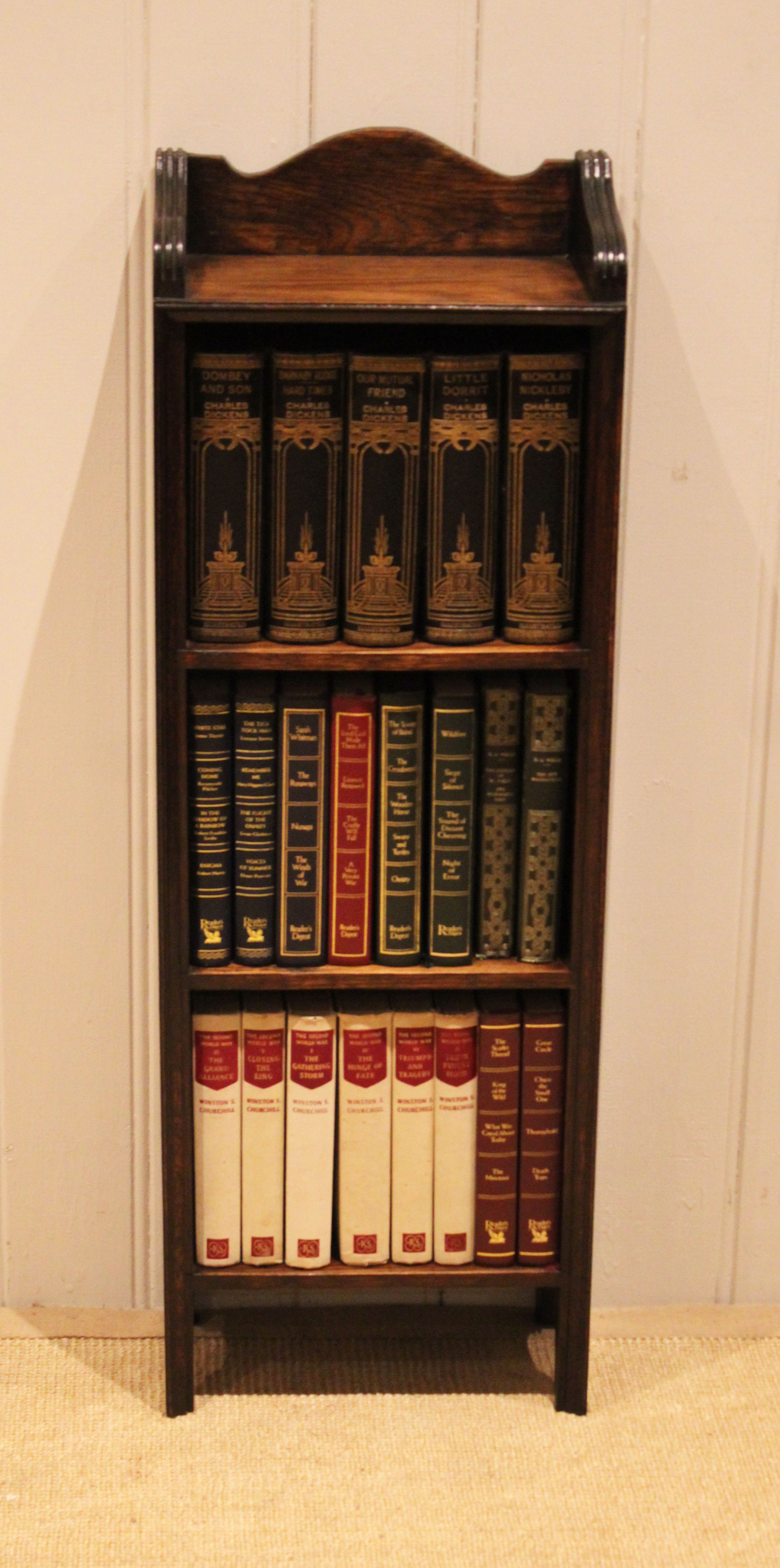 Small proportioned oak open bookcase having a reeded top edge with three fixed shelves , raised on side brackets . The shelf dimensions are 13.5 cm deep , 26.5 cm wide and 22.5 cm high .