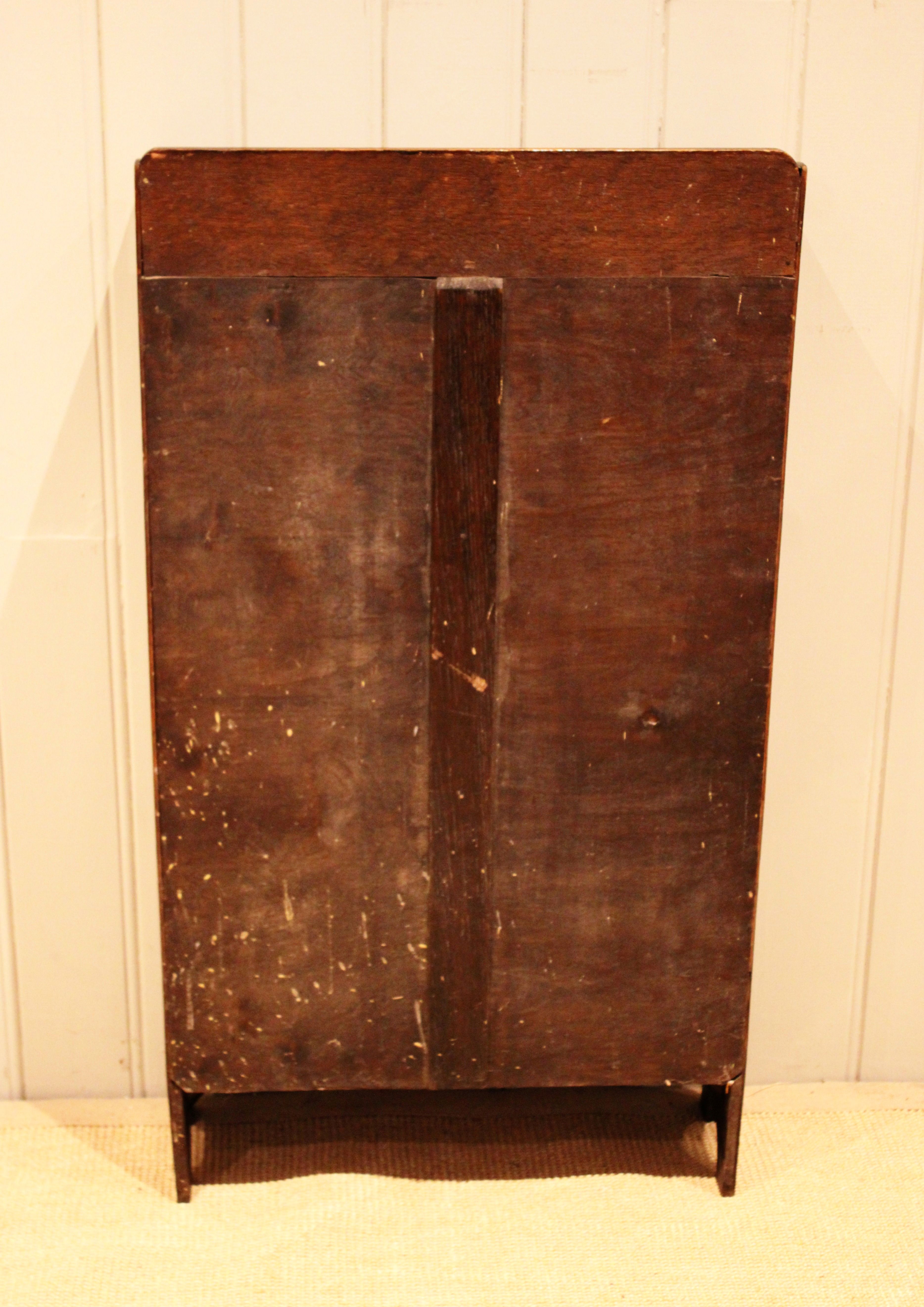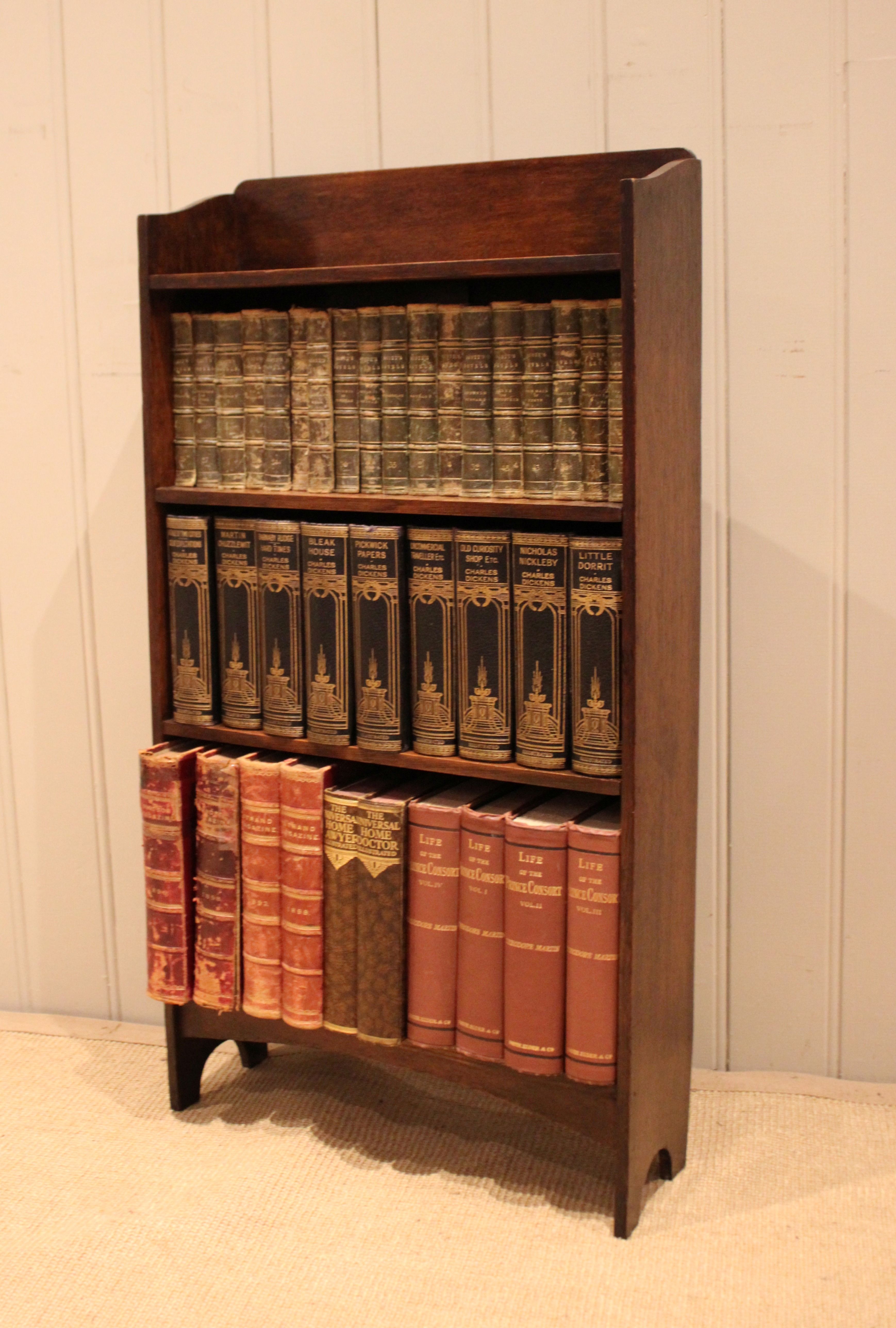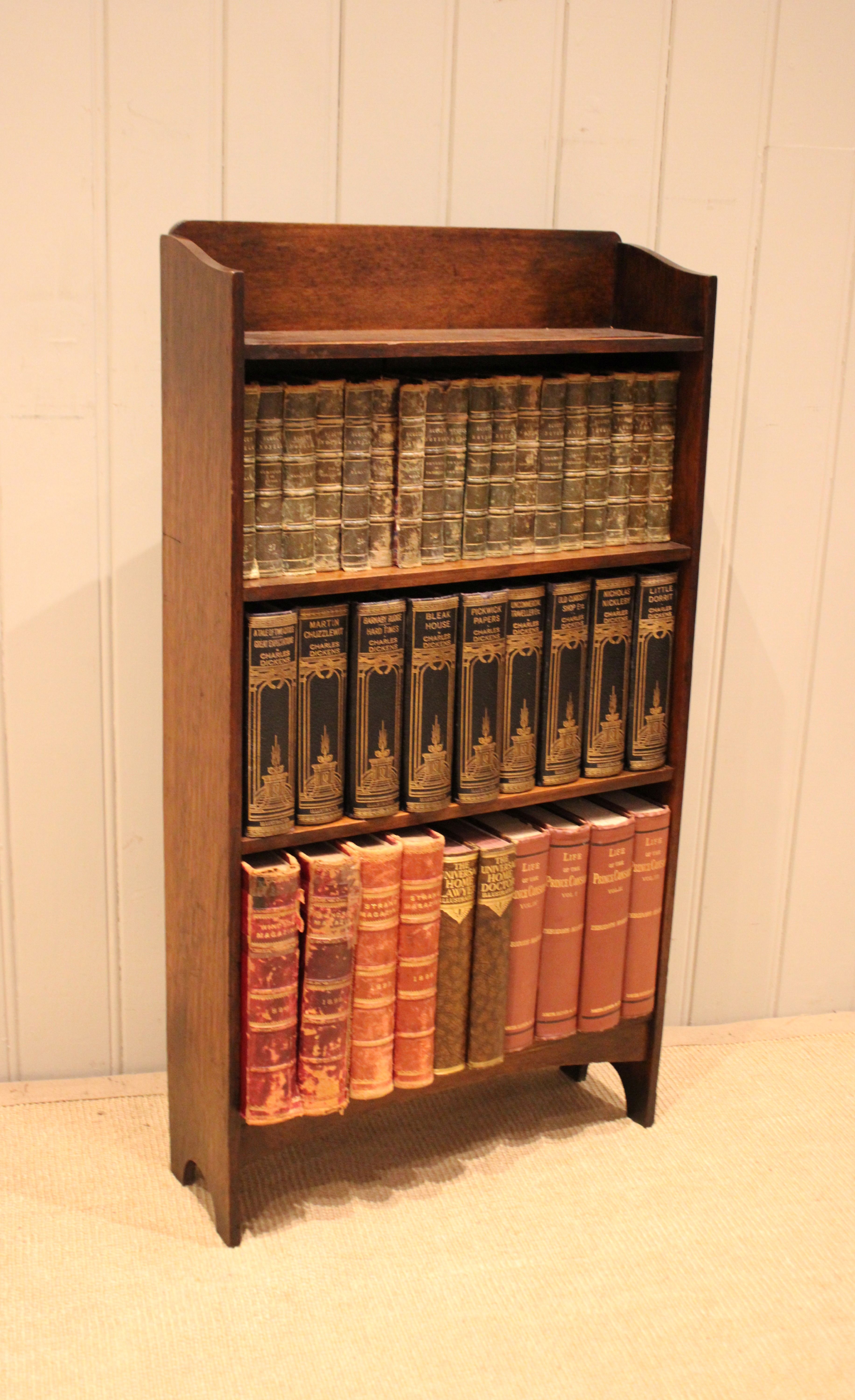 Small solid oak open bookcase having three fixed shelves , with a shaped back , raised on side brackets . The shelf dimensions are 14.5 cm deep , 48.5 cm wide and from the bottom up 25.5 cm high , 21.5 cm high and at the top 18.5 cm high. Pair Avaliable