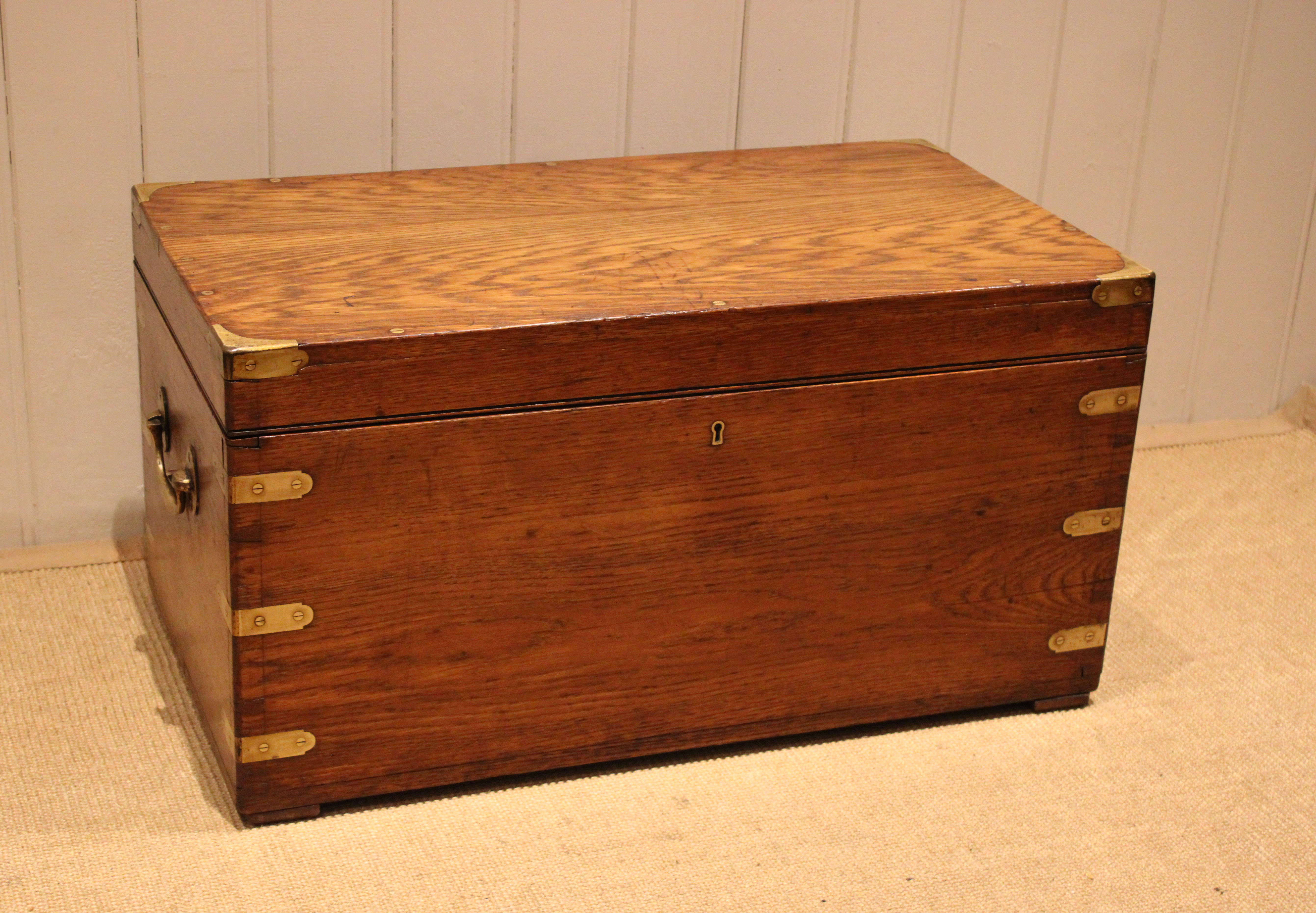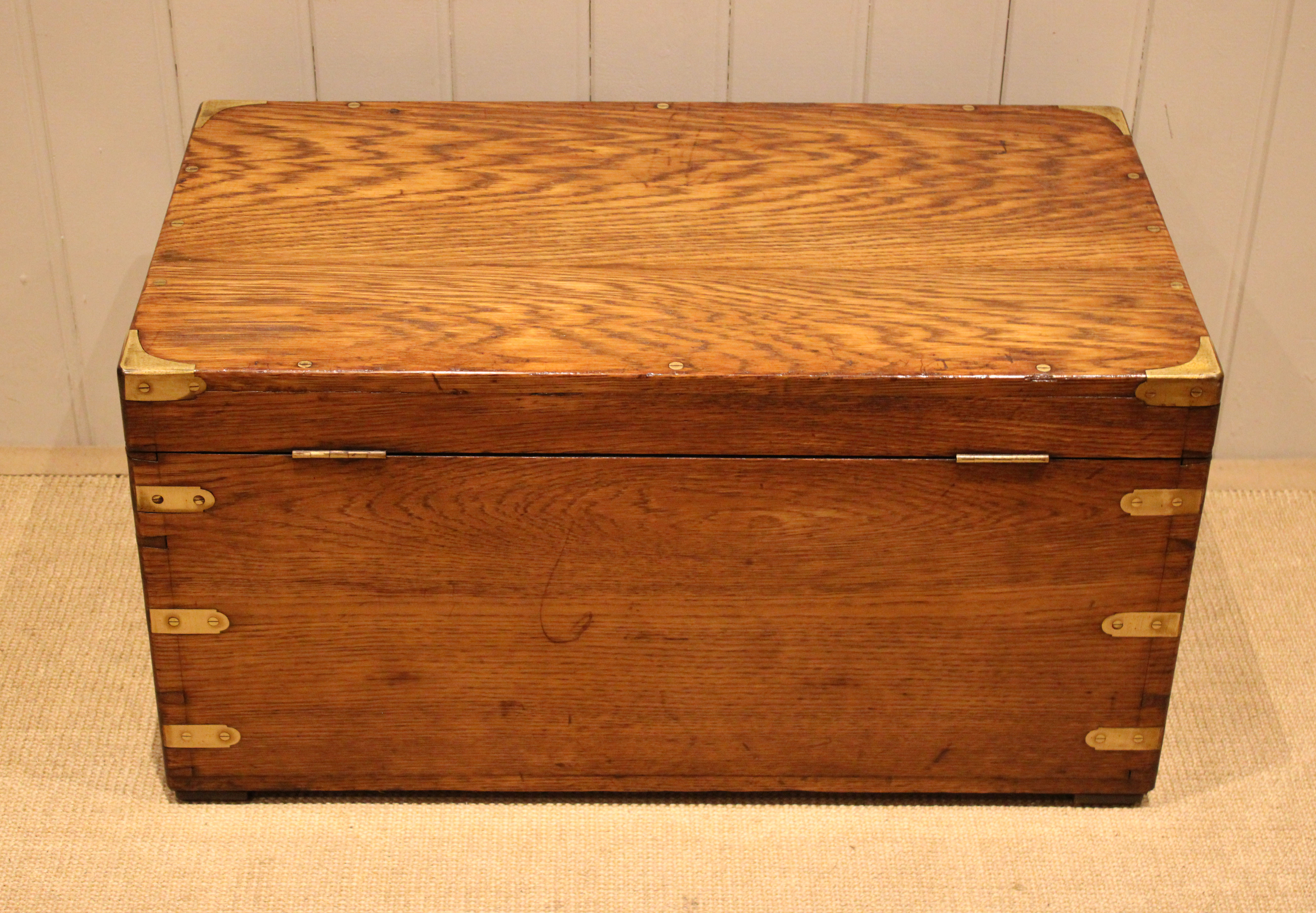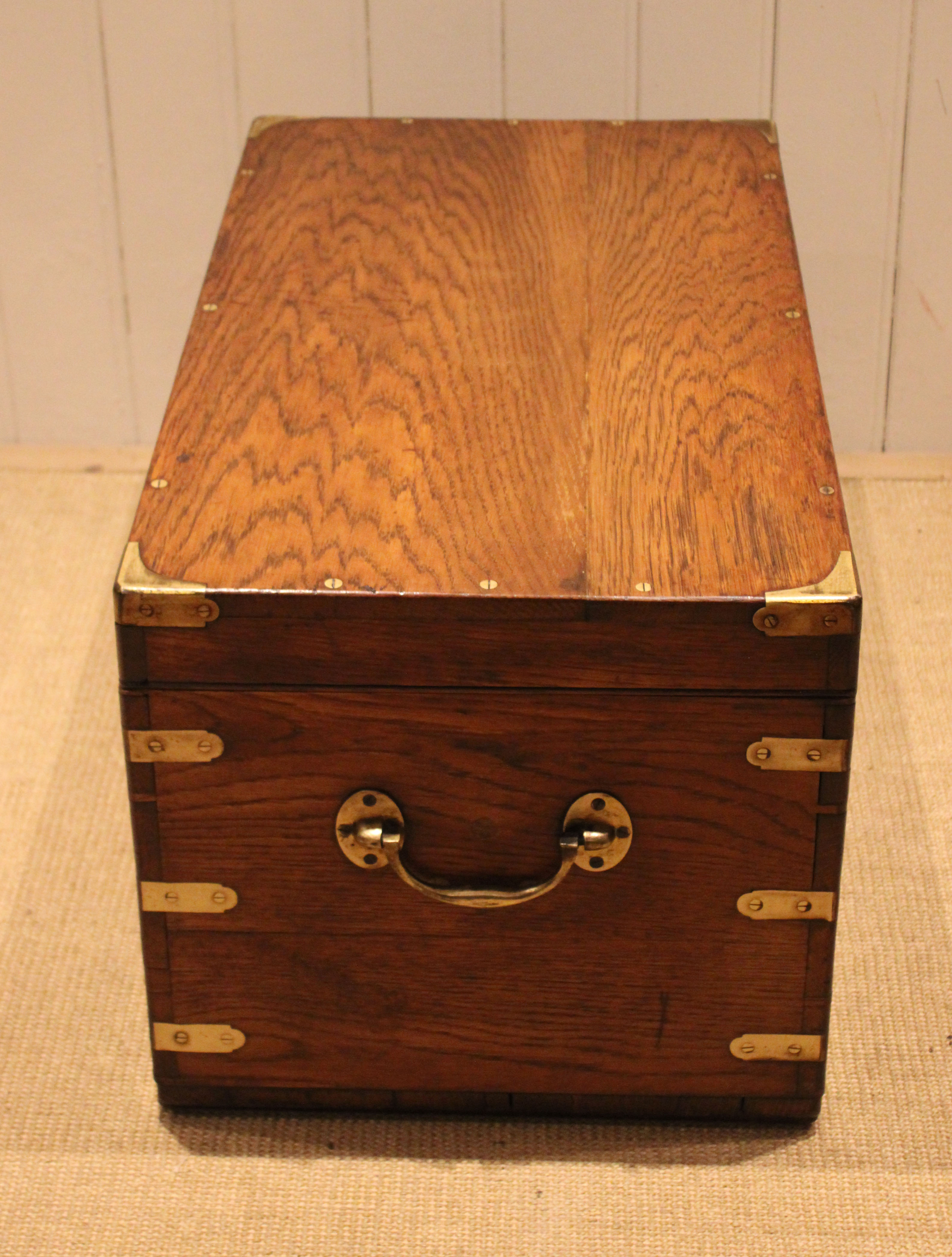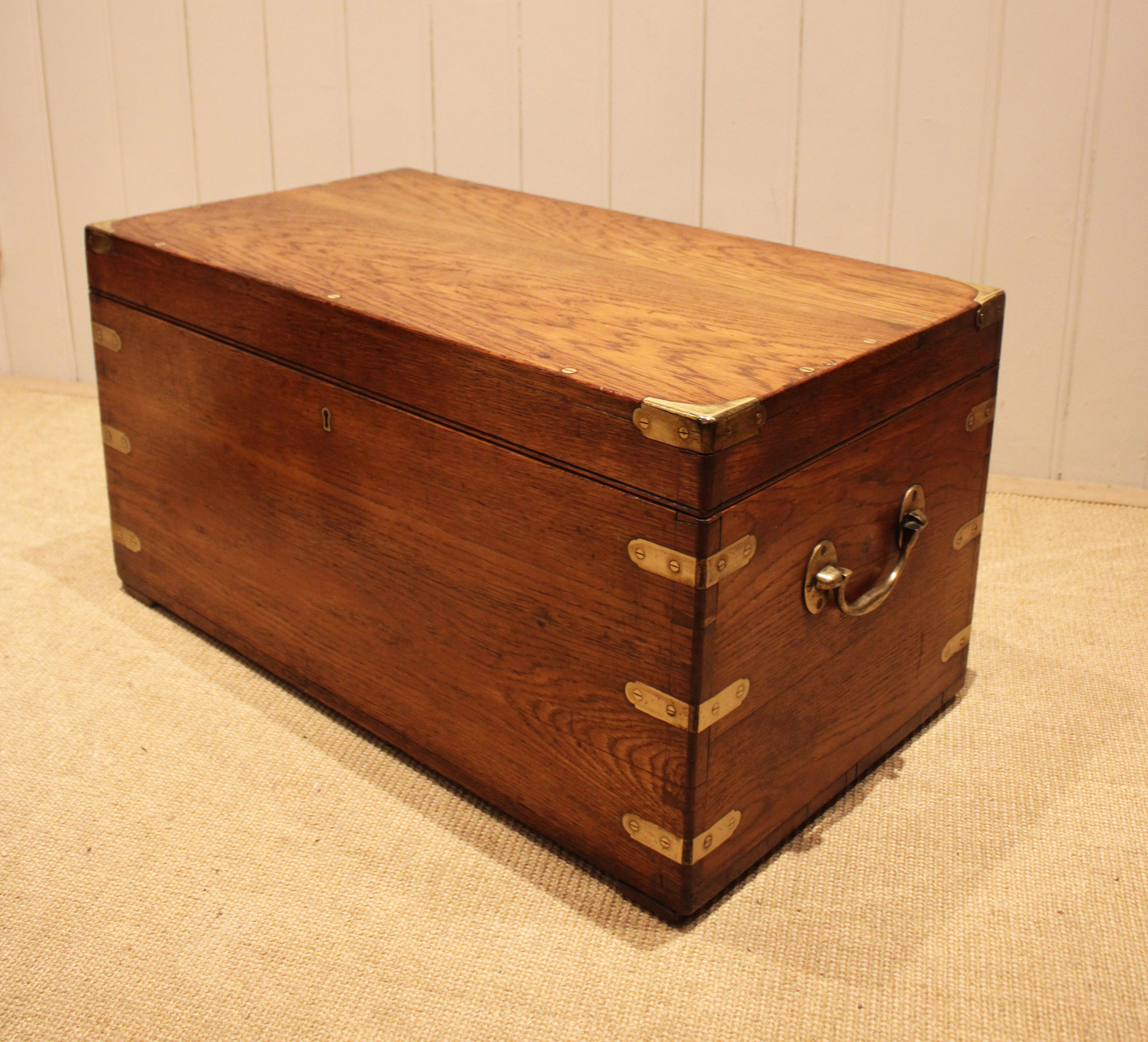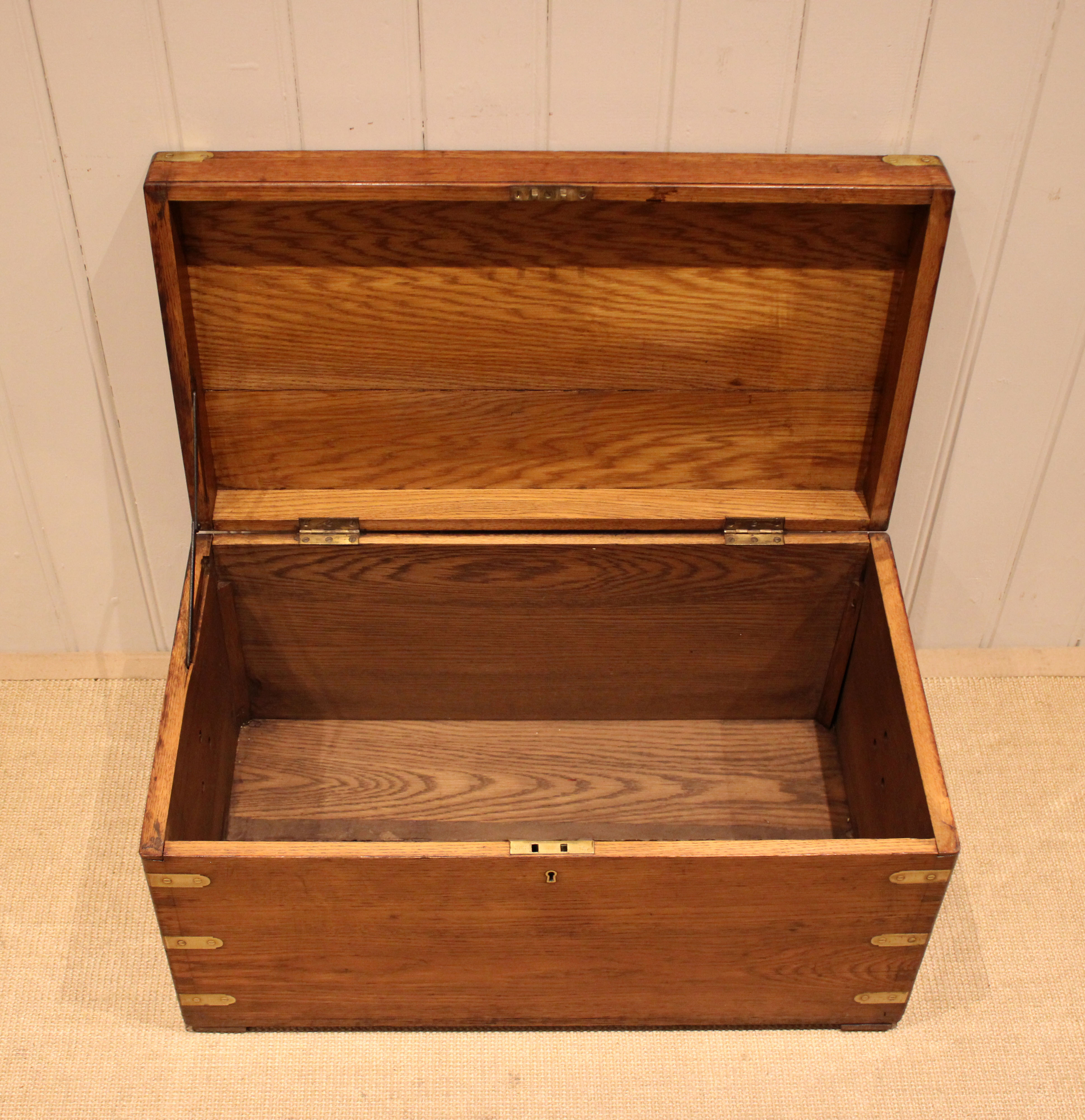 Late 19th century solid oak brass bound trunk having handles to each side , with a hinged lid . The internal depth is 29 cm .