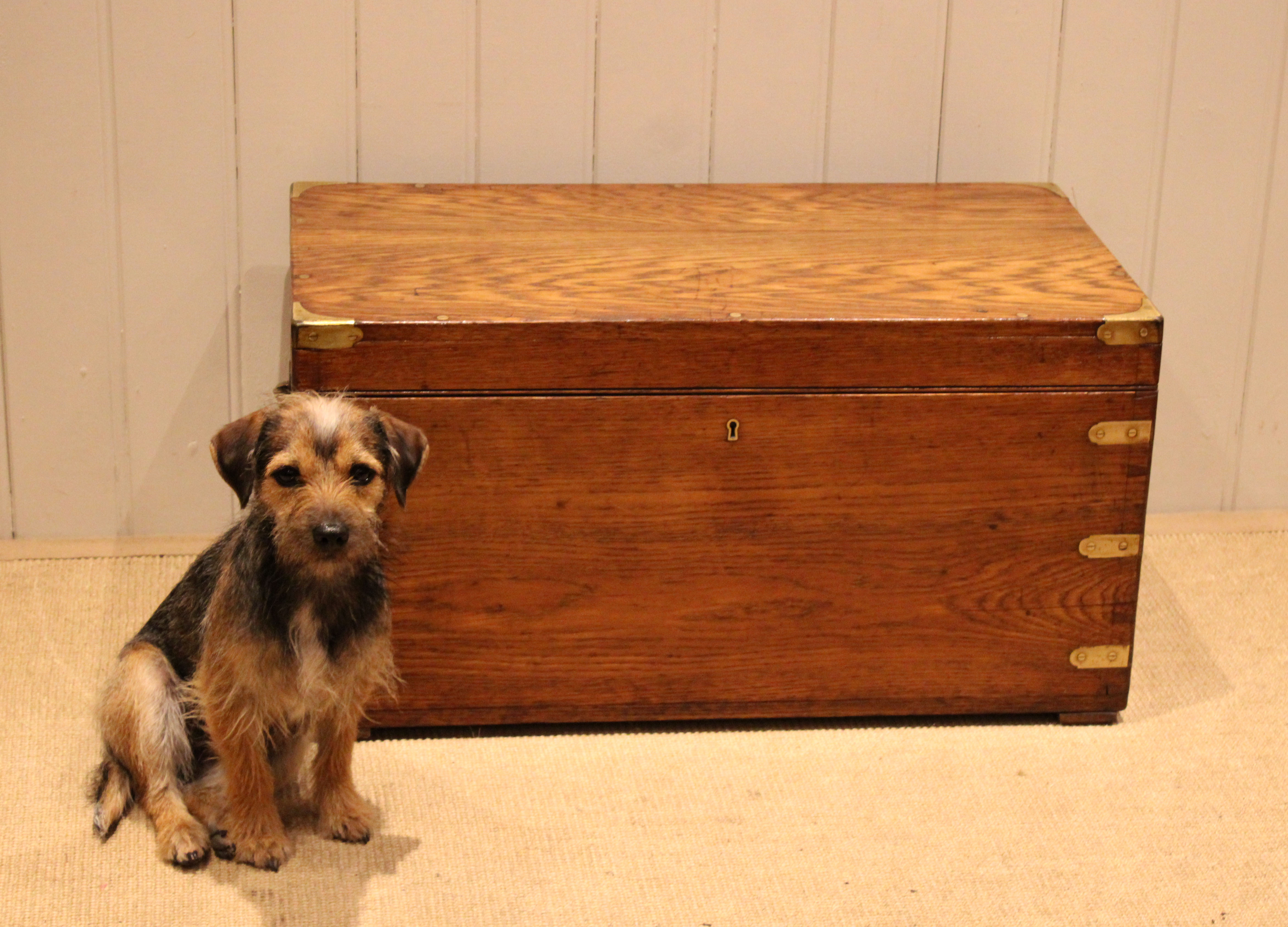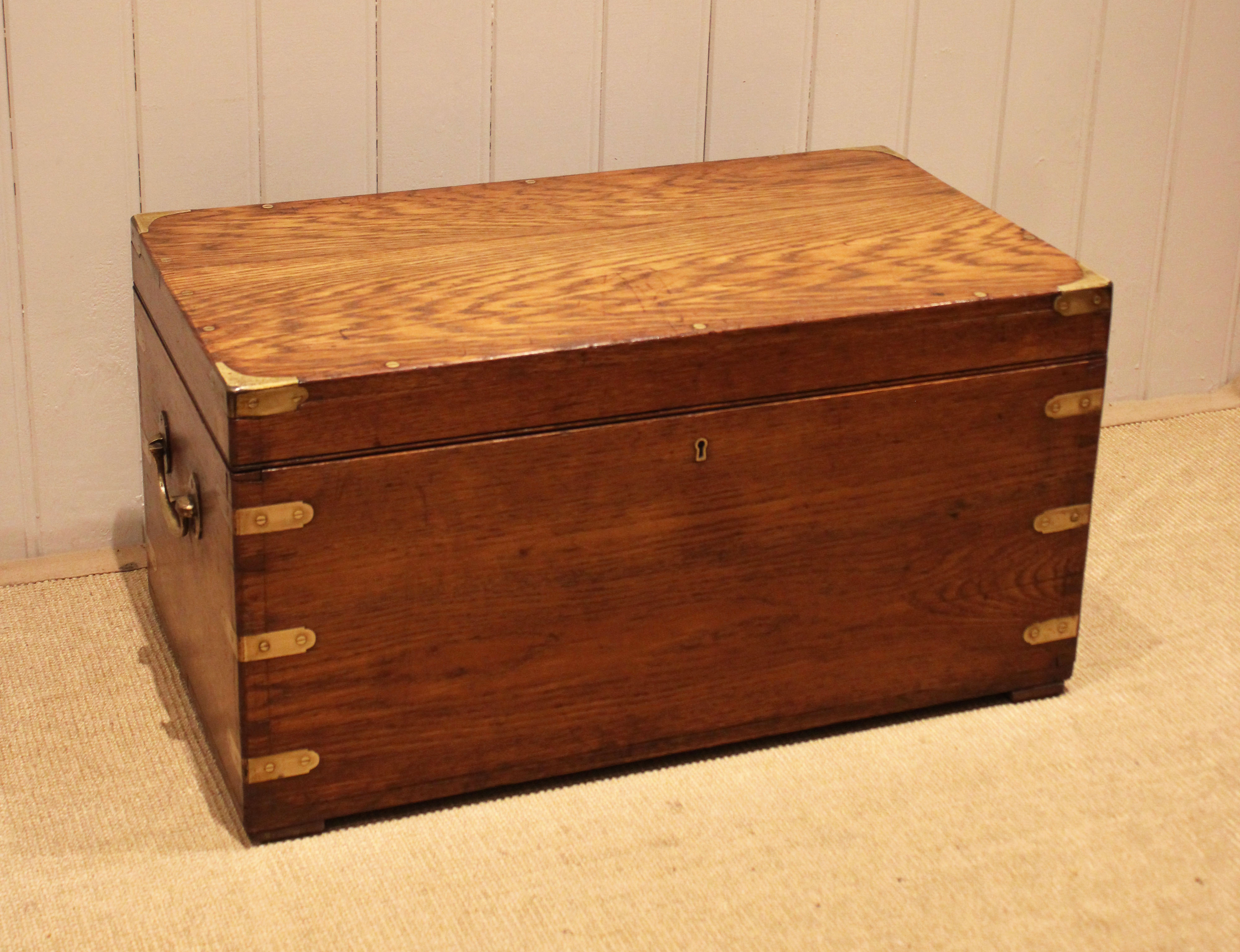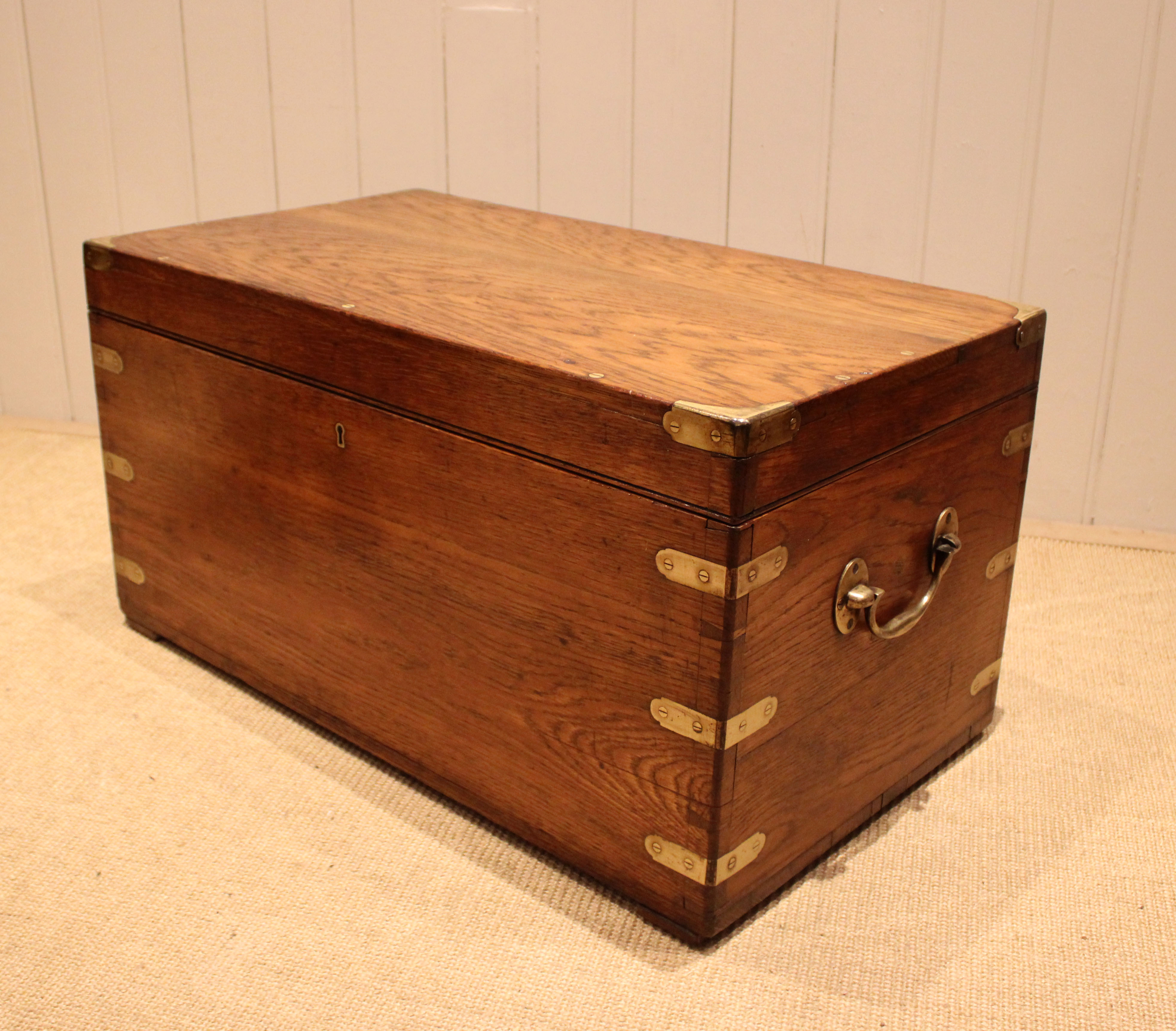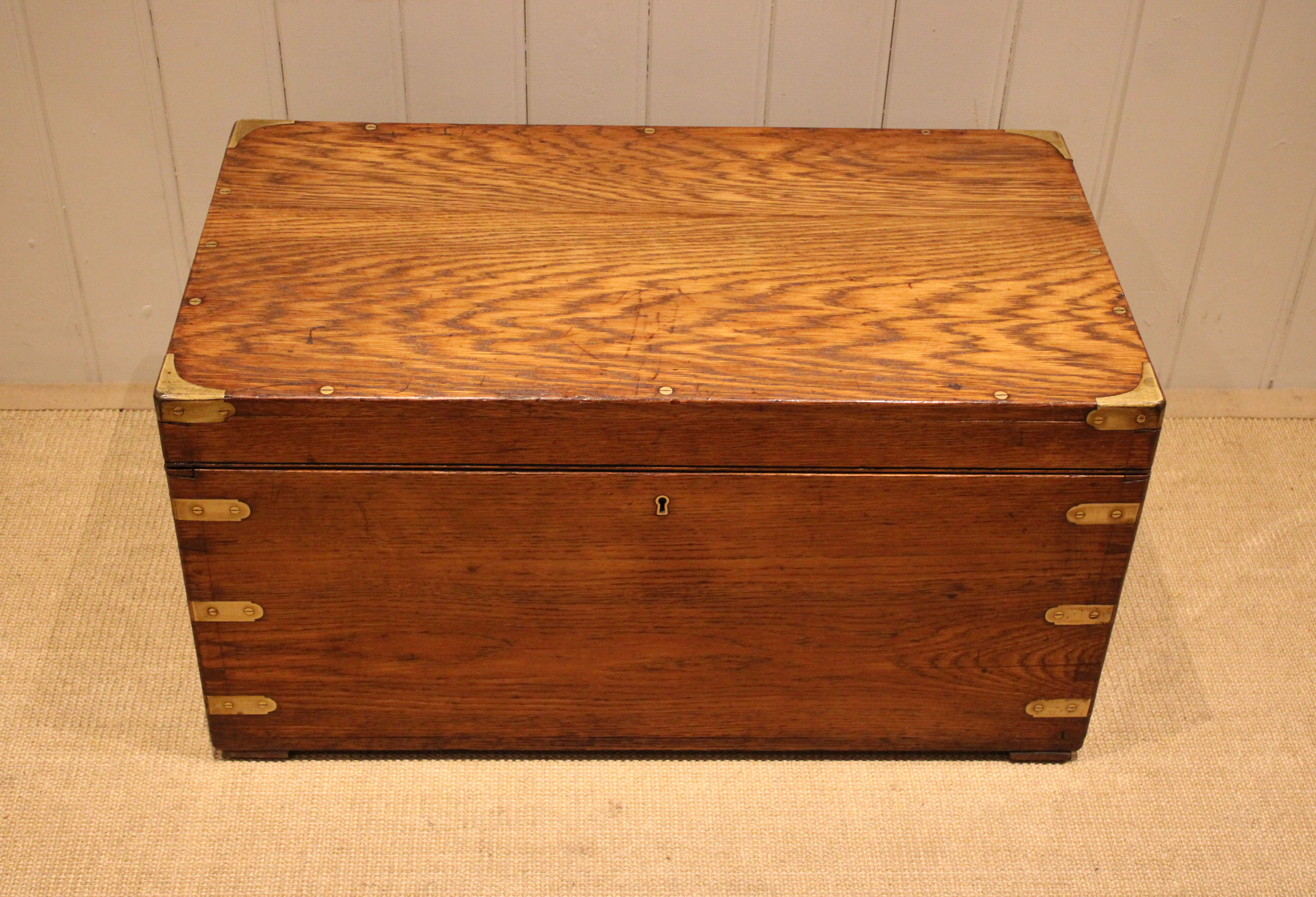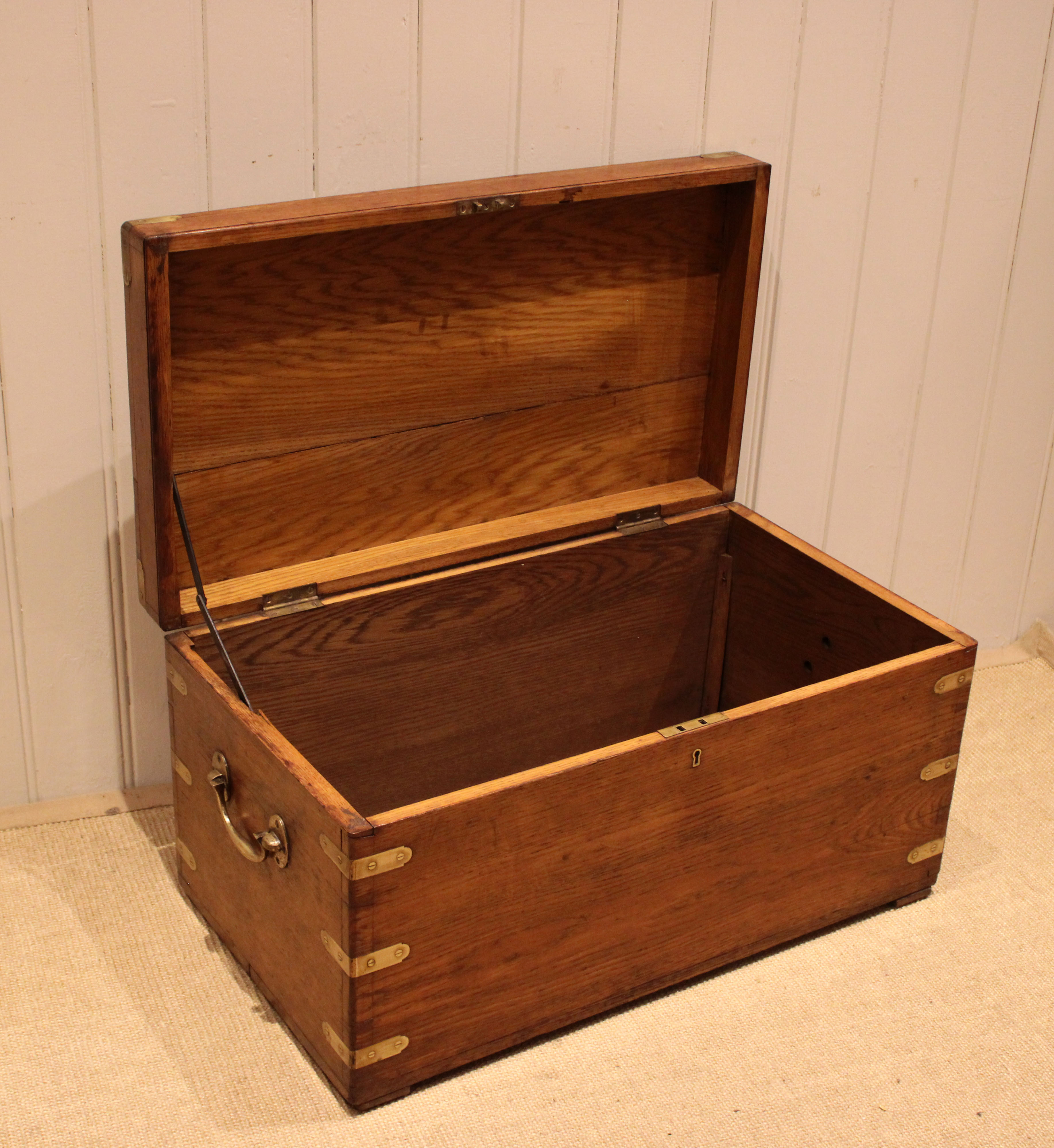 Late 19th century solid oak brass bound trunk having handles to each side , with a hinged lid . The internal depth is 29 cm .