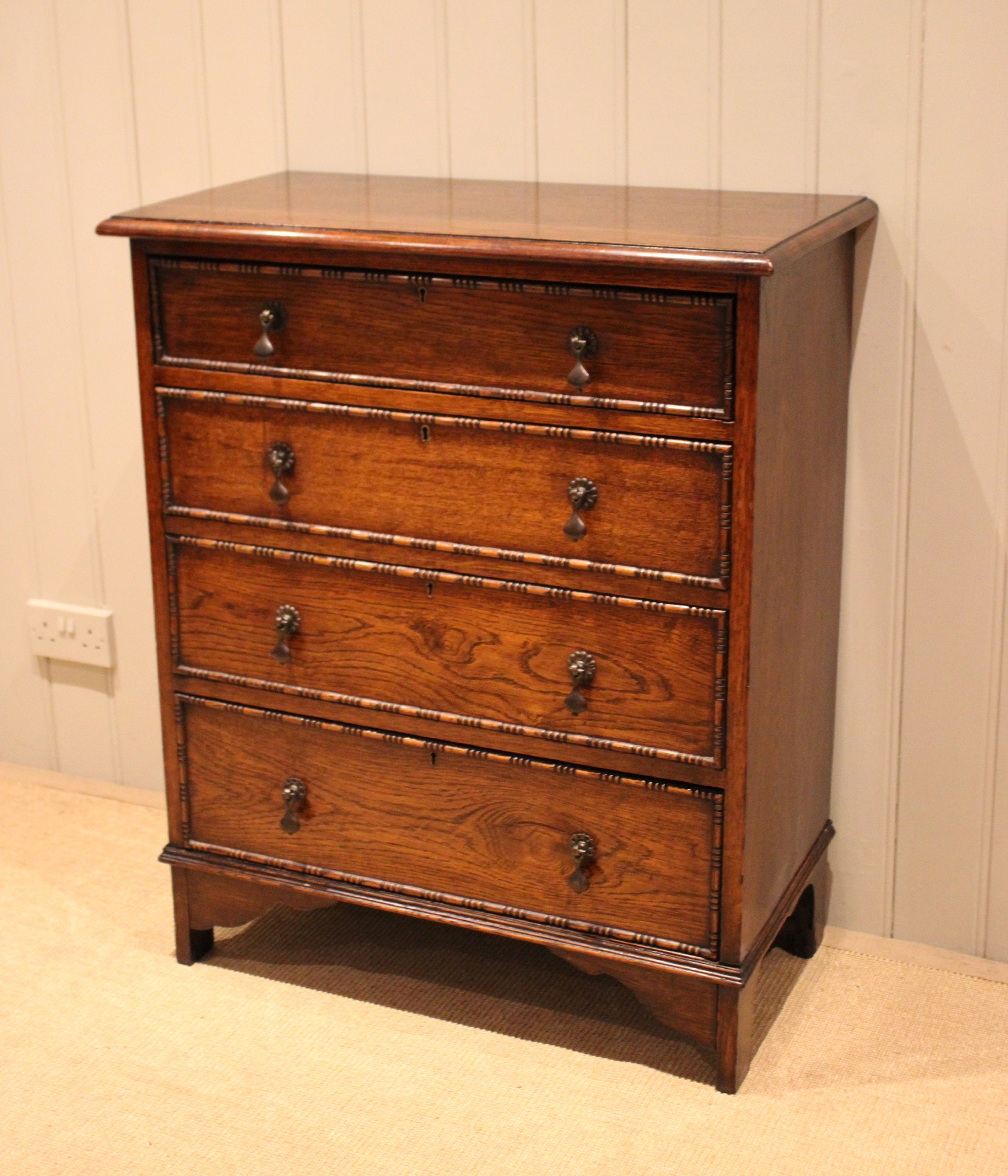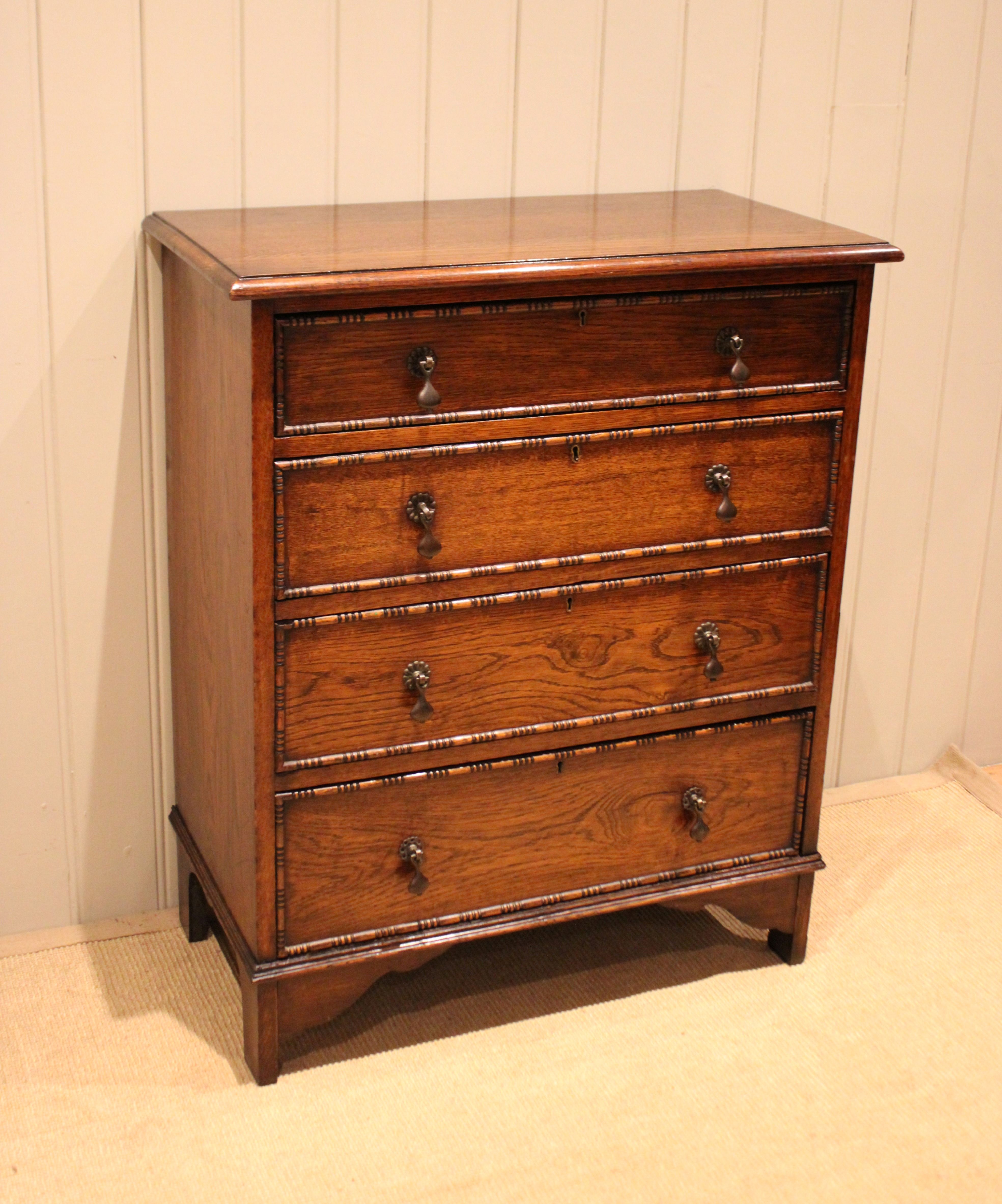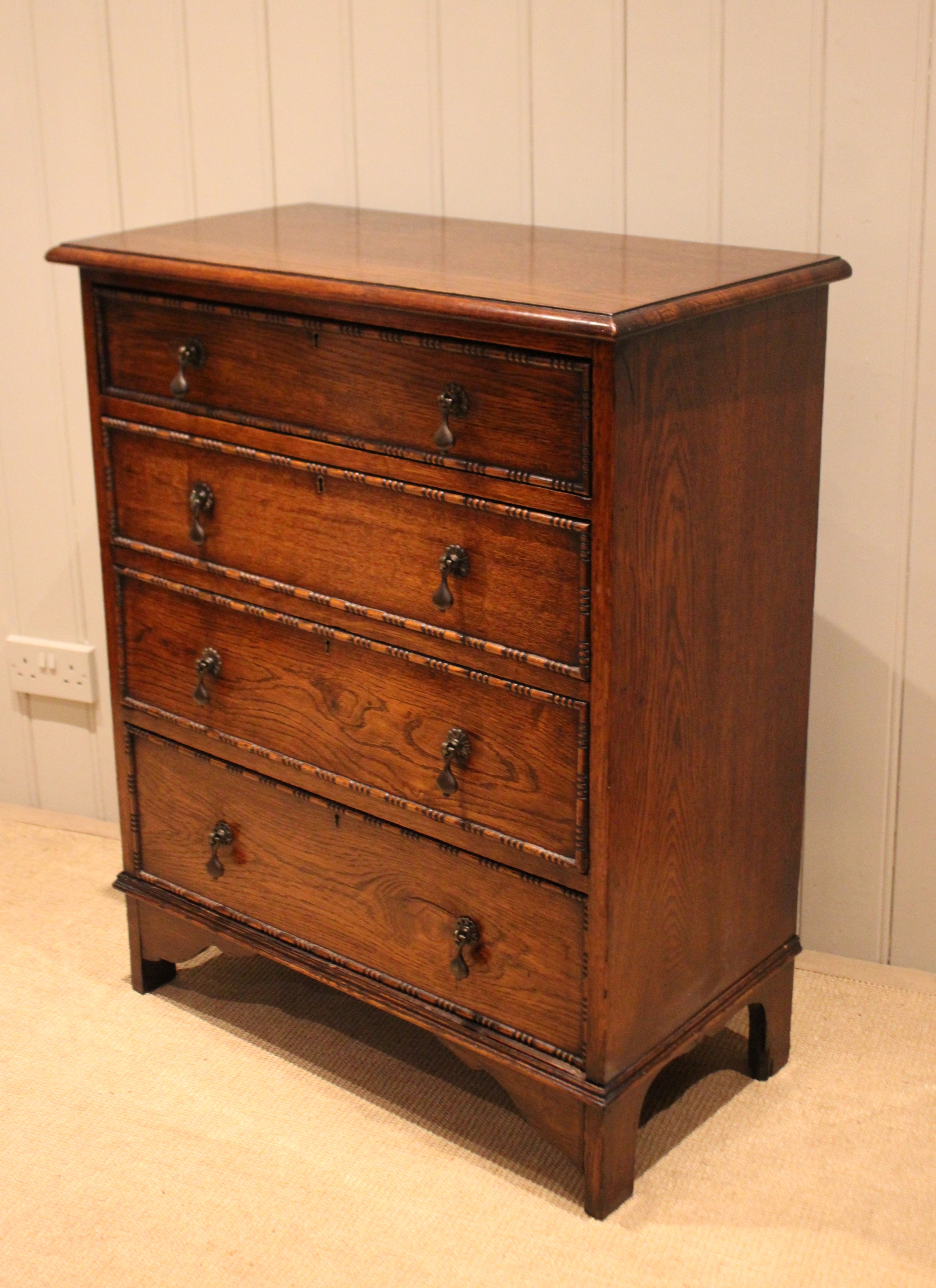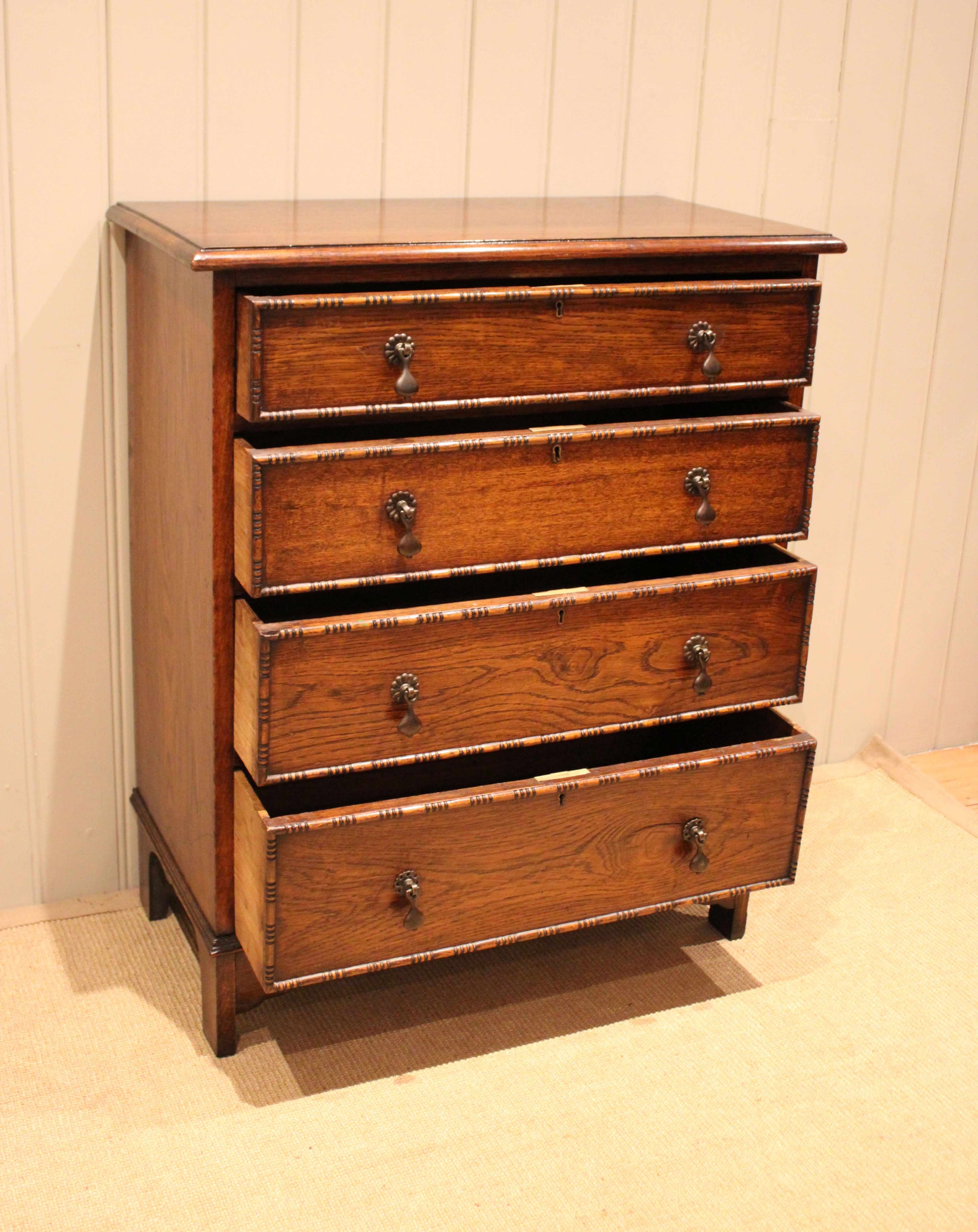 Solid oak chest of four graduated drawers having beaded edges , raised con bracket feet. The drawer depths are from the bottom up 17.5 cm , 15.5 cm , 13.5 cm and at the top 10 cm deep .