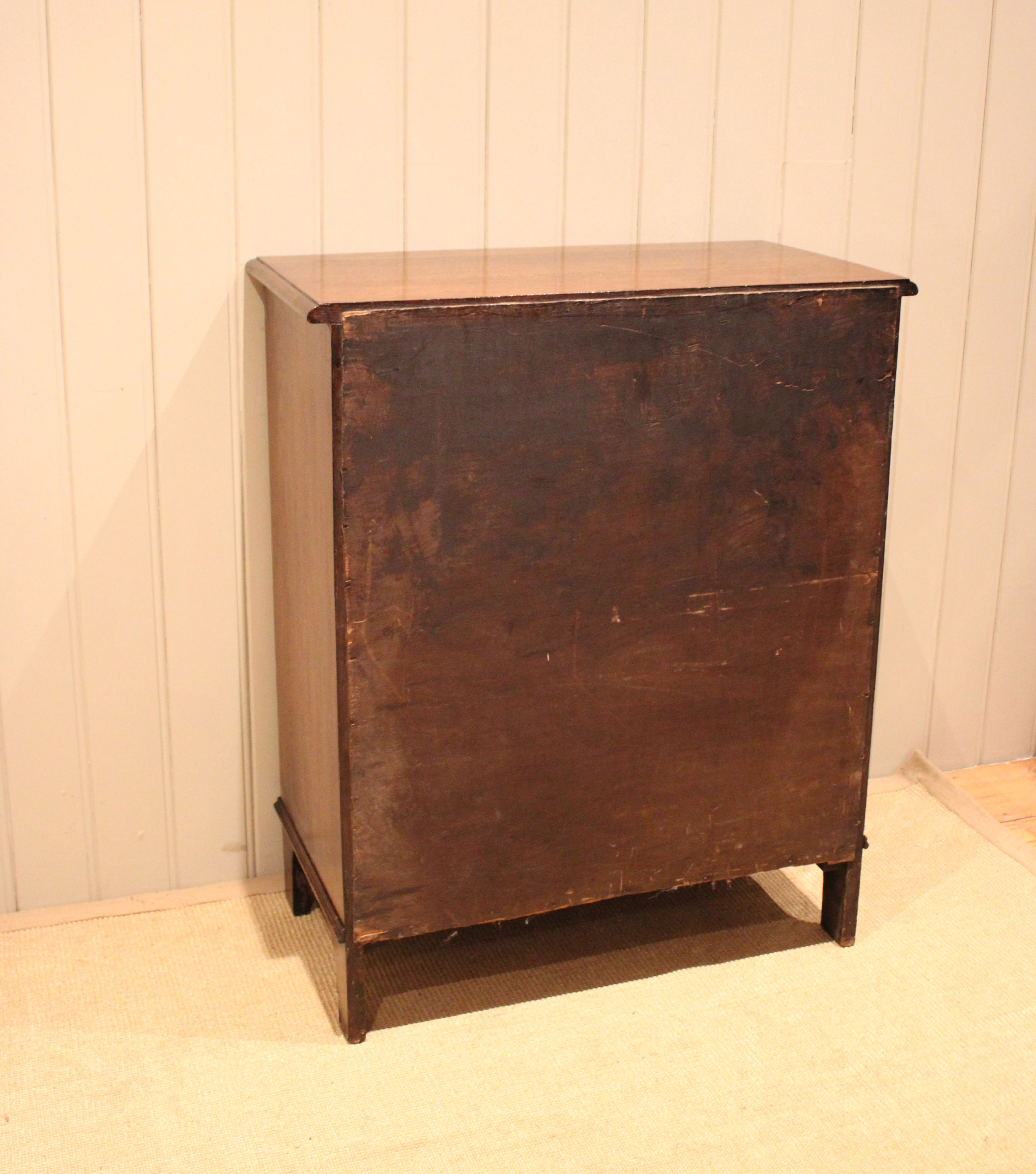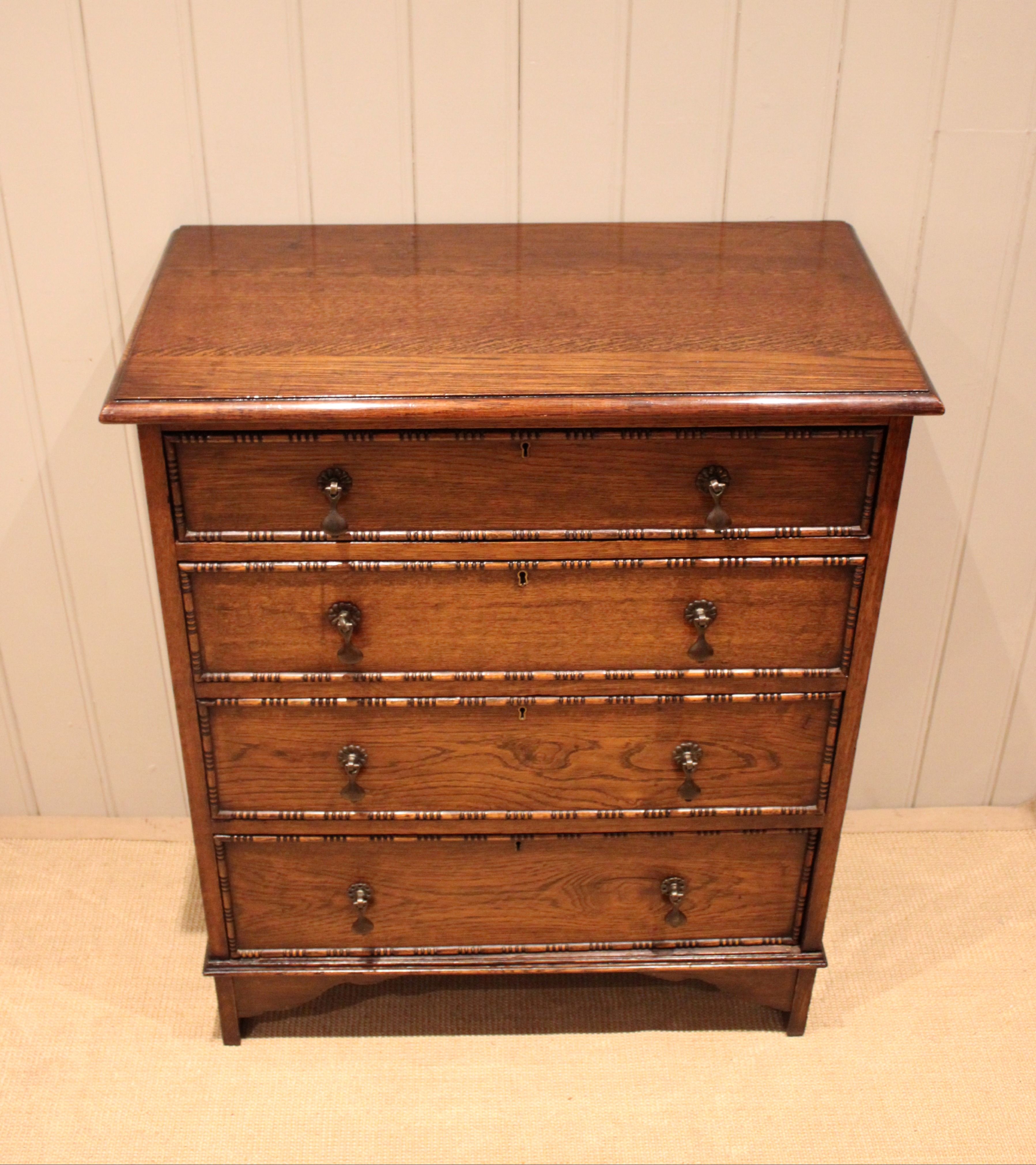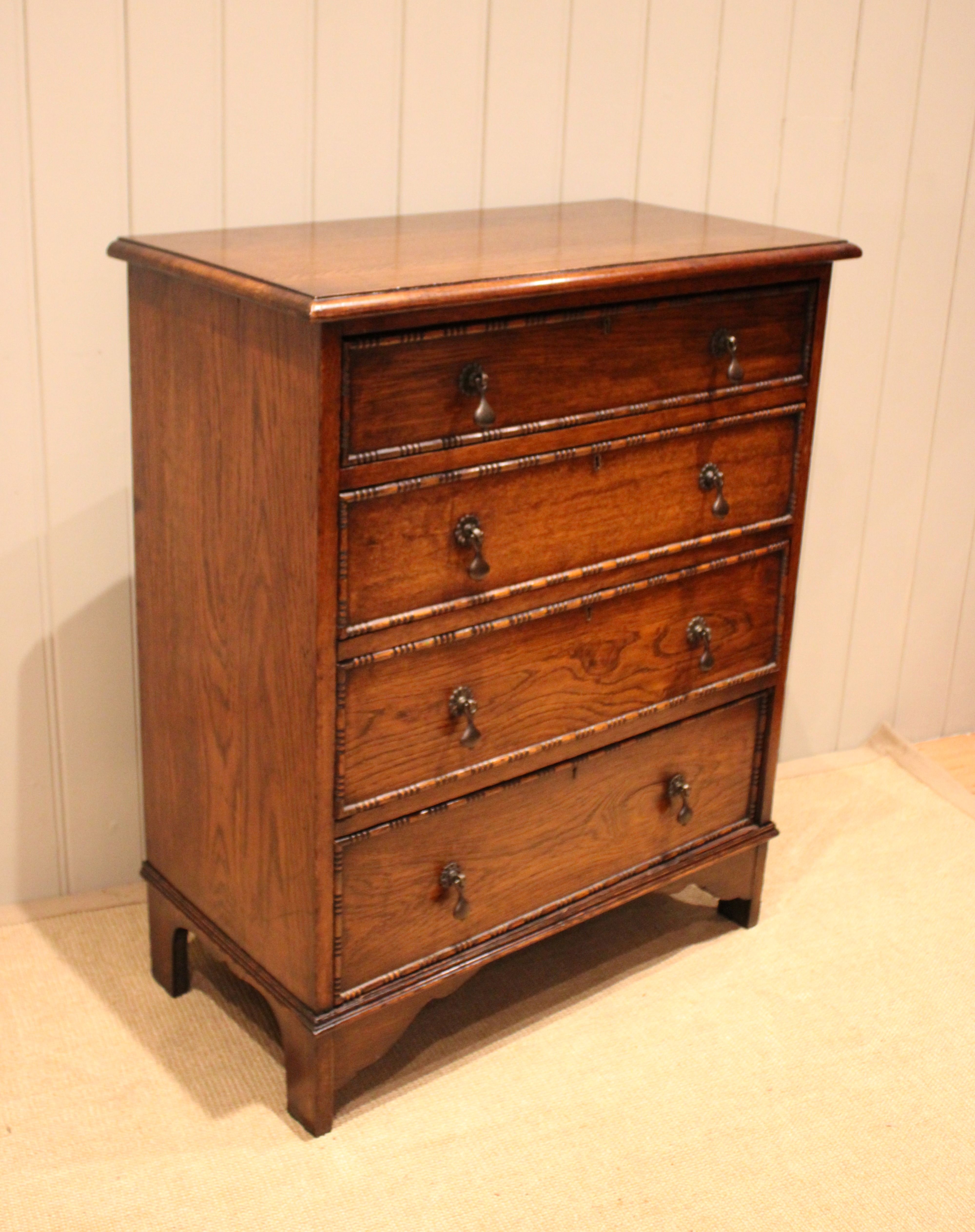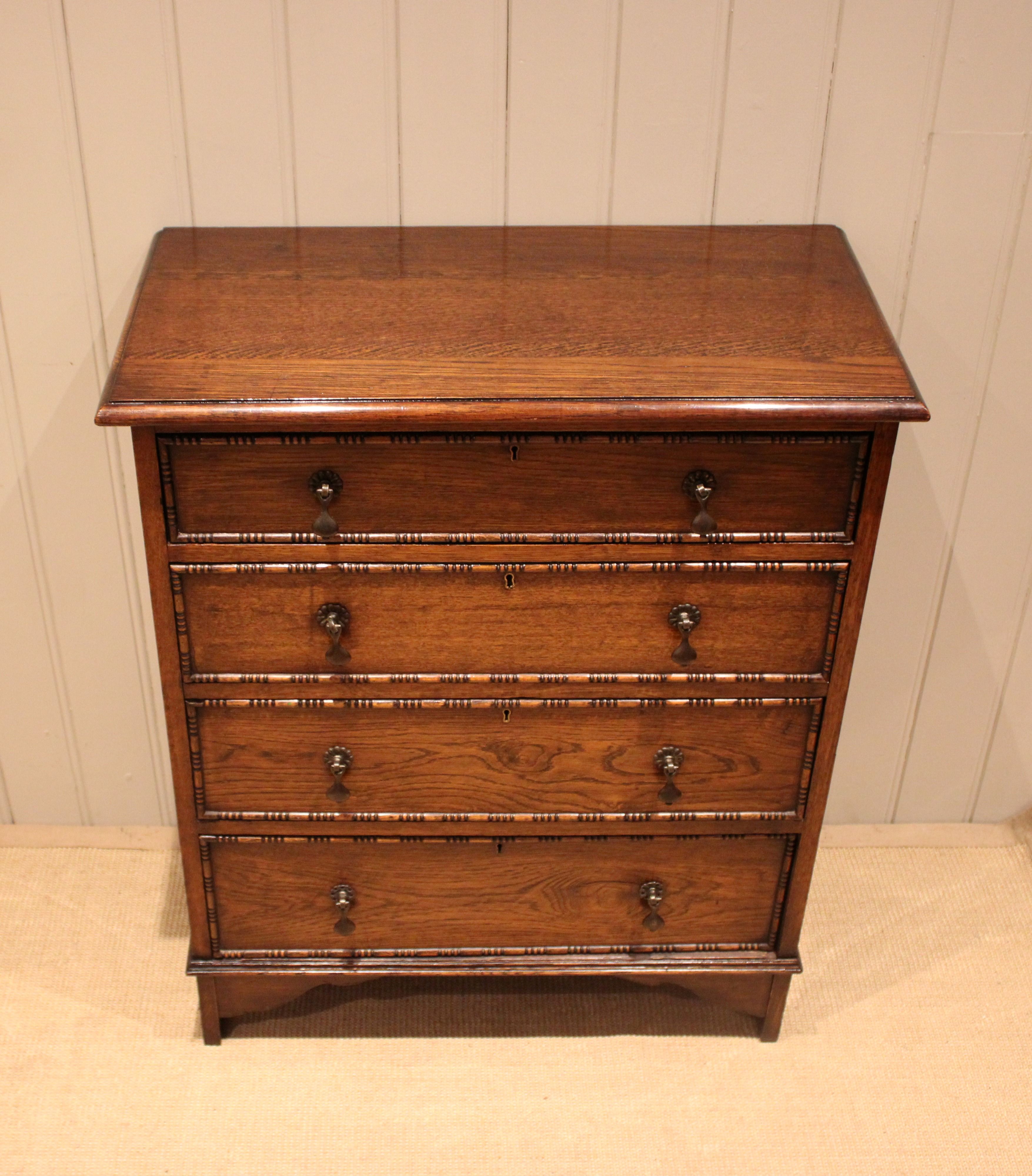 Solid oak chest of four graduated drawers having beaded edges , raised con bracket feet. The drawer depths are from the bottom up 17.5 cm , 15.5 cm , 13.5 cm and at the top 10 cm deep .