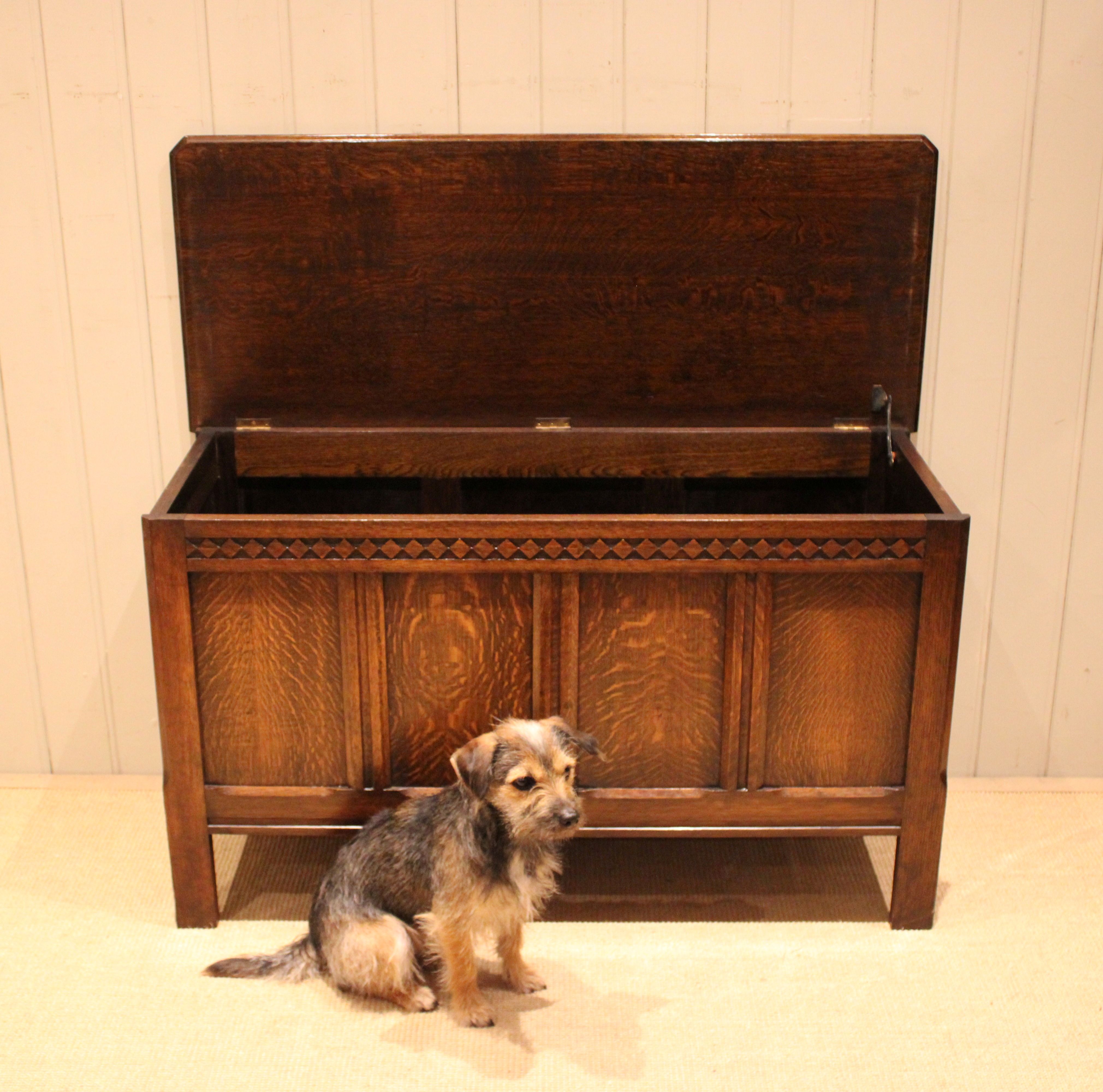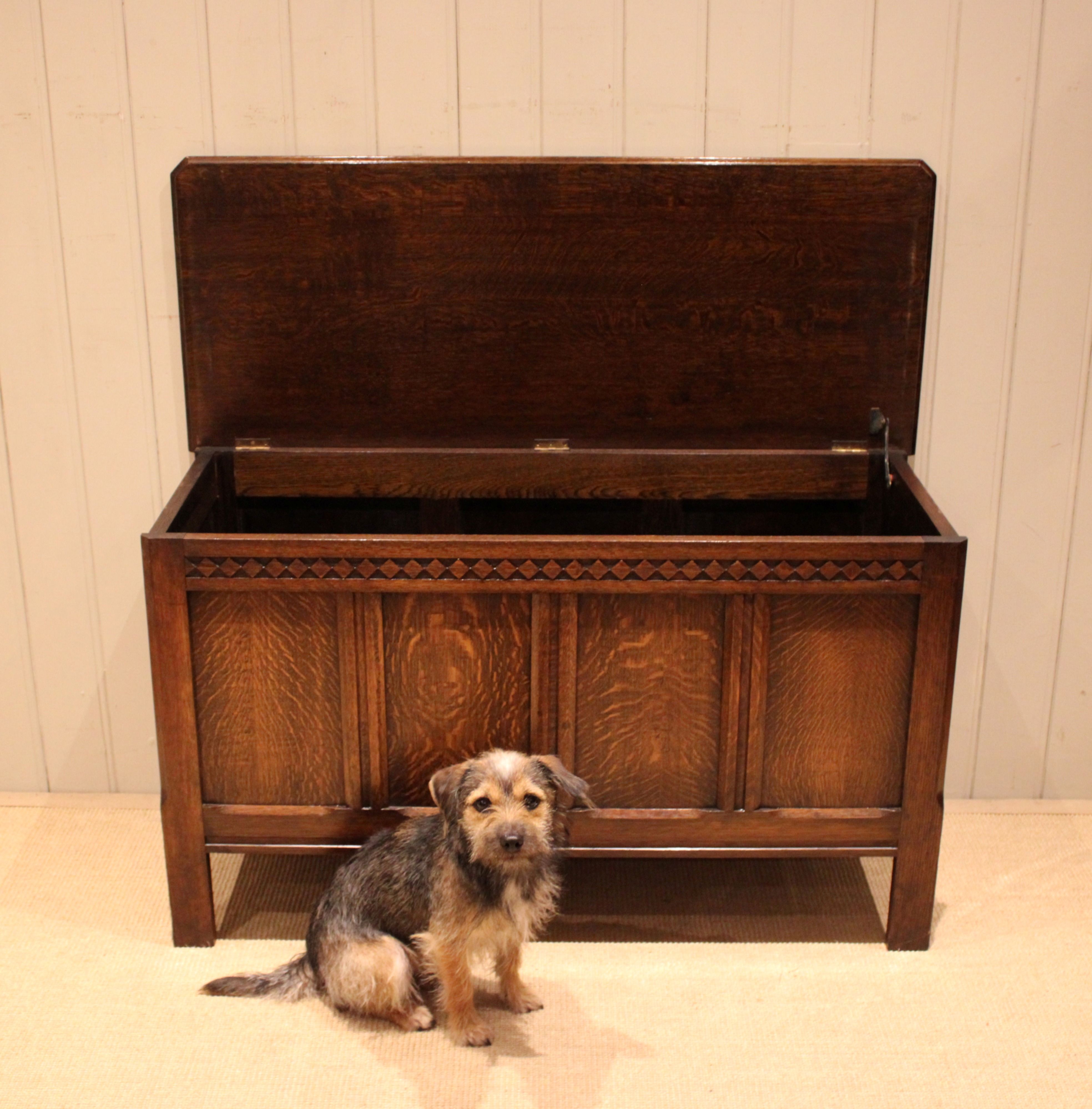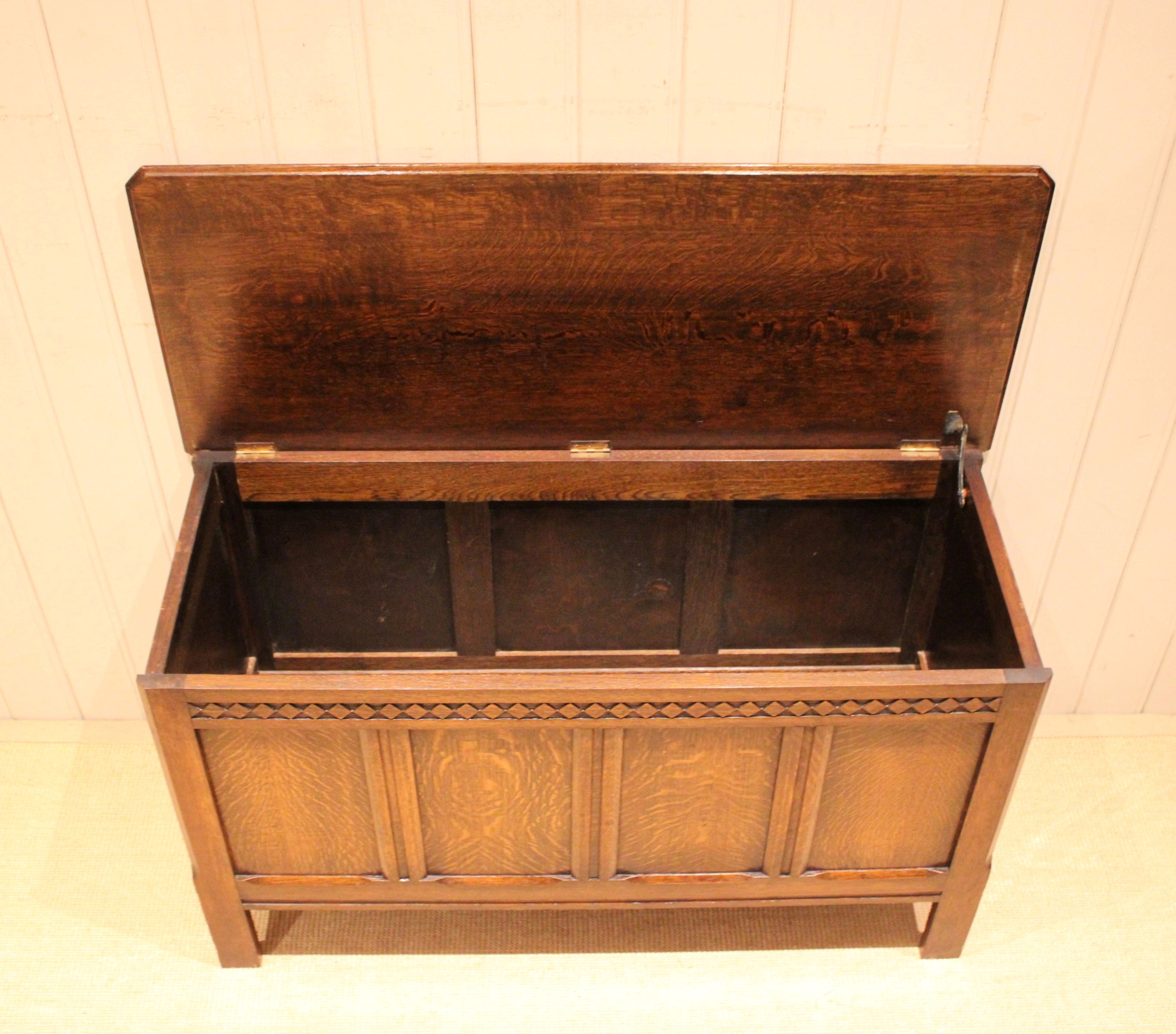 Solid oak coffer having a panelled front and sides with a lift up top for storage , raised on short square legs . The internal measurements are 42 cm high , 97 cm wide and 36 cm deep .
