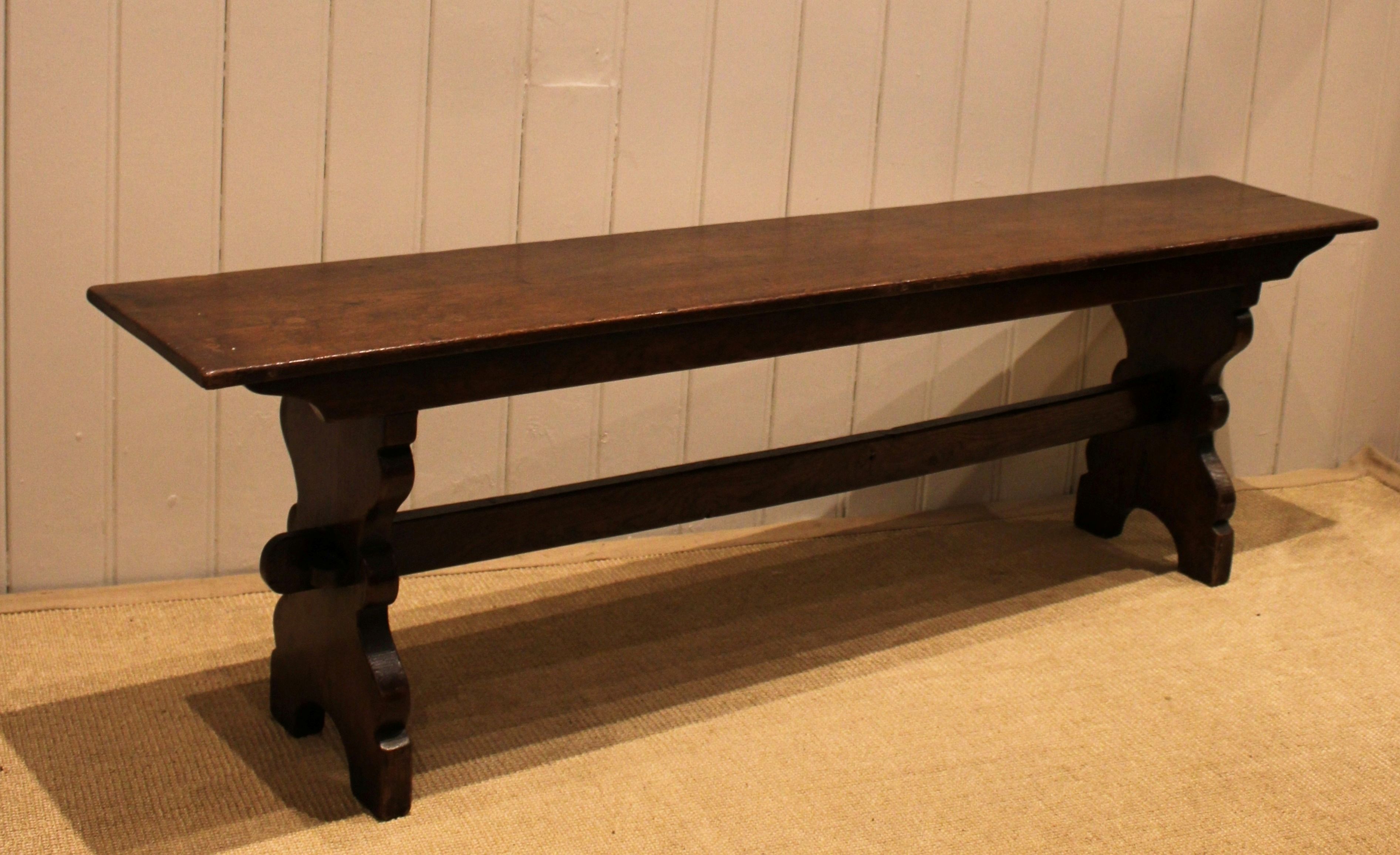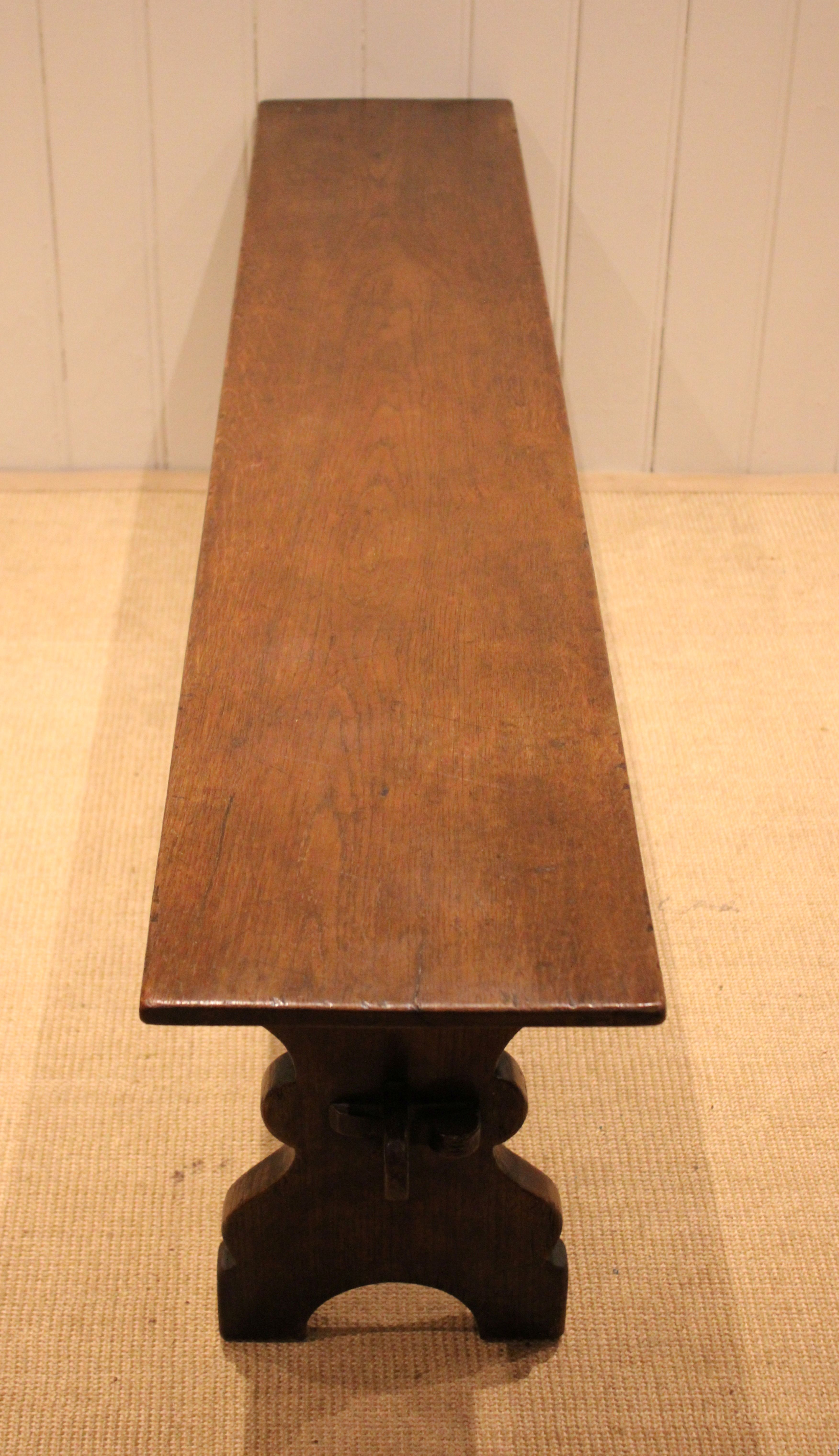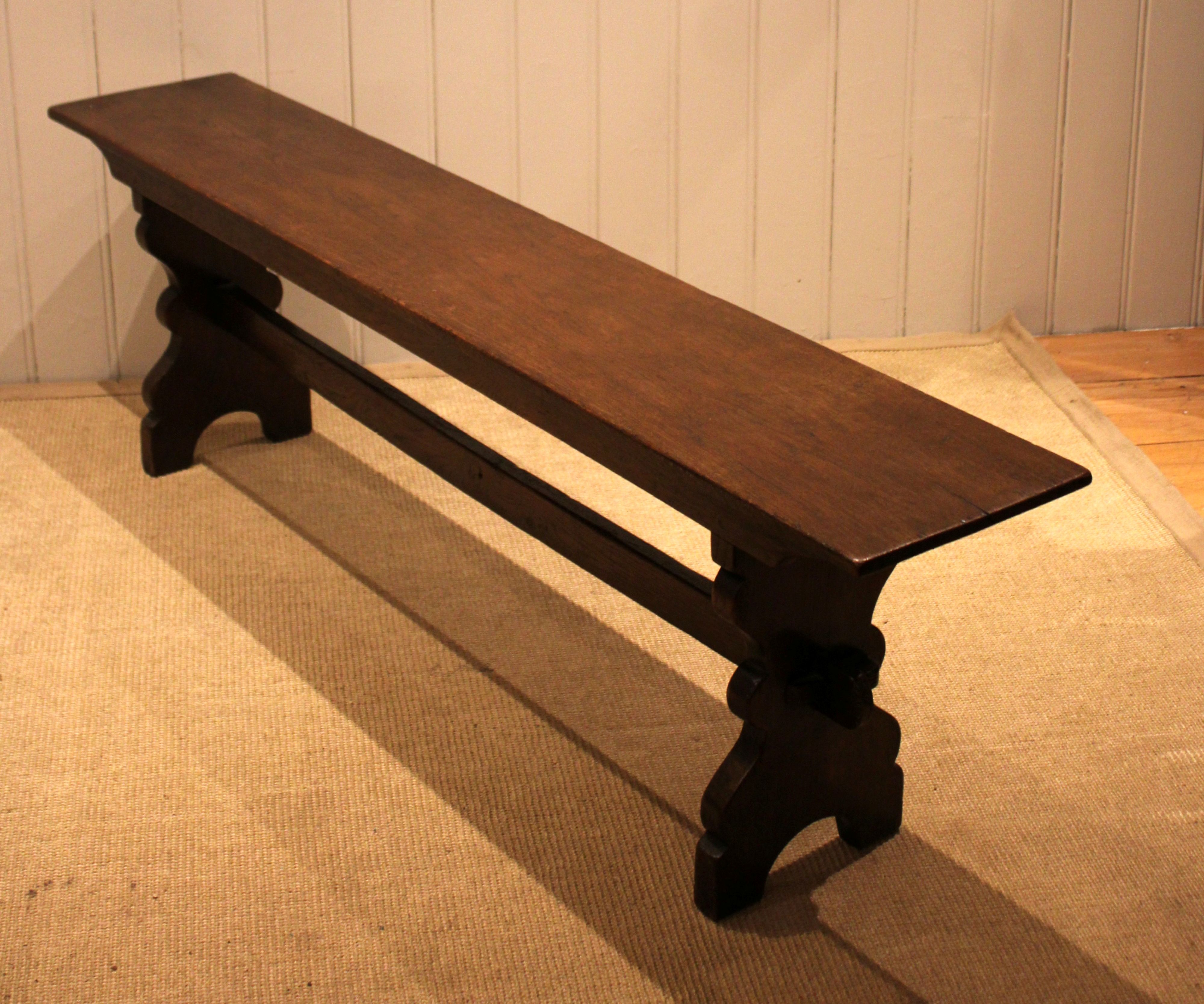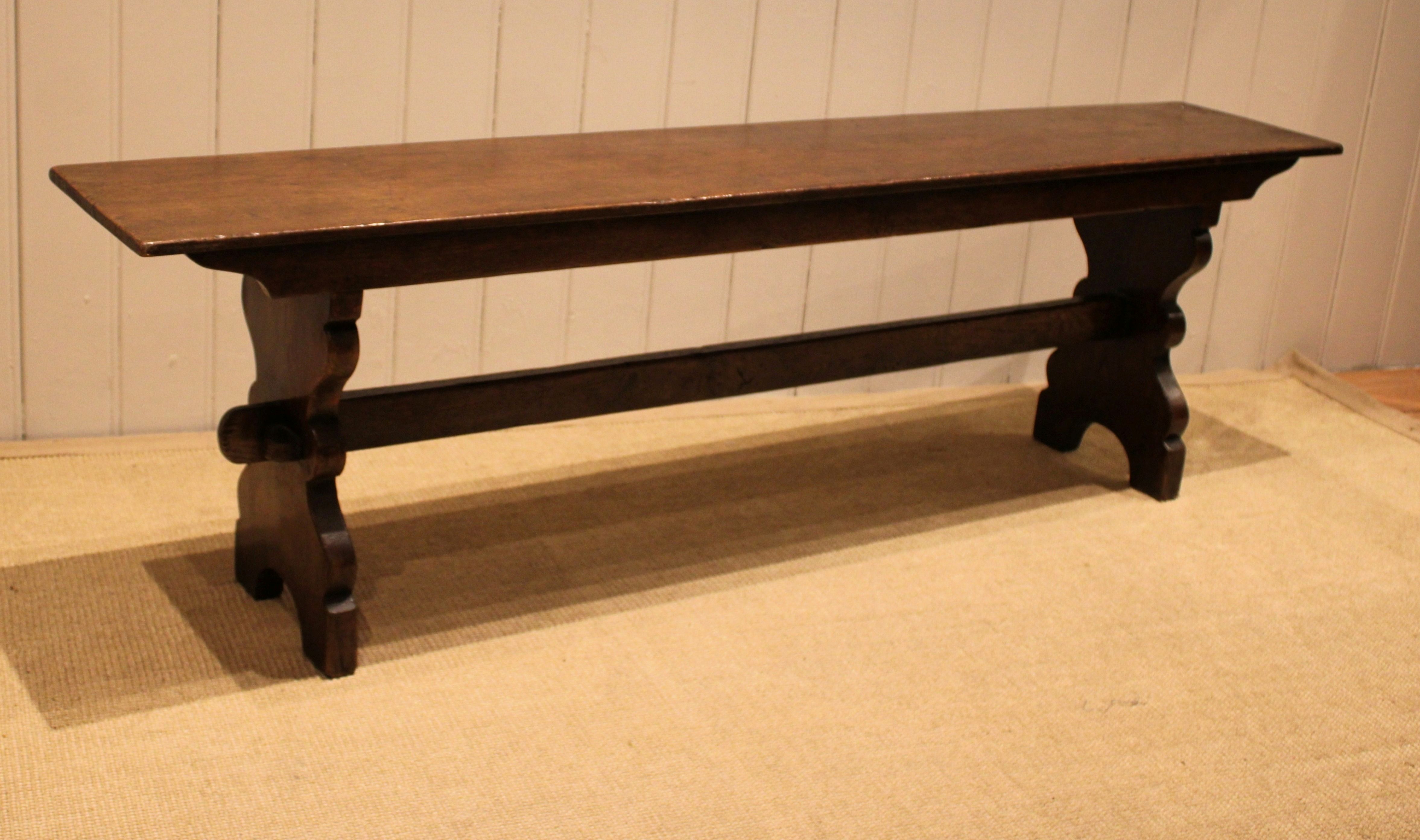 Solid oak farmhouse bench having shaped supports to each end united by a stretcher .