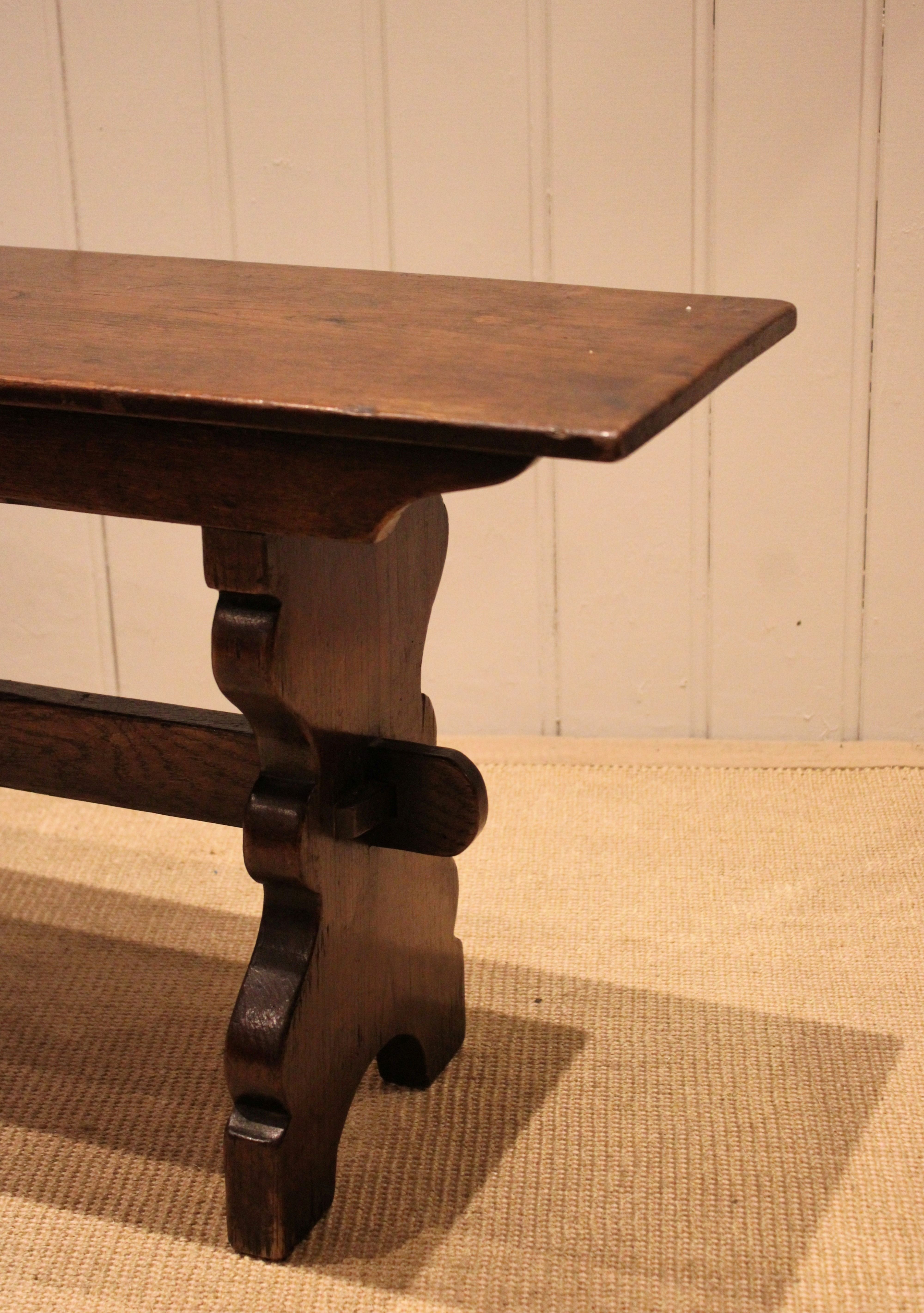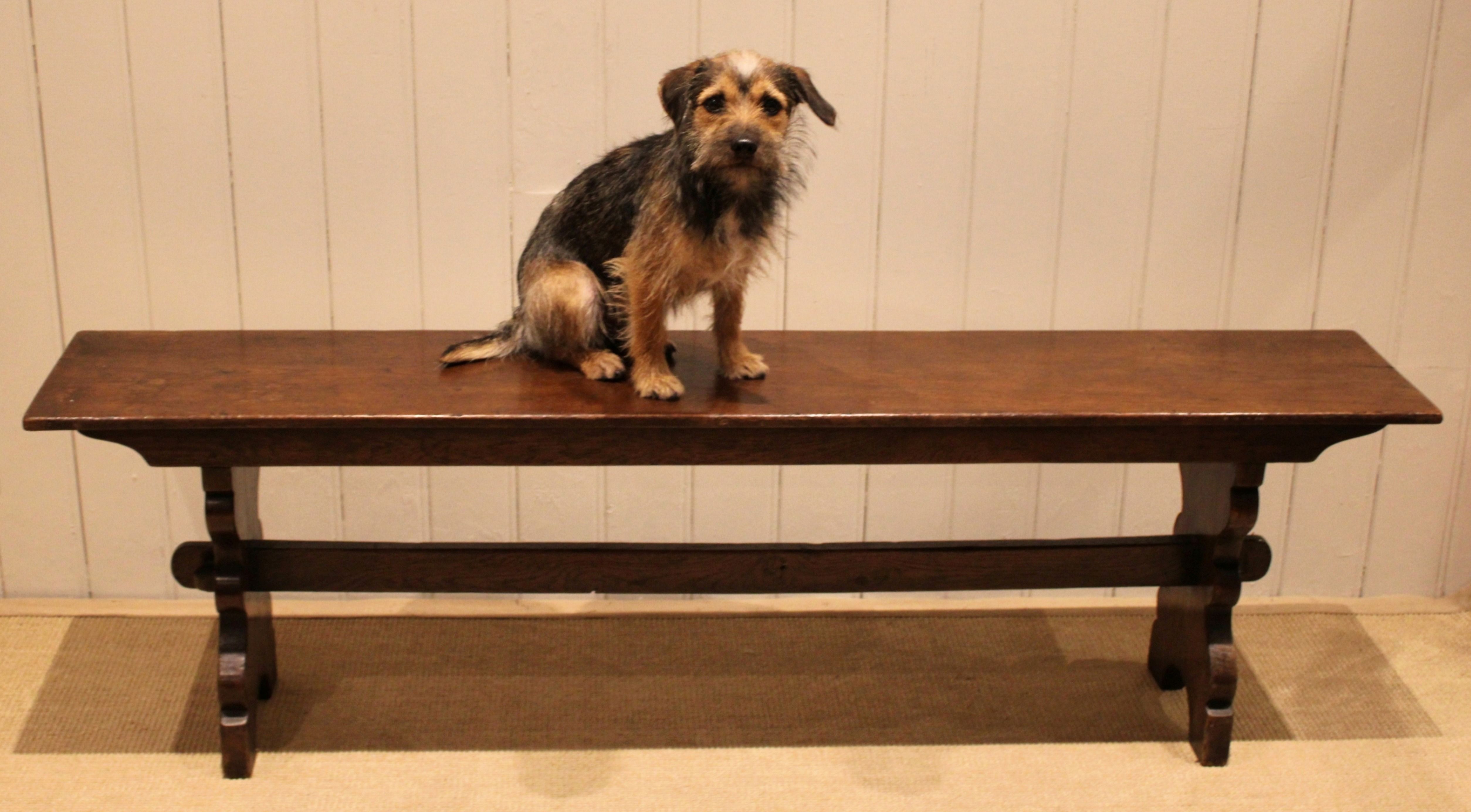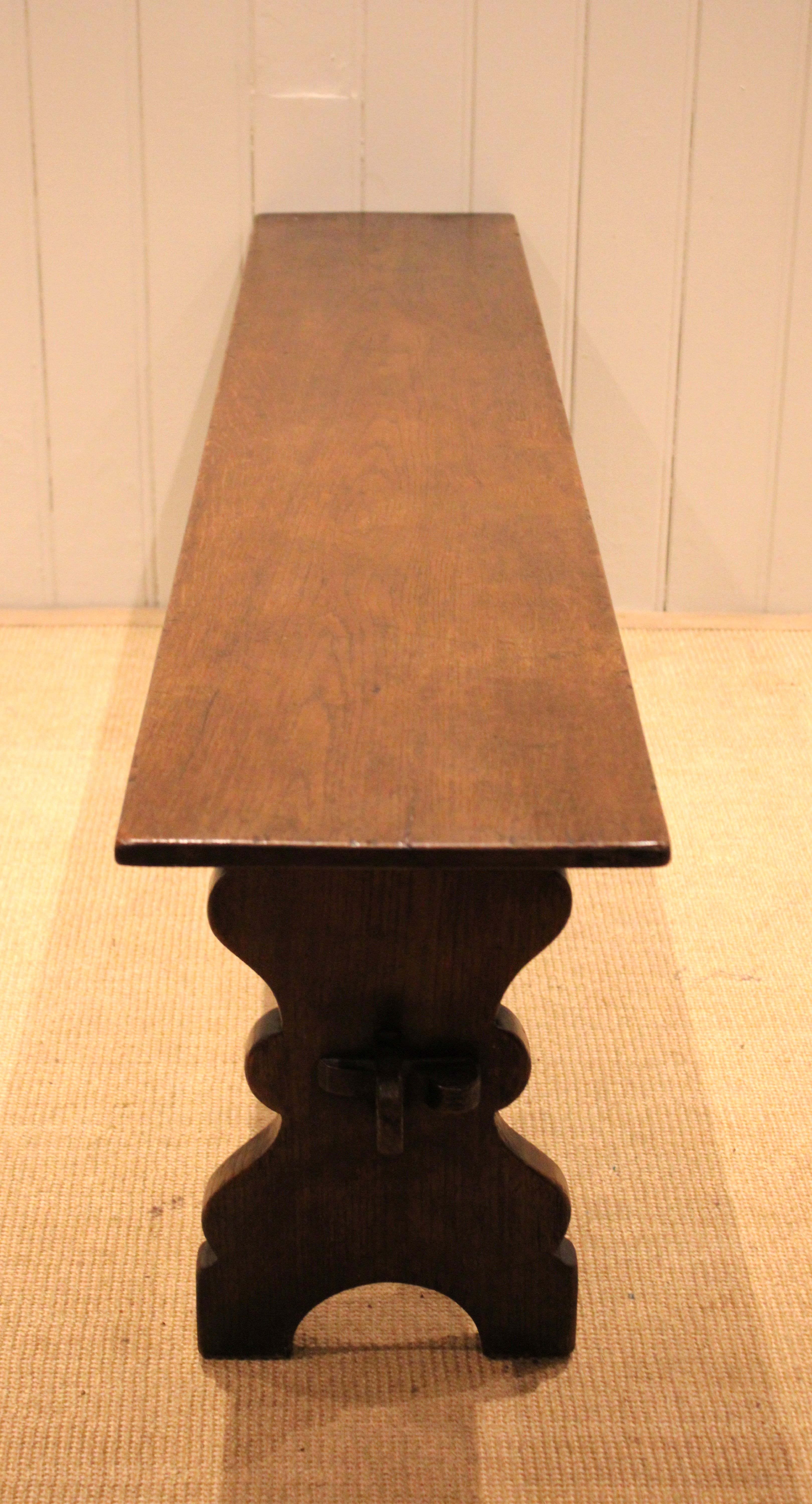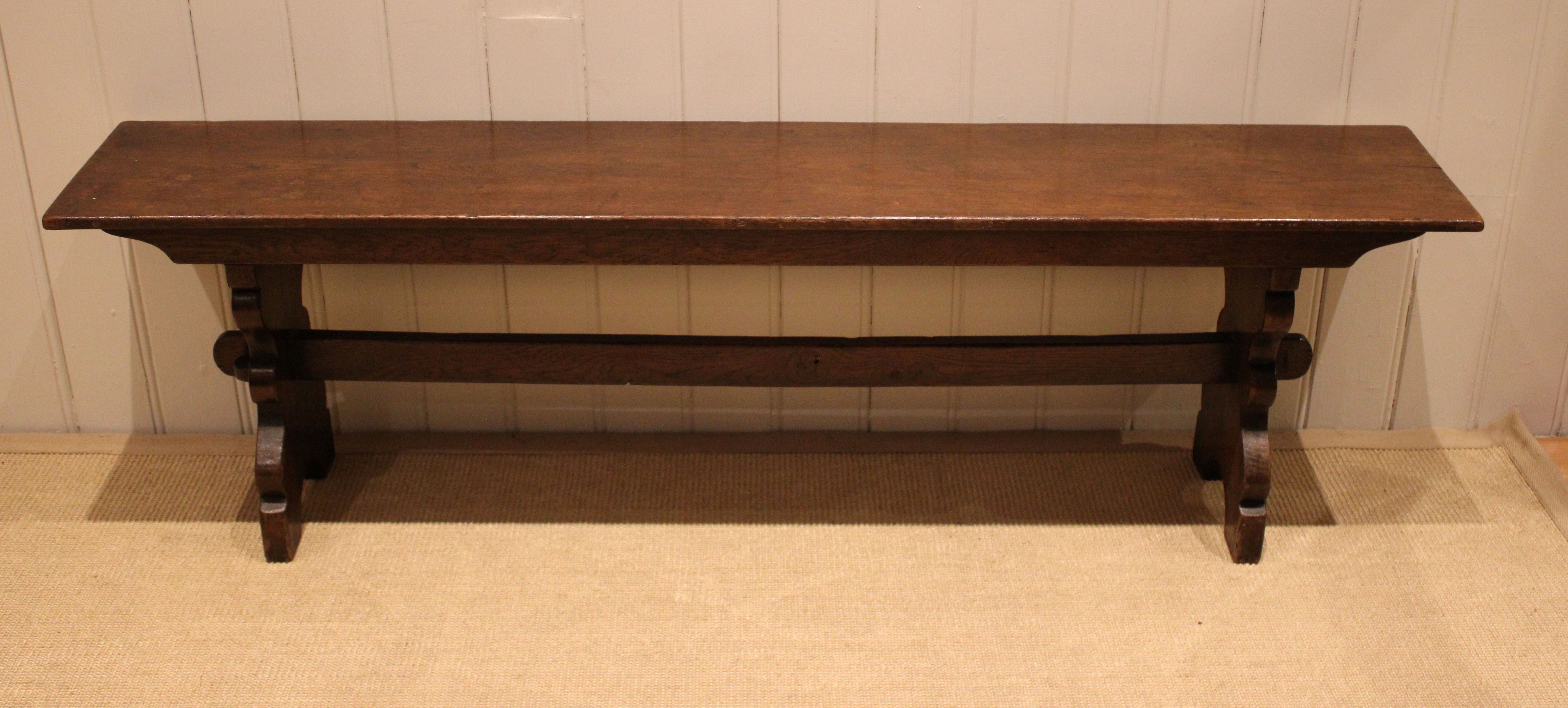 Solid oak farmhouse bench having shaped supports to each end united by a stretcher .