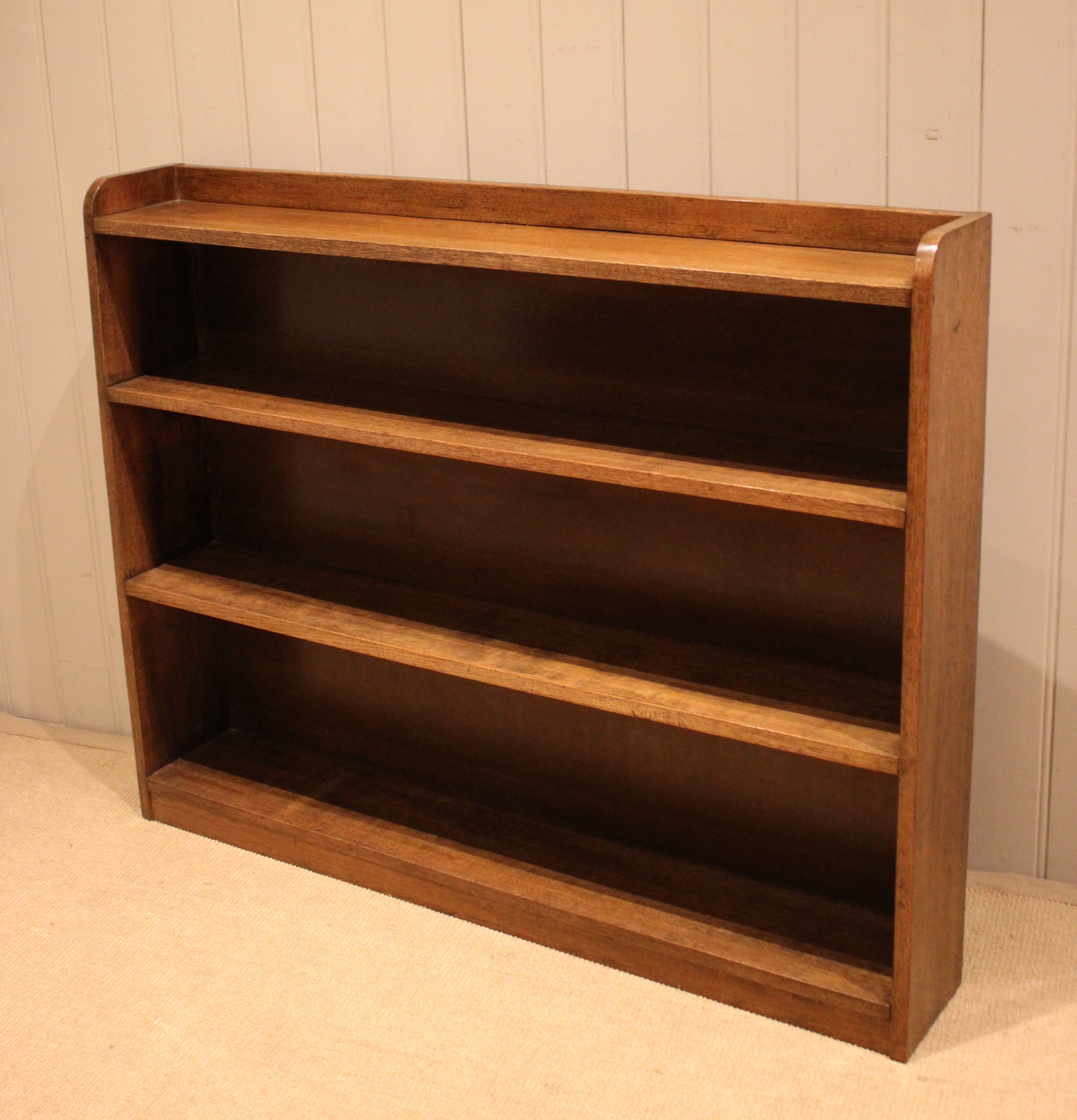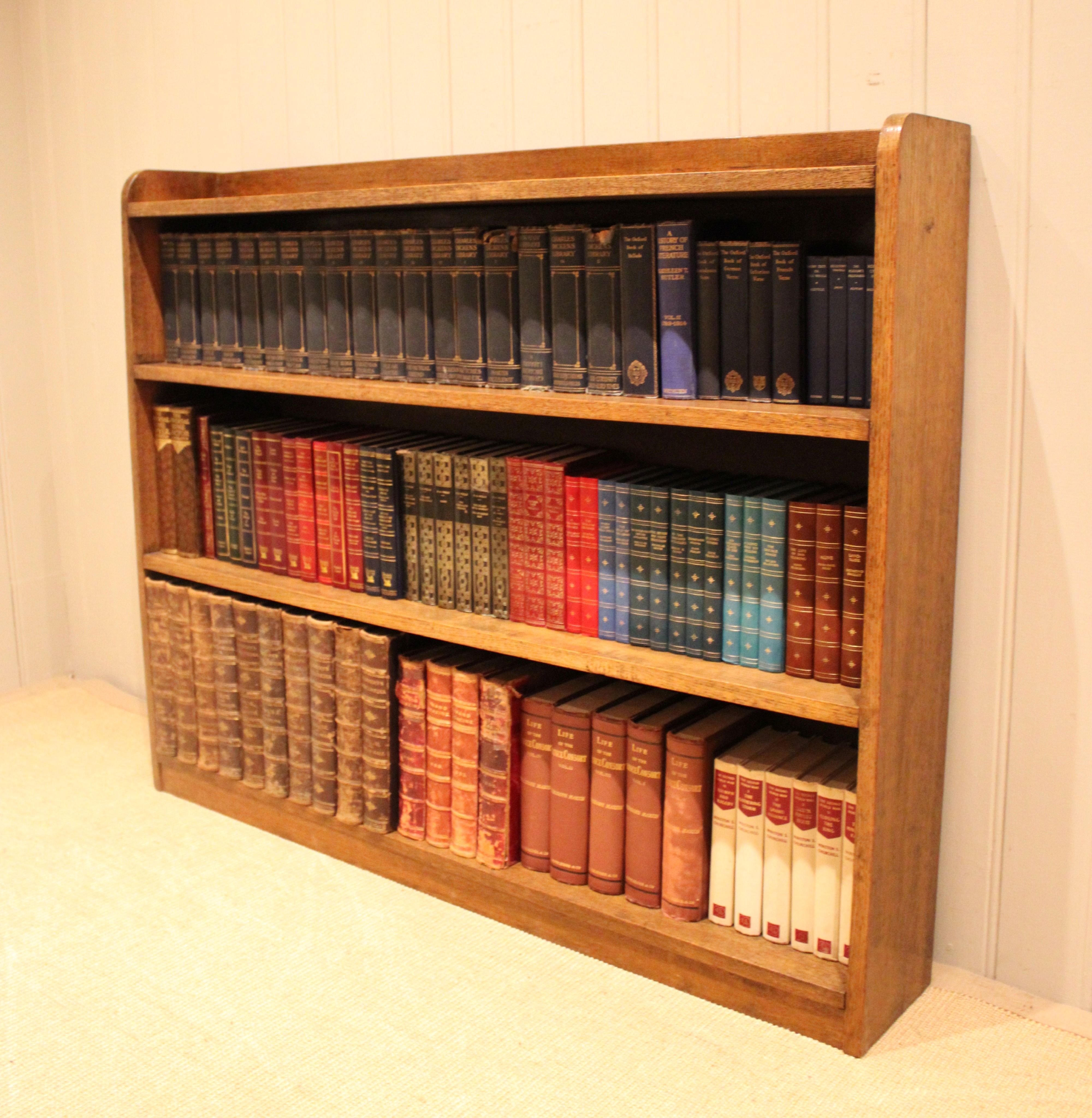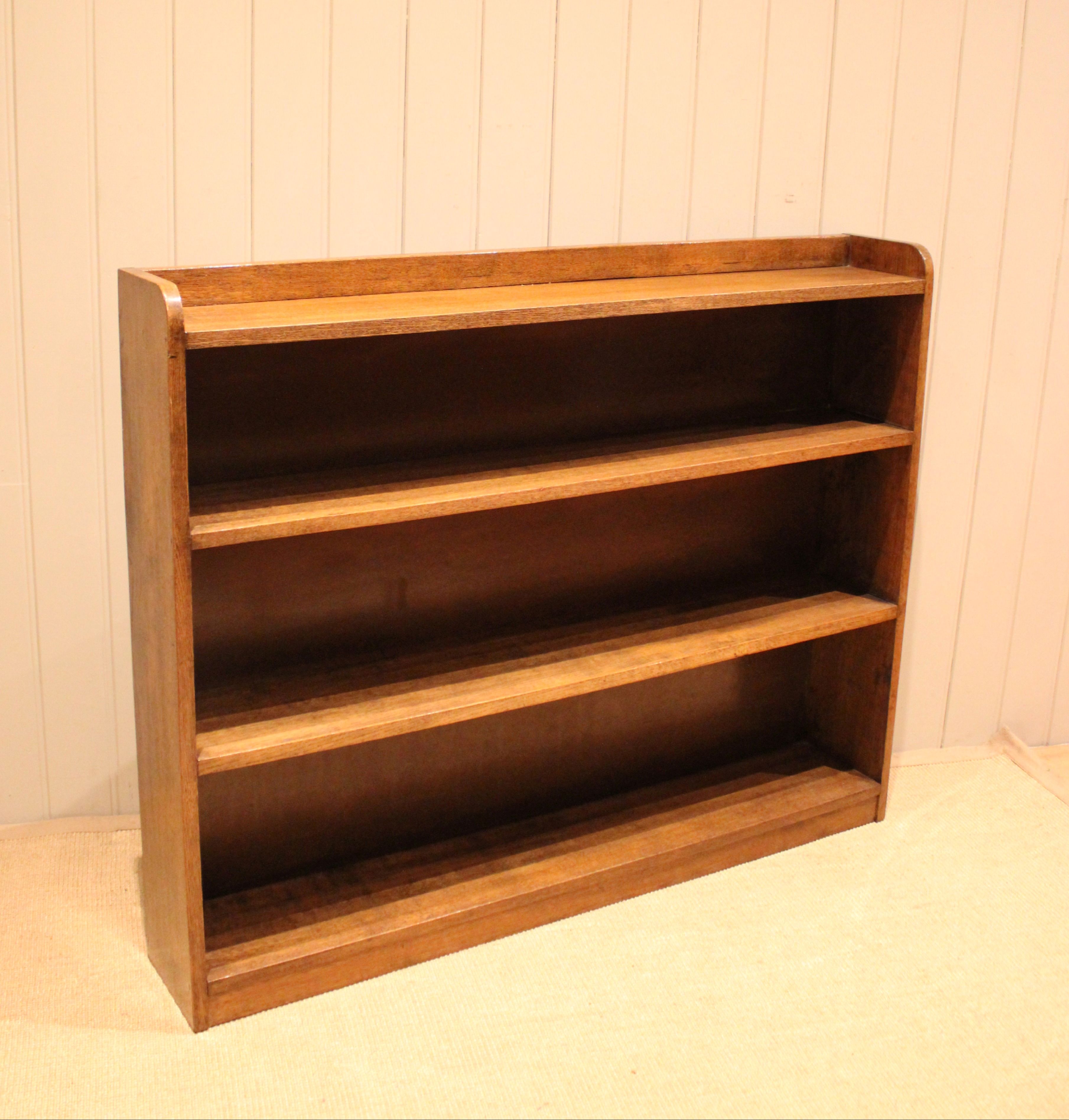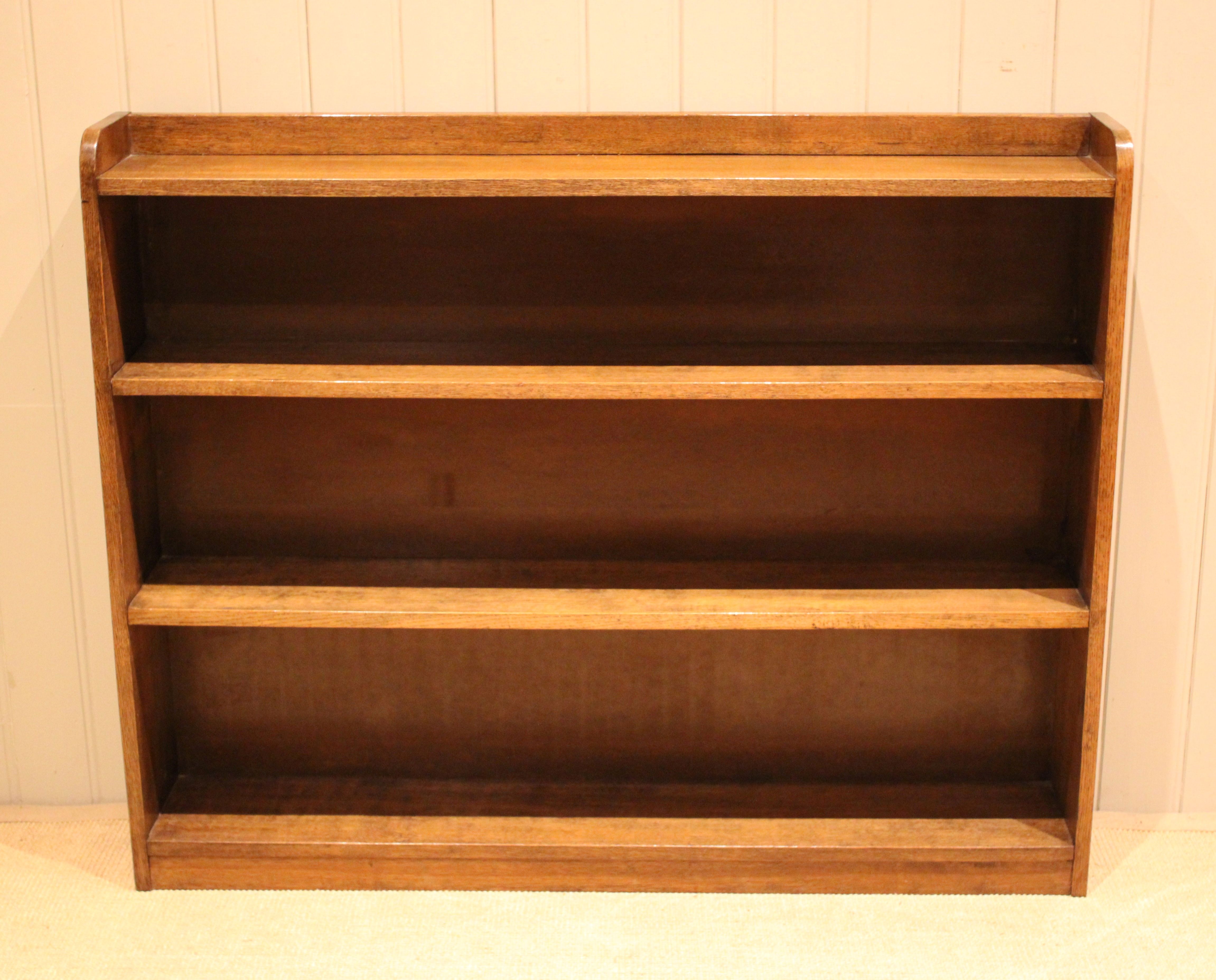 Solid oak open bookcase having three fixed shelves , raised on a plinth base . the shelf dimensions are 116 cm wide and 19 cm deep and from the bottom up 29 cm high , 26 cm high and at the top 21.5 cm high .