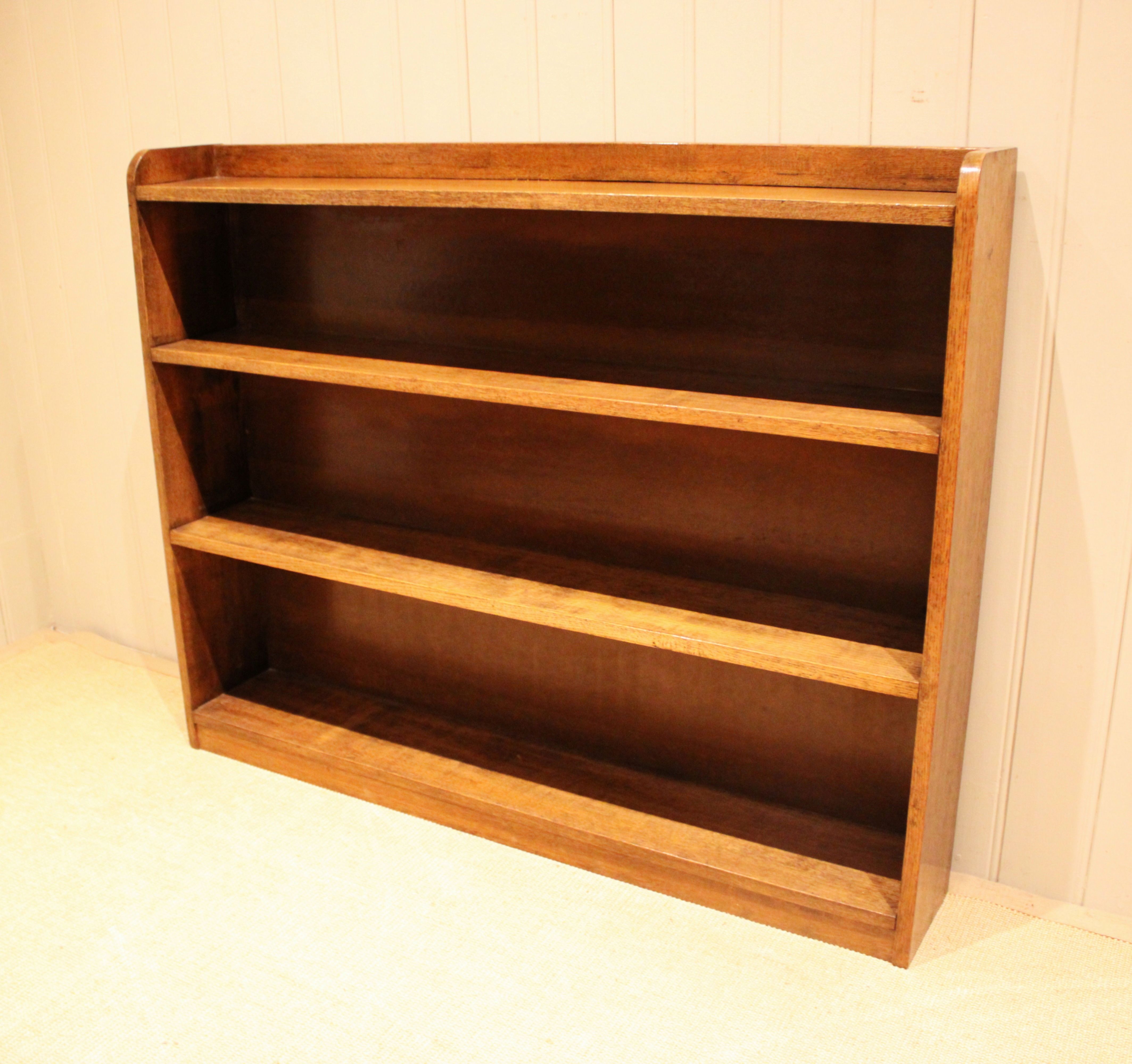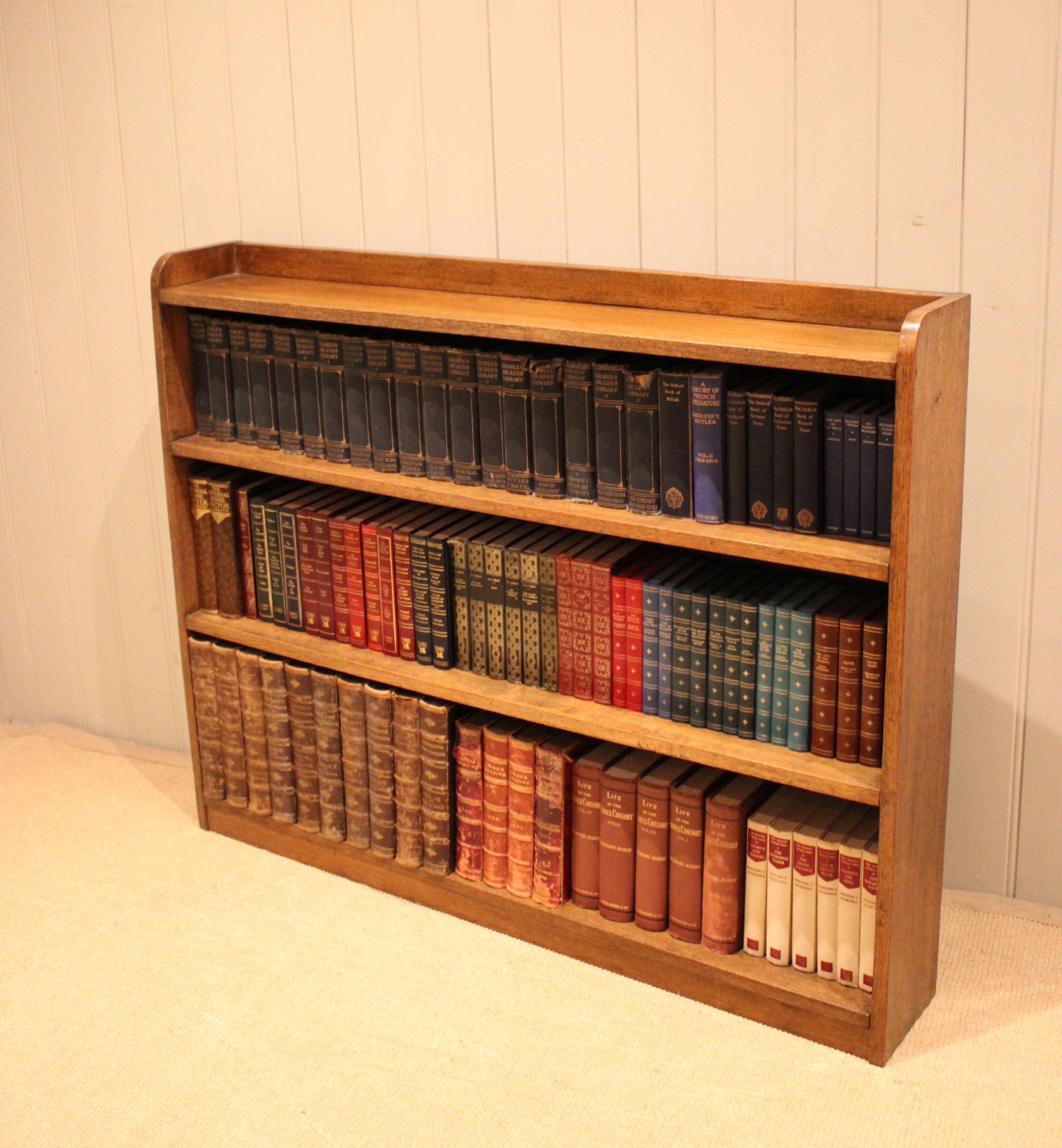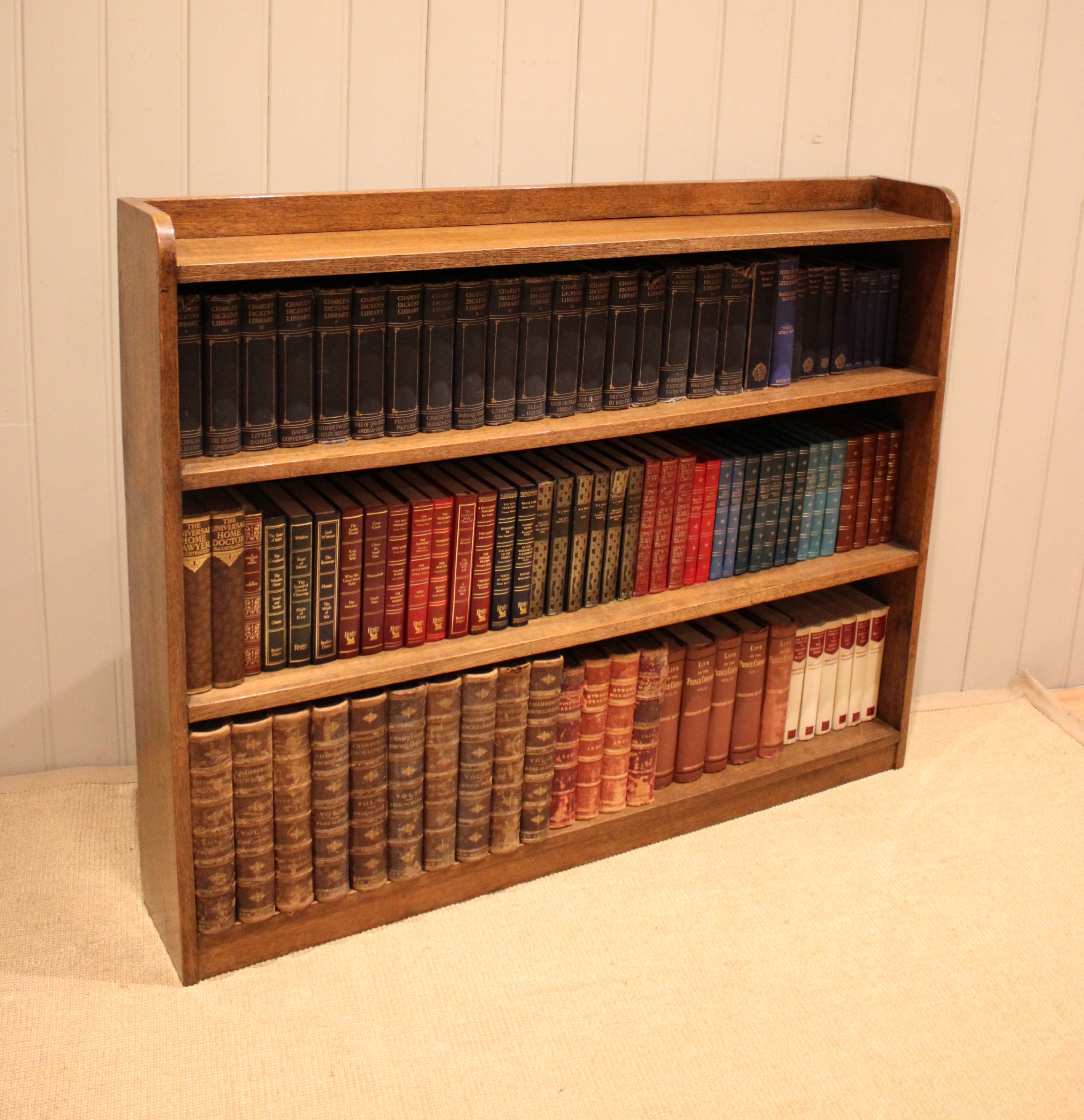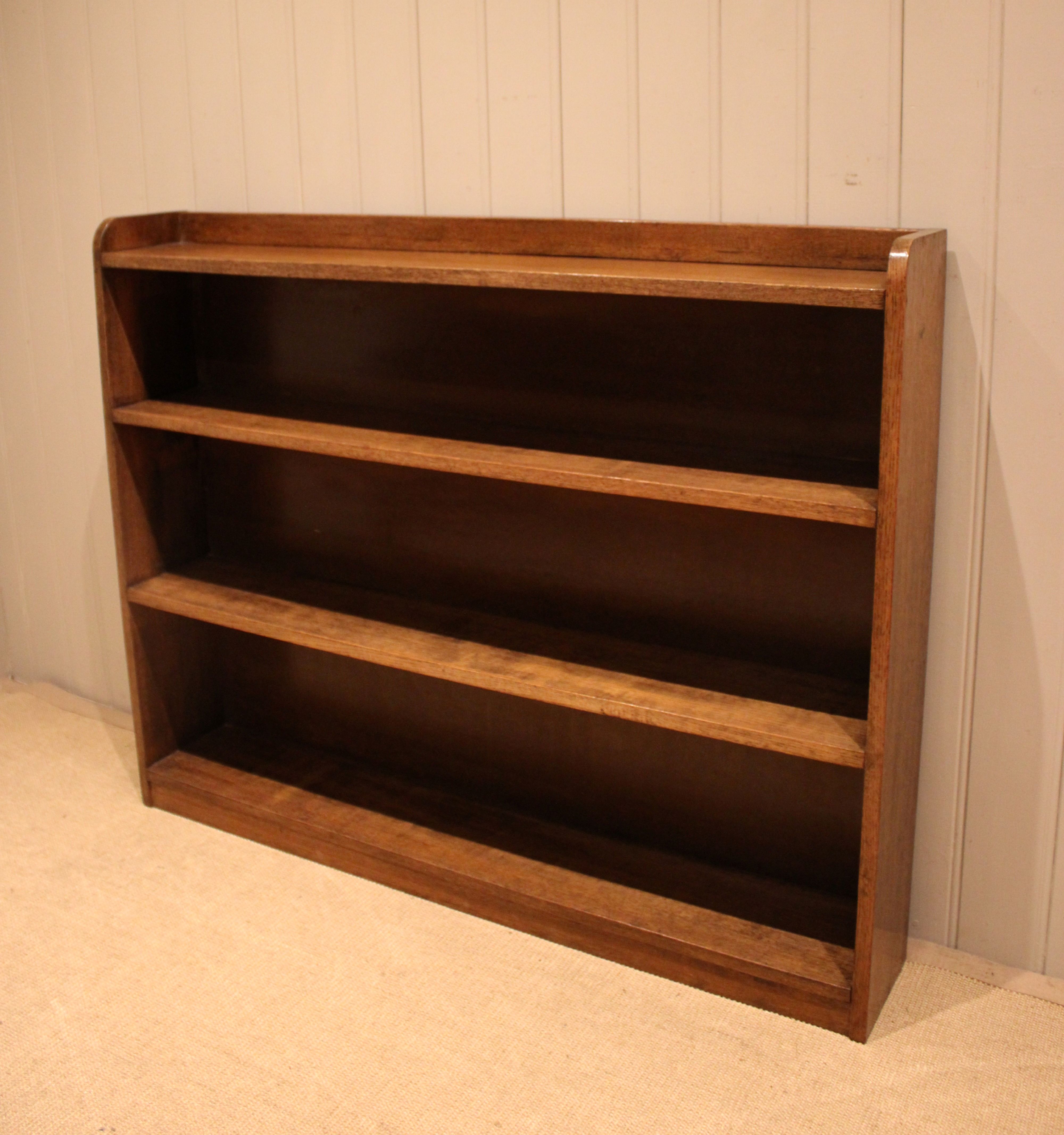 Solid oak open bookcase having three fixed shelves , raised on a plinth base . the shelf dimensions are 116 cm wide and 19 cm deep and from the bottom up 29 cm high , 26 cm high and at the top 21.5 cm high .