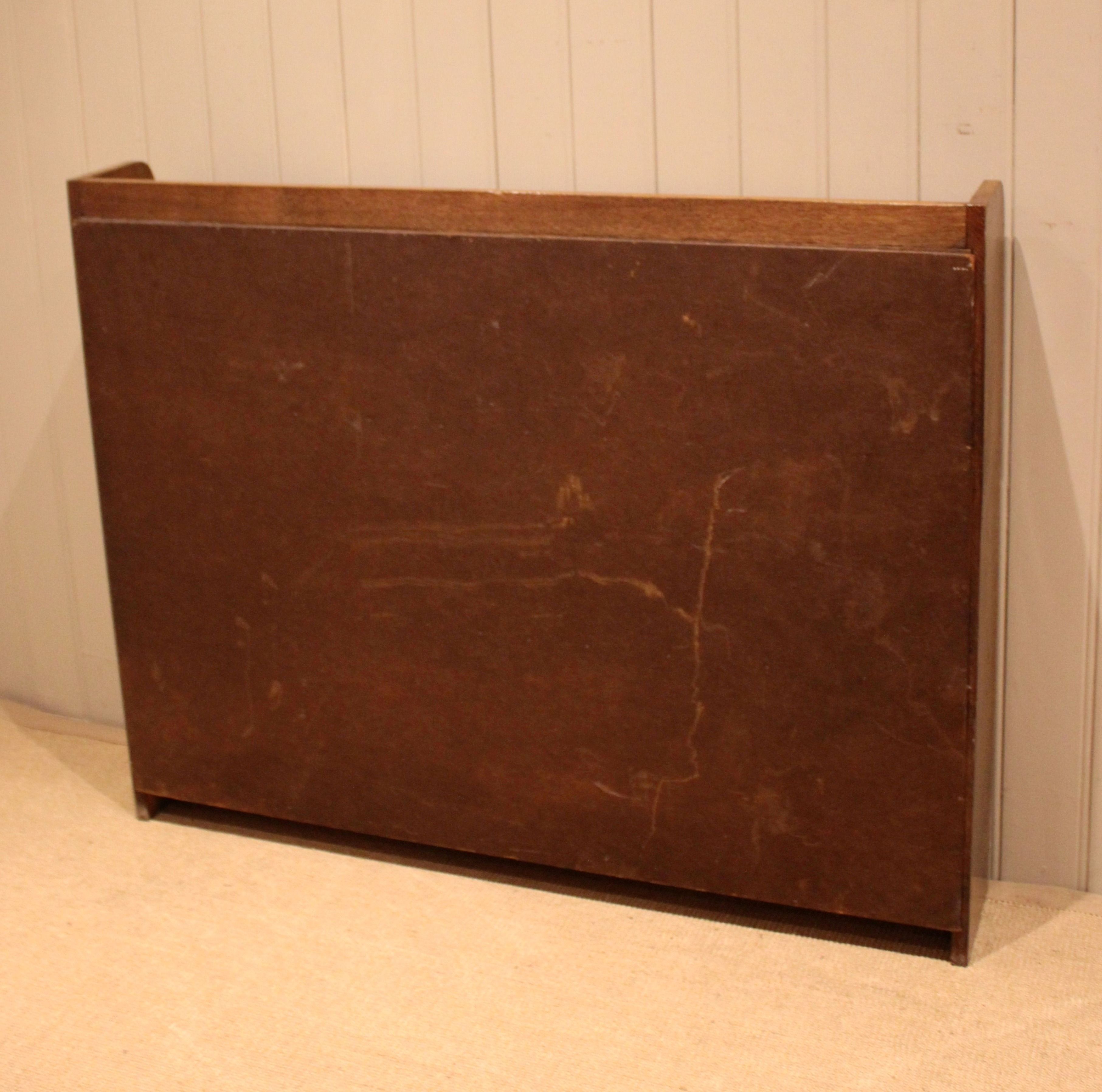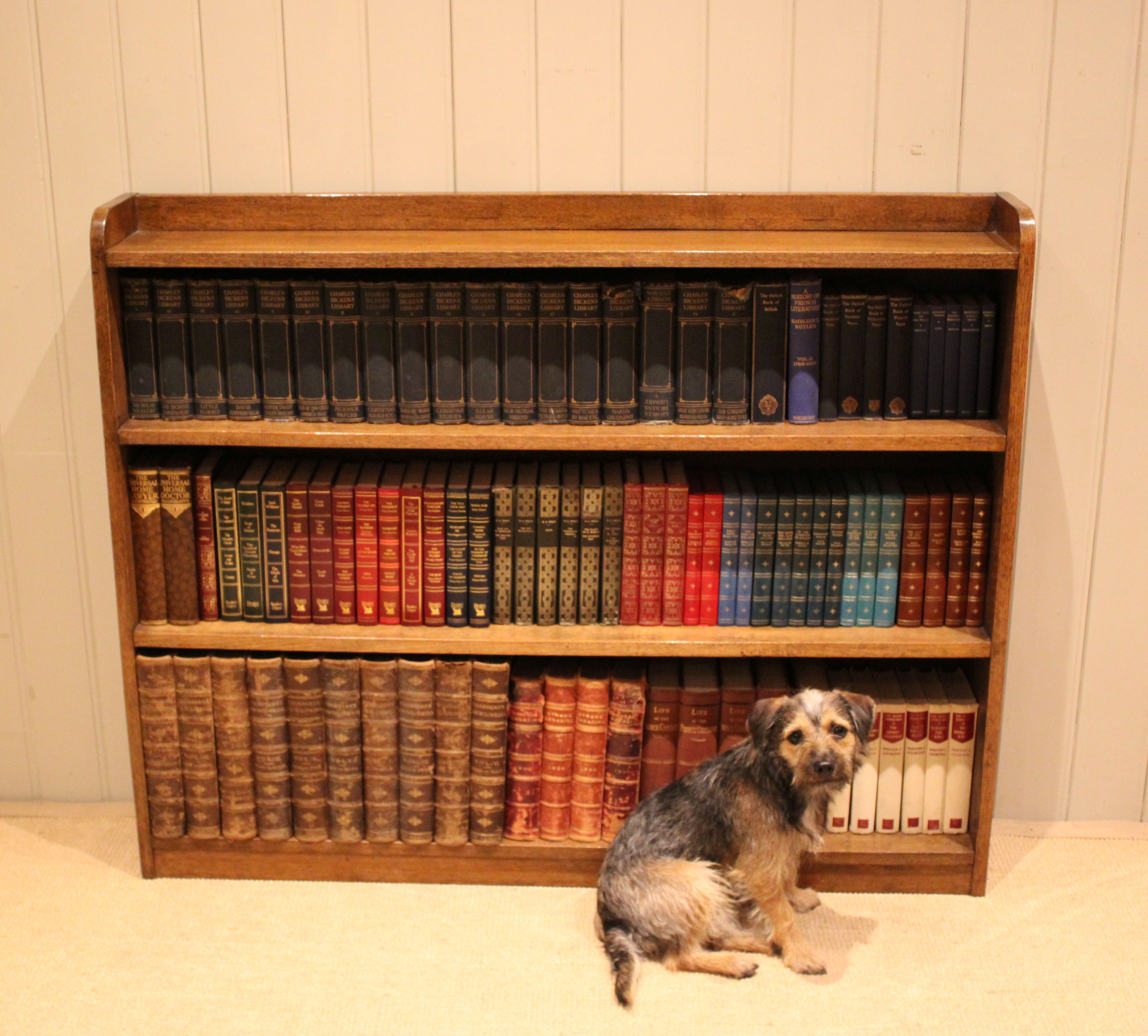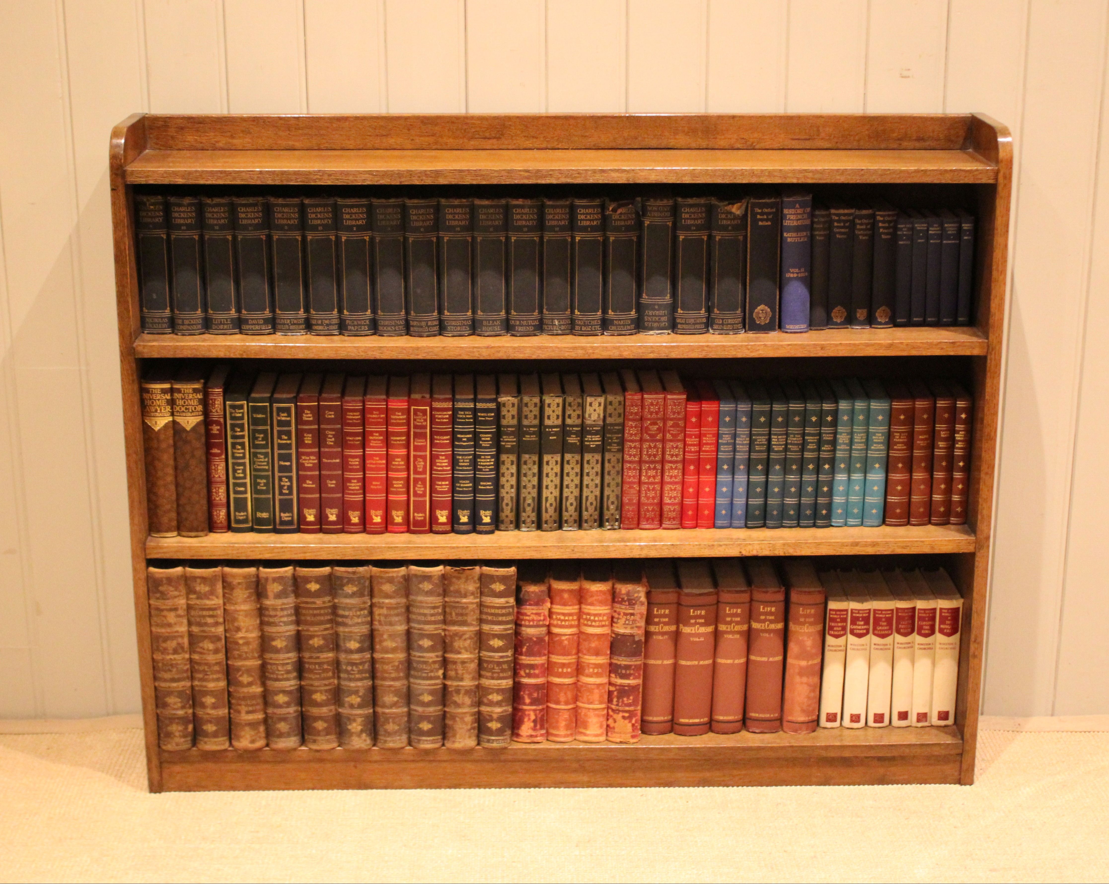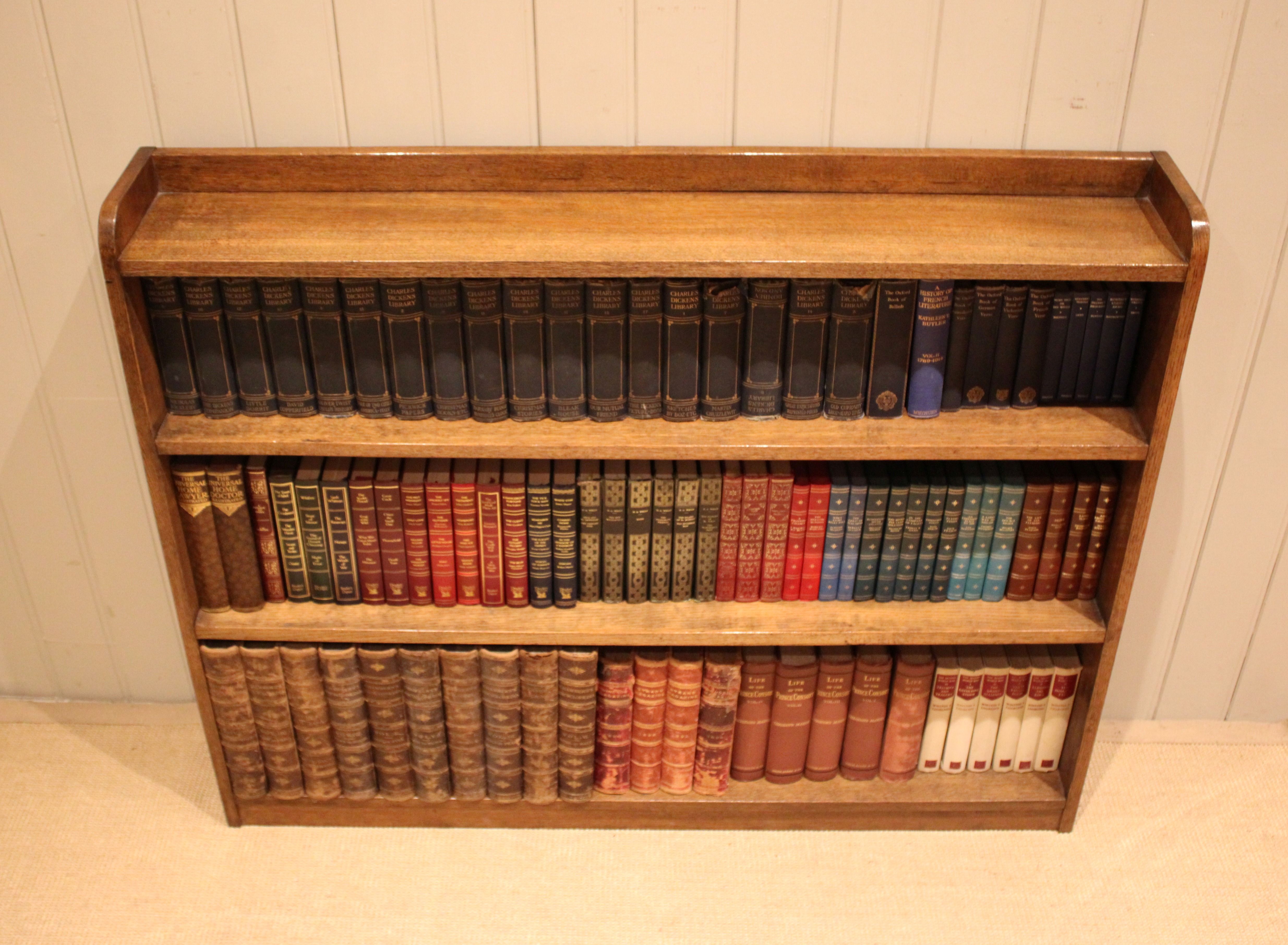 Solid oak open bookcase having three fixed shelves , raised on a plinth base . the shelf dimensions are 116 cm wide and 19 cm deep and from the bottom up 29 cm high , 26 cm high and at the top 21.5 cm high .