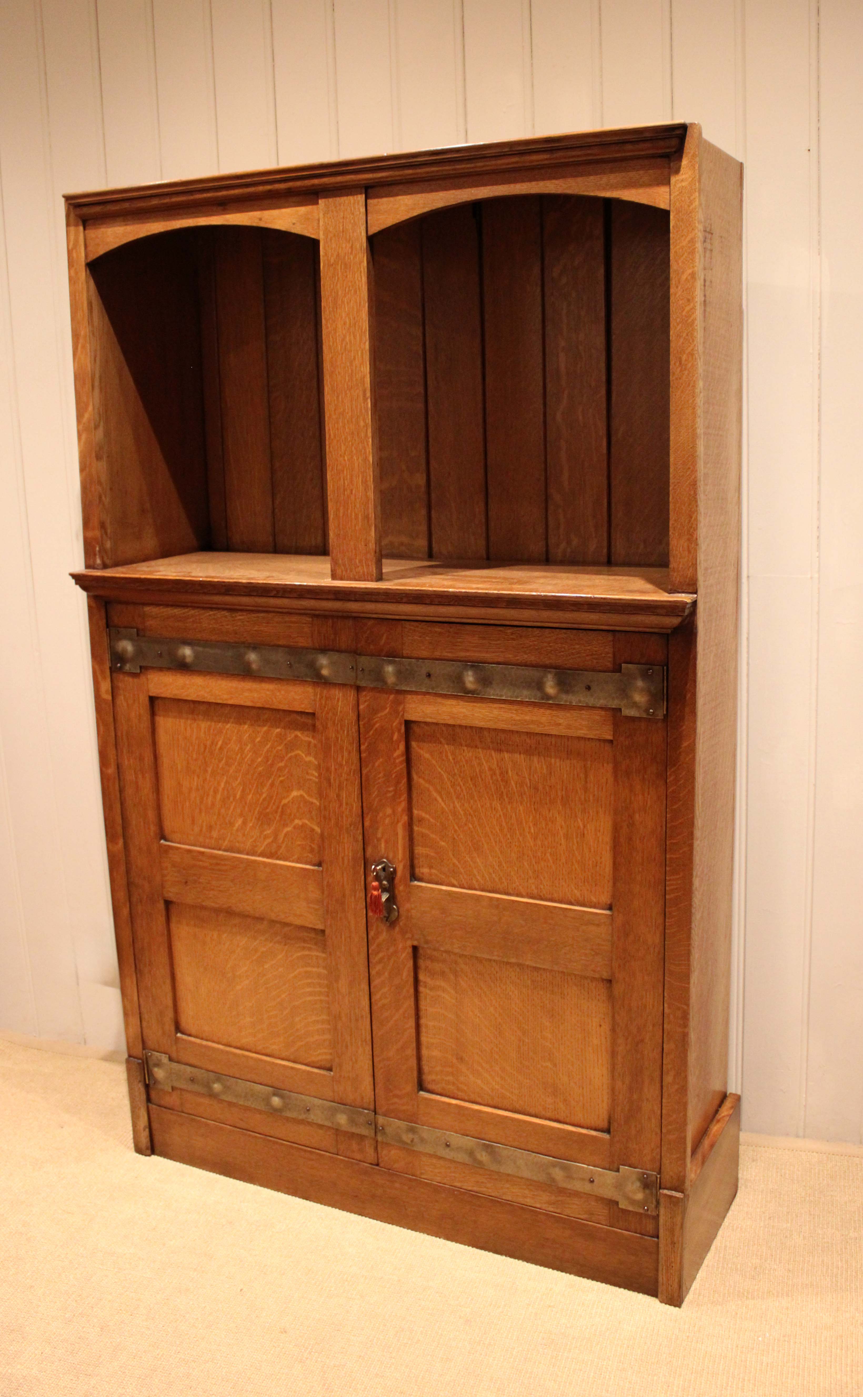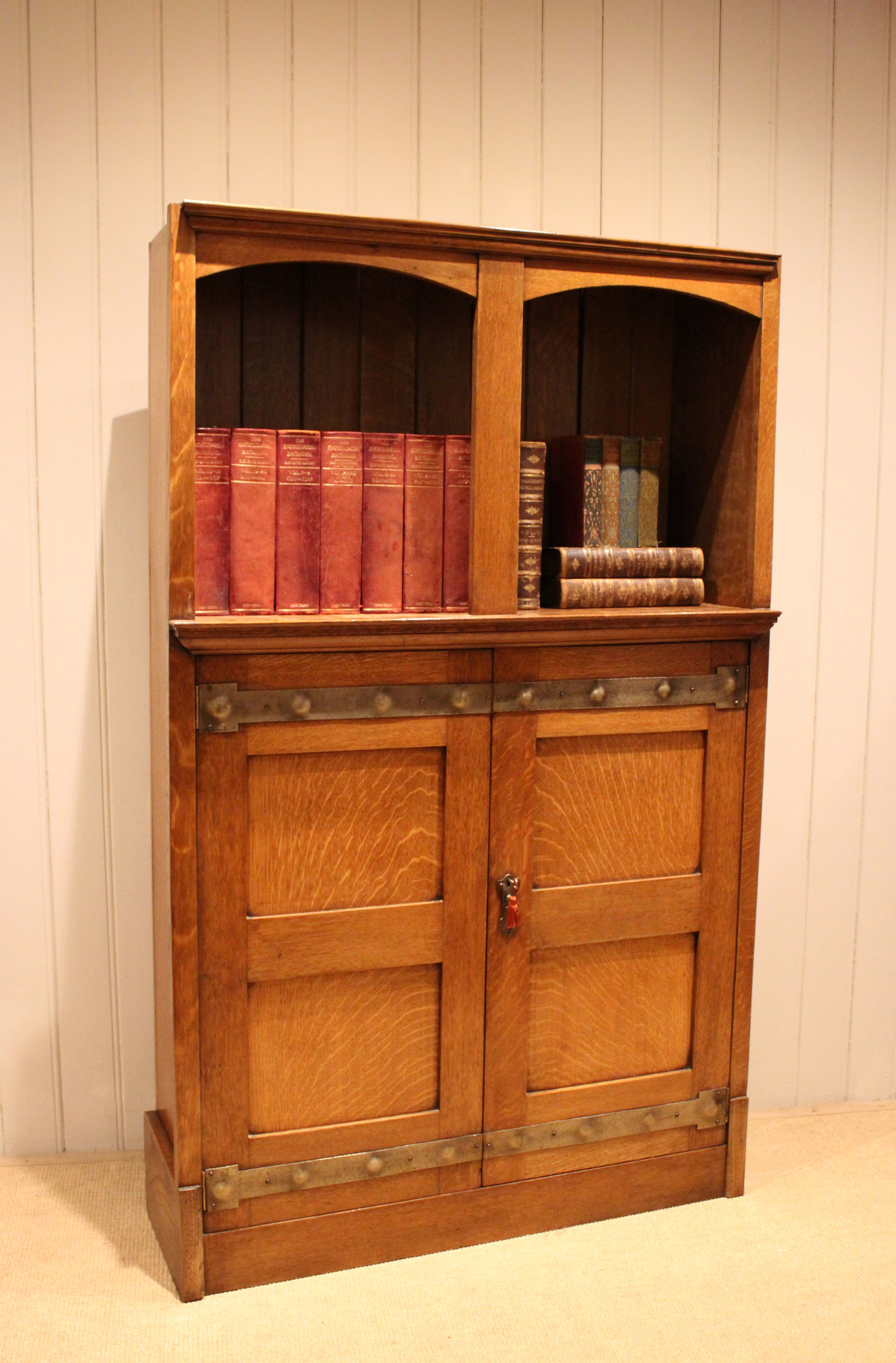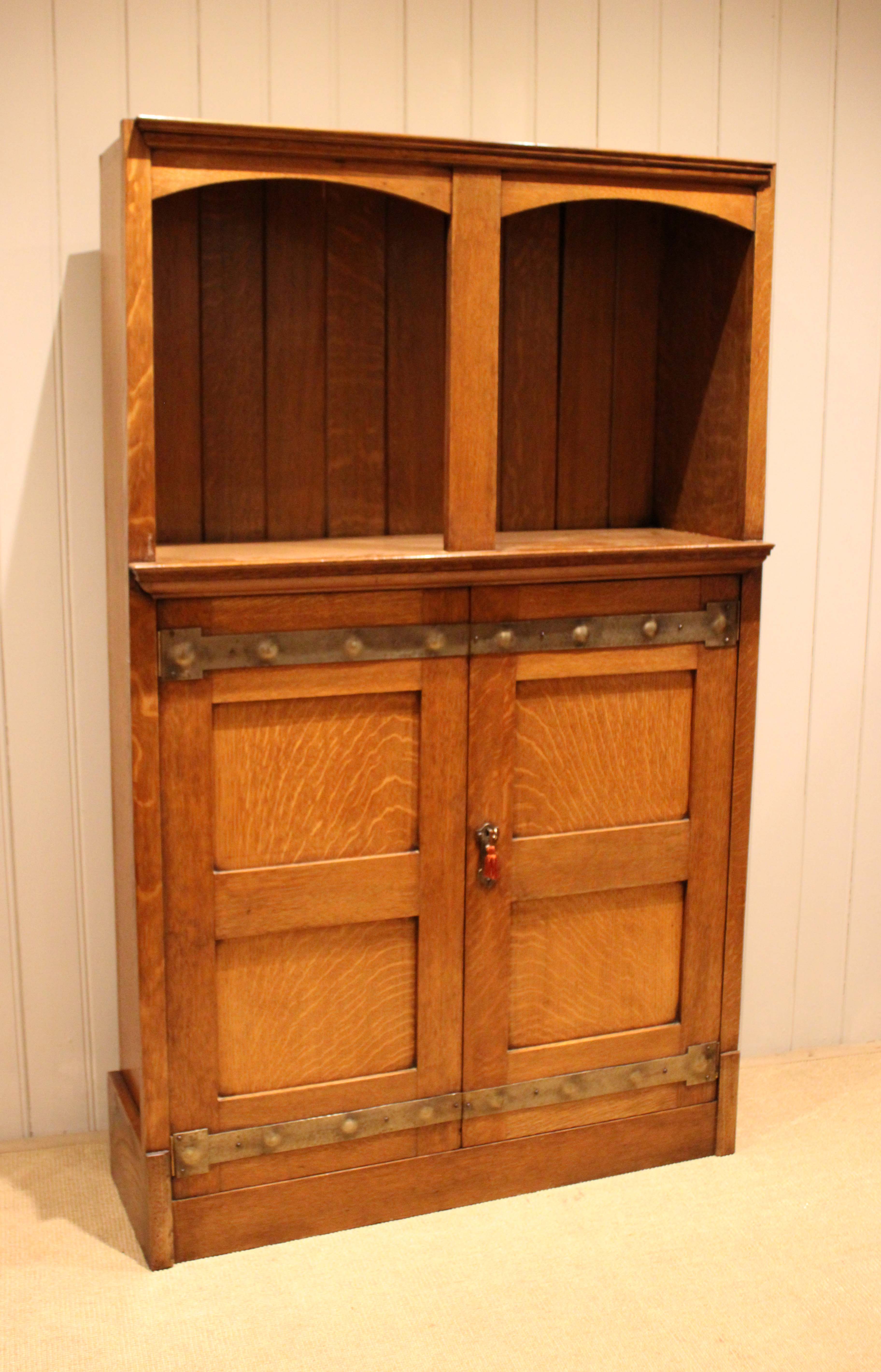 Substantial golden oak Arts & Crafts cabinet having a panelled back with an open top above a two door cupboard base , with decorative strap hinges , opening to reveal a shelved interior , raised on a plinth base . Complete with working lock & key .