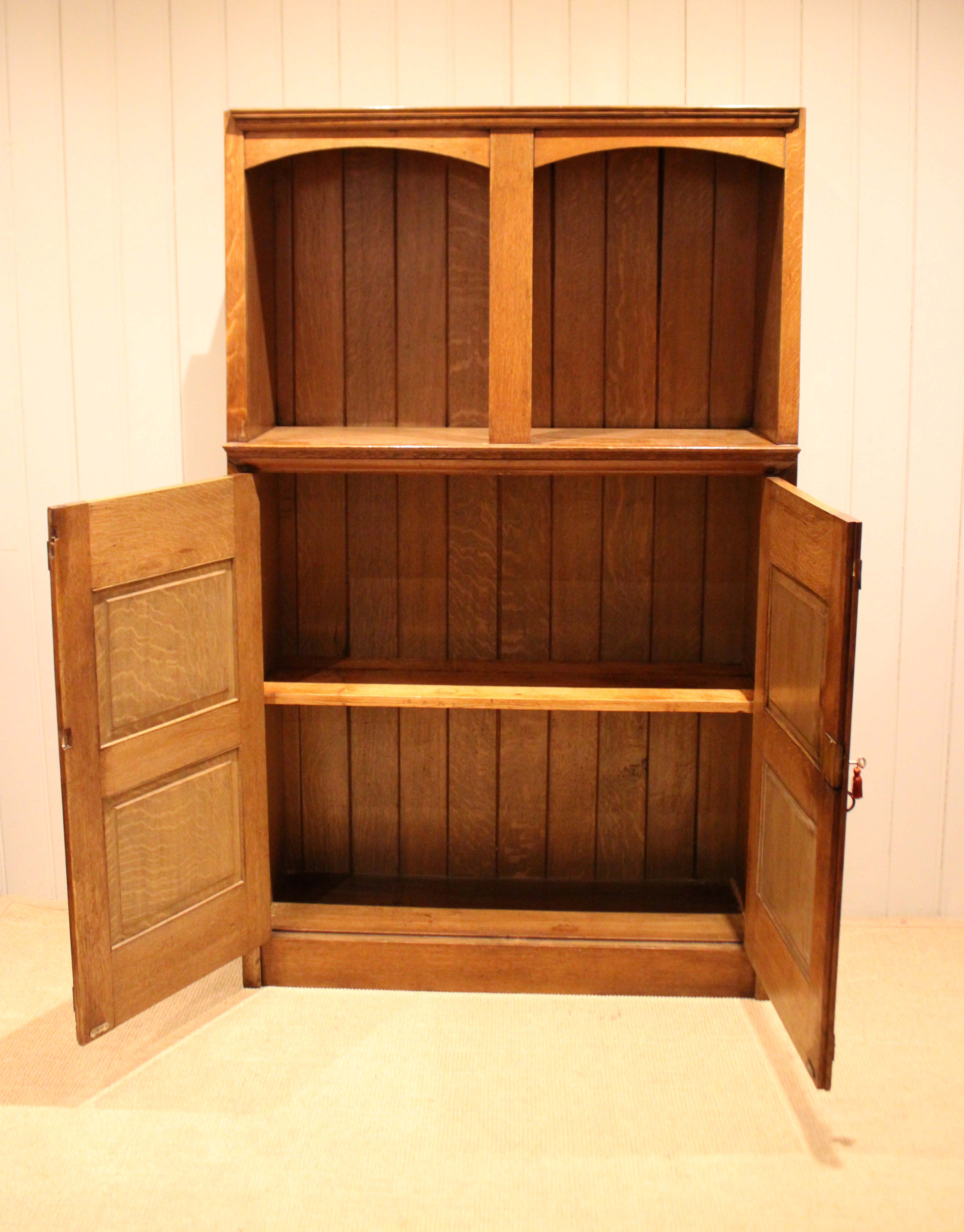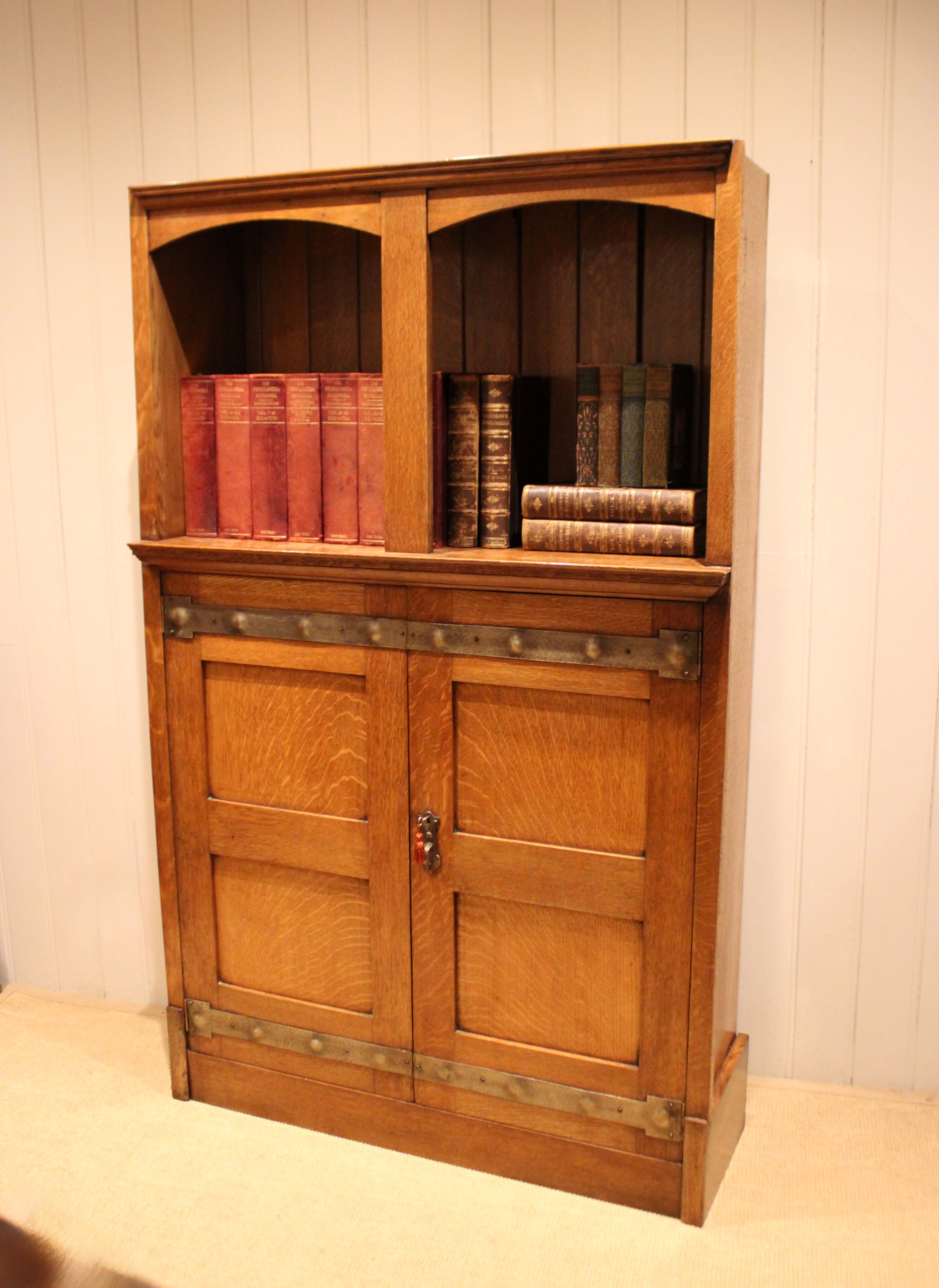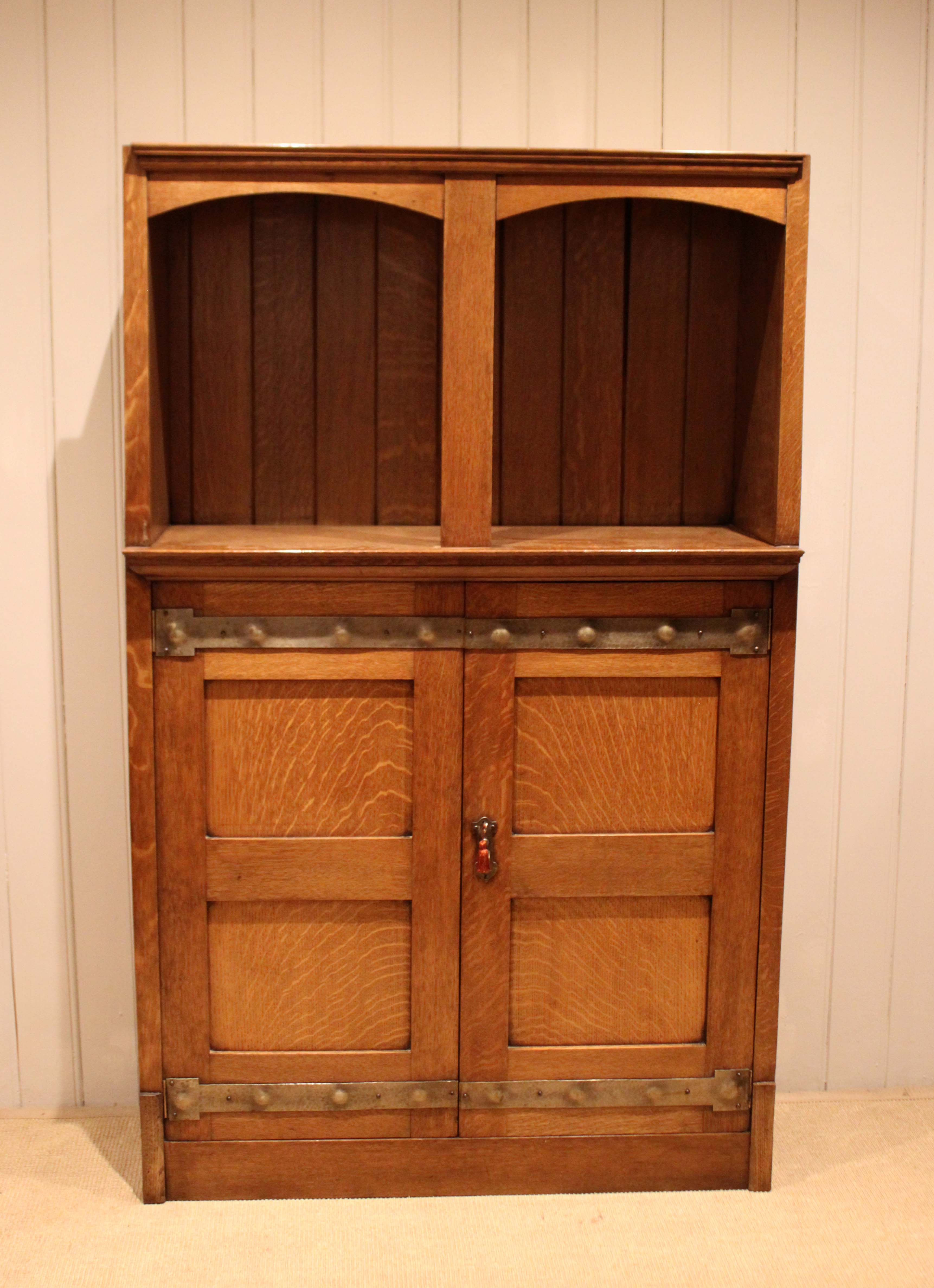 Substantial golden oak Arts & Crafts cabinet having a panelled back with an open top above a two door cupboard base , with decorative strap hinges , opening to reveal a shelved interior , raised on a plinth base . Complete with working lock & key .