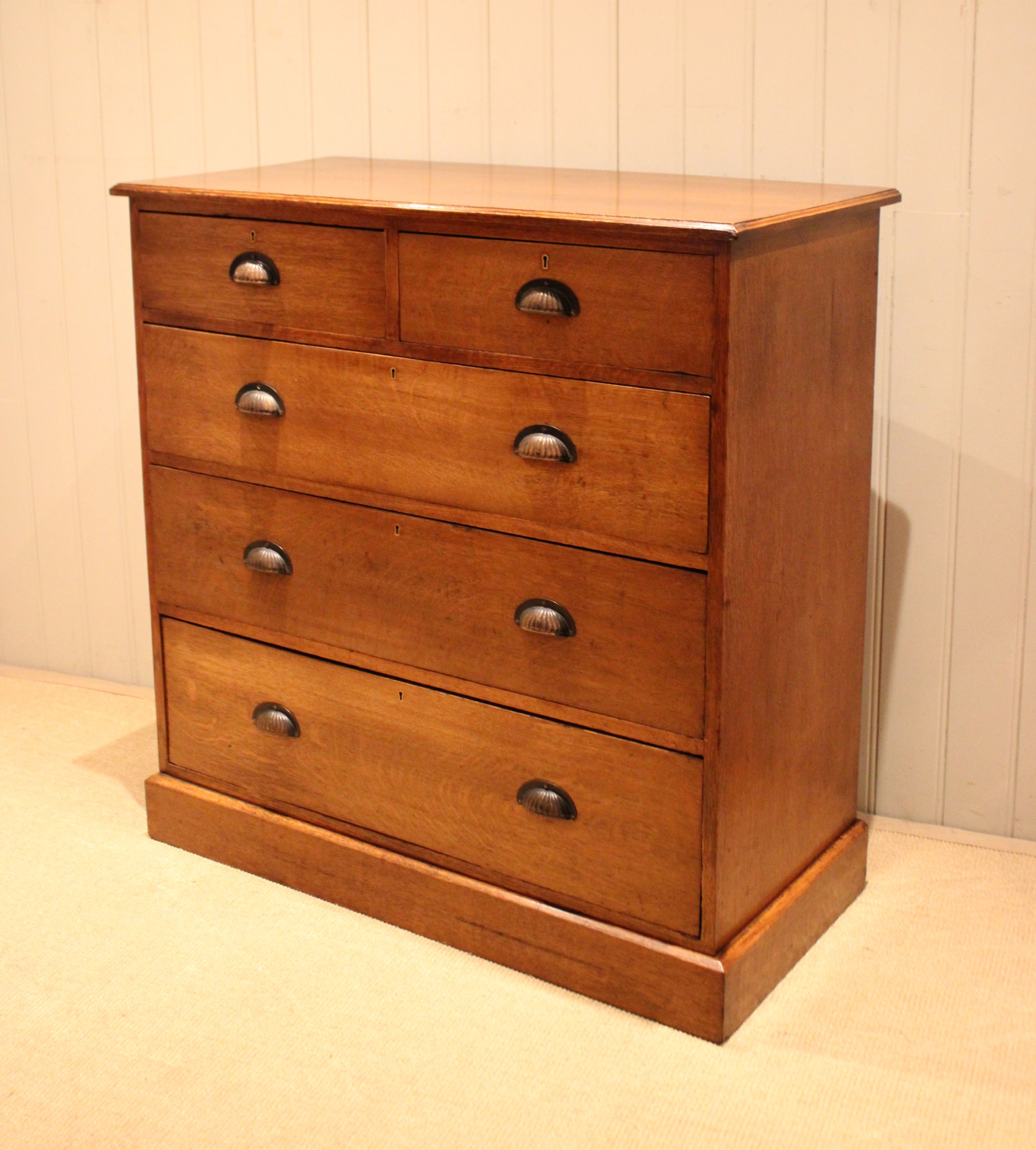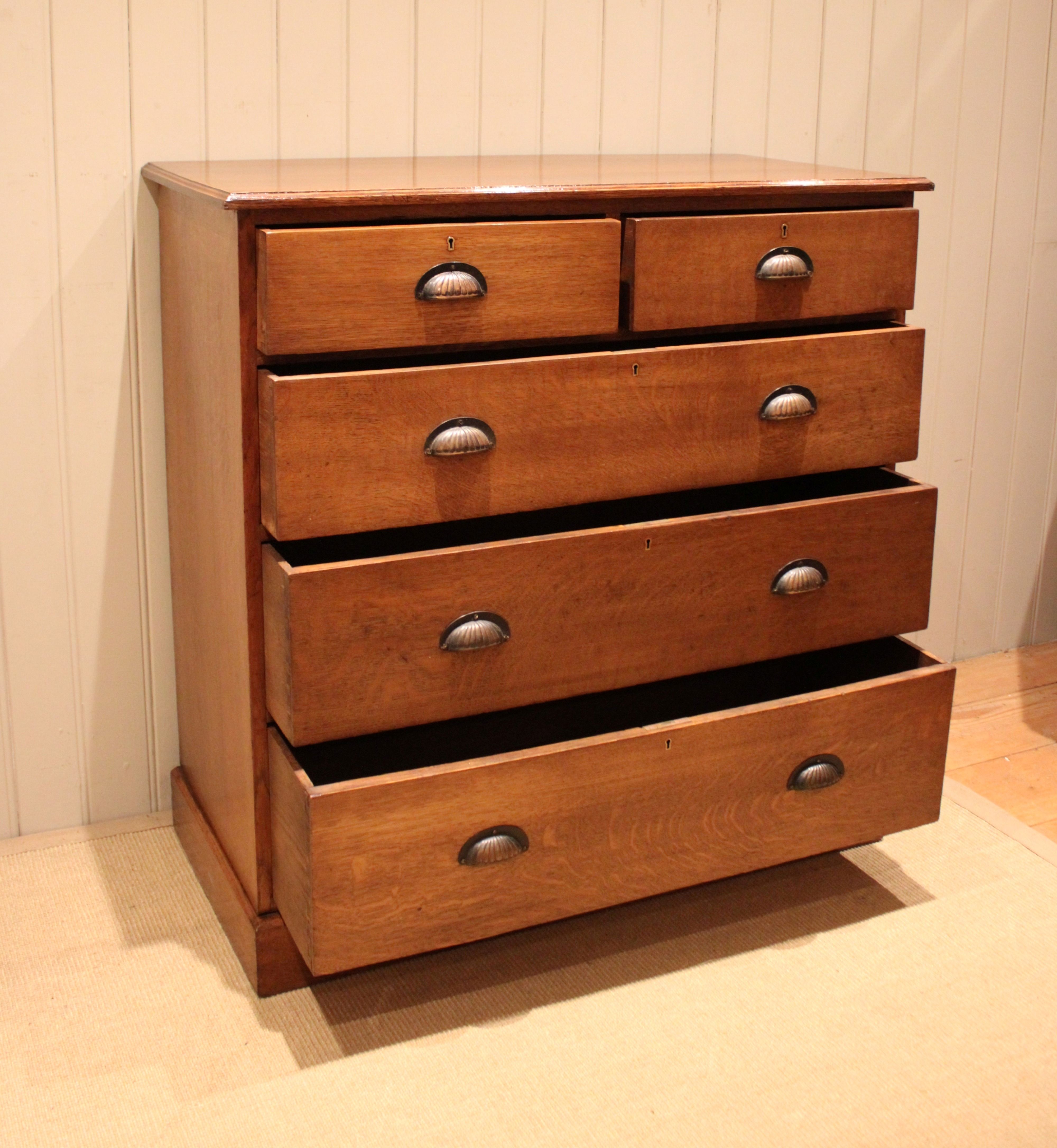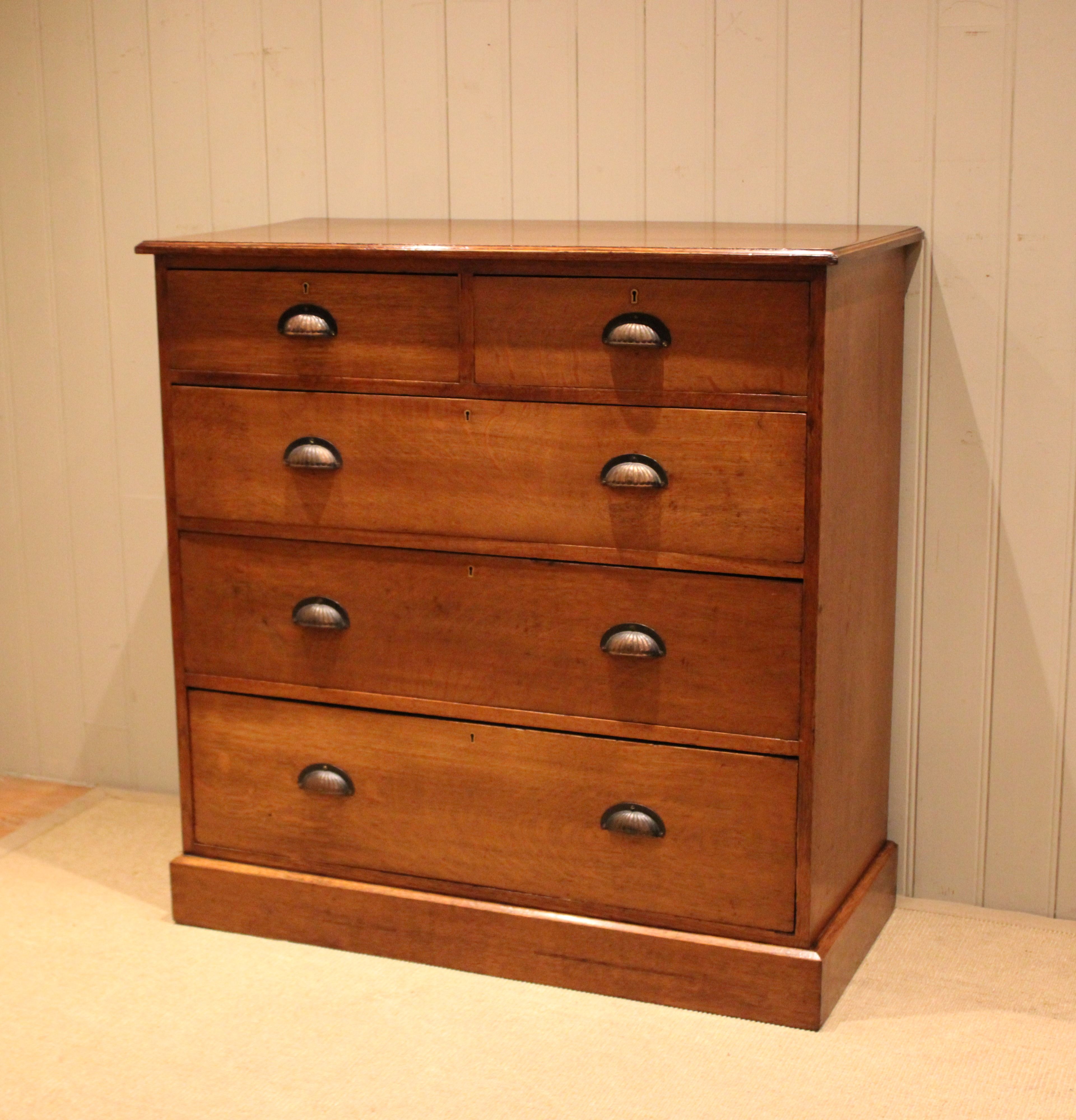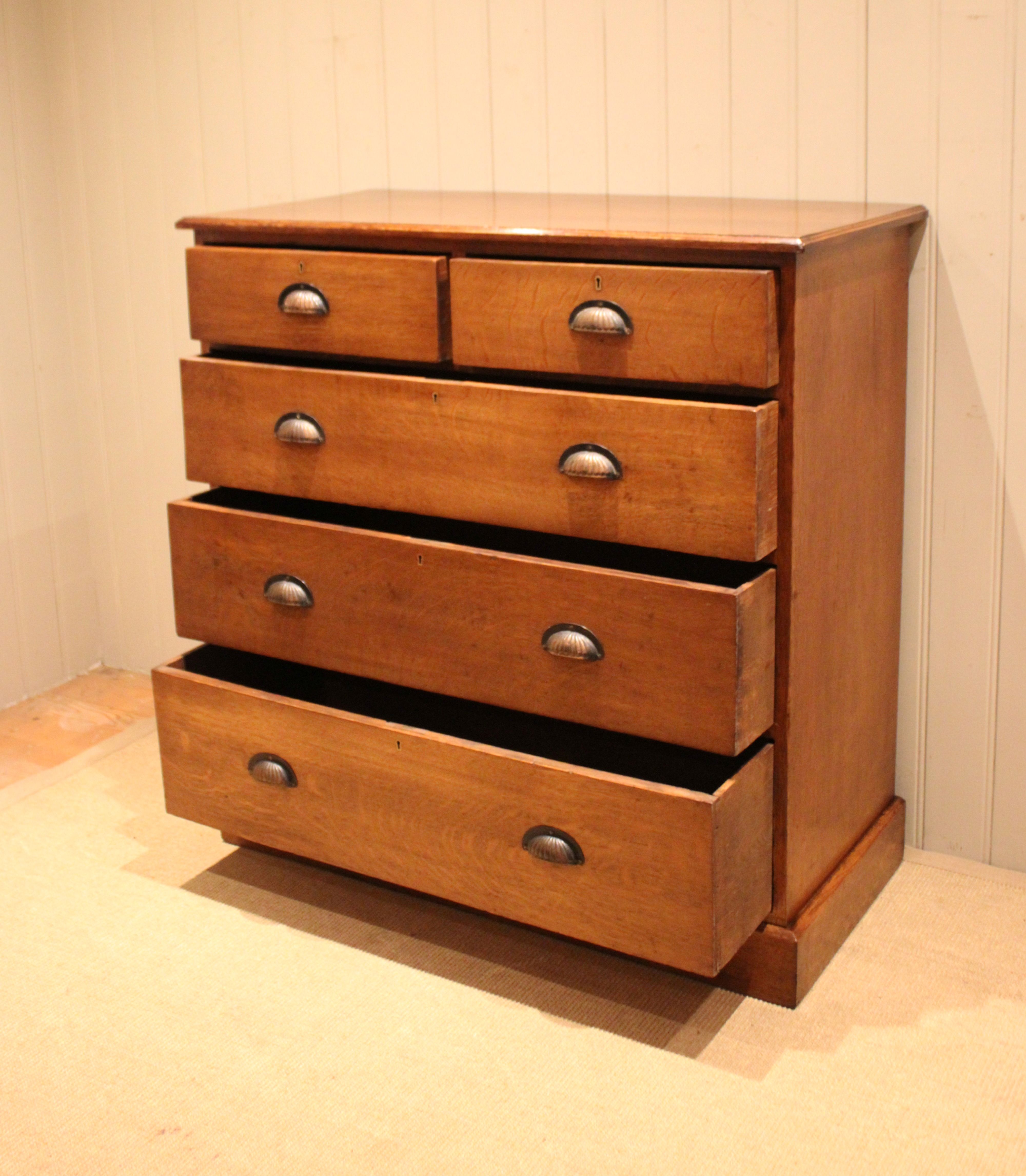 Substantial solid oak chest of two short and three long graduated drawers with decorative fluted handles , raised on a plinth base. The drawer depths from the bottom up are 23.5 cm , 20.5 cm , 17.5 cm and the top two are 12.5 cm deep .
