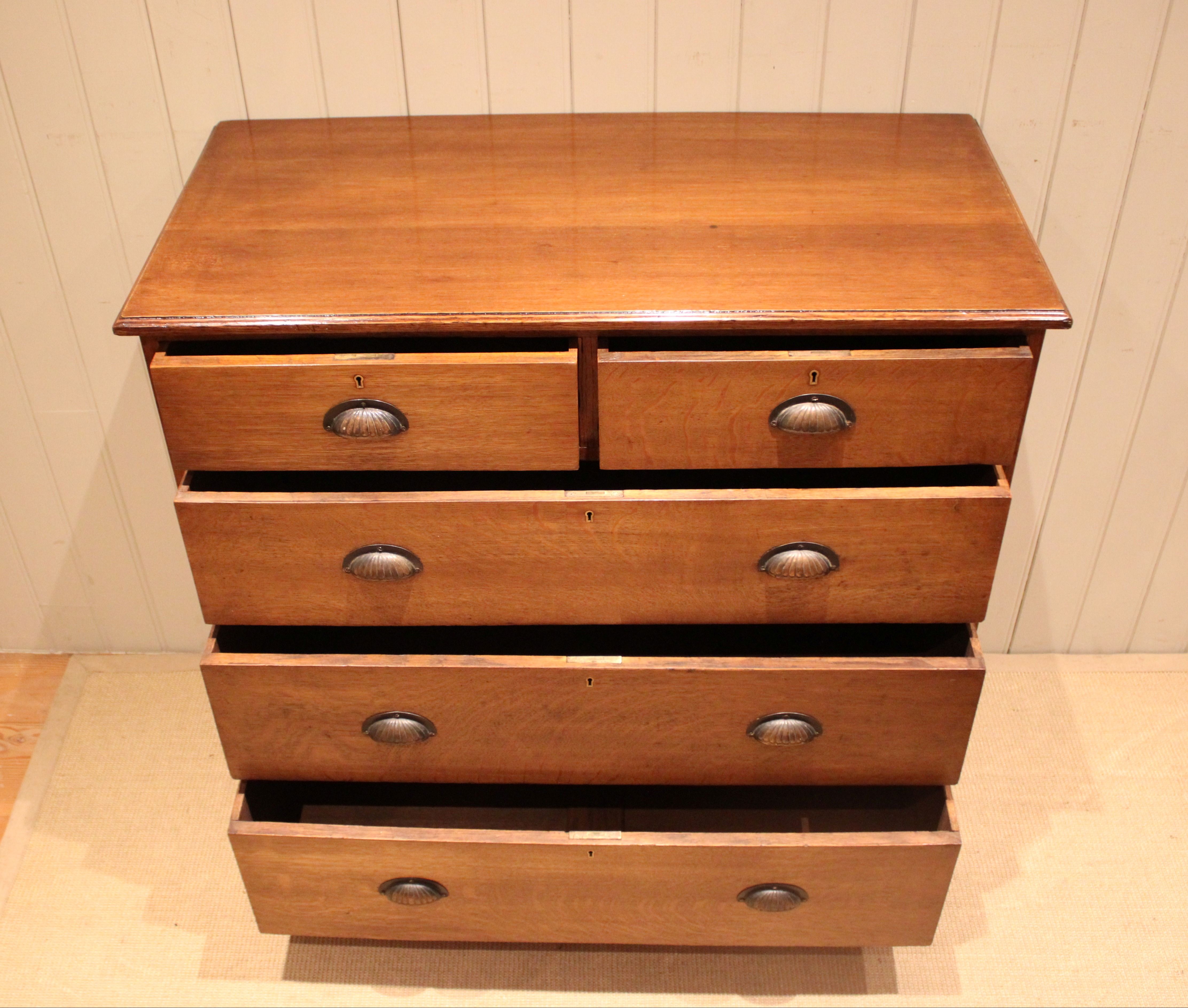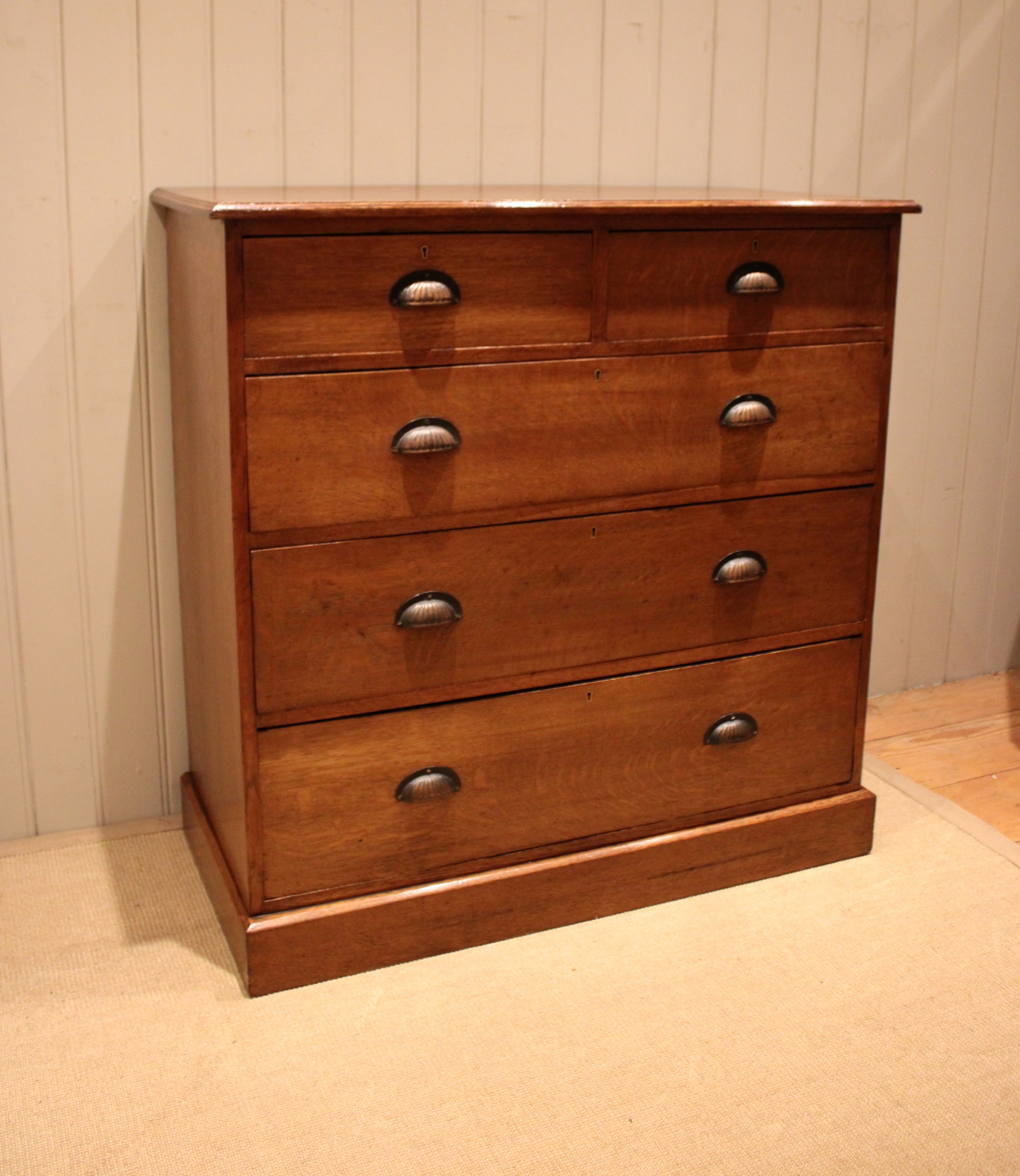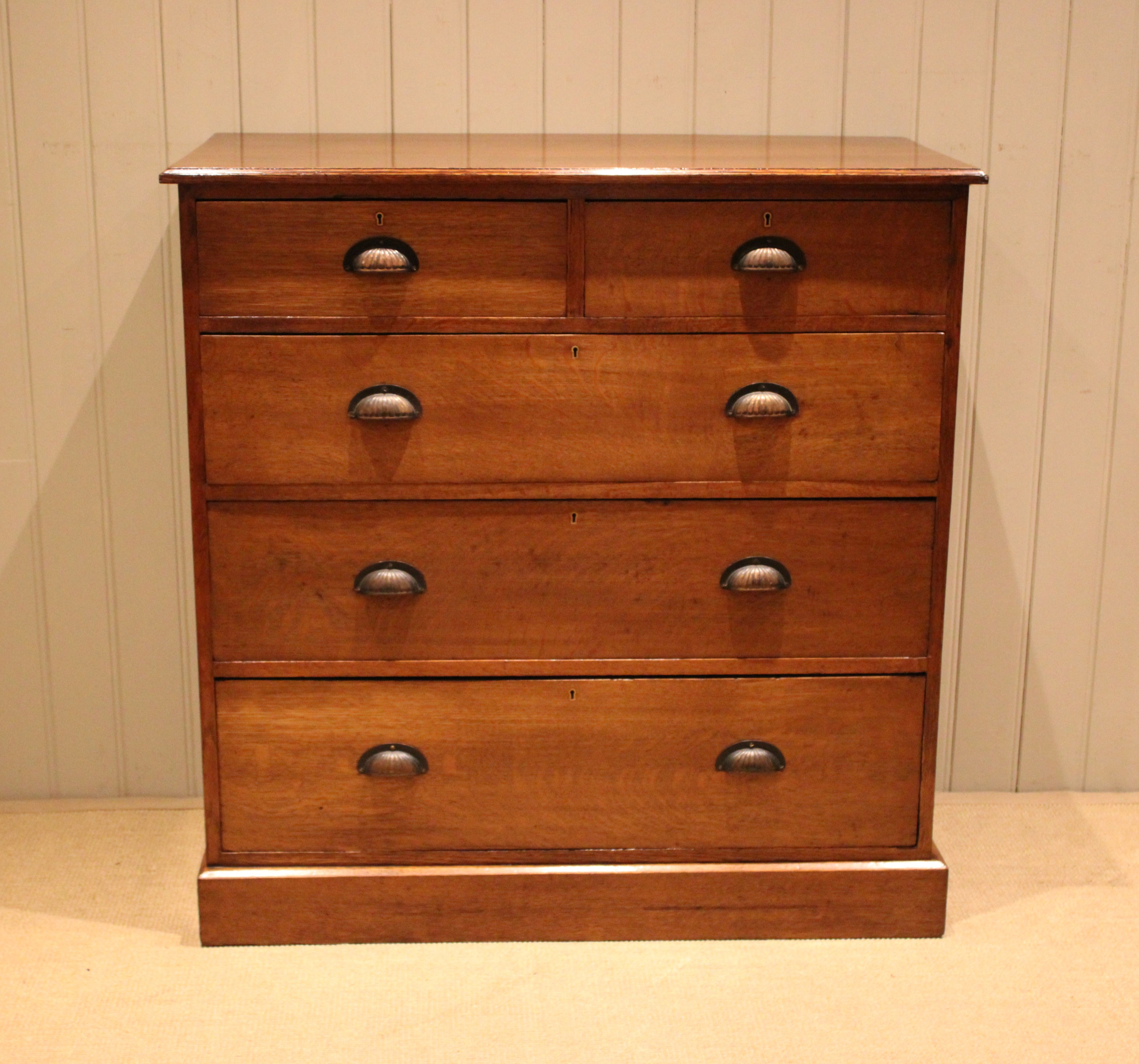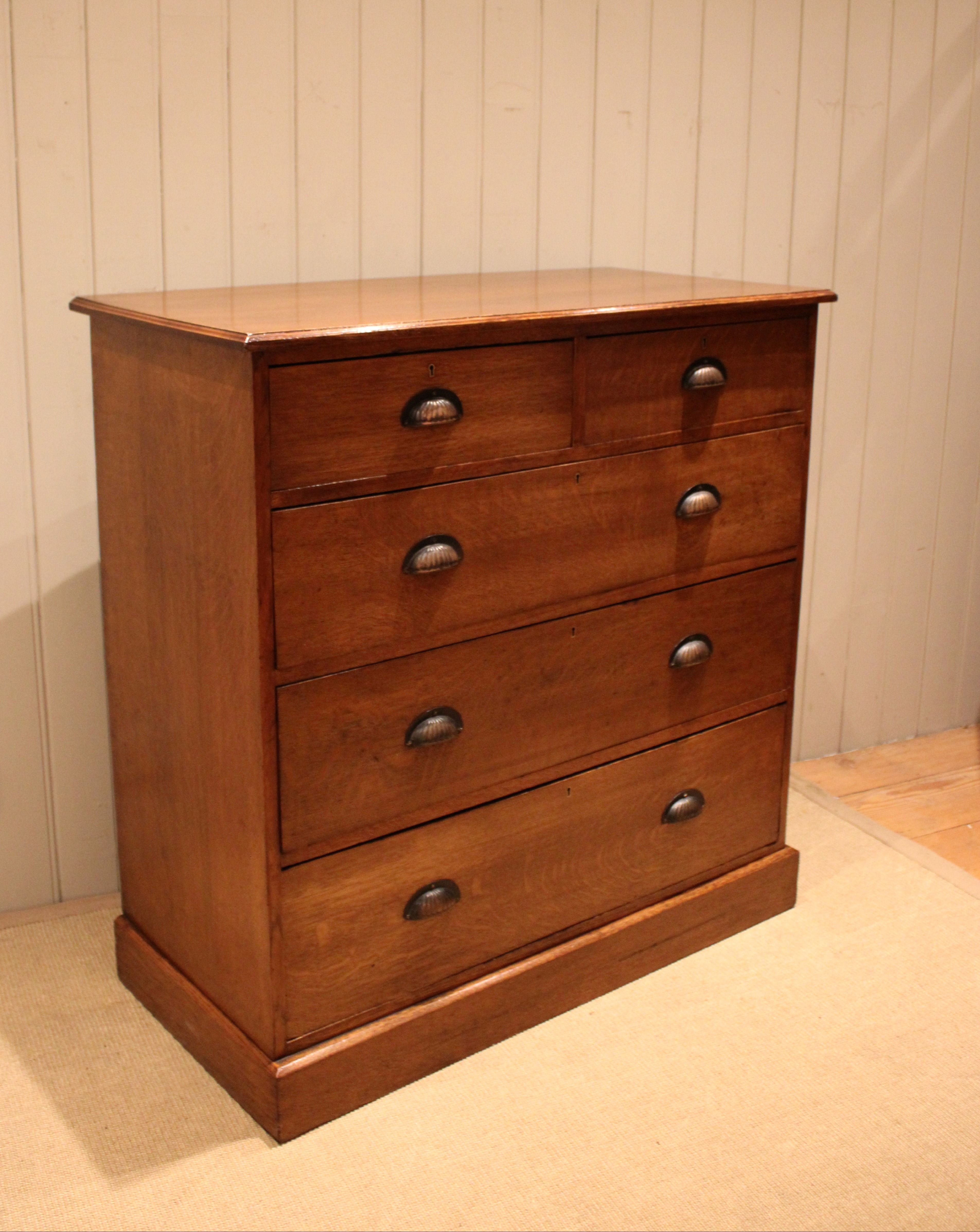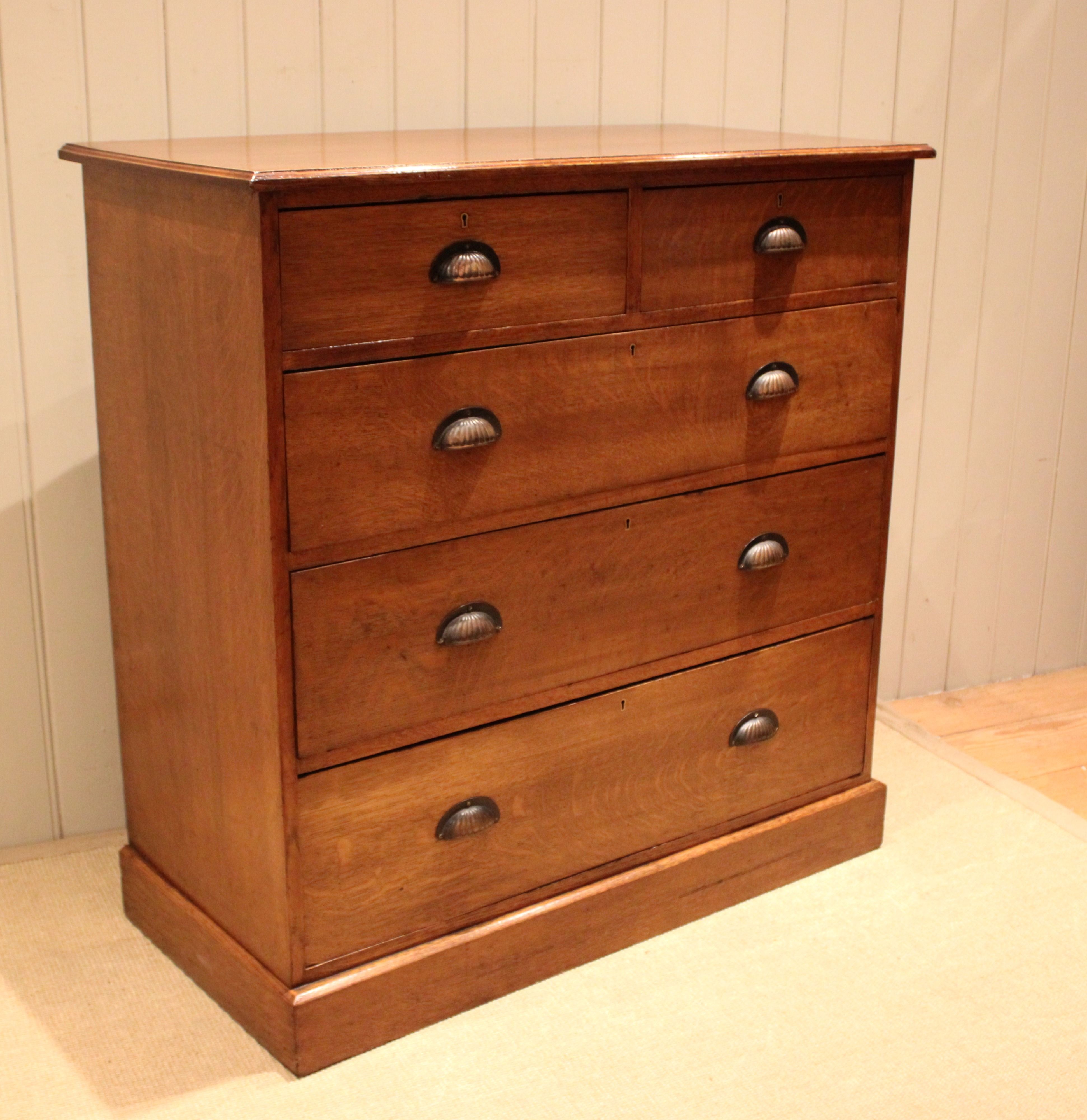 Substantial solid oak chest of two short and three long graduated drawers with decorative fluted handles , raised on a plinth base. The drawer depths from the bottom up are 23.5 cm , 20.5 cm , 17.5 cm and the top two are 12.5 cm deep .