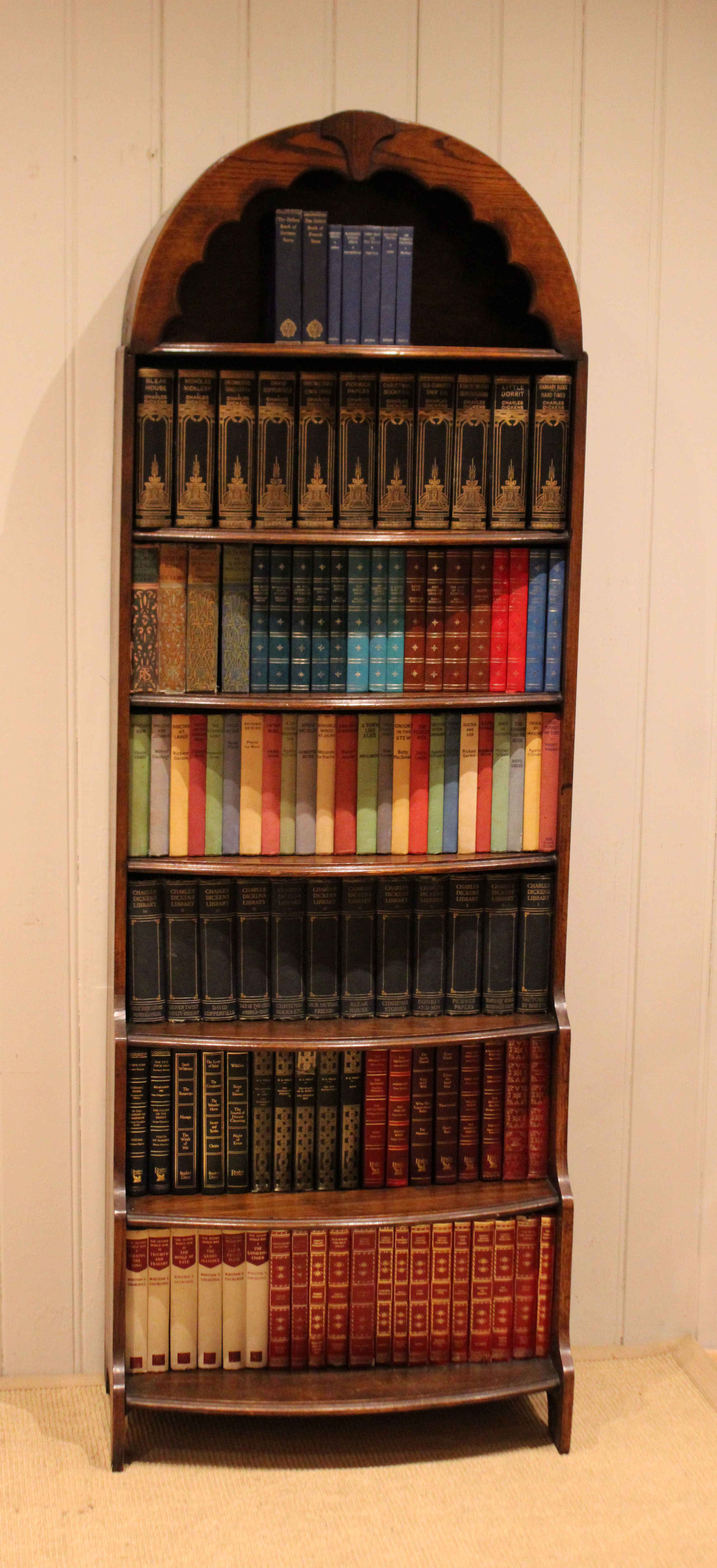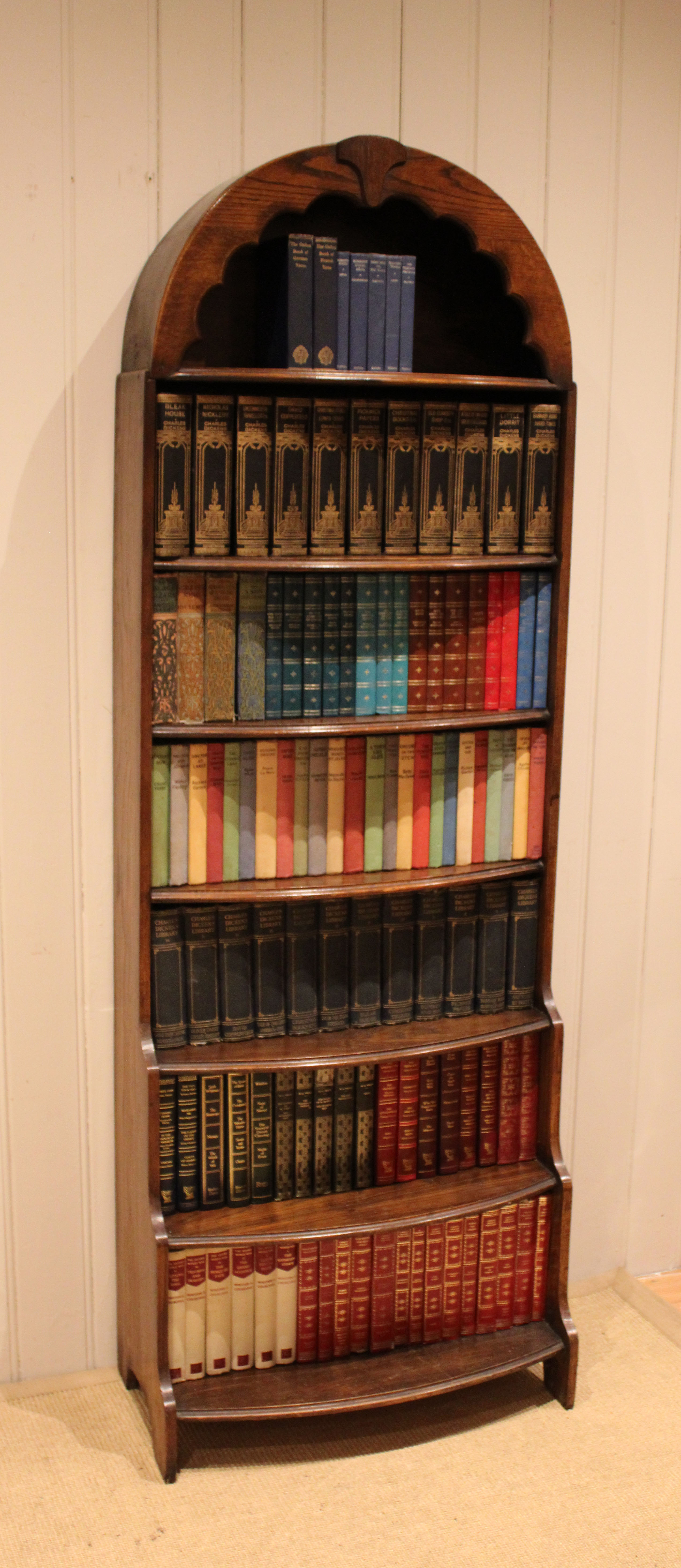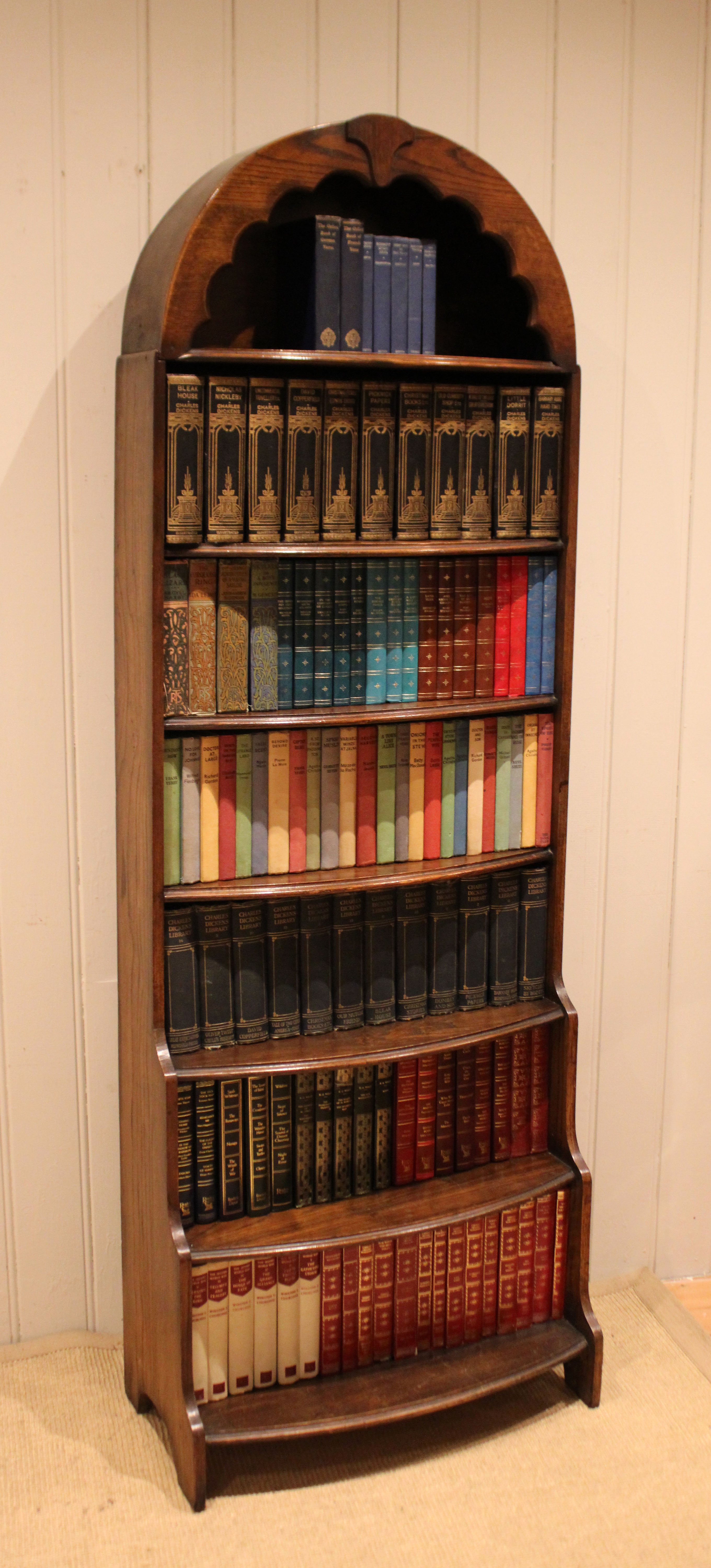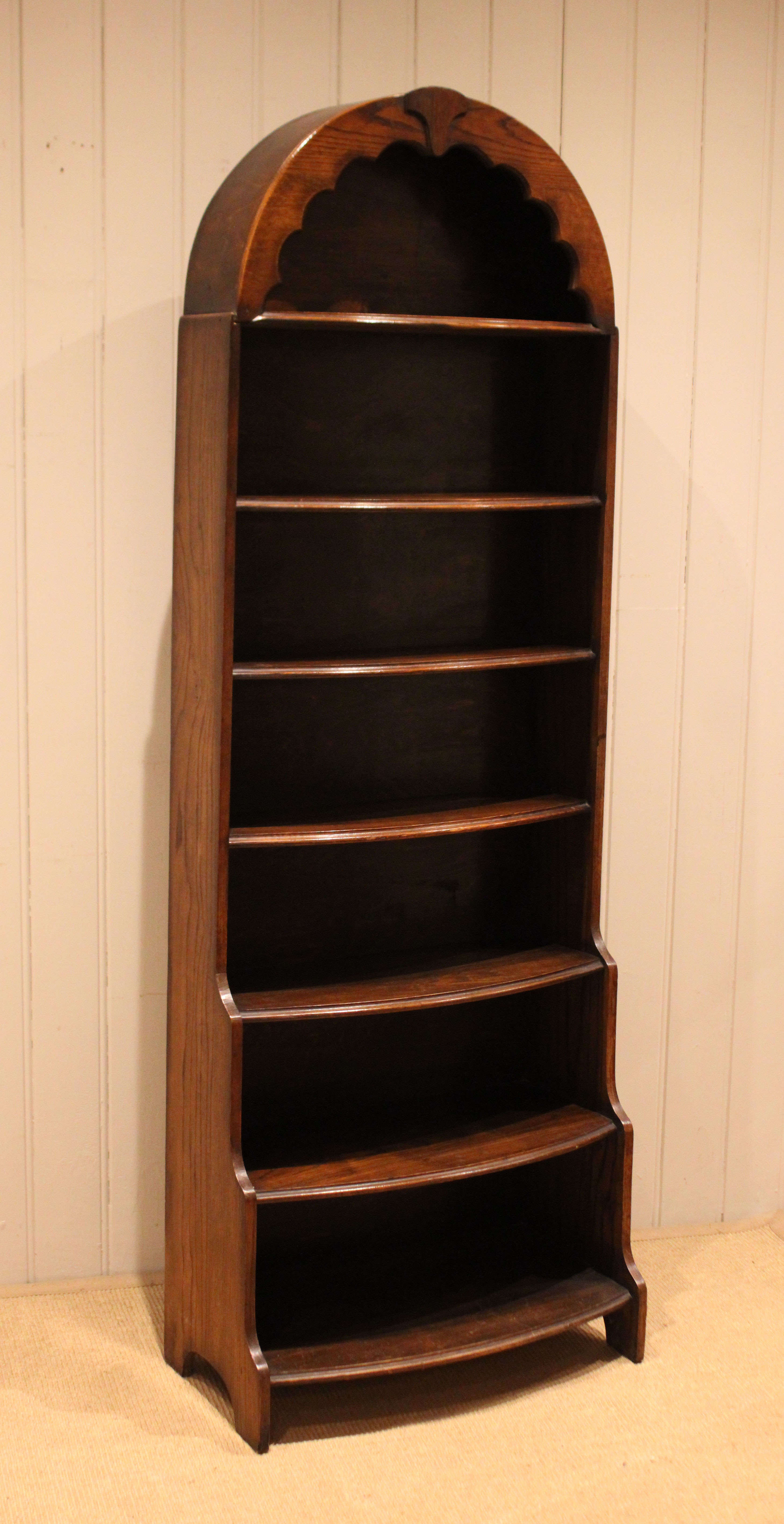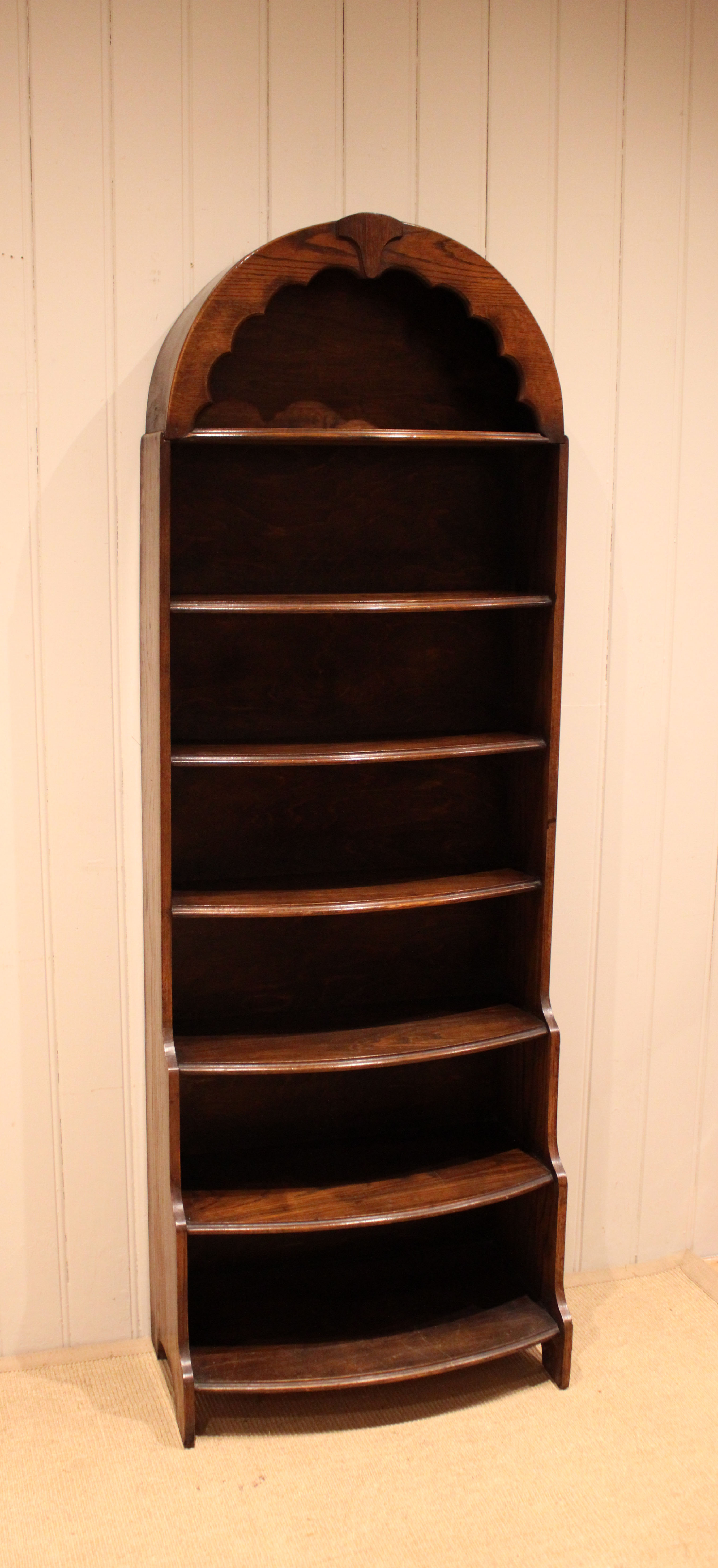 Tall oak arch top open bookcase having seven fixed graduated shelves with a decorative arch top , raised on short supports \the shelf dimensions are 57.5 cm wide and from the bottom upwards 33 cm deep x 21.5 cm high , 28 cm deep x 21.5 cm high , 23 cm deep x 20 cm high , 17.5 cm deep x 20 cm high , 17.5 cm x 20 cm high , 17.5 cm deep x 21 cm high and at the top 17.5 cm deep x 20 cm high at the highest point .