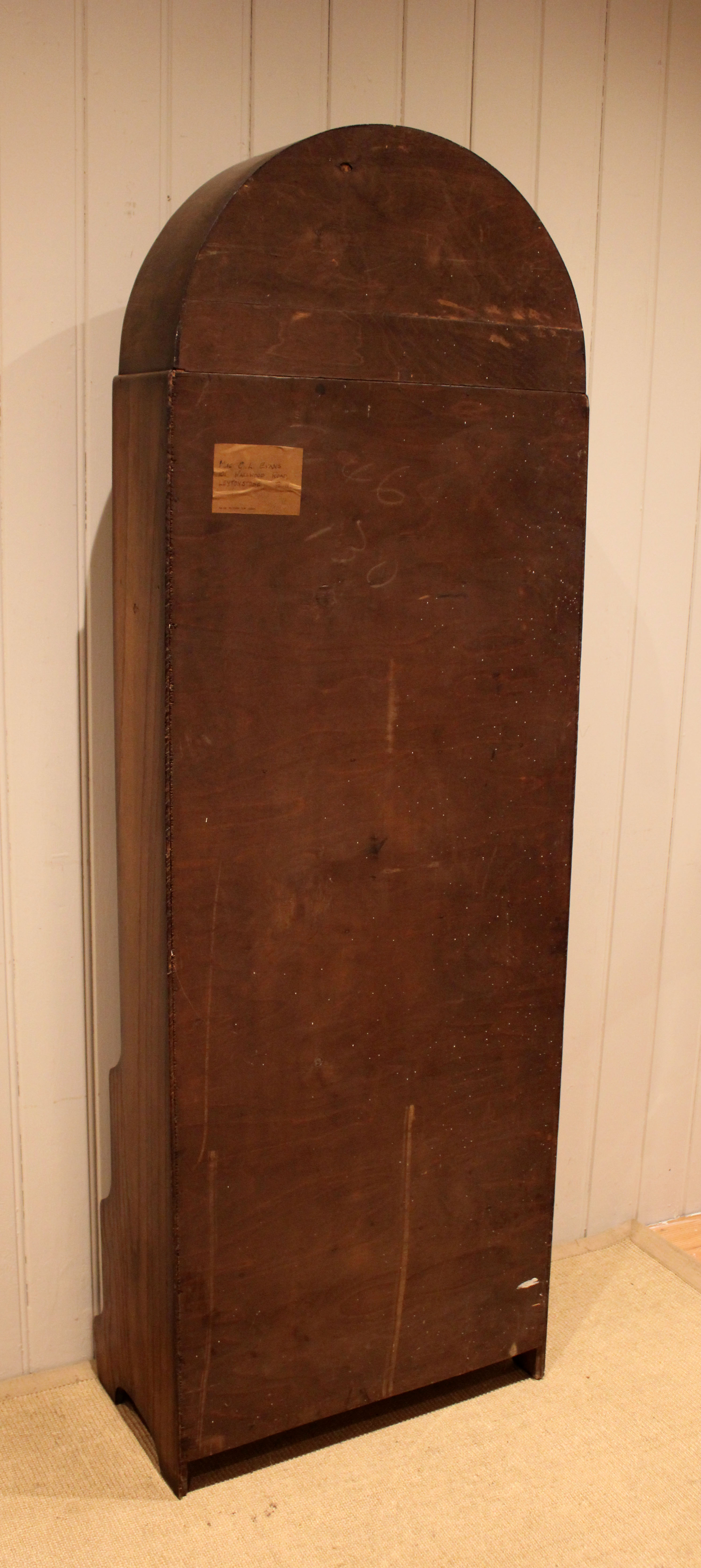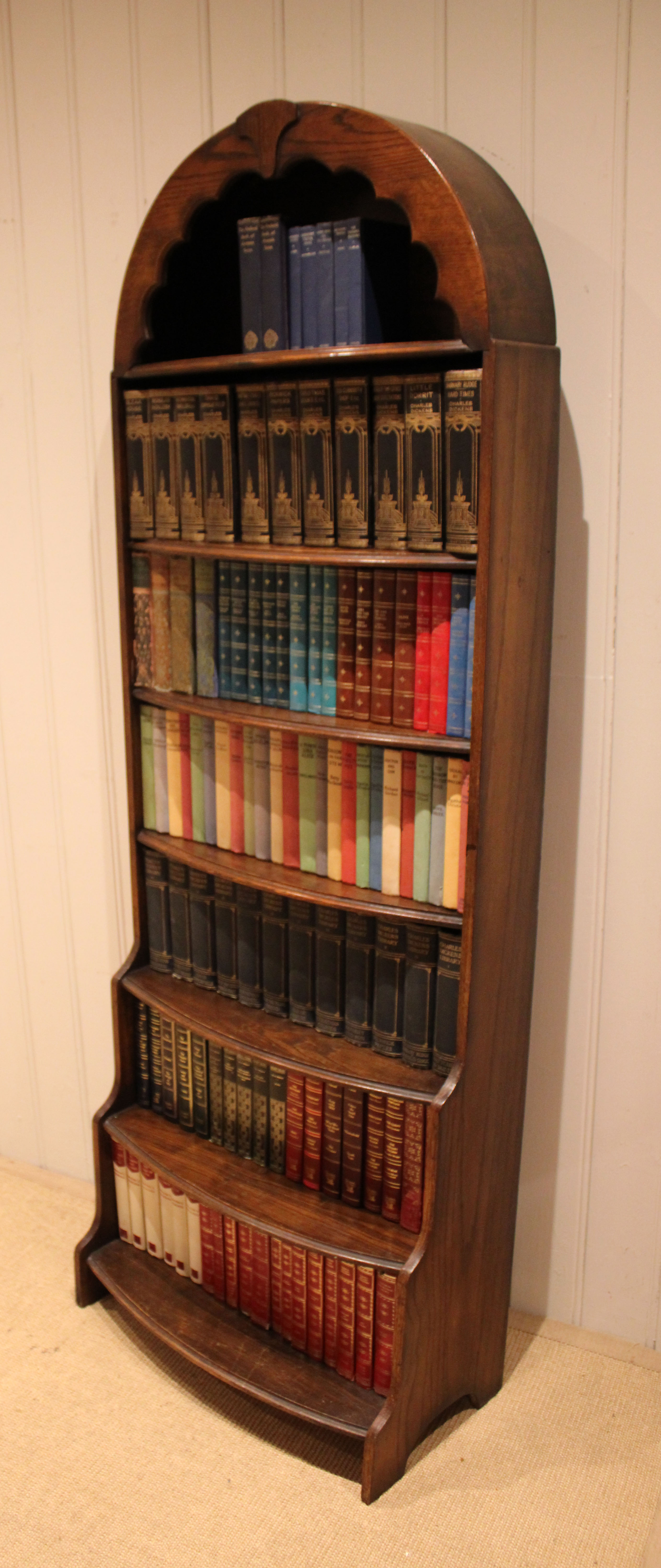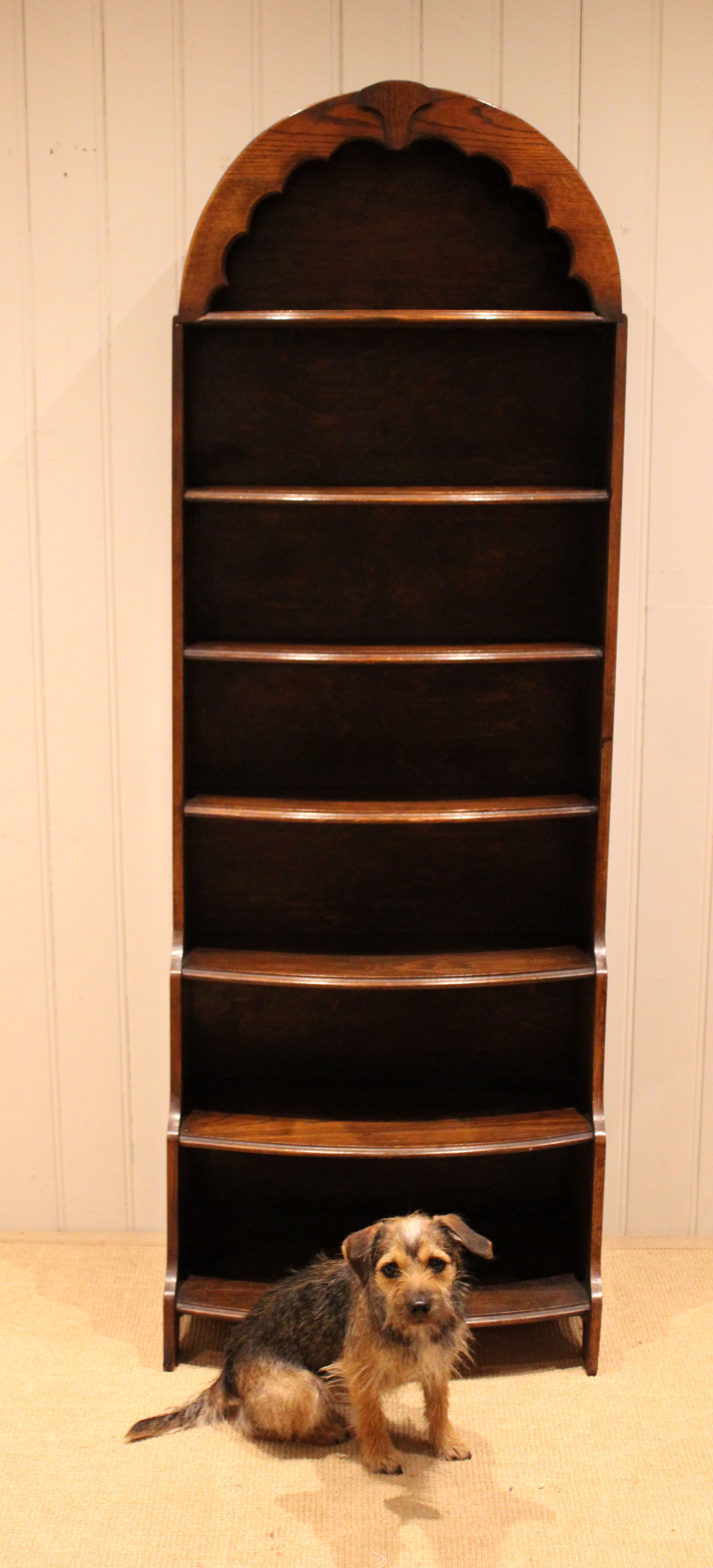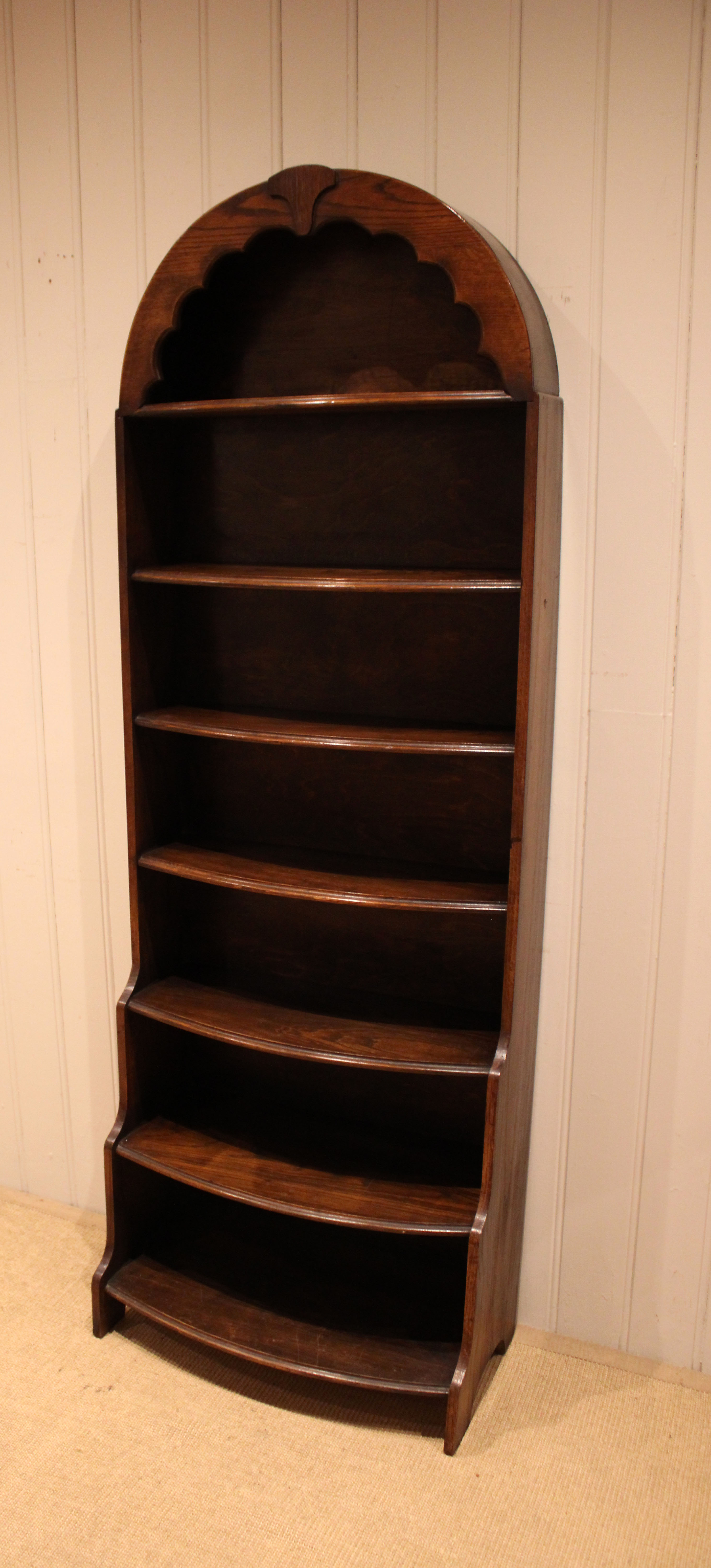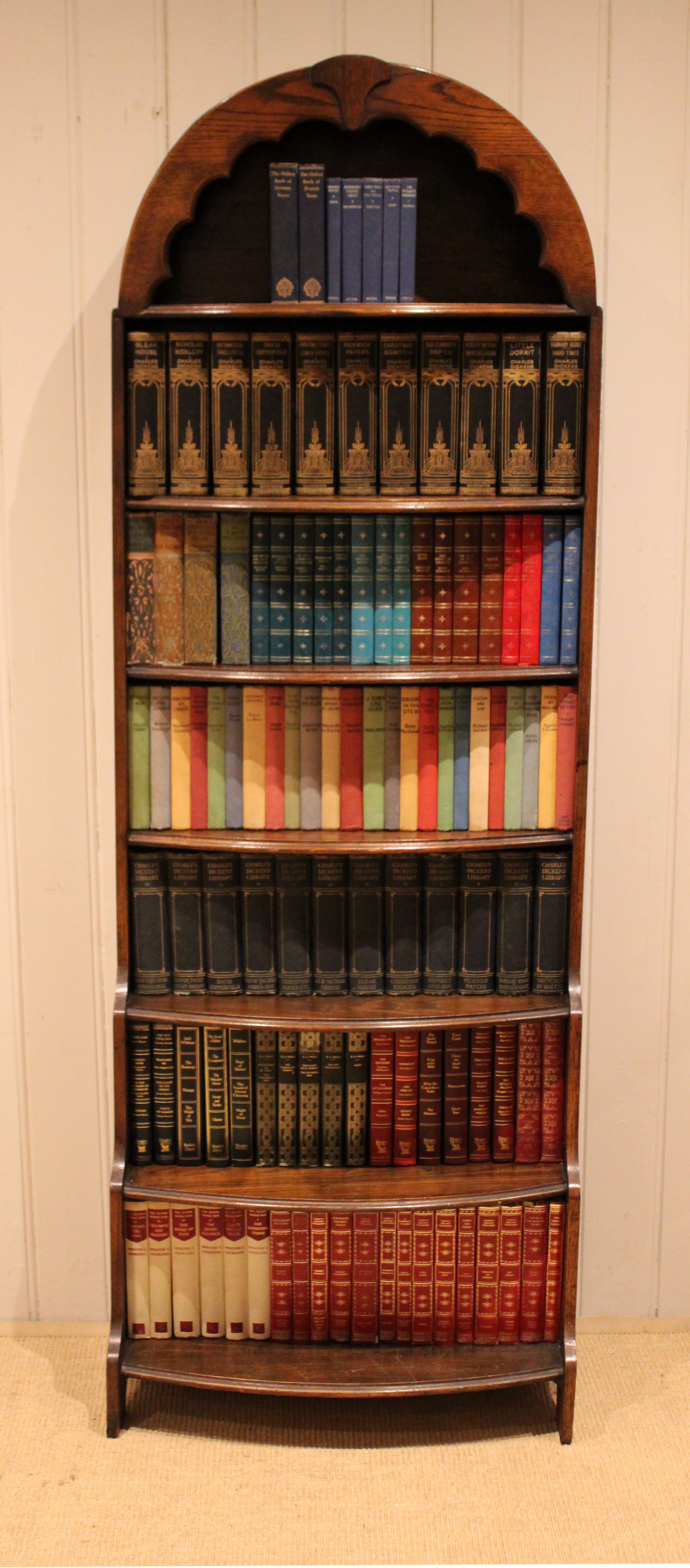 Tall oak arch top open bookcase having seven fixed graduated shelves with a decorative arch top , raised on short supports \the shelf dimensions are 57.5 cm wide and from the bottom upwards 33 cm deep x 21.5 cm high , 28 cm deep x 21.5 cm high , 23 cm deep x 20 cm high , 17.5 cm deep x 20 cm high , 17.5 cm x 20 cm high , 17.5 cm deep x 21 cm high and at the top 17.5 cm deep x 20 cm high at the highest point .