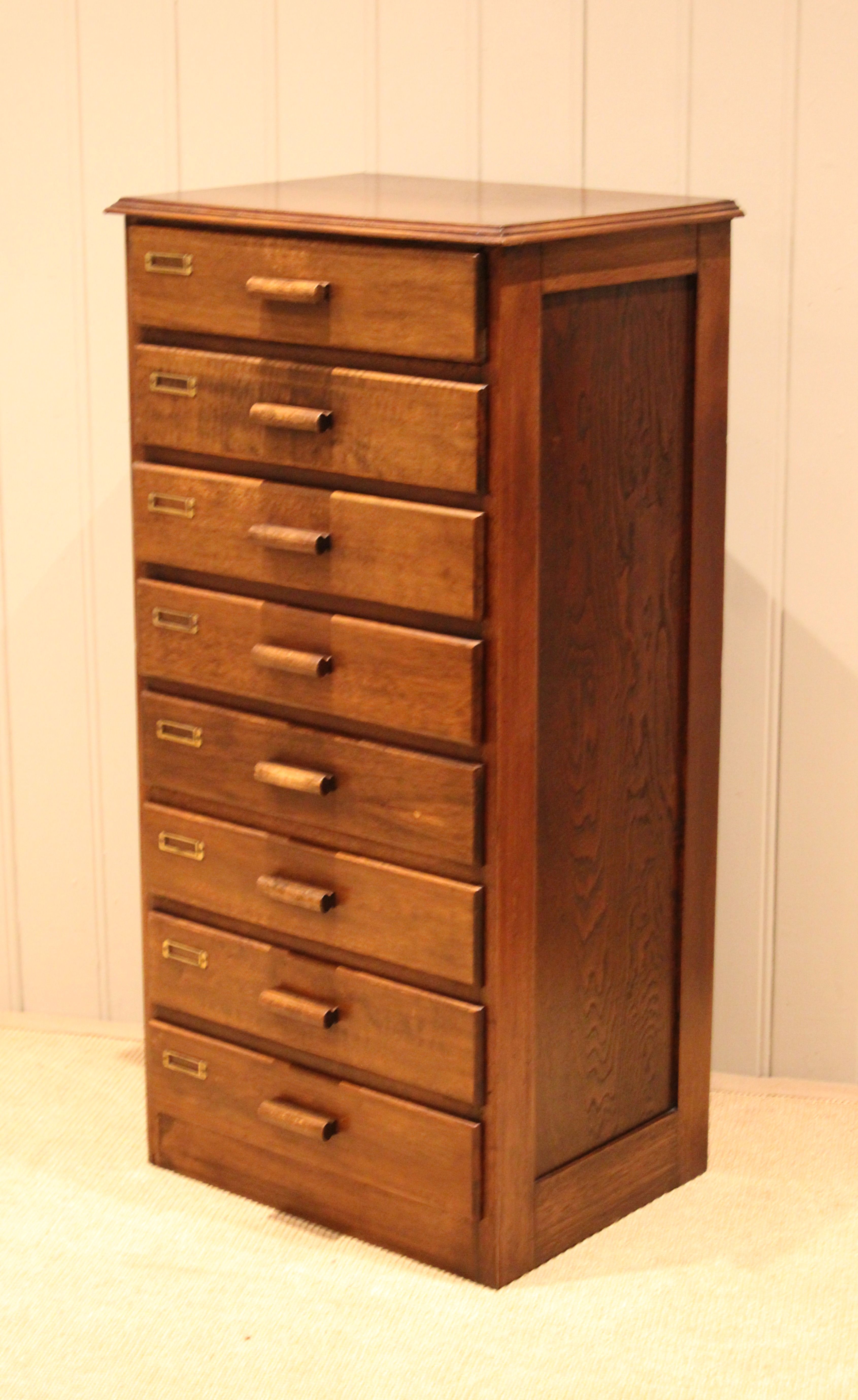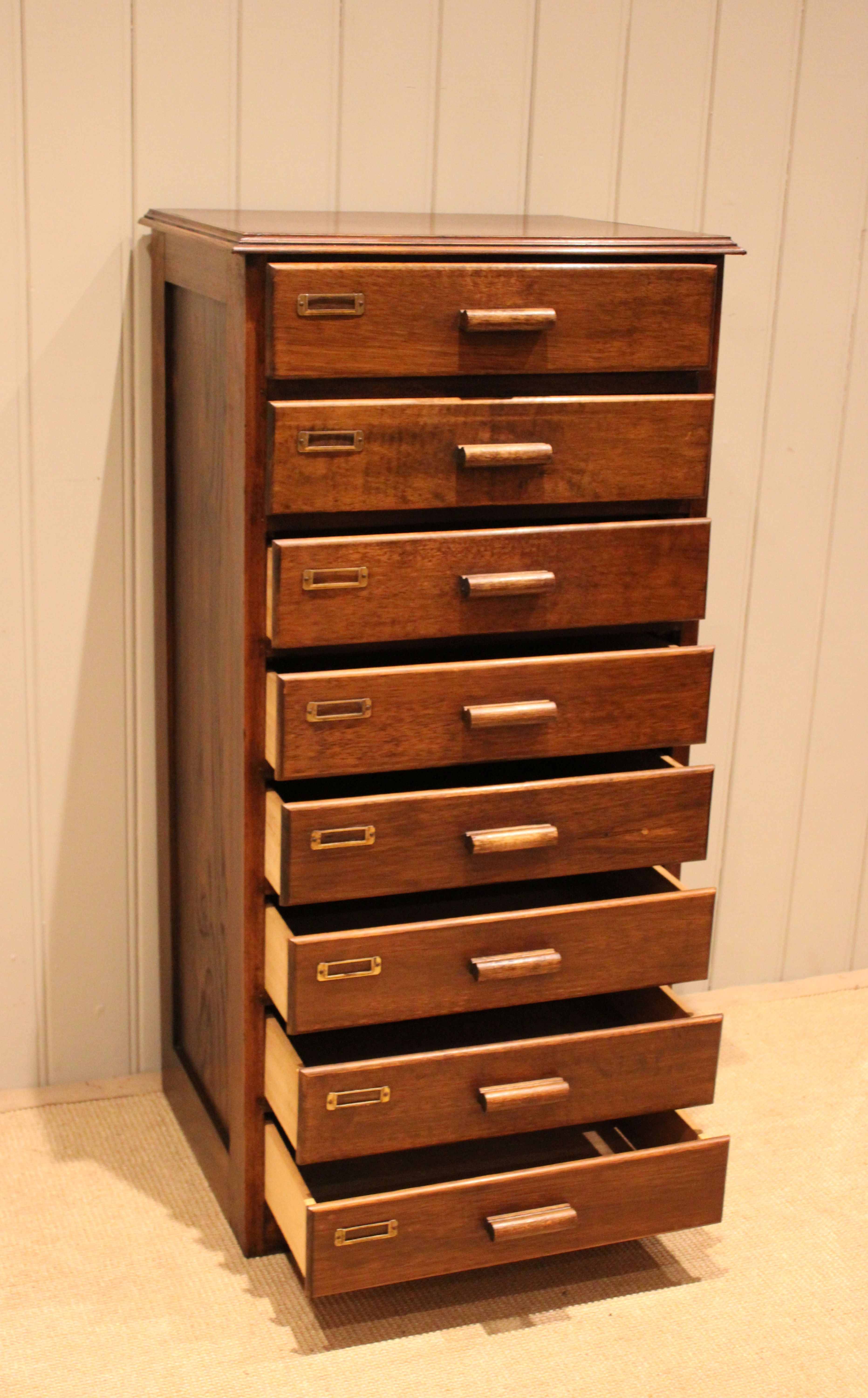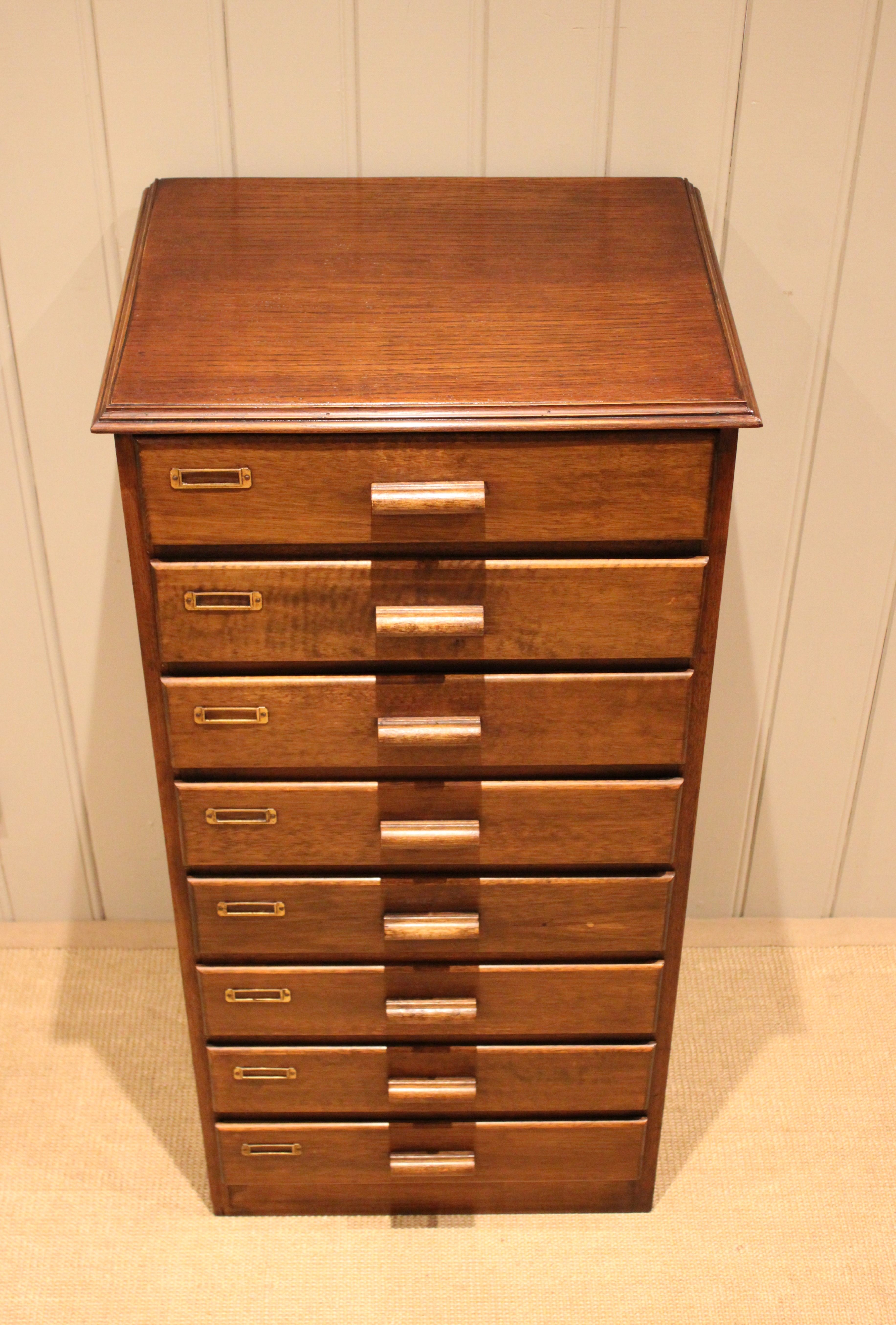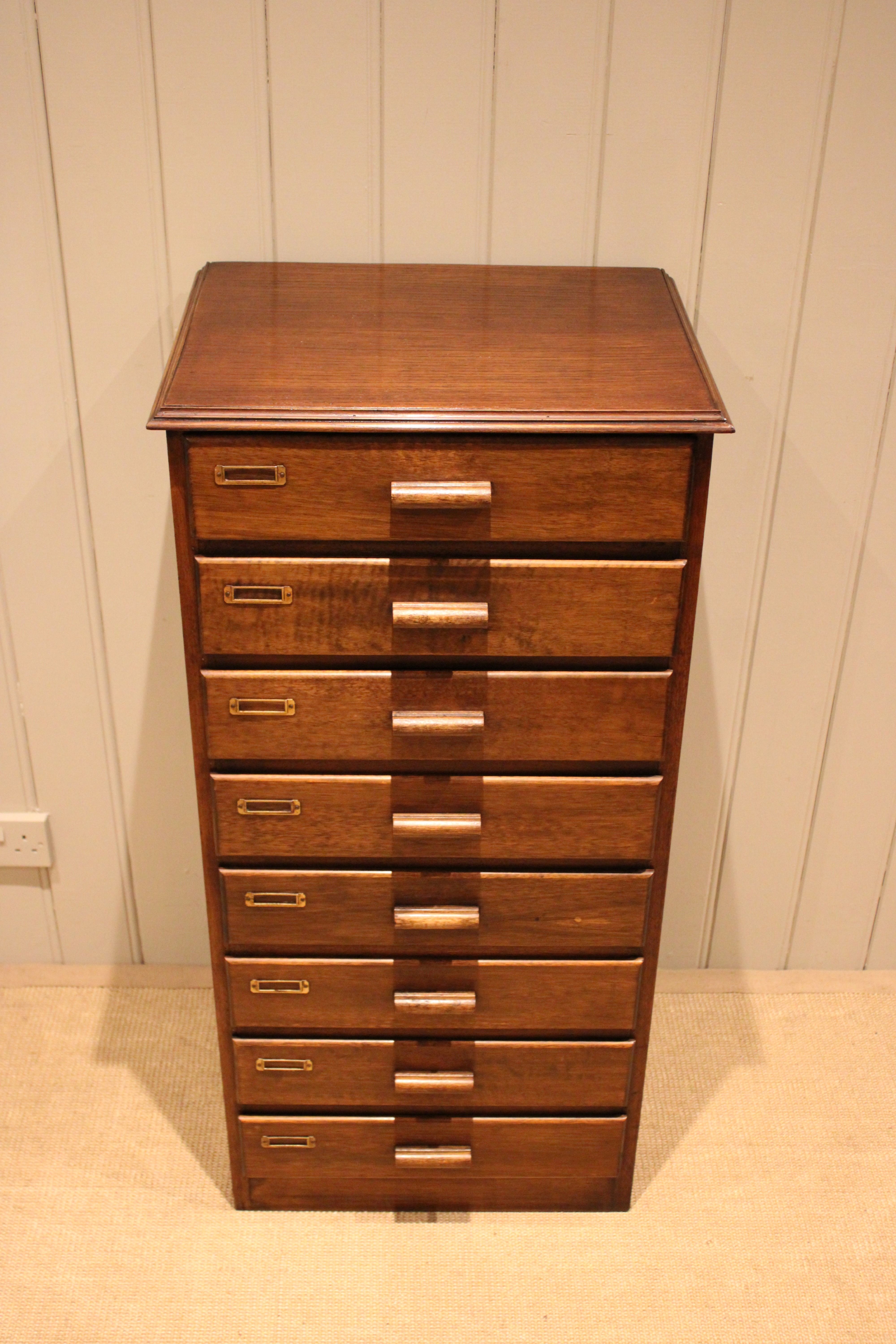 Tall oak chest of eight drawers having brass label inserts to the front , with panelled sides , raised on a plinth base . The drawers are 8 cm deep .