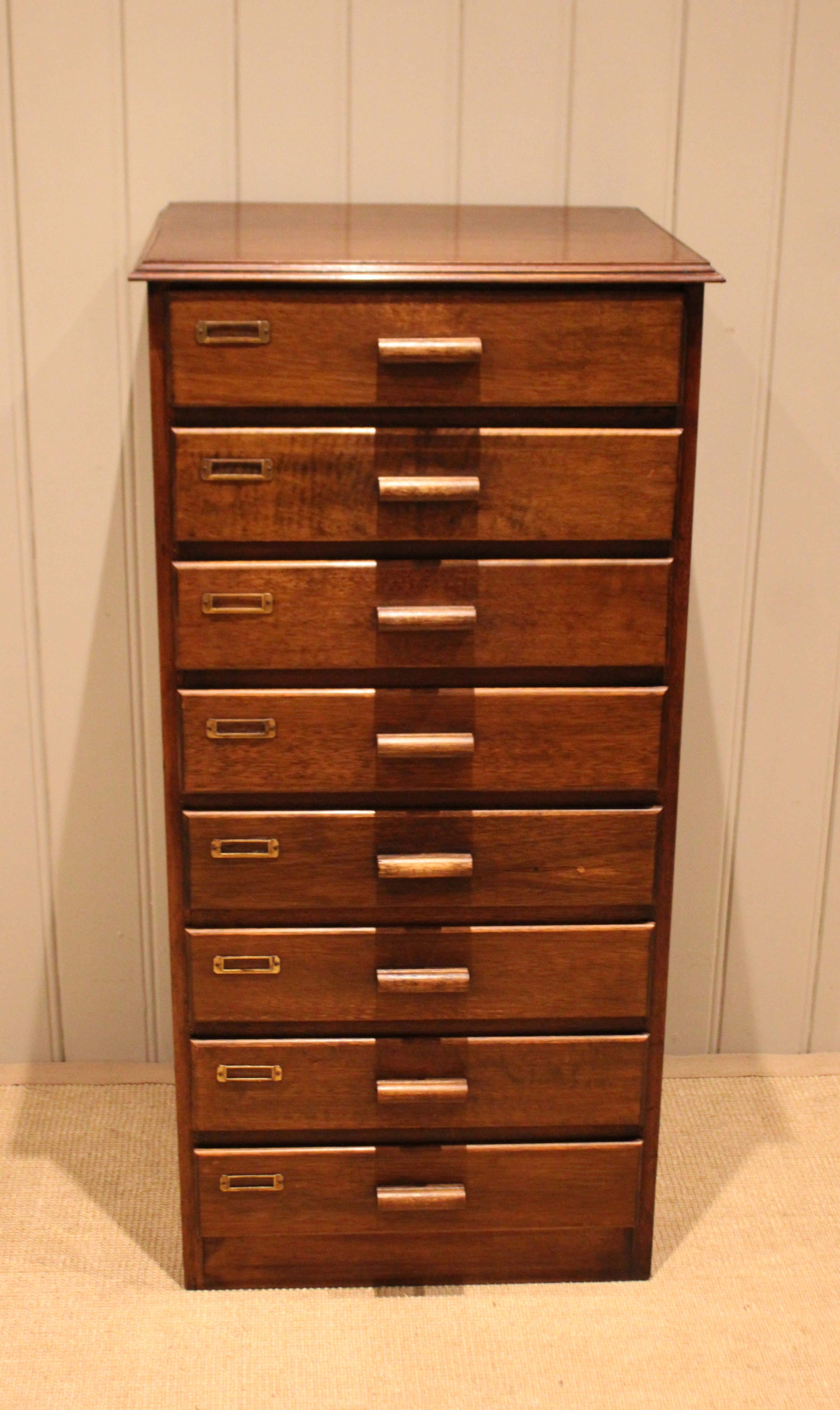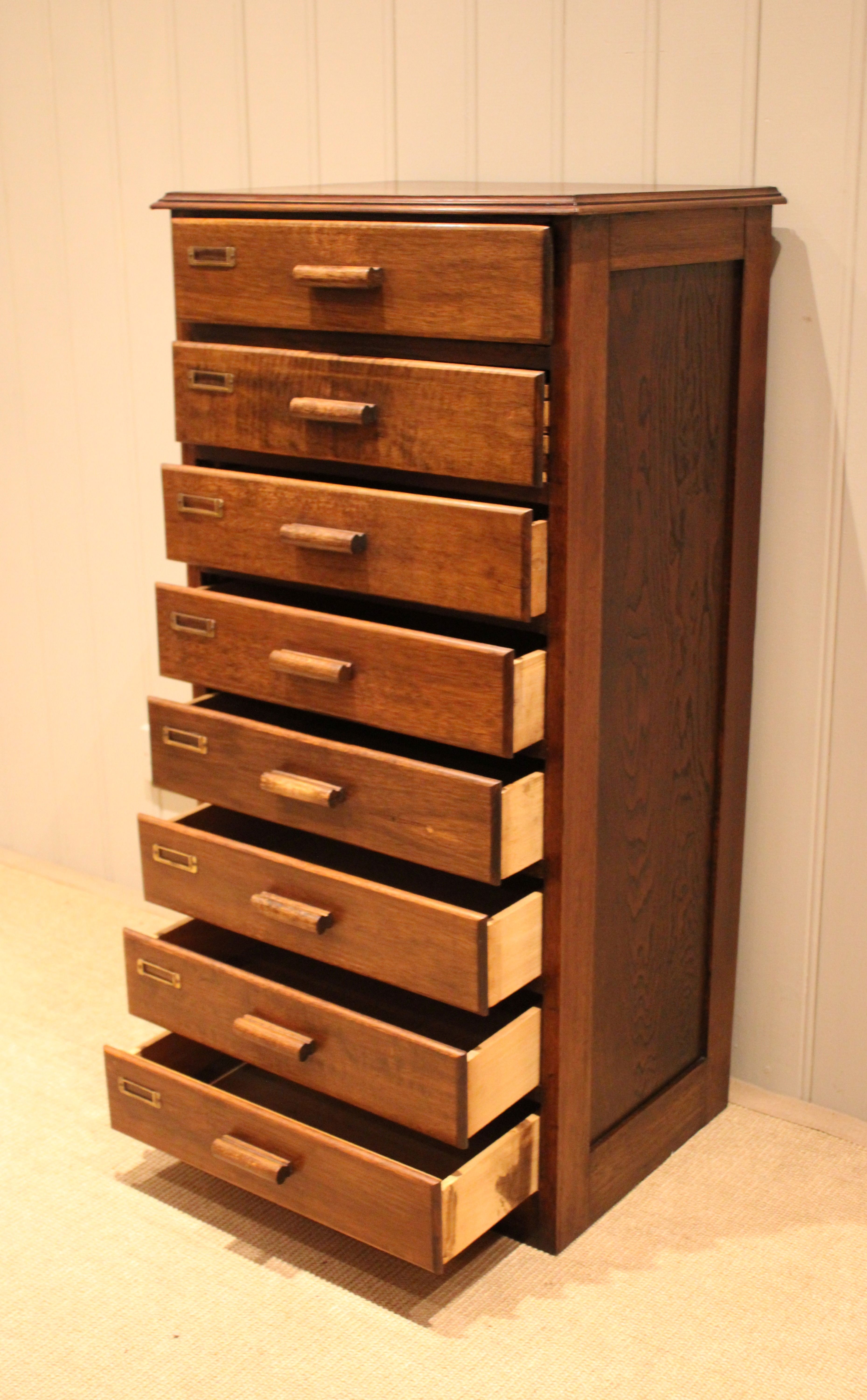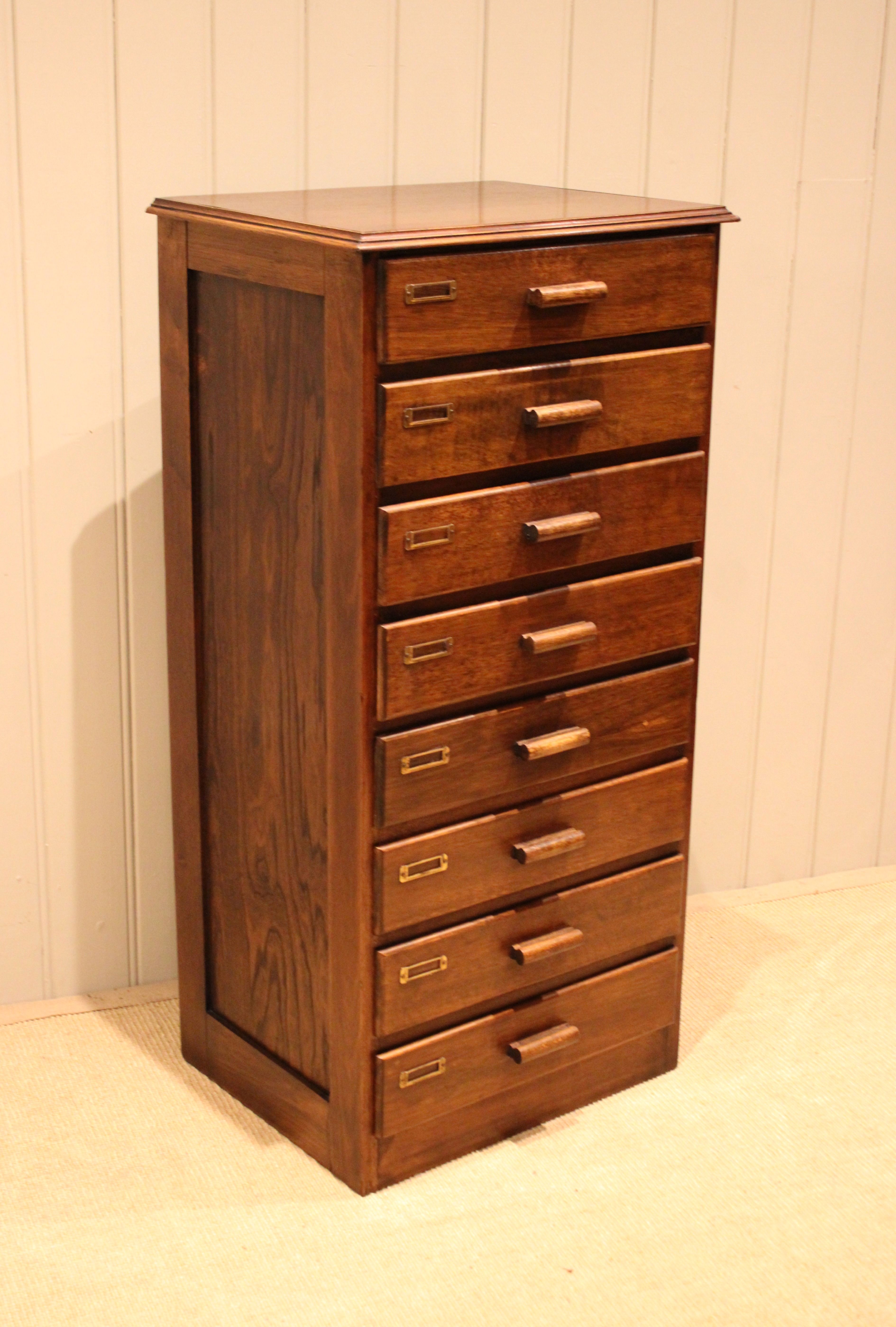 Tall oak chest of eight drawers having brass label inserts to the front , with panelled sides , raised on a plinth base . The drawers are 8 cm deep .