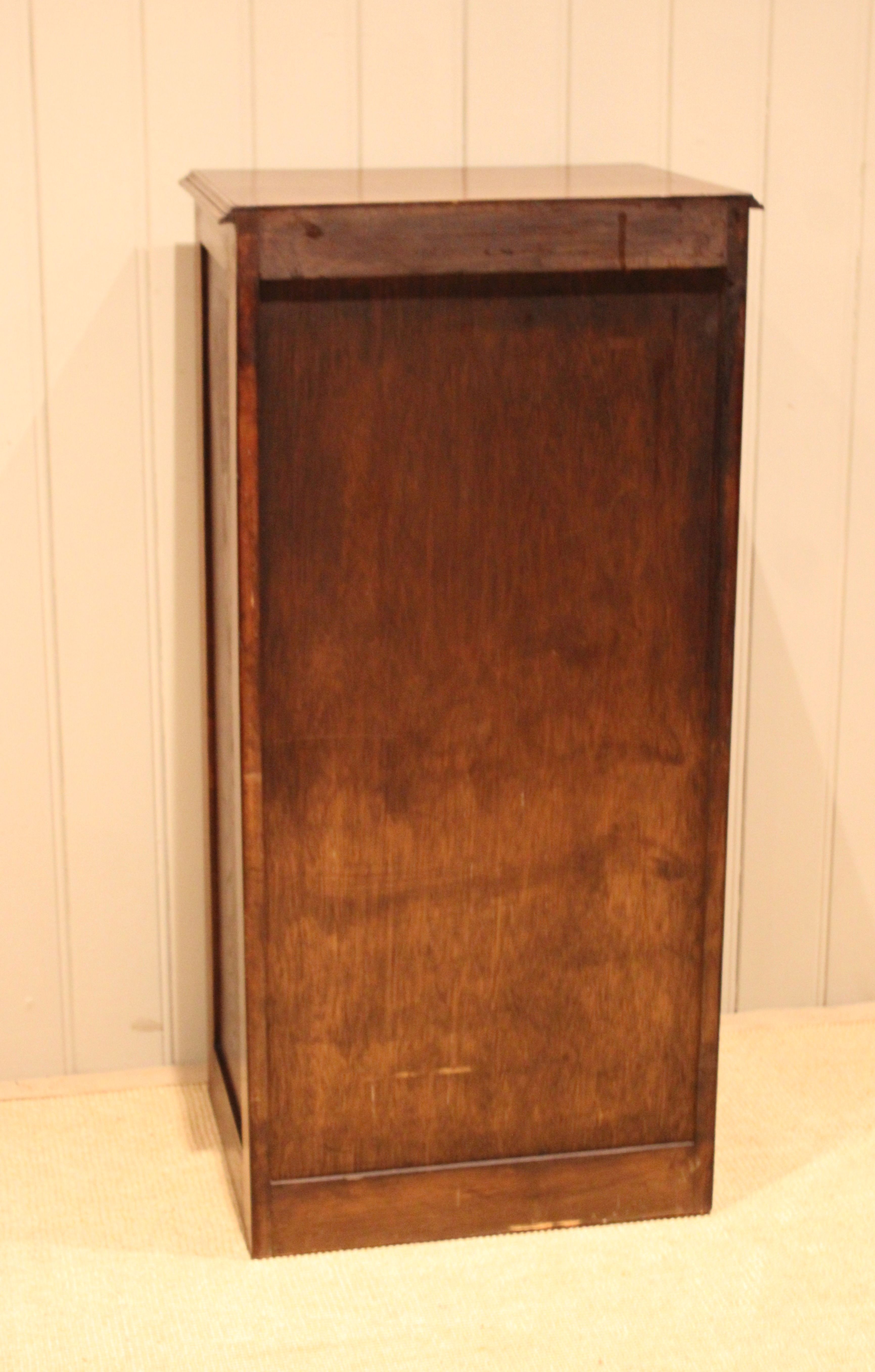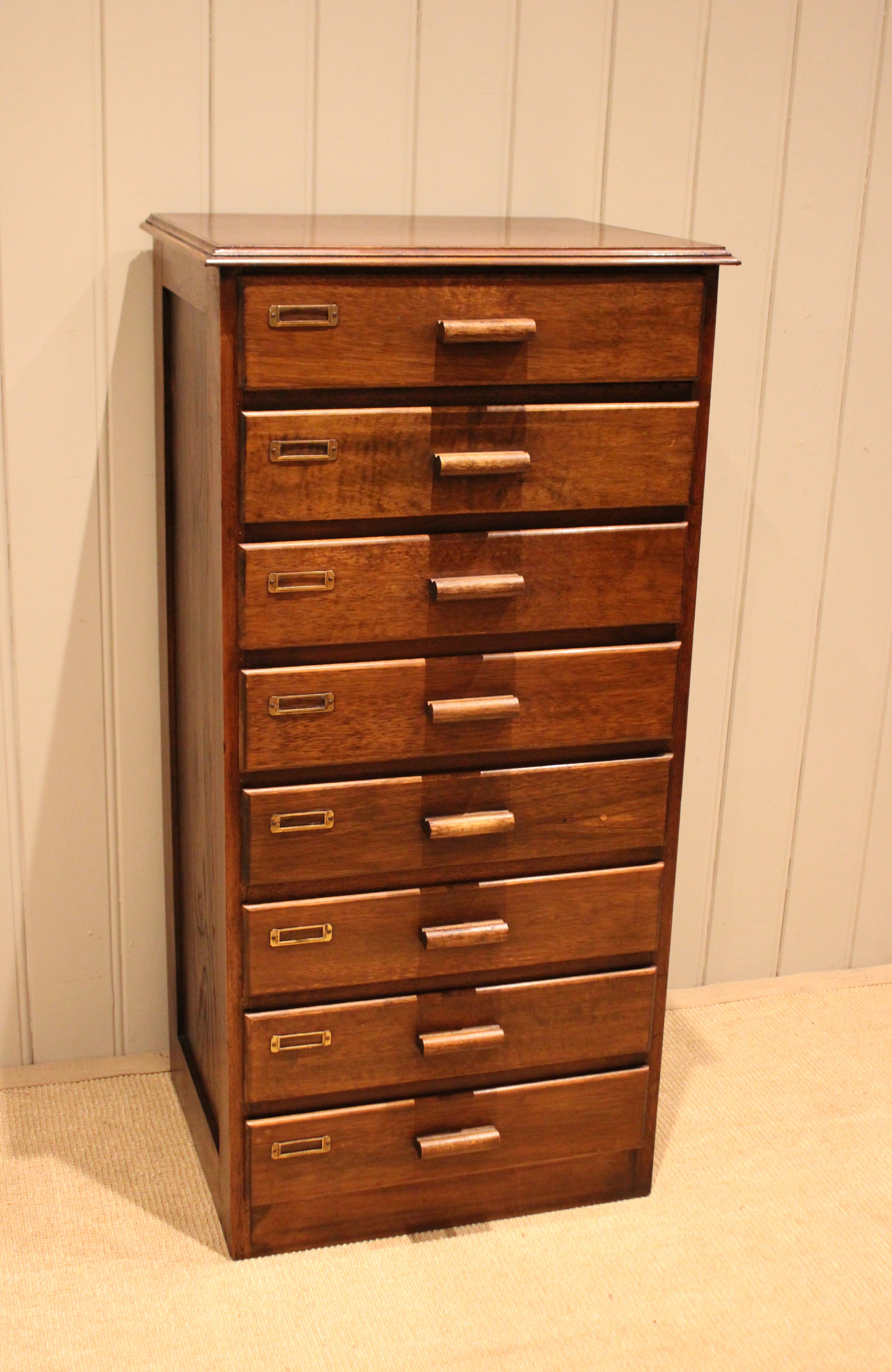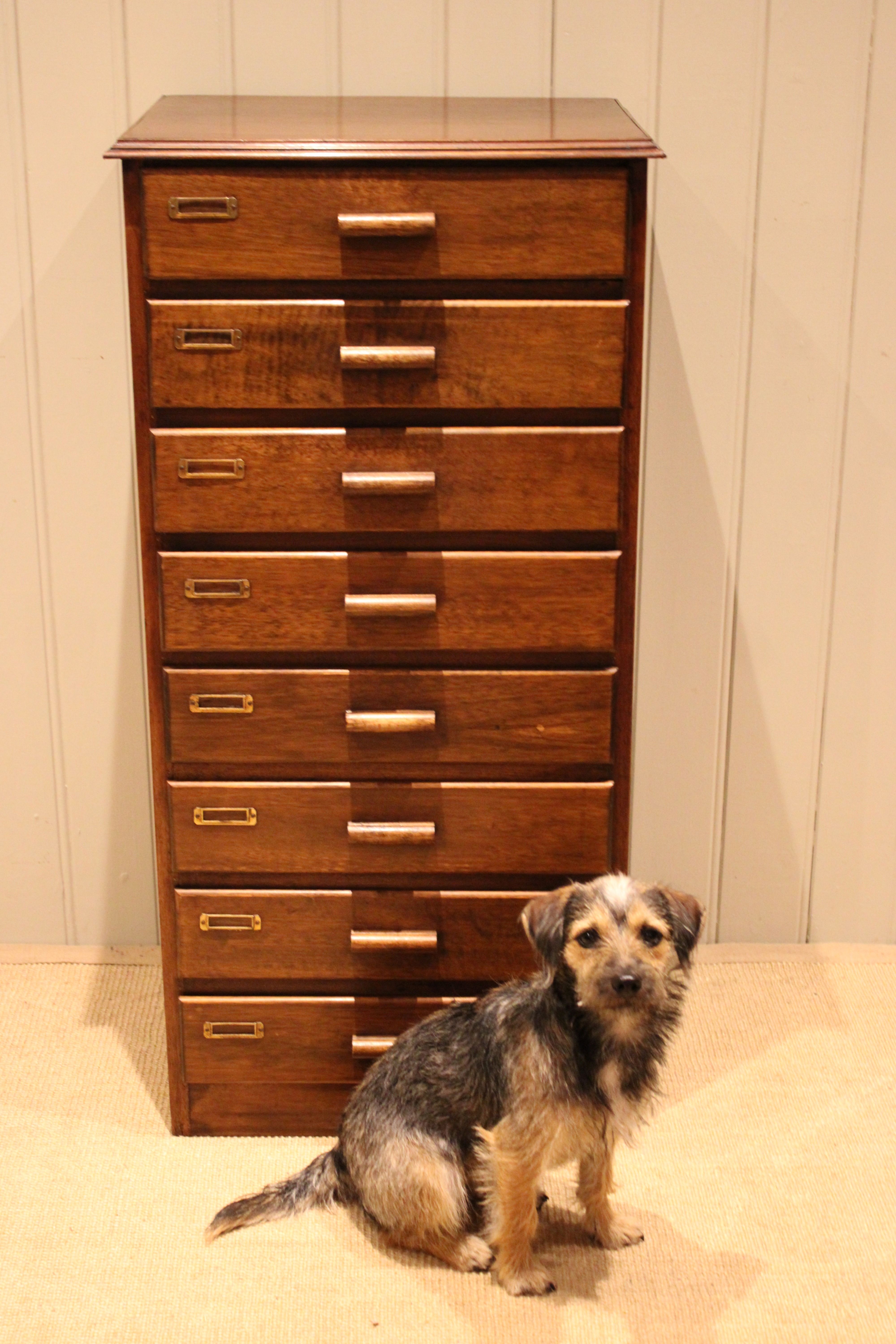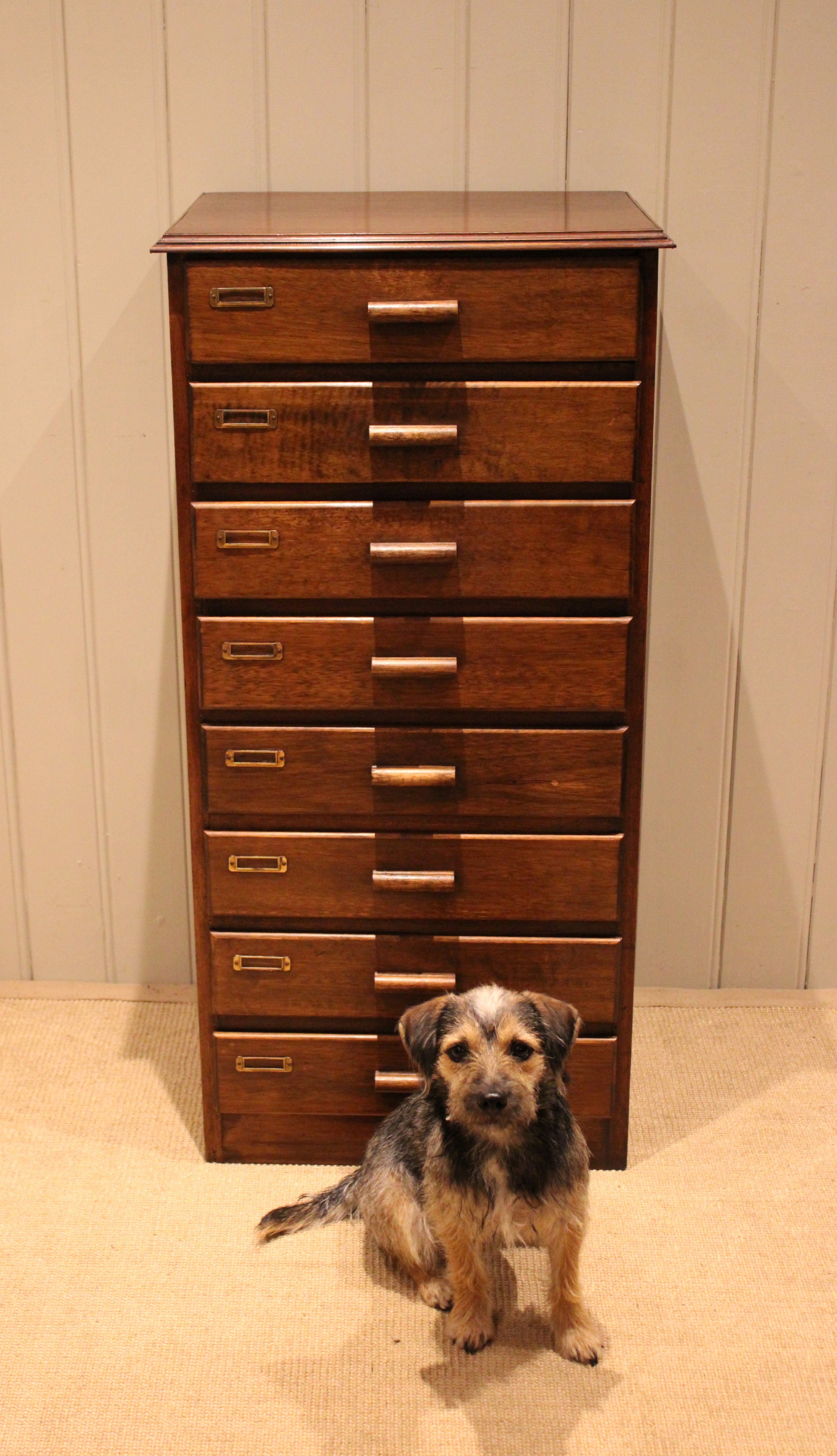 Tall oak chest of eight drawers having brass label inserts to the front , with panelled sides , raised on a plinth base . The drawers are 8 cm deep .
