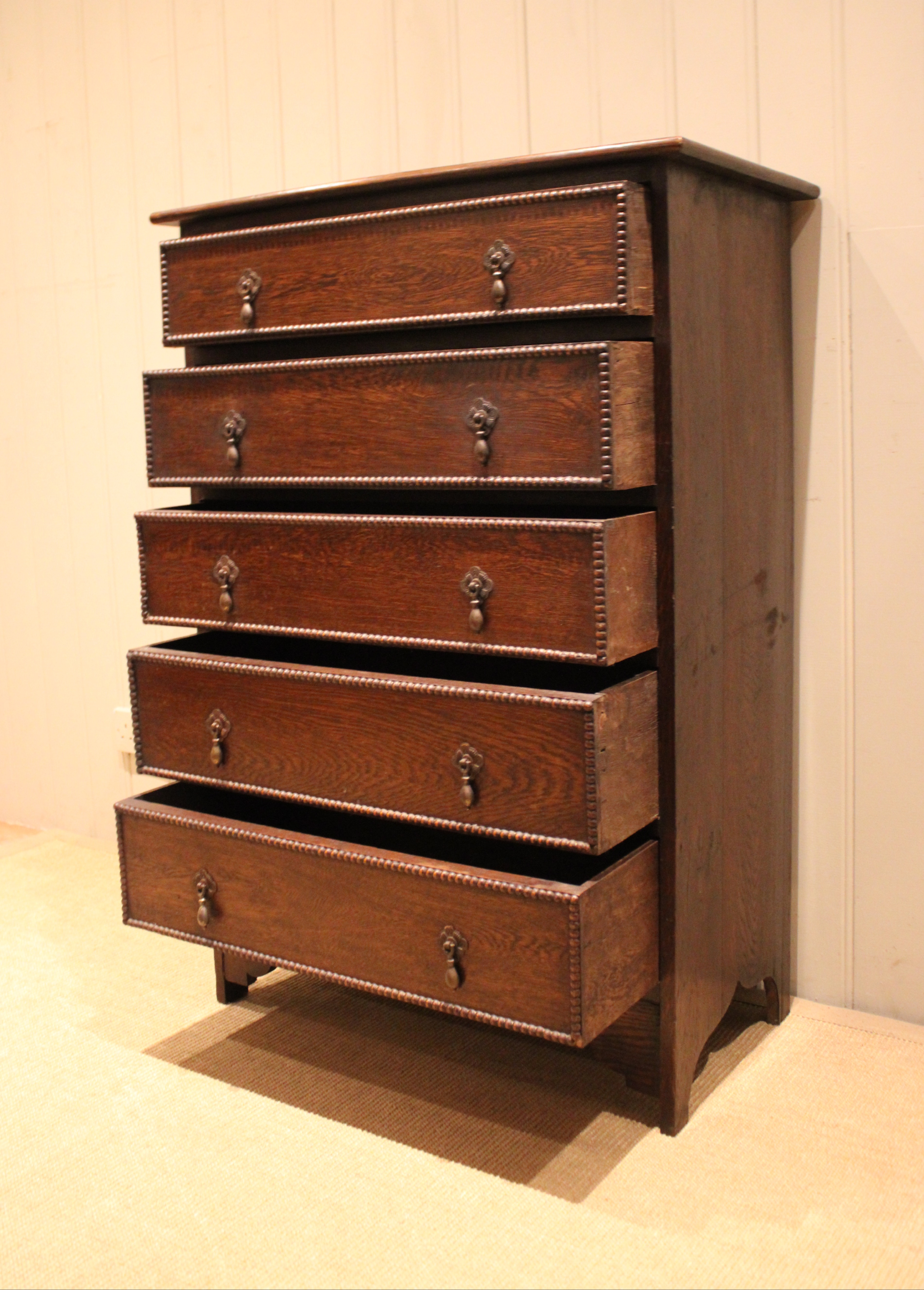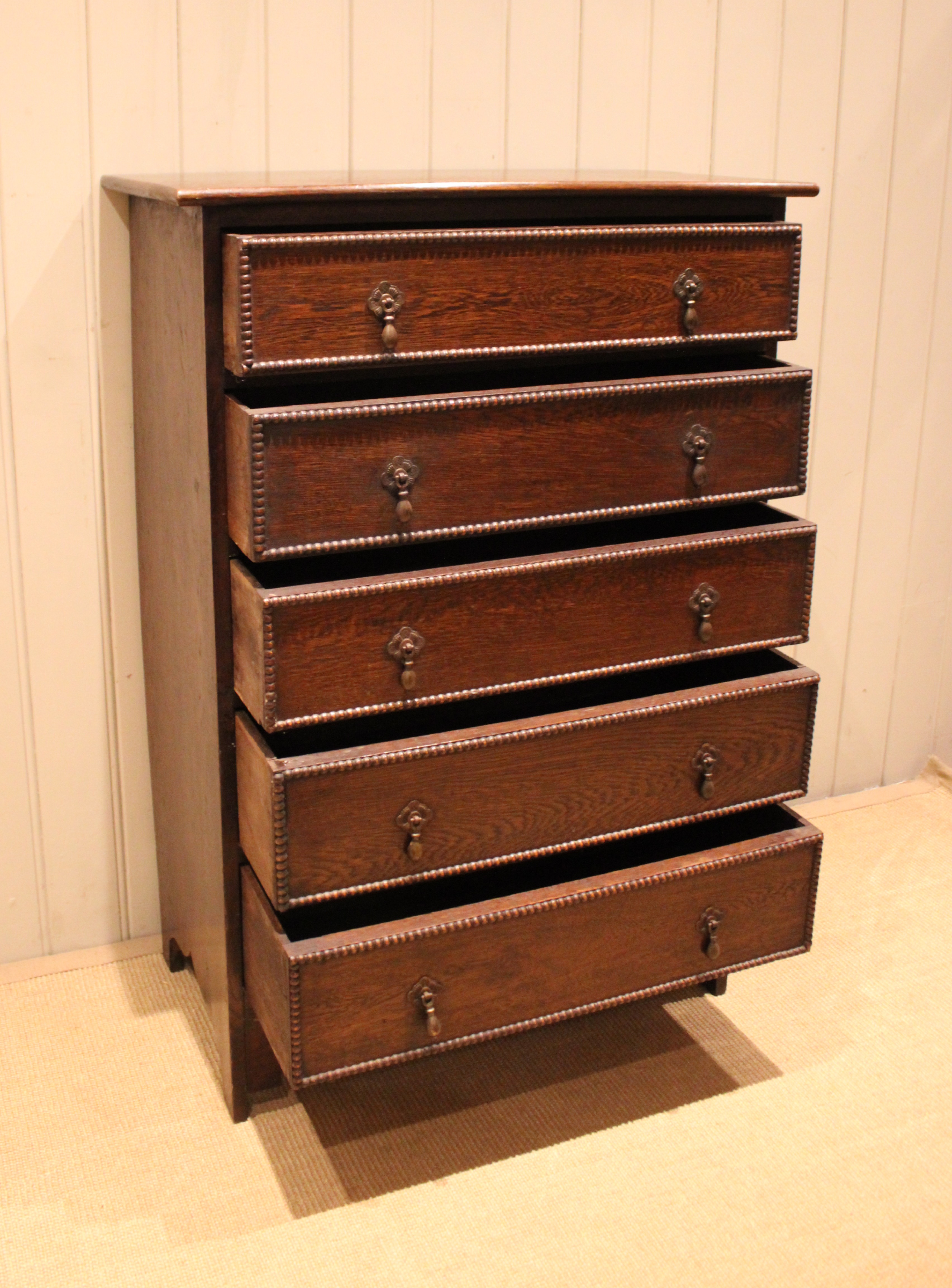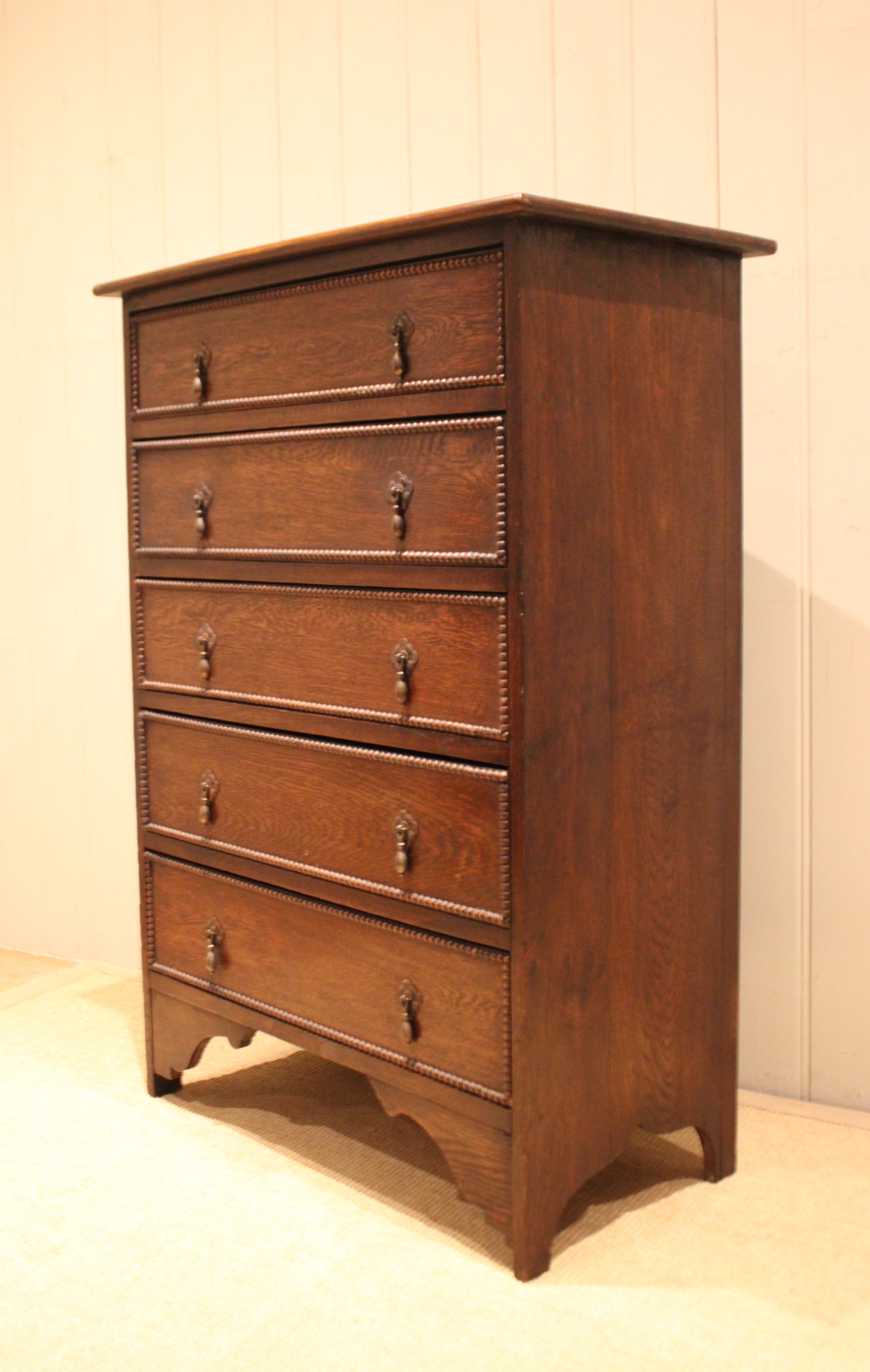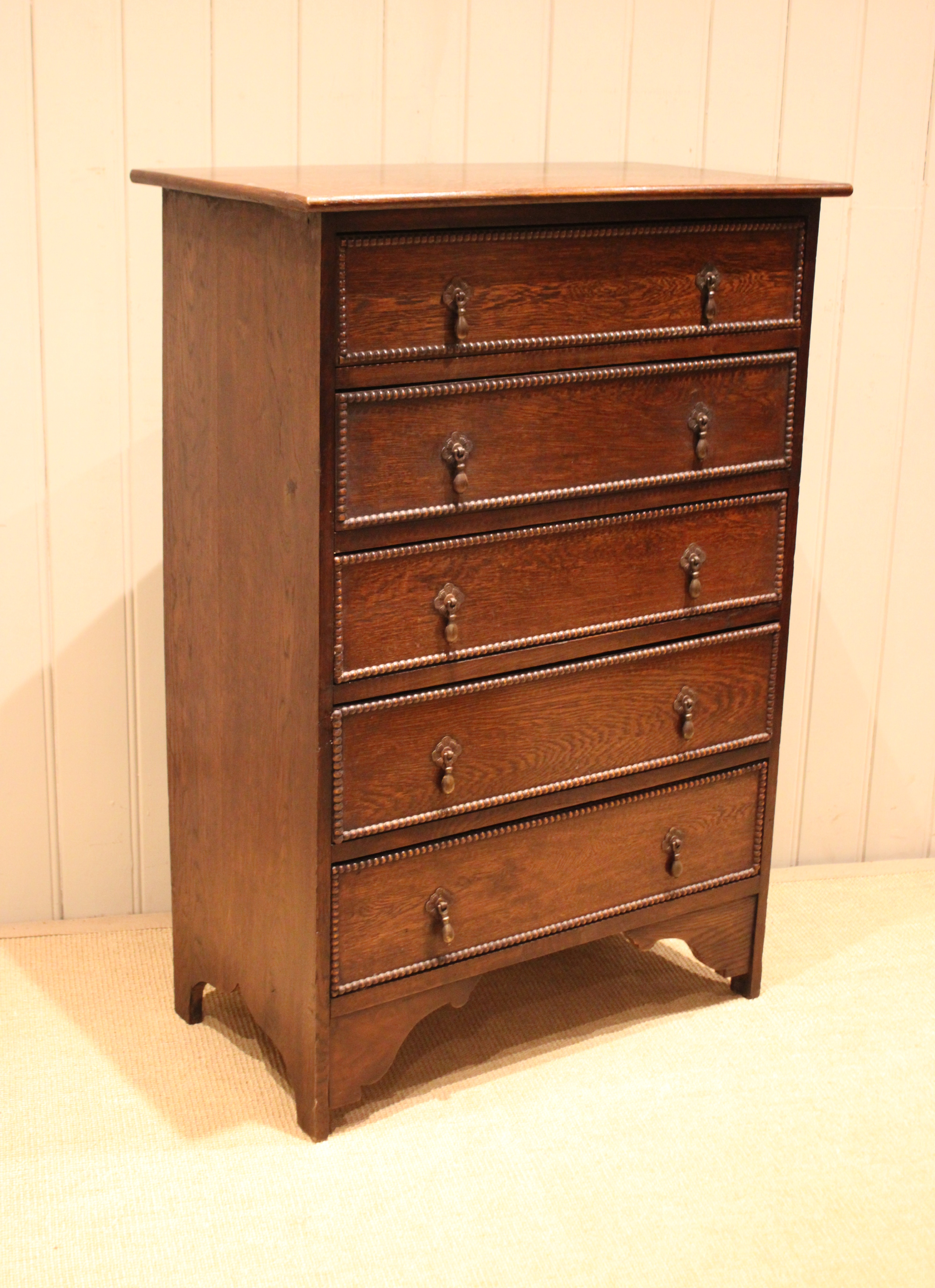 Solid oak tall chest of drawers having five graduated drawers with beaded edges , raised on bracket feet. The drawer depths from the bottom up are 15cm,15 cm, 13 cm ,13 cm ,and at the top 12 cm .