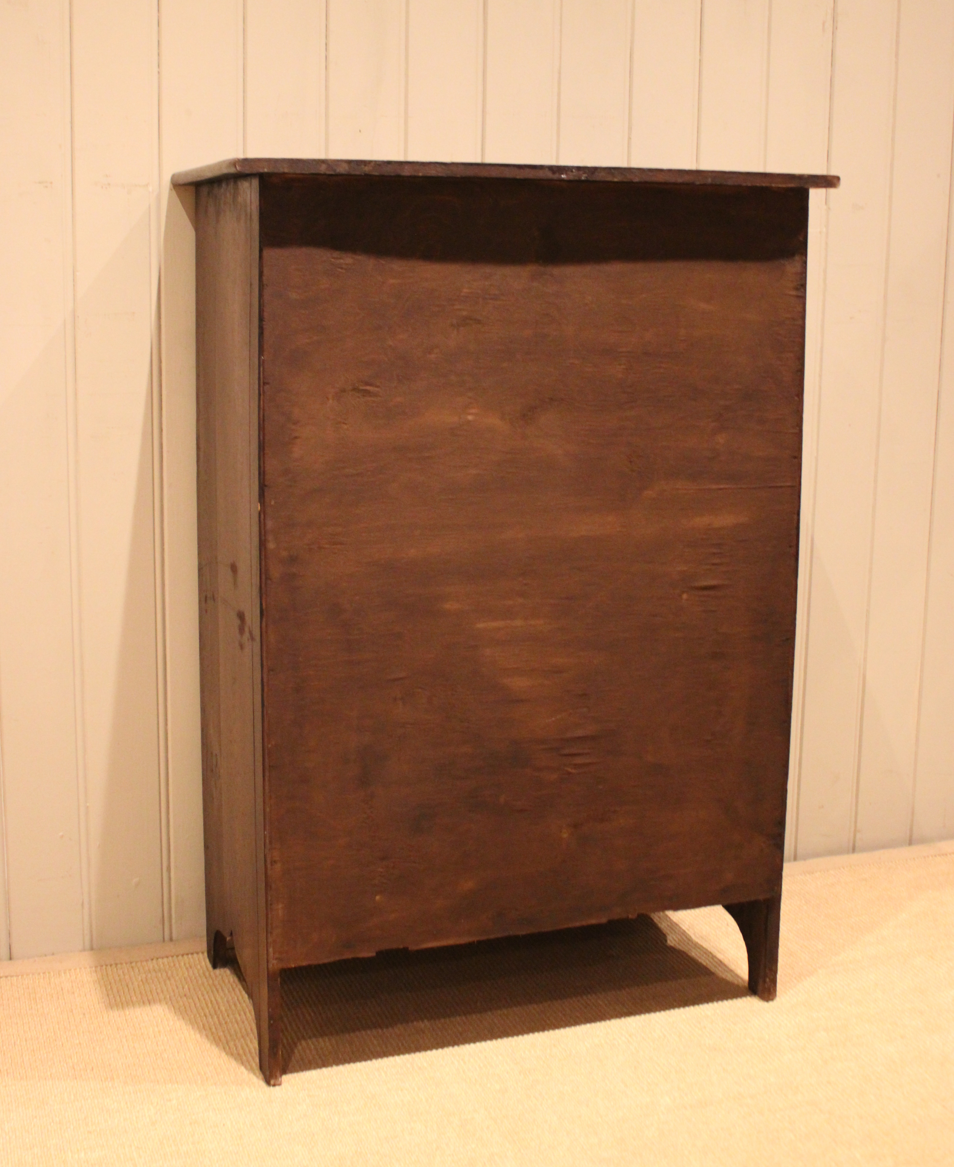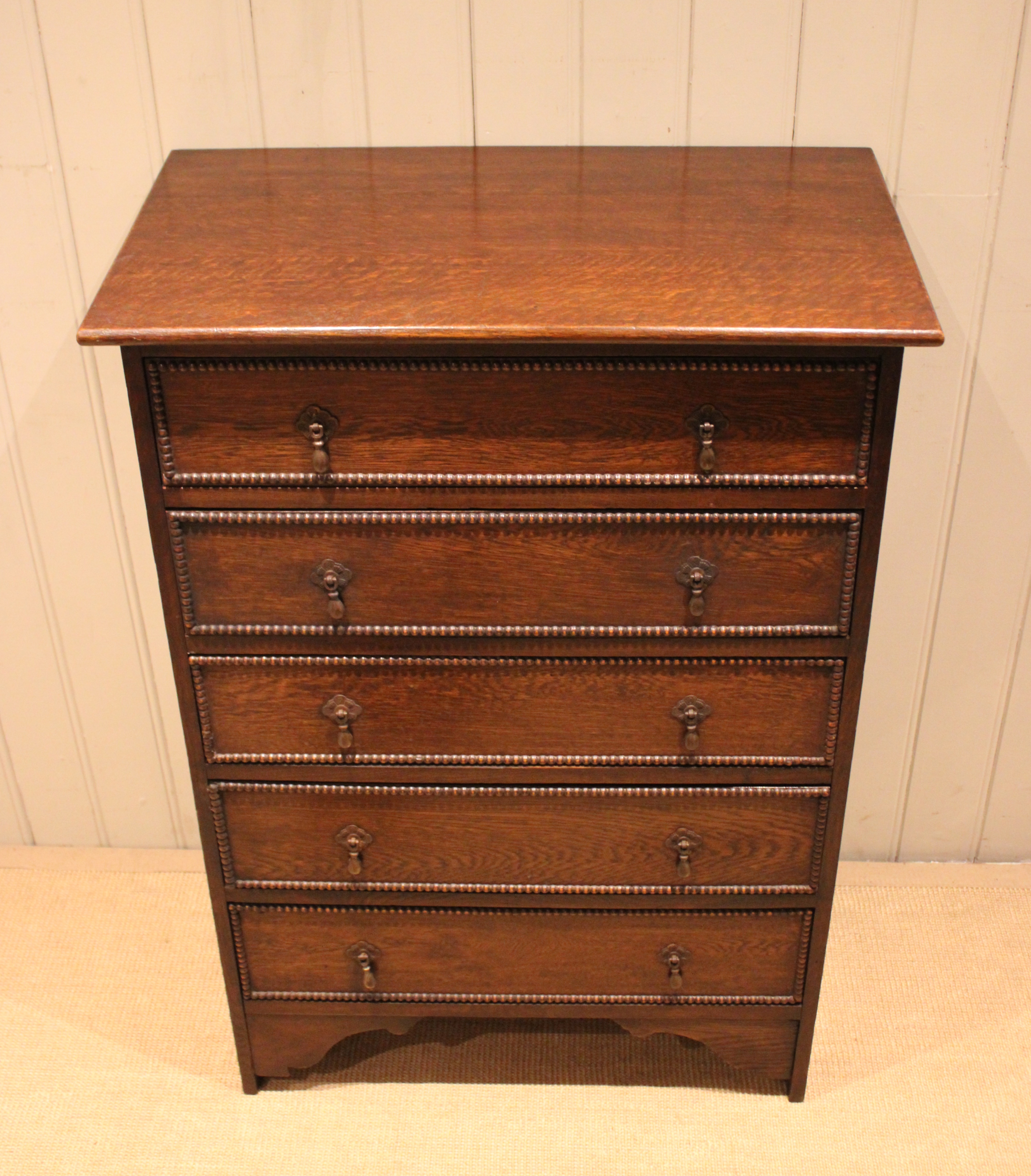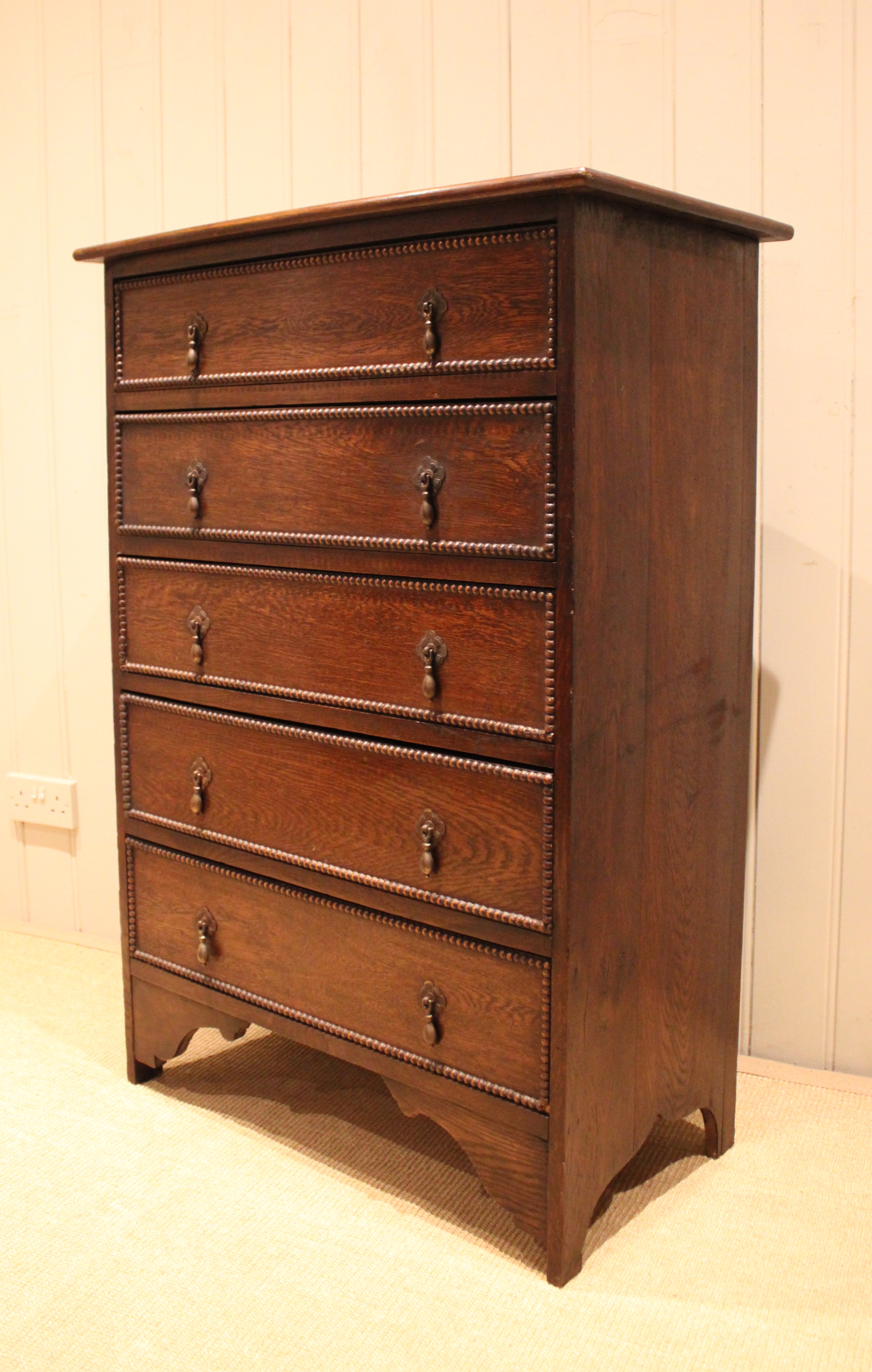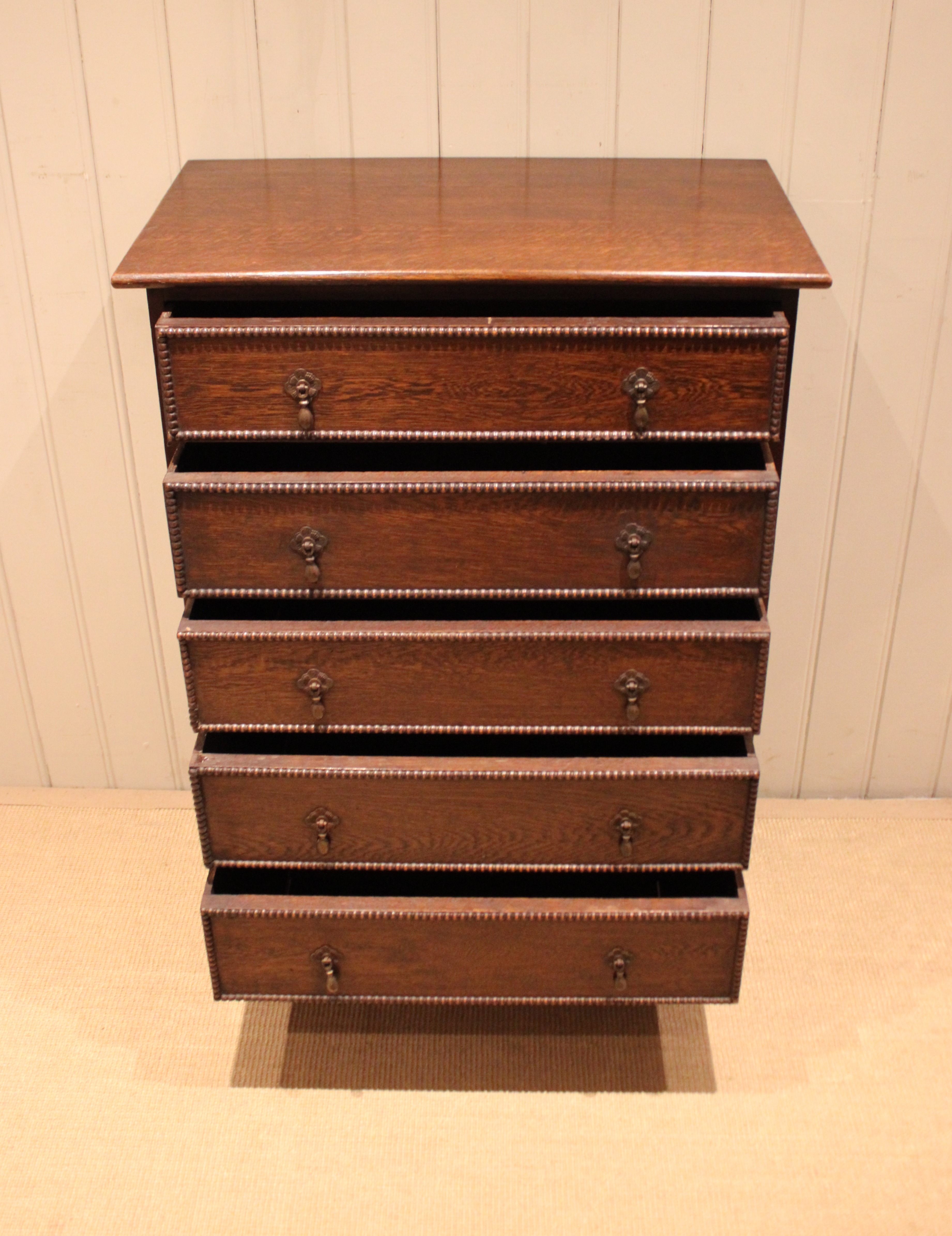 Solid oak tall chest of drawers having five graduated drawers with beaded edges , raised on bracket feet. The drawer depths from the bottom up are 15cm,15 cm, 13 cm ,13 cm ,and at the top 12 cm .
