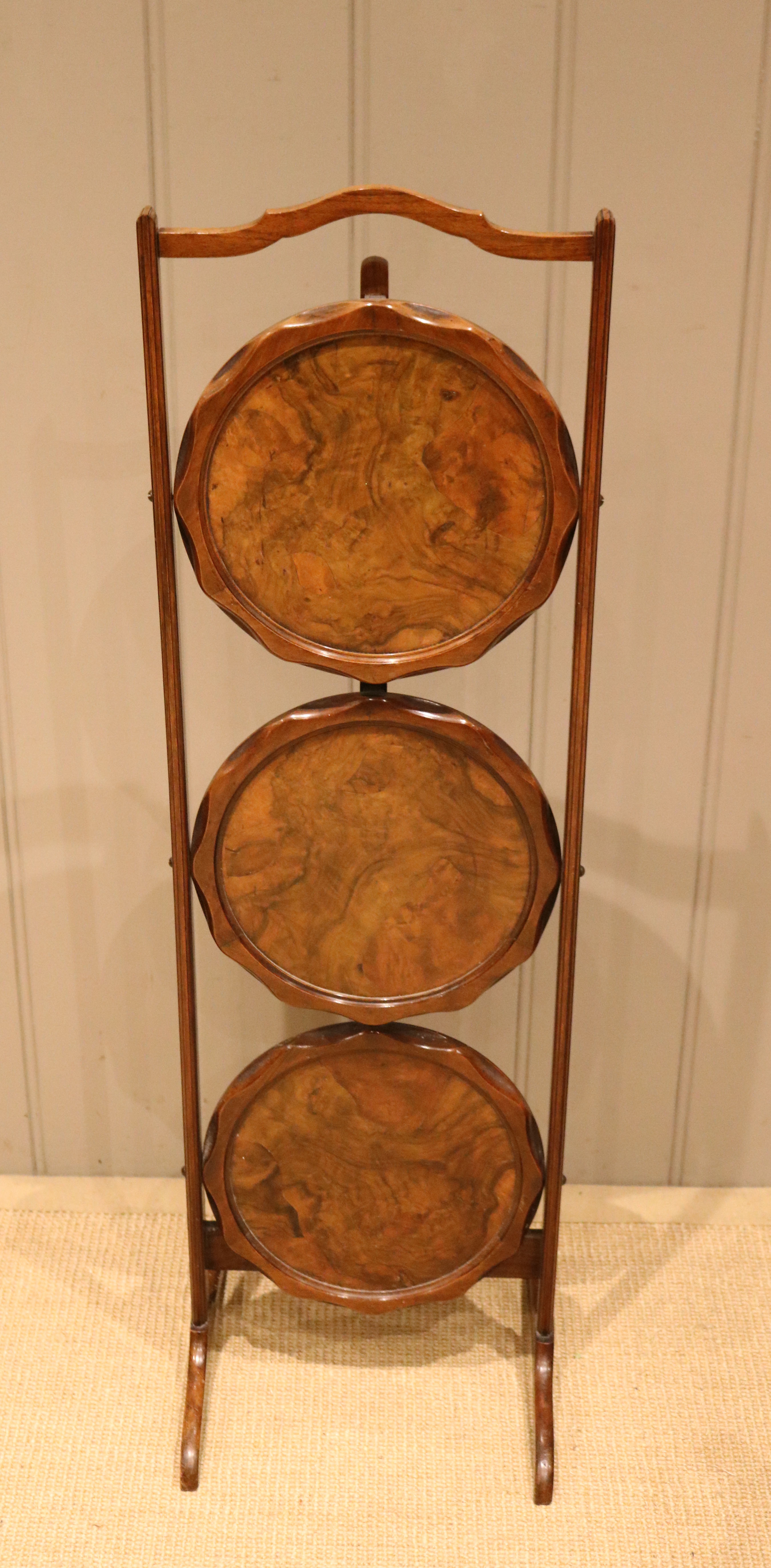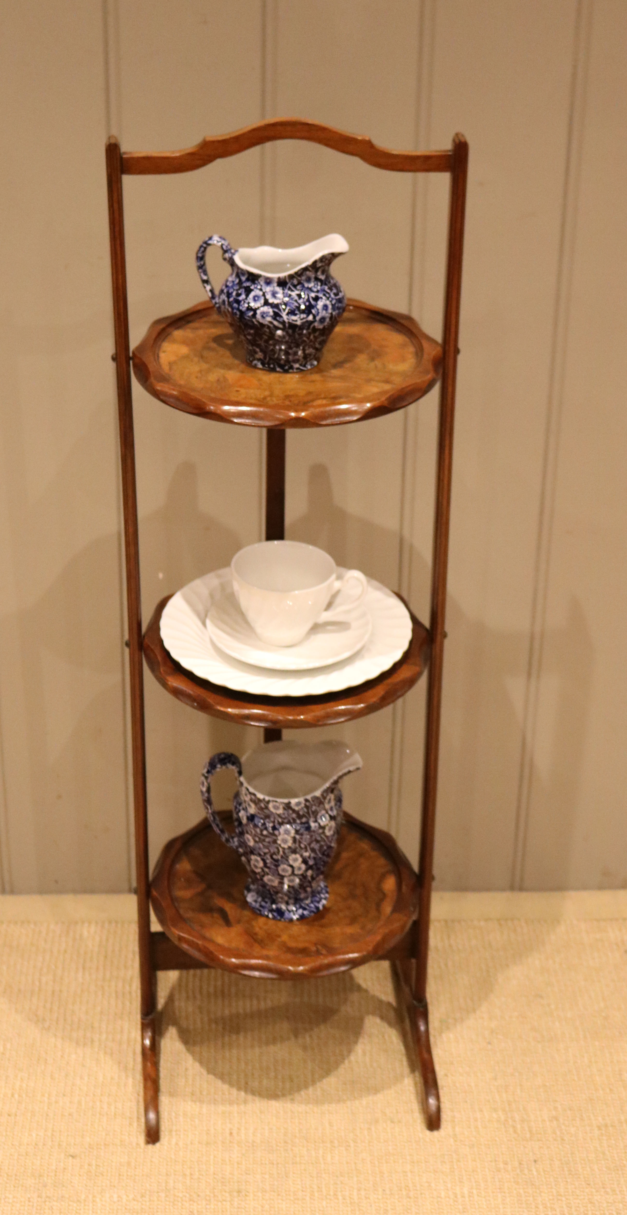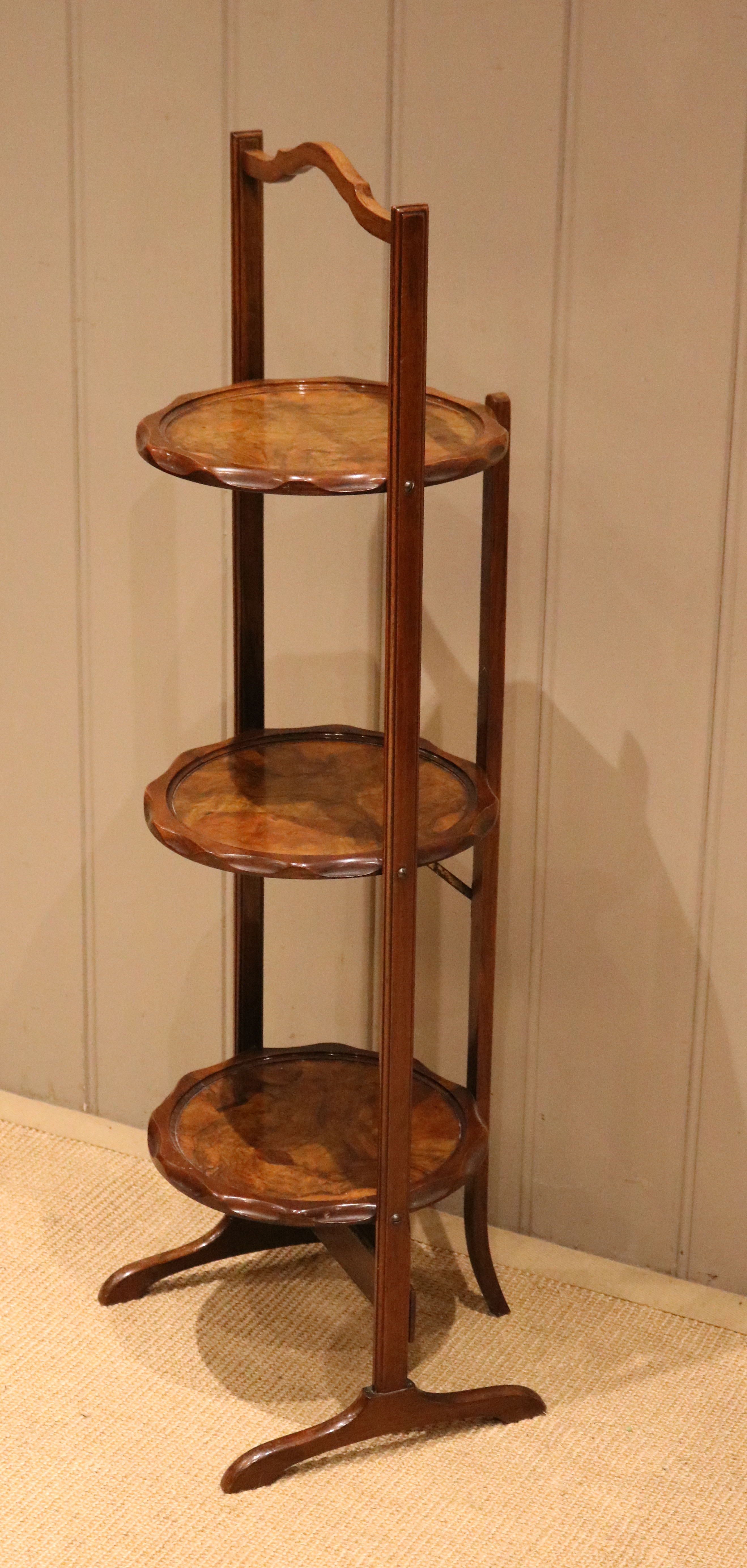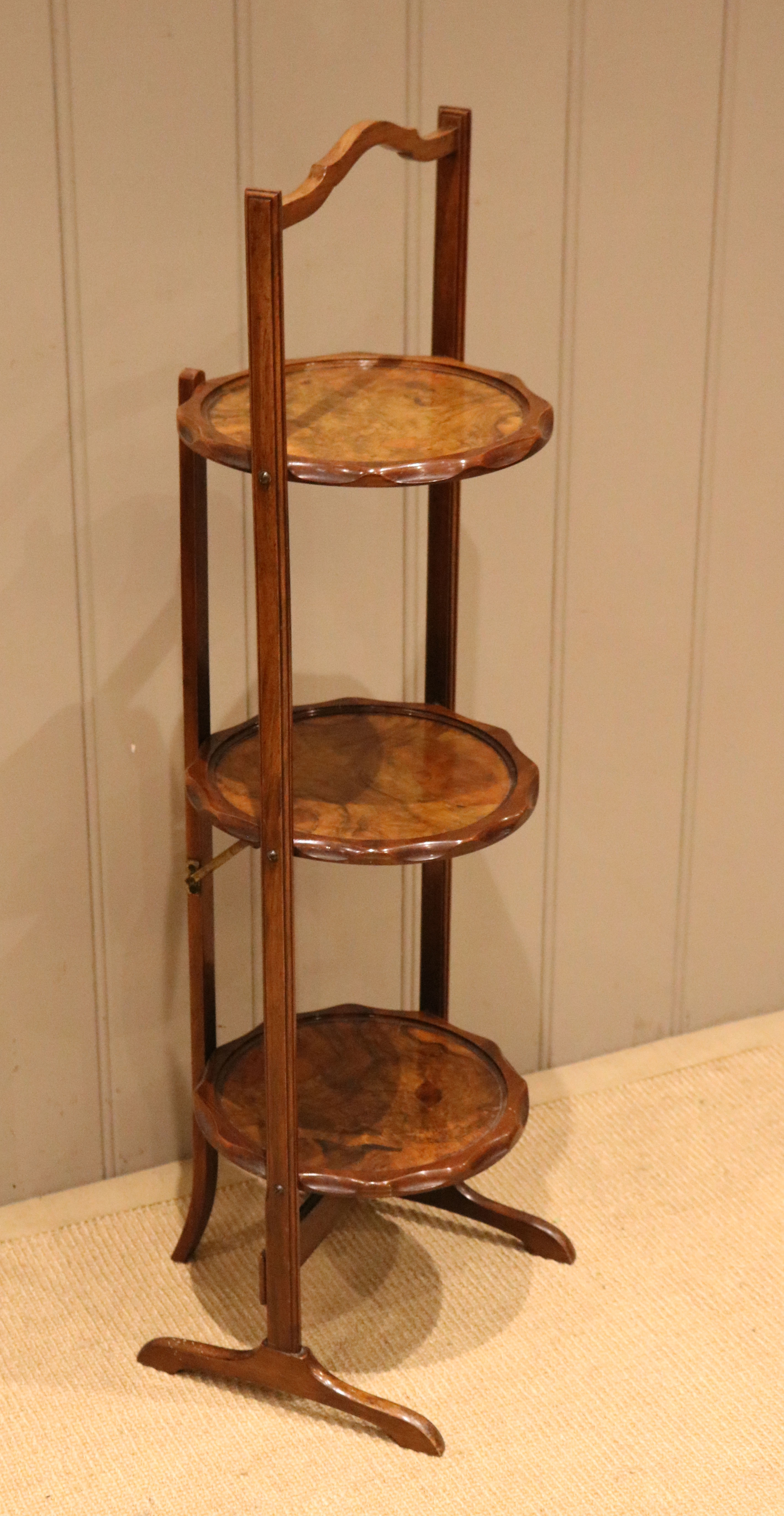 Walnut three tier cake stand having a folding mechanism and carrying handle.