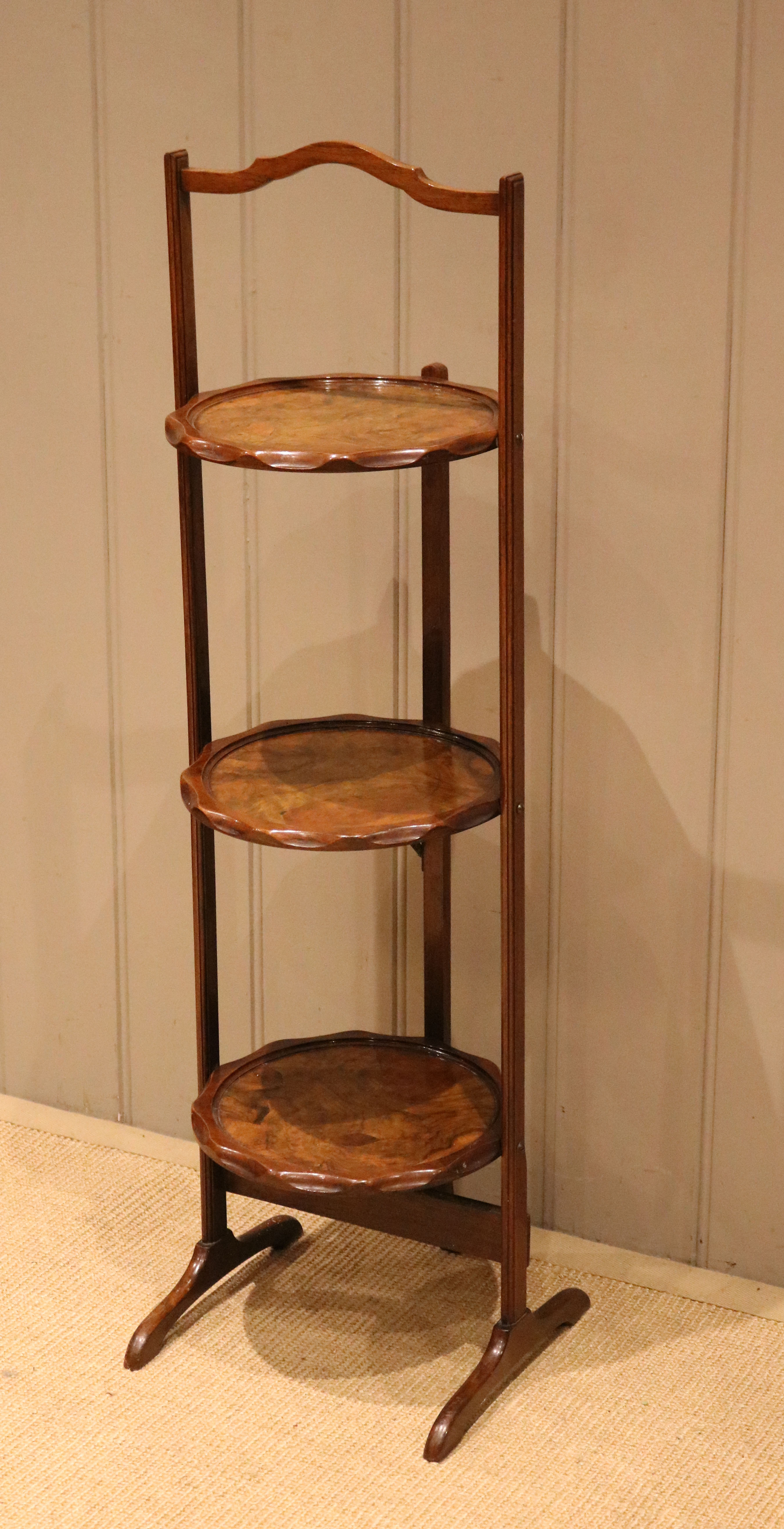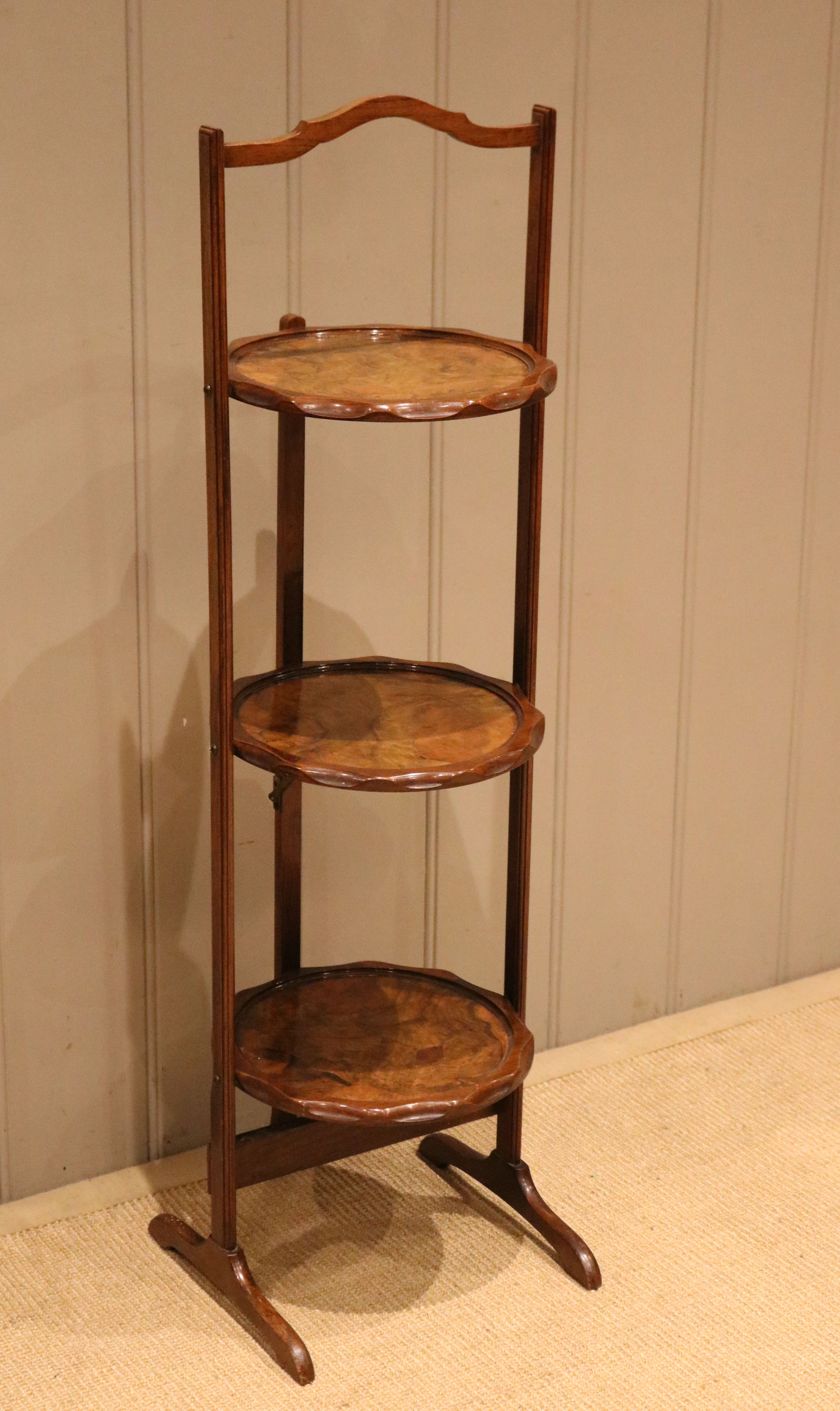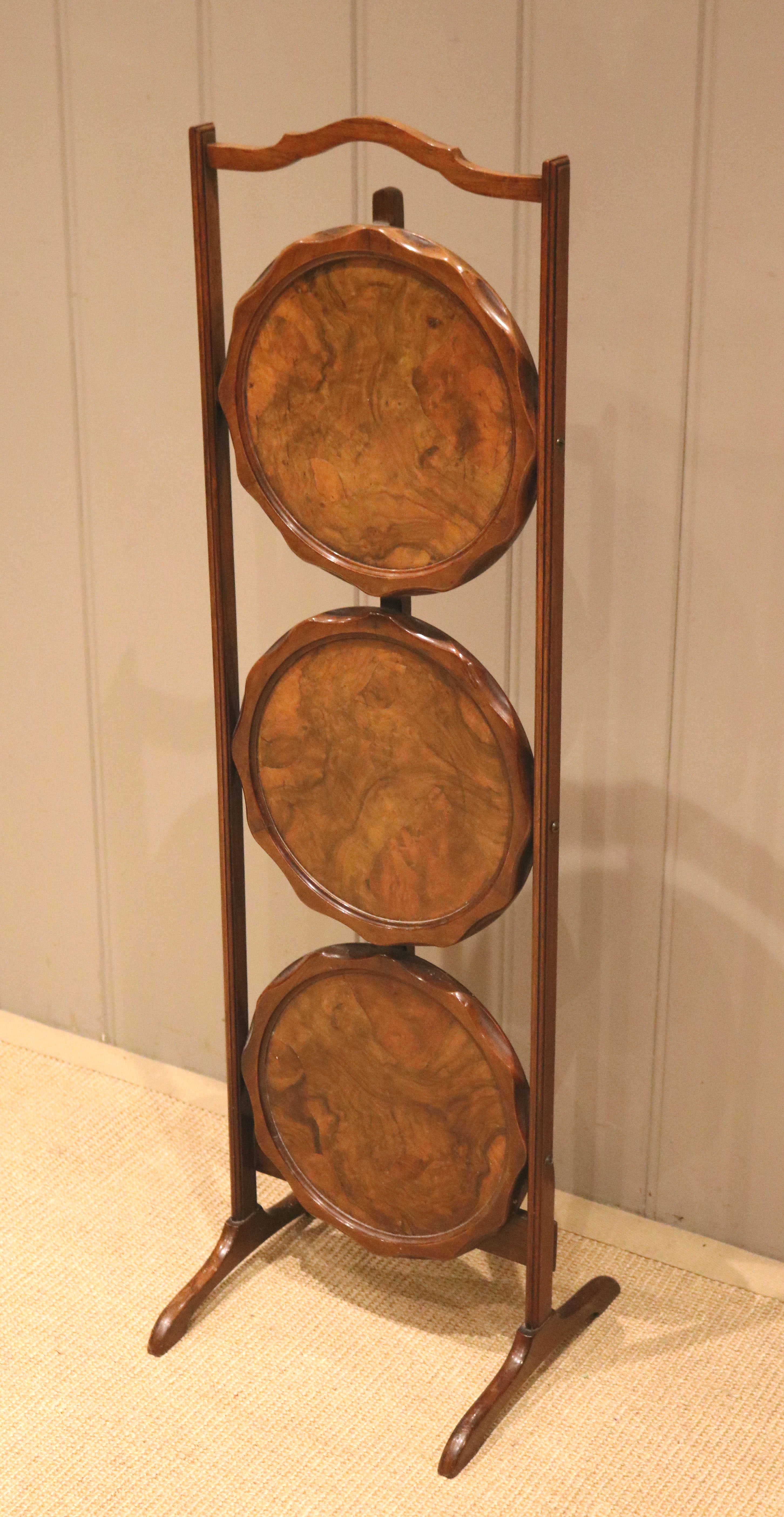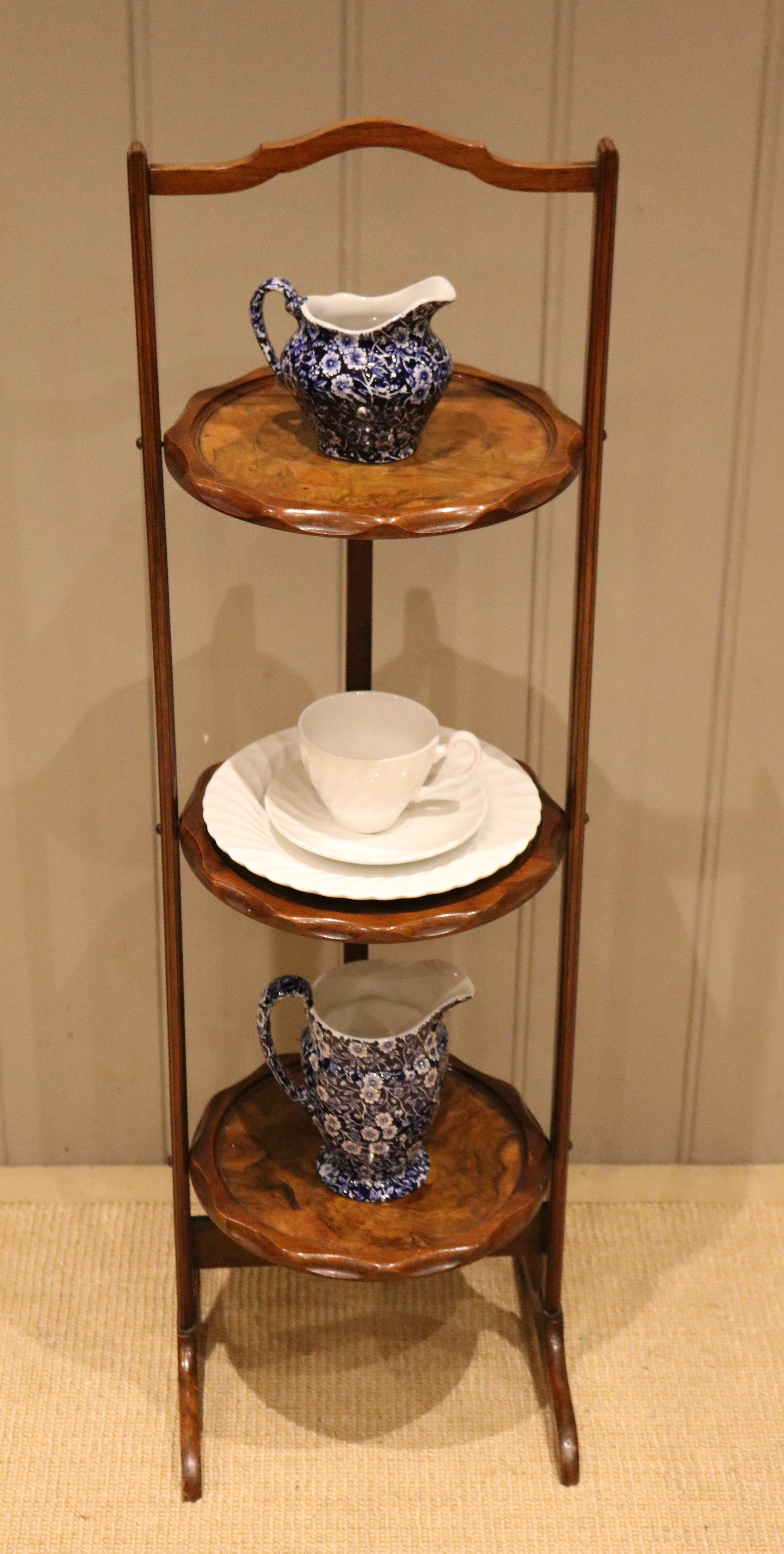 Walnut three tier cake stand having a folding mechanism and carrying handle.