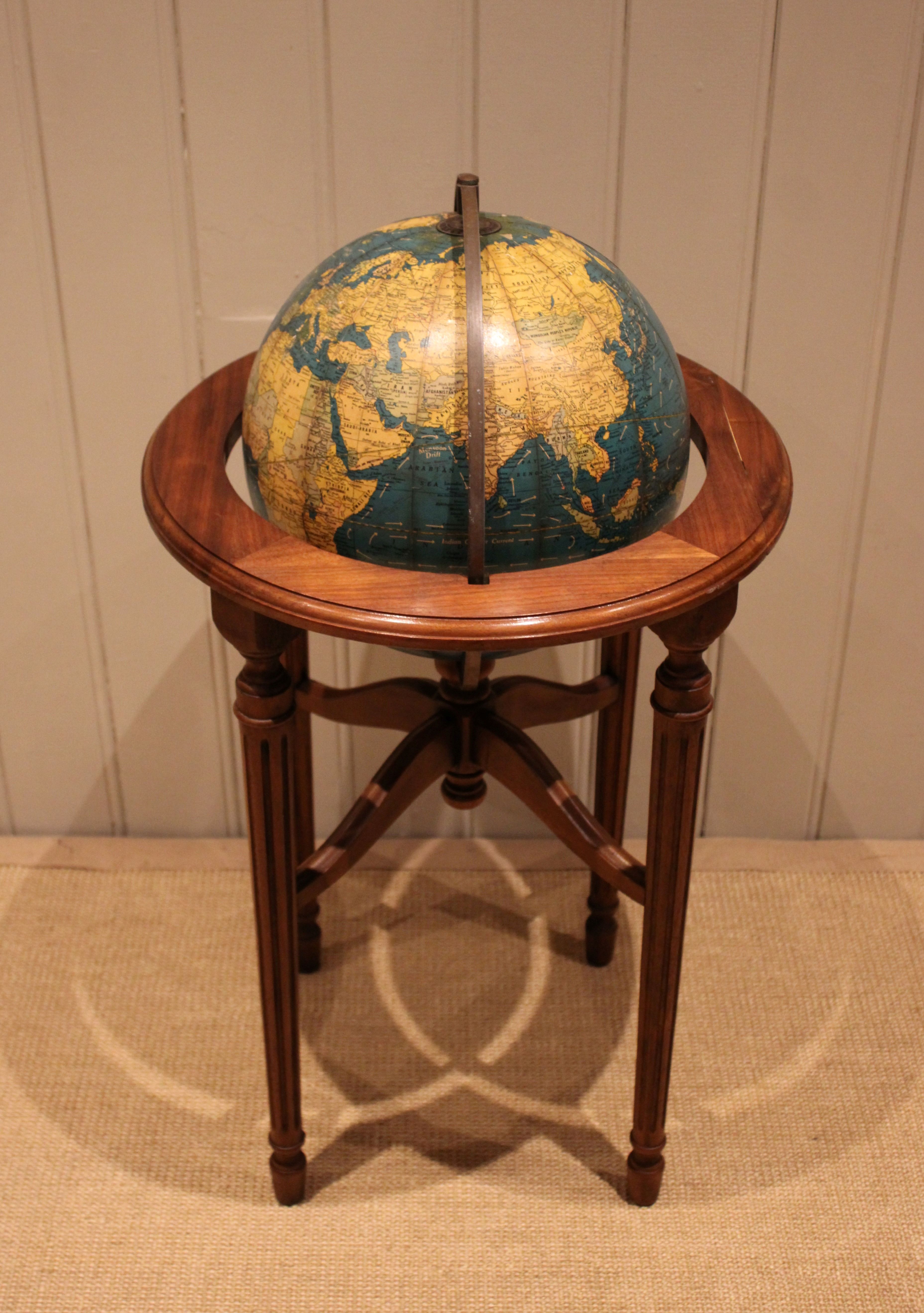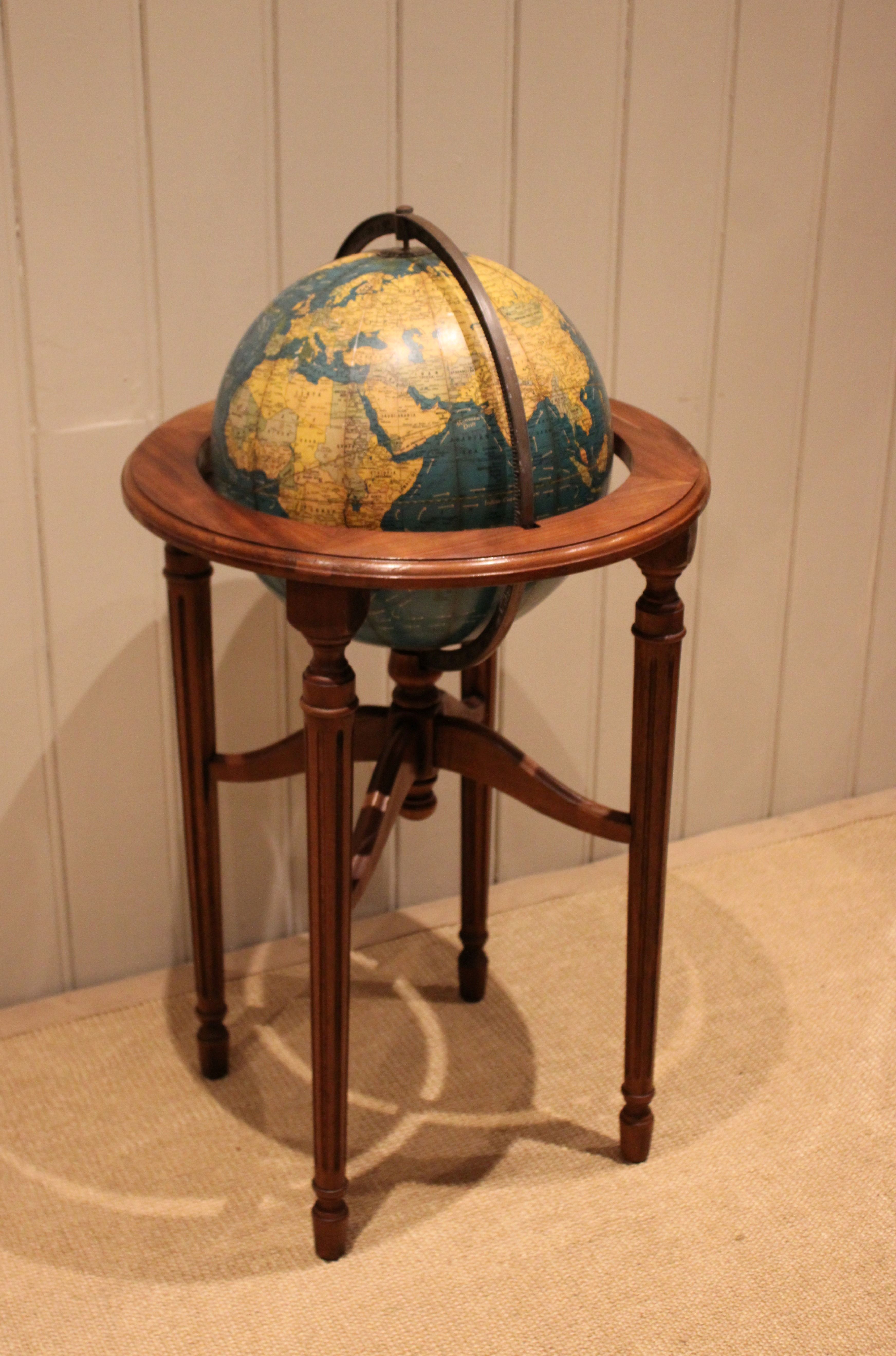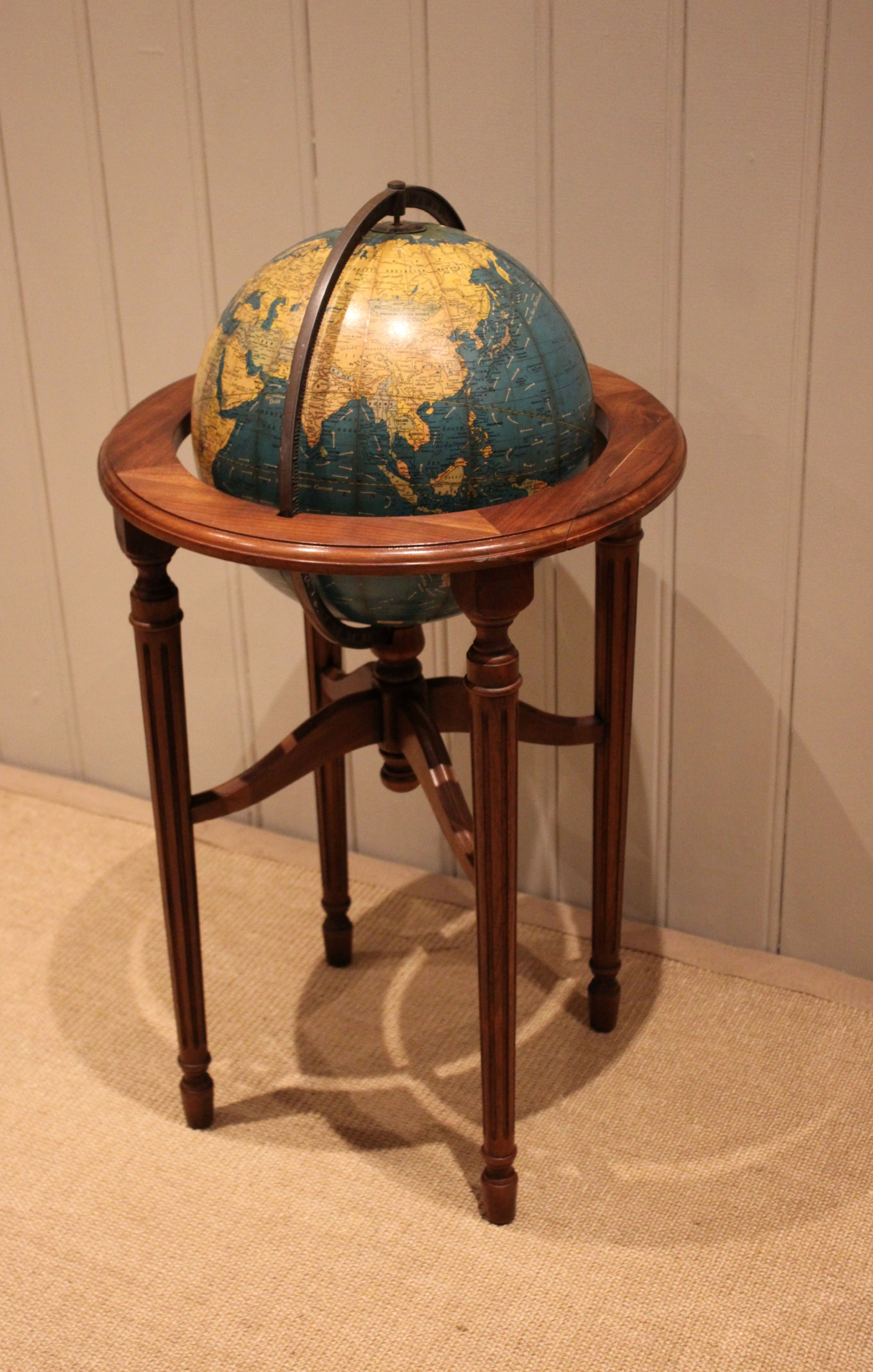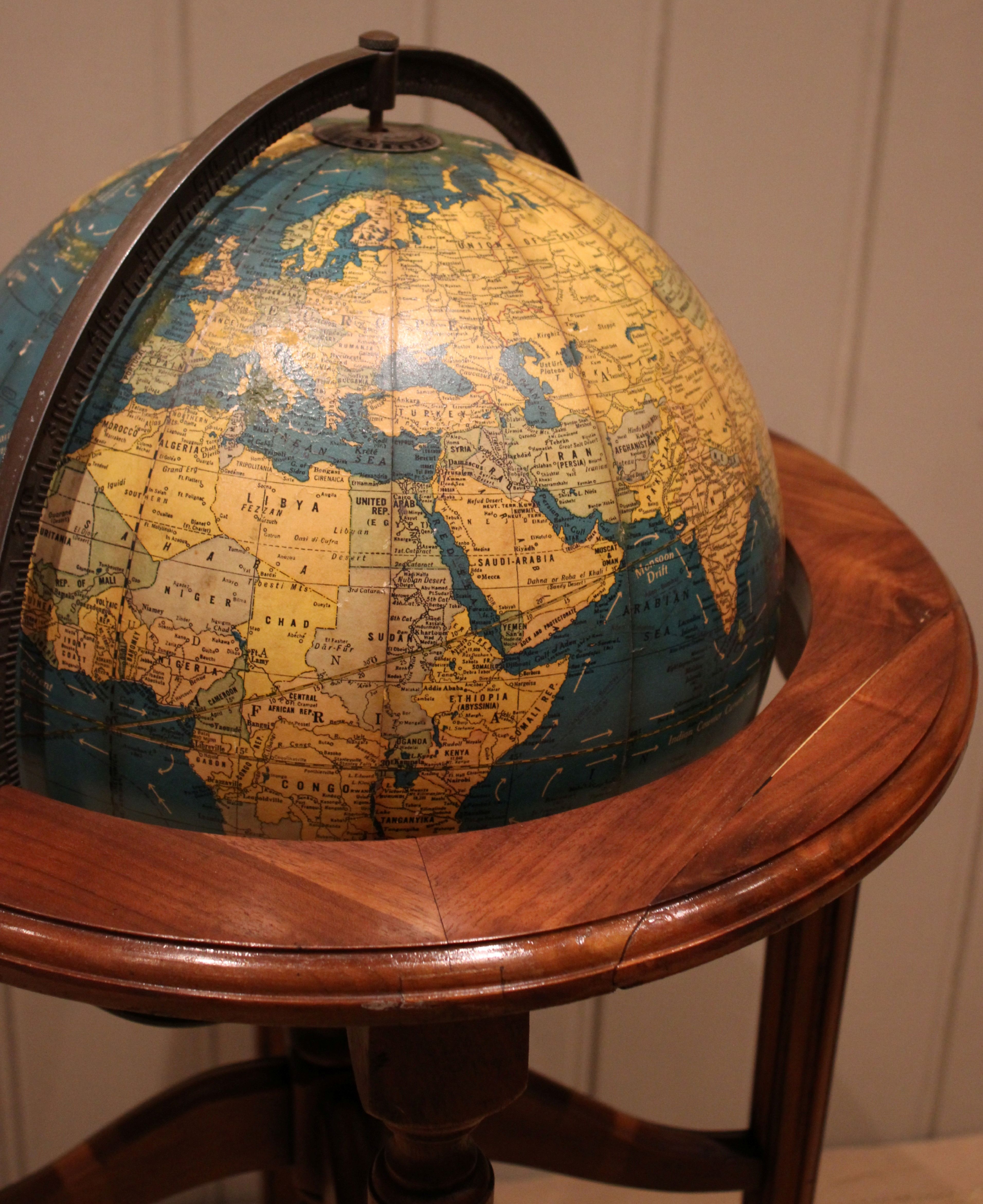 12" Crams terrestrial globe sitting in a walnut stand held in place by a brass meridian , showing the world around the end of WW2 , it dosen't show Israel so it's before 1948 , also showing Tanganyika instead of Tanzania so it's between 1946-1961.