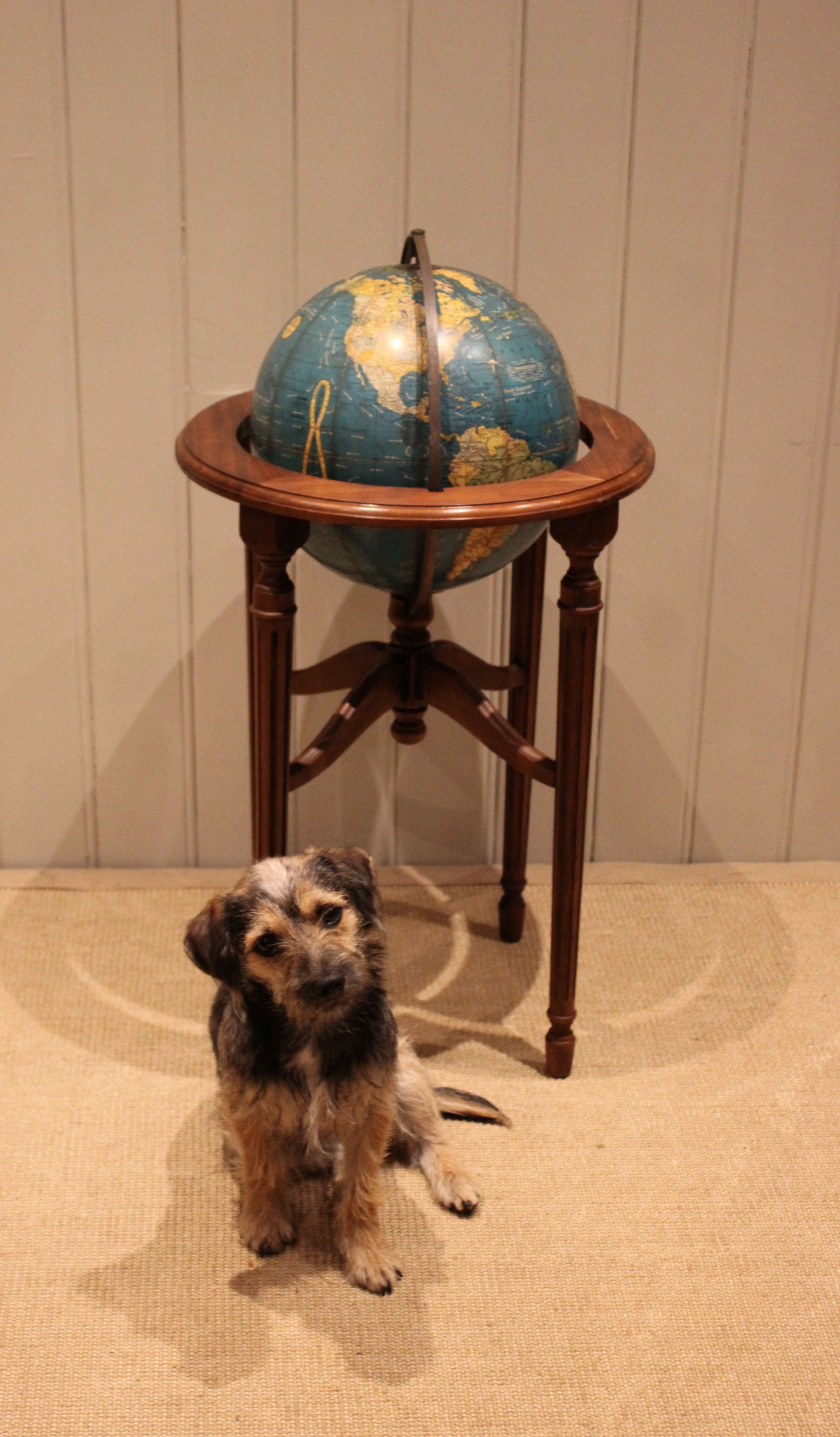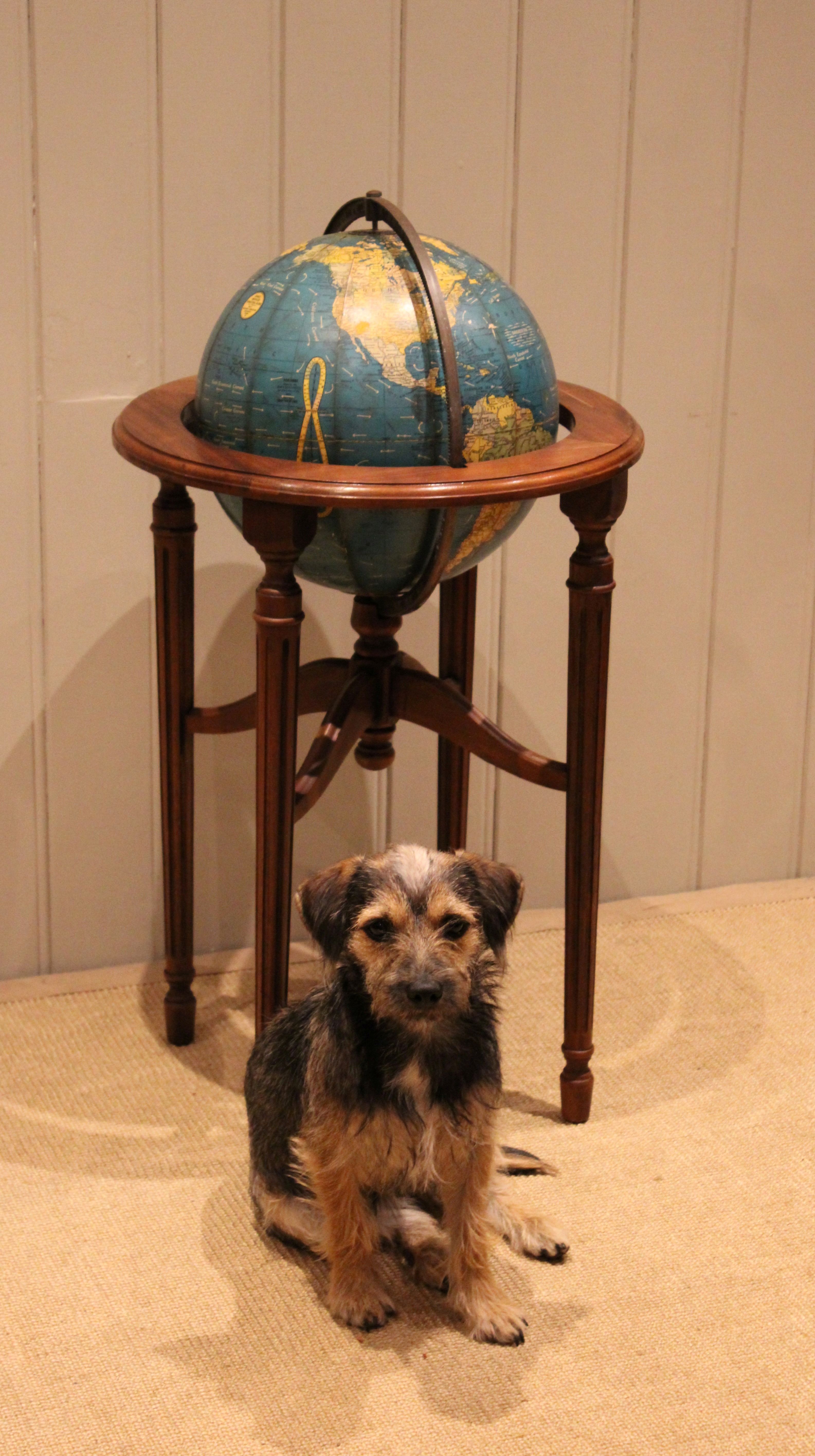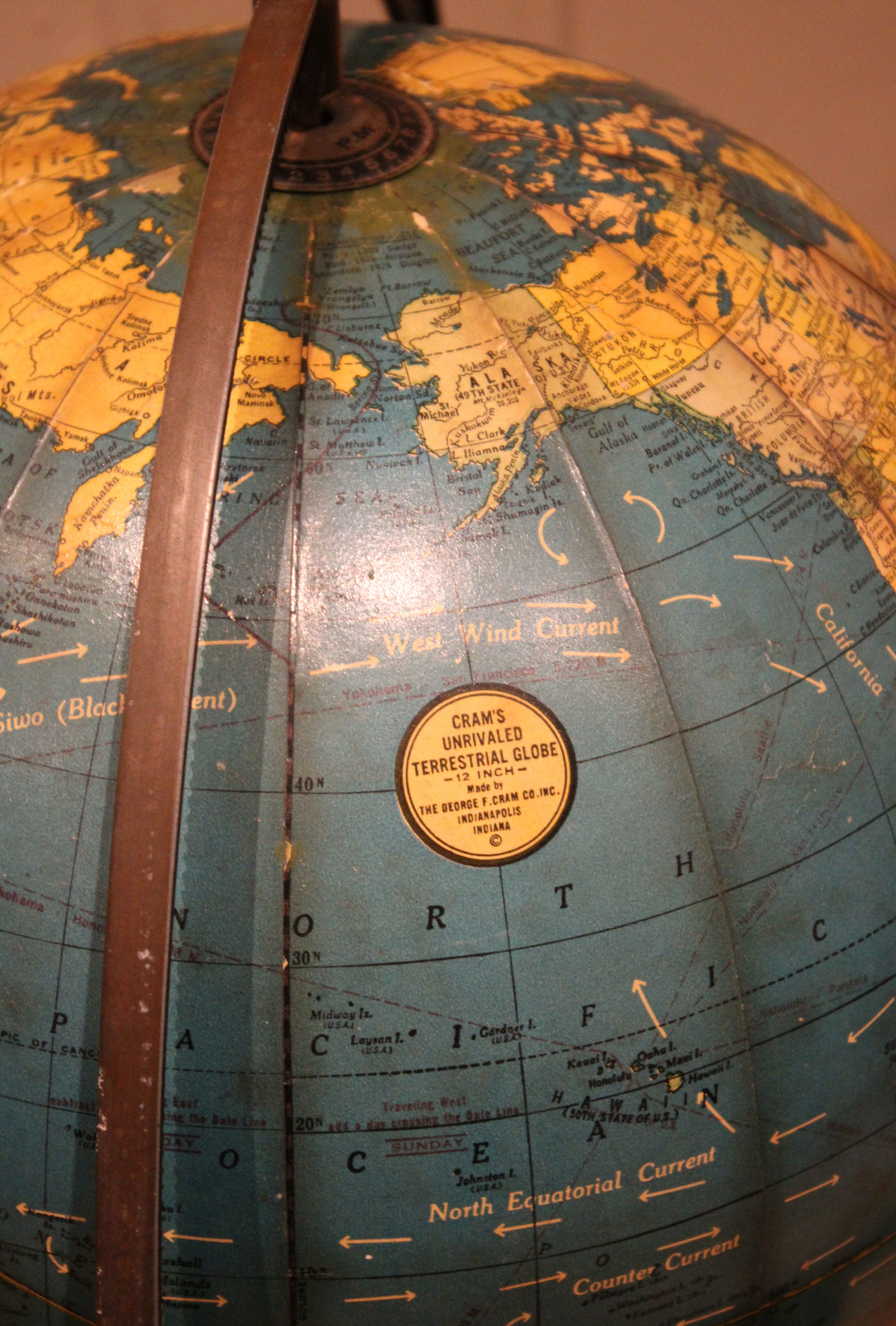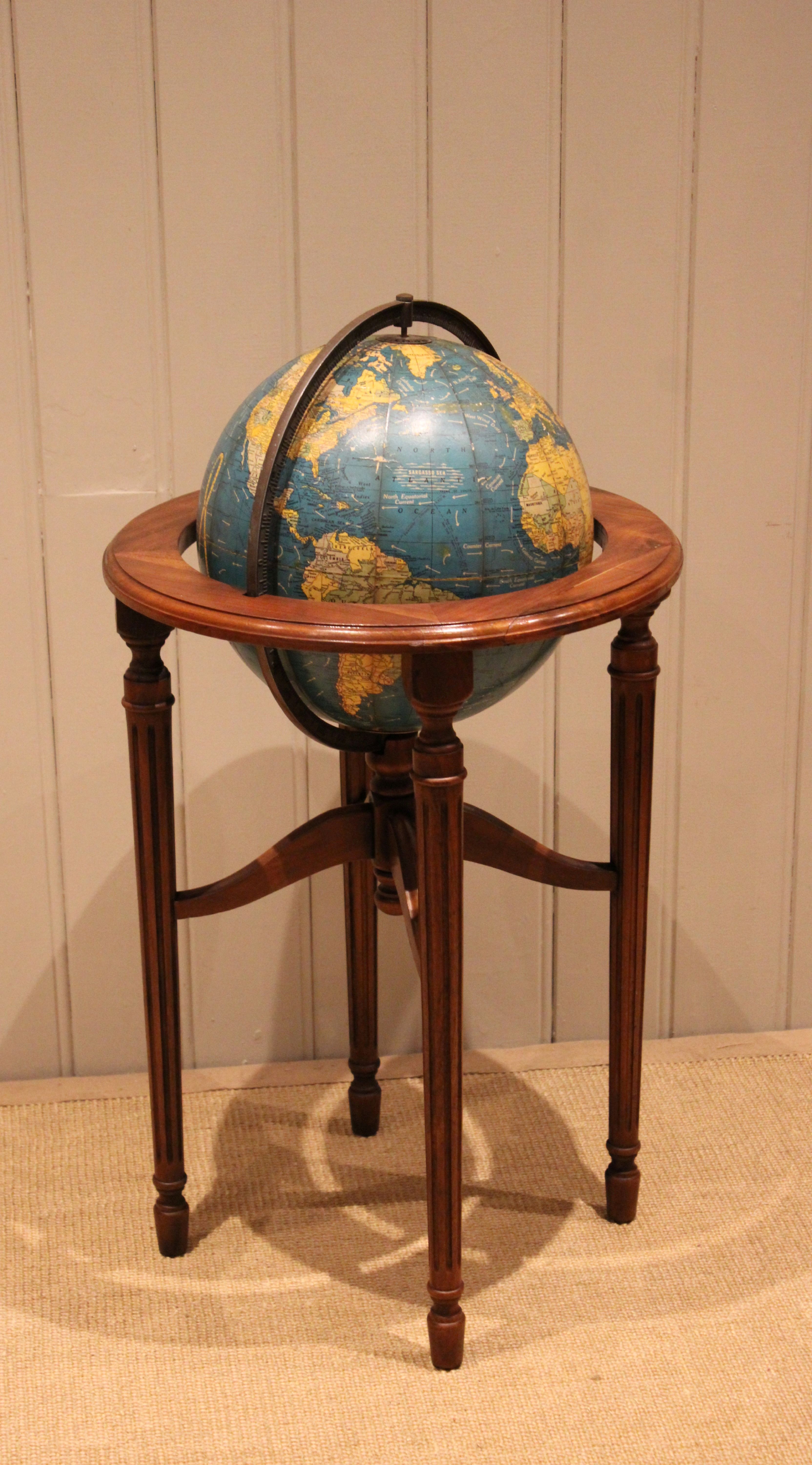 12" Crams terrestrial globe sitting in a walnut stand held in place by a brass meridian , showing the world around the end of WW2 , it dosen't show Israel so it's before 1948 , also showing Tanganyika instead of Tanzania so it's between 1946-1961.