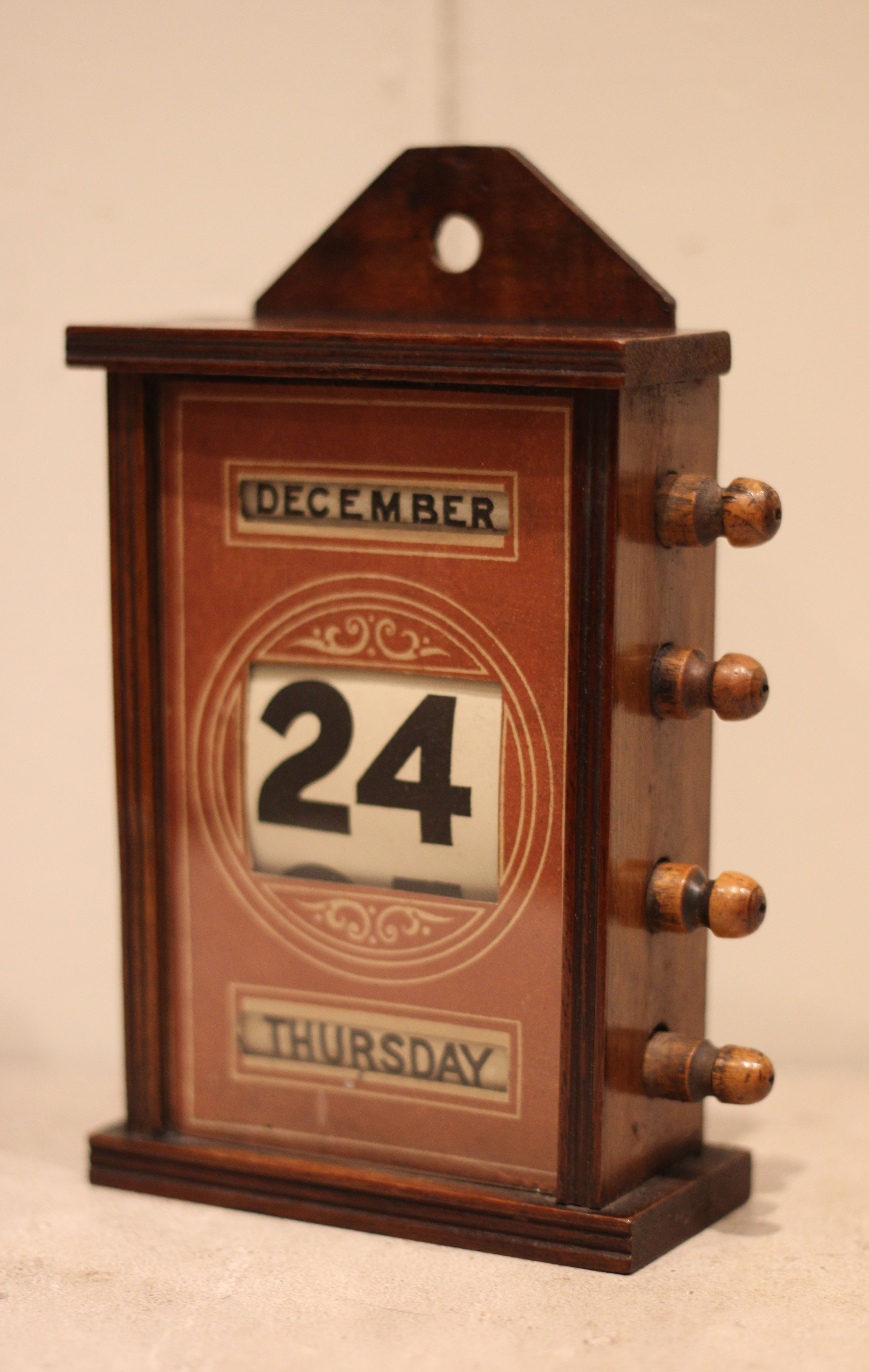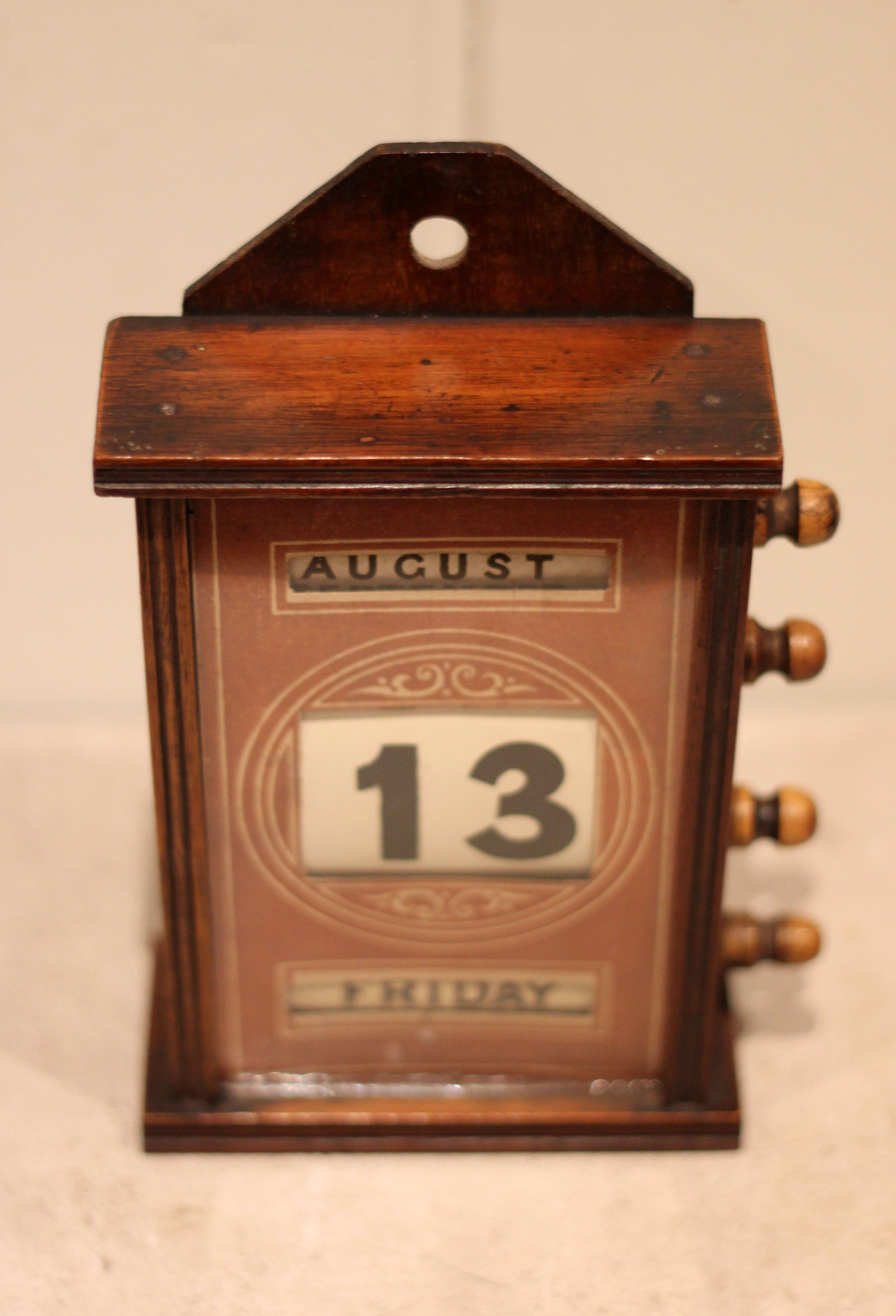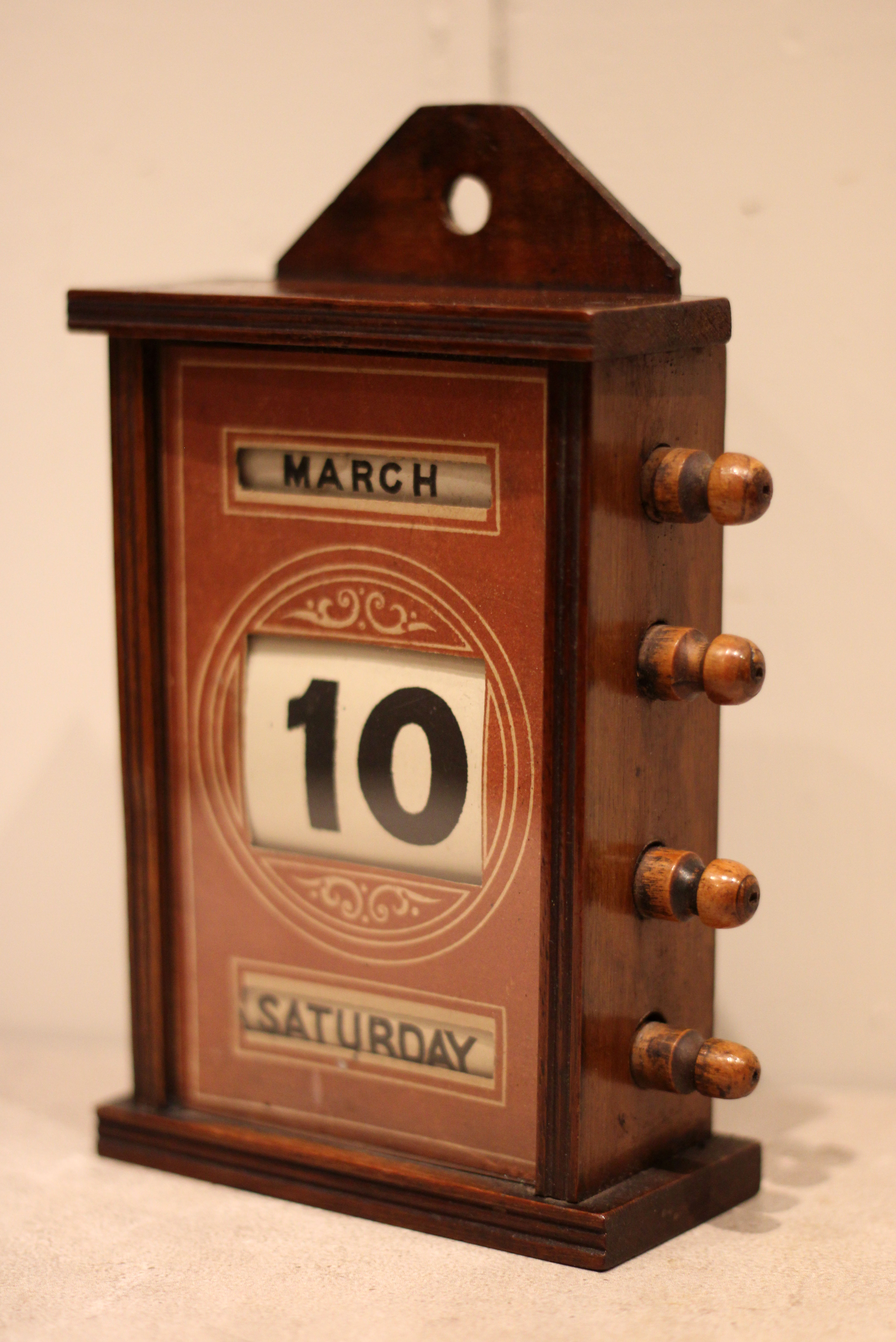 Late 19th Century mahogany desk calendar having , glazed viewing windows and wooden adjusters to the side , with the original painted spools , raised on a plinth base .