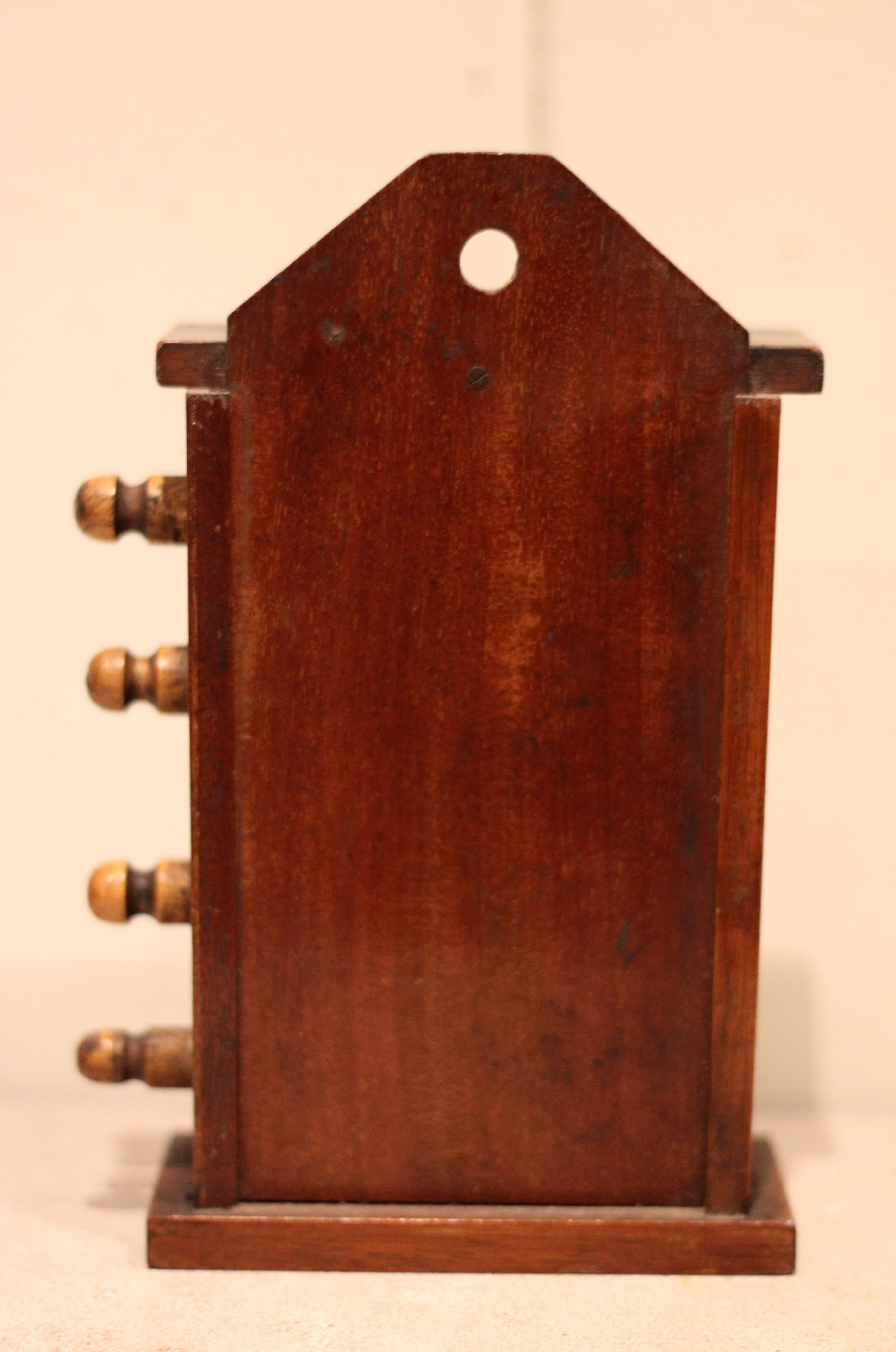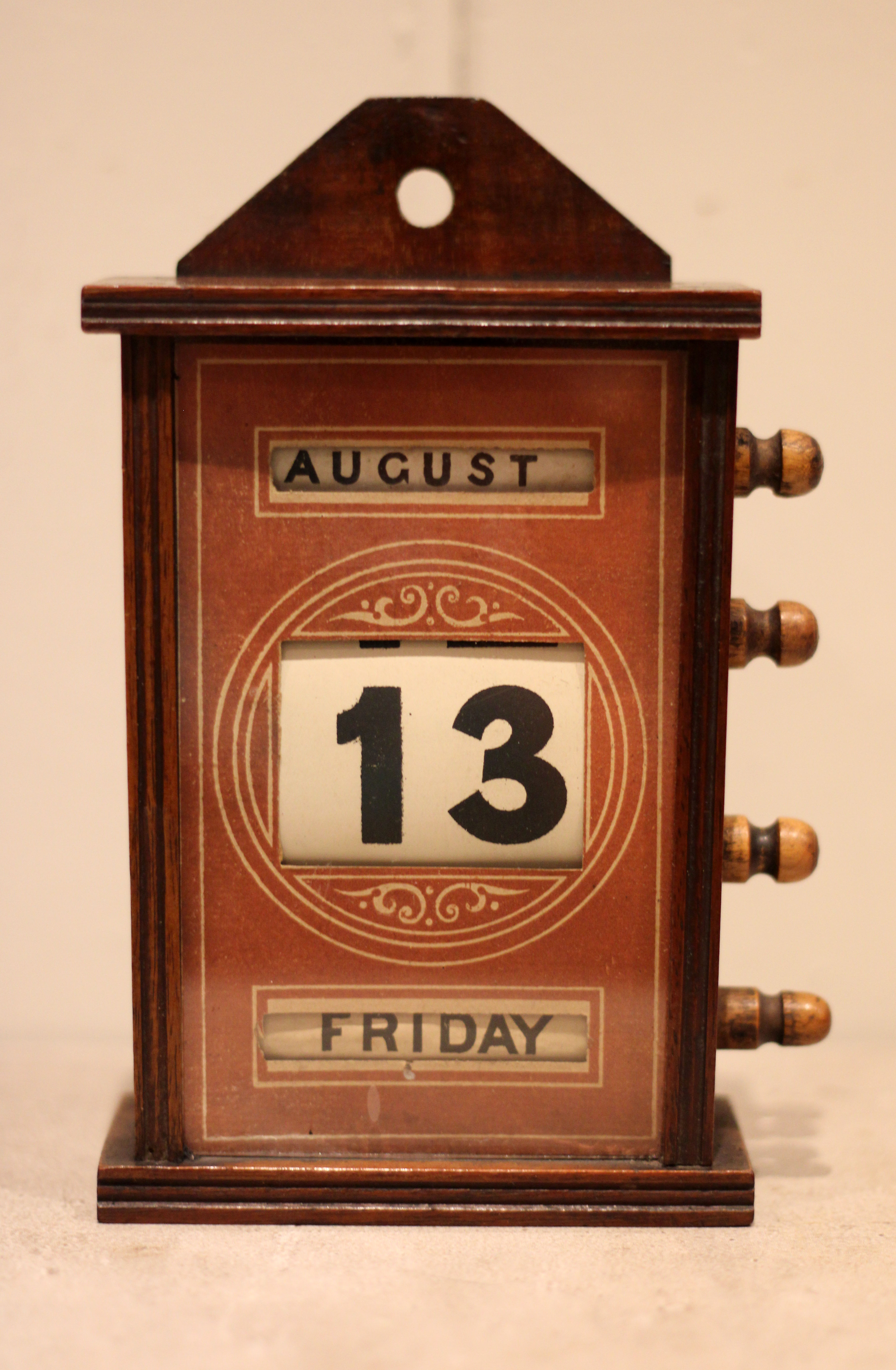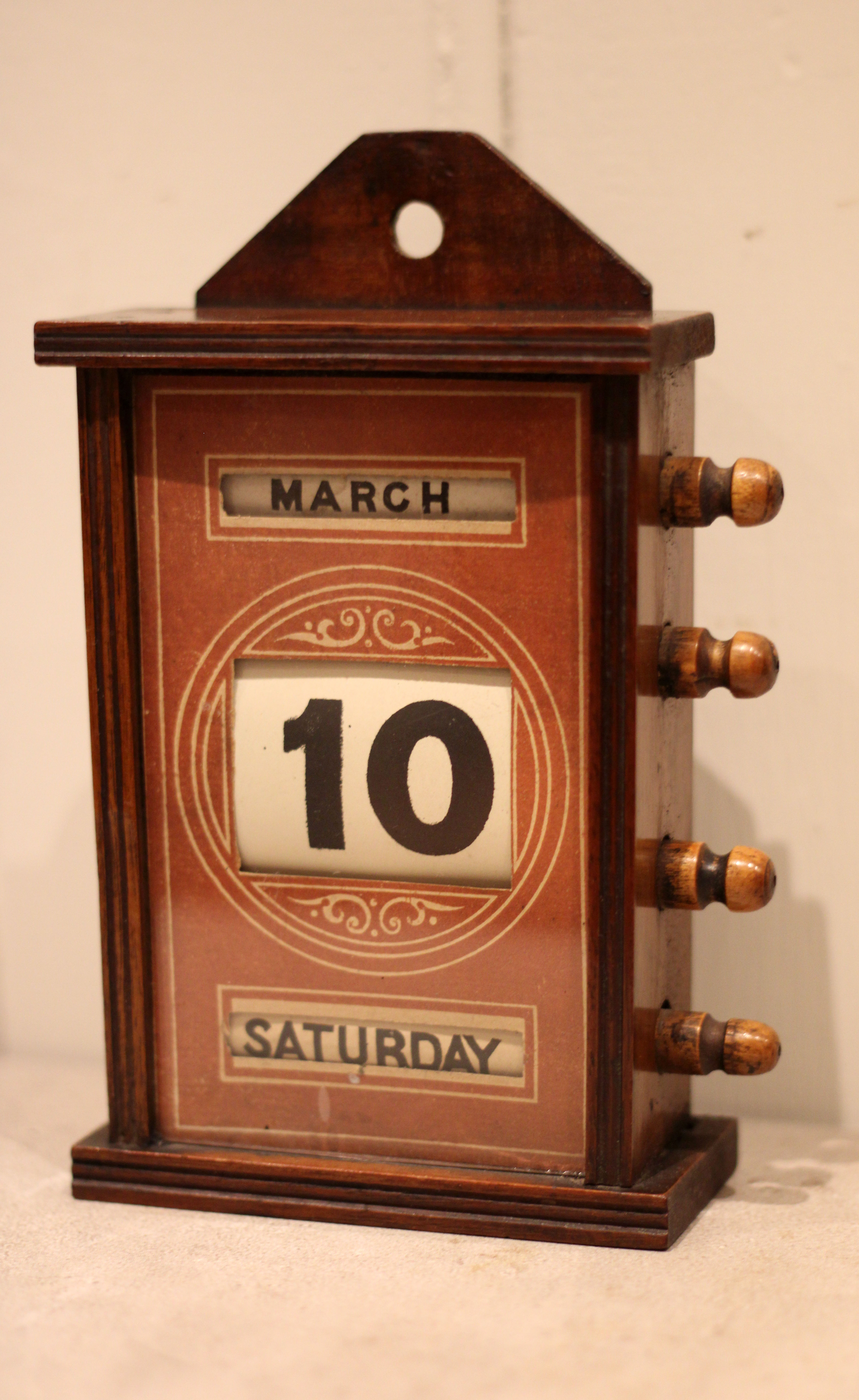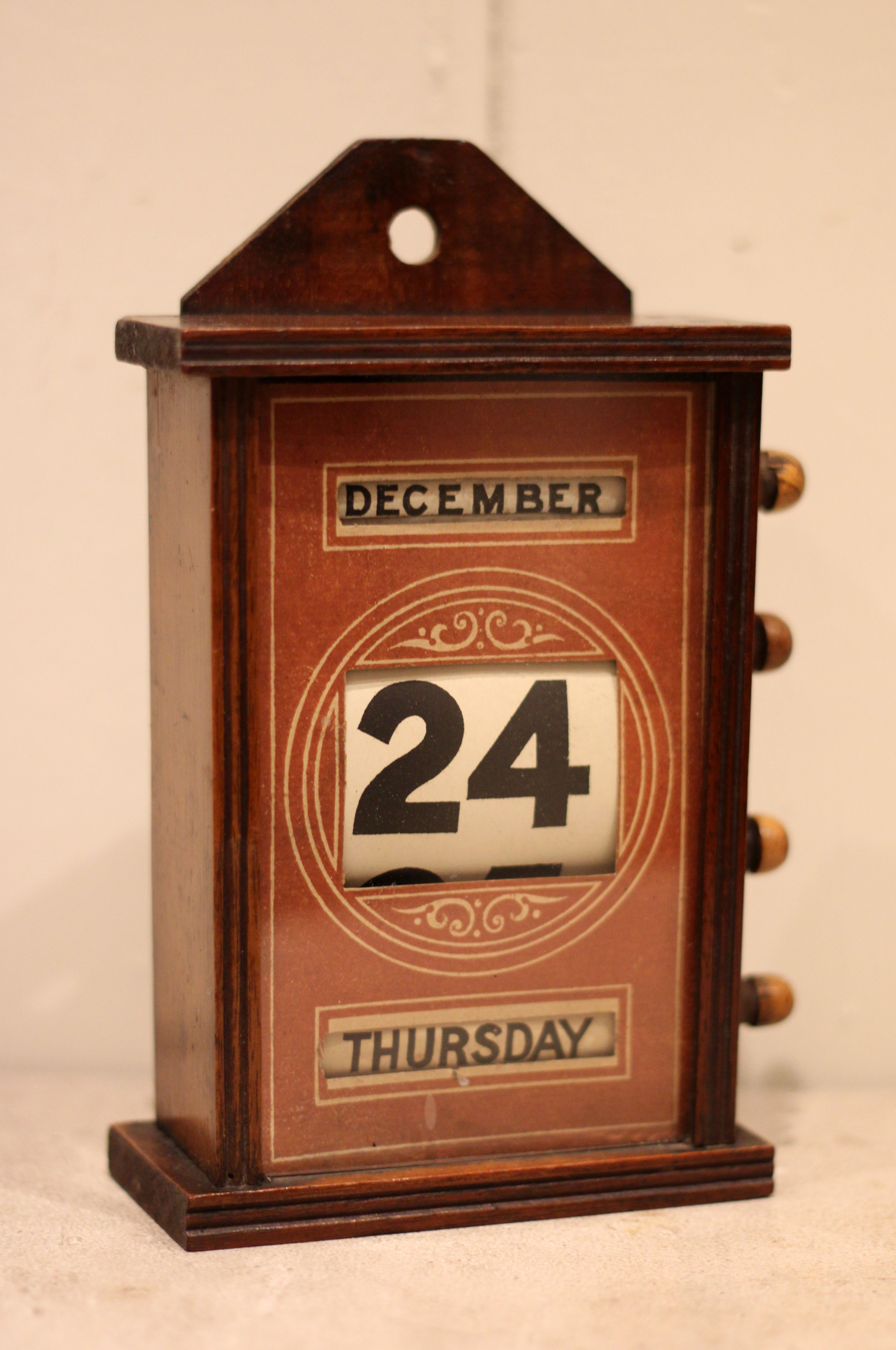 Late 19th Century mahogany desk calendar having , glazed viewing windows and wooden adjusters to the side , with the original painted spools , raised on a plinth base .