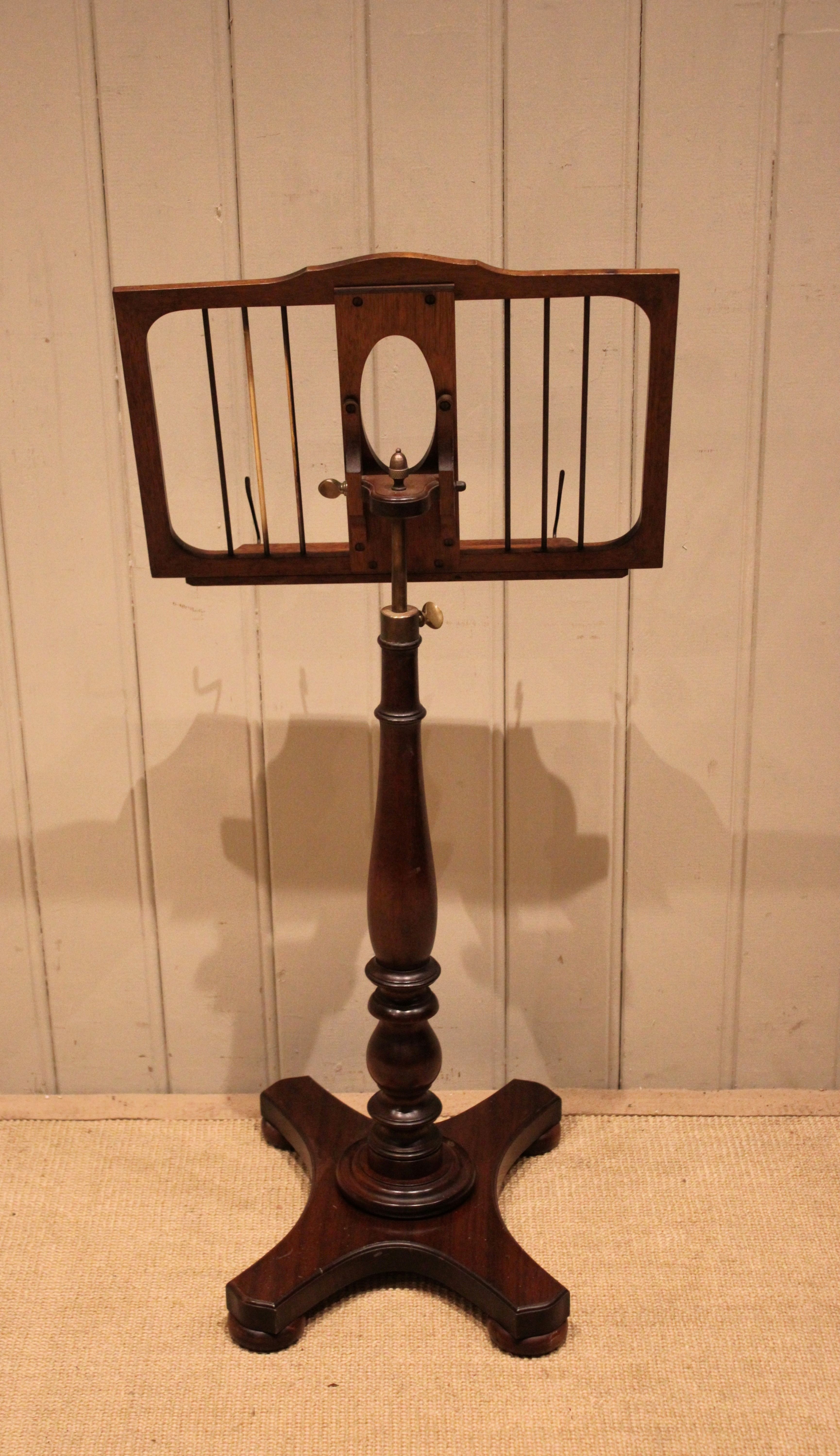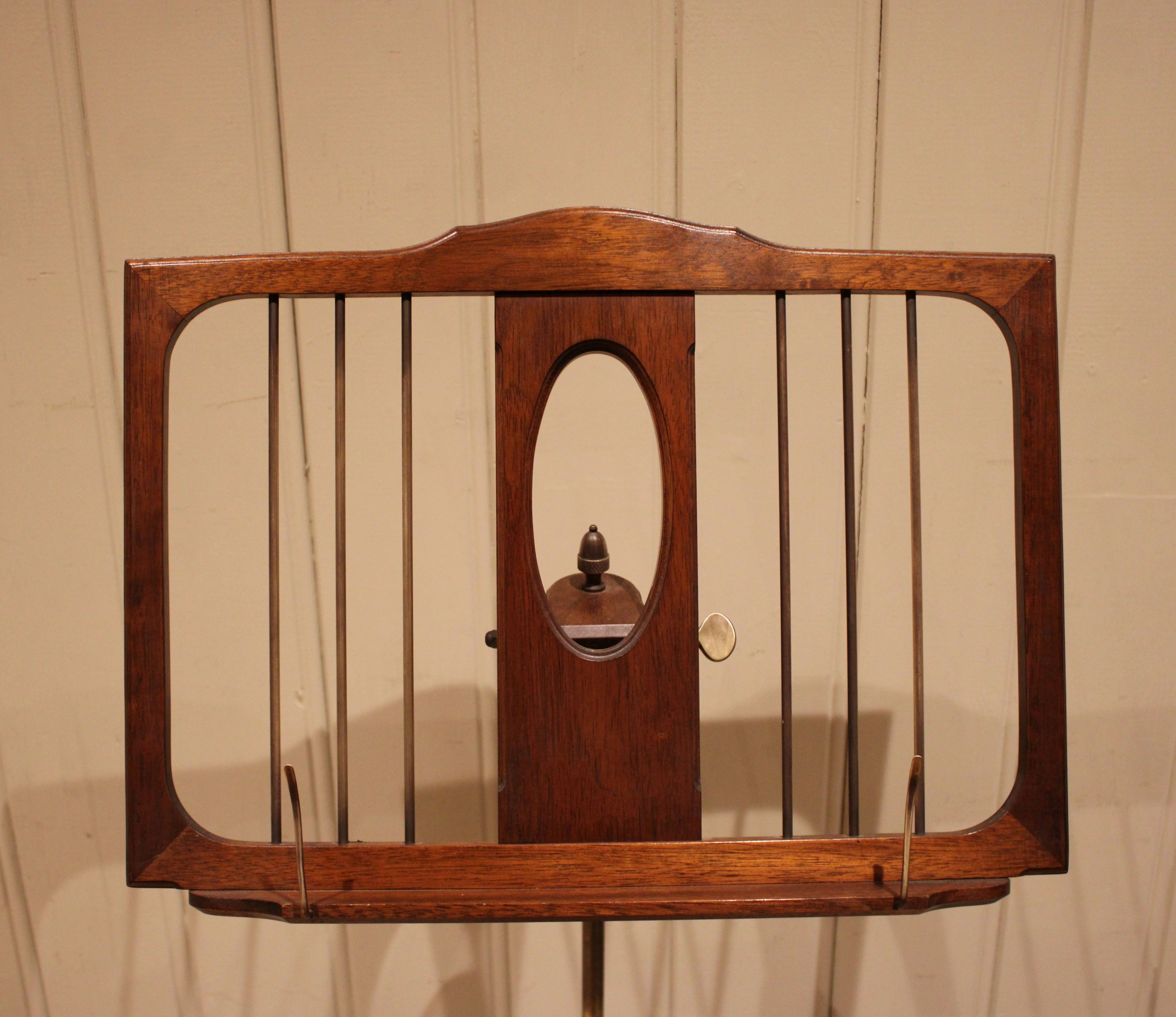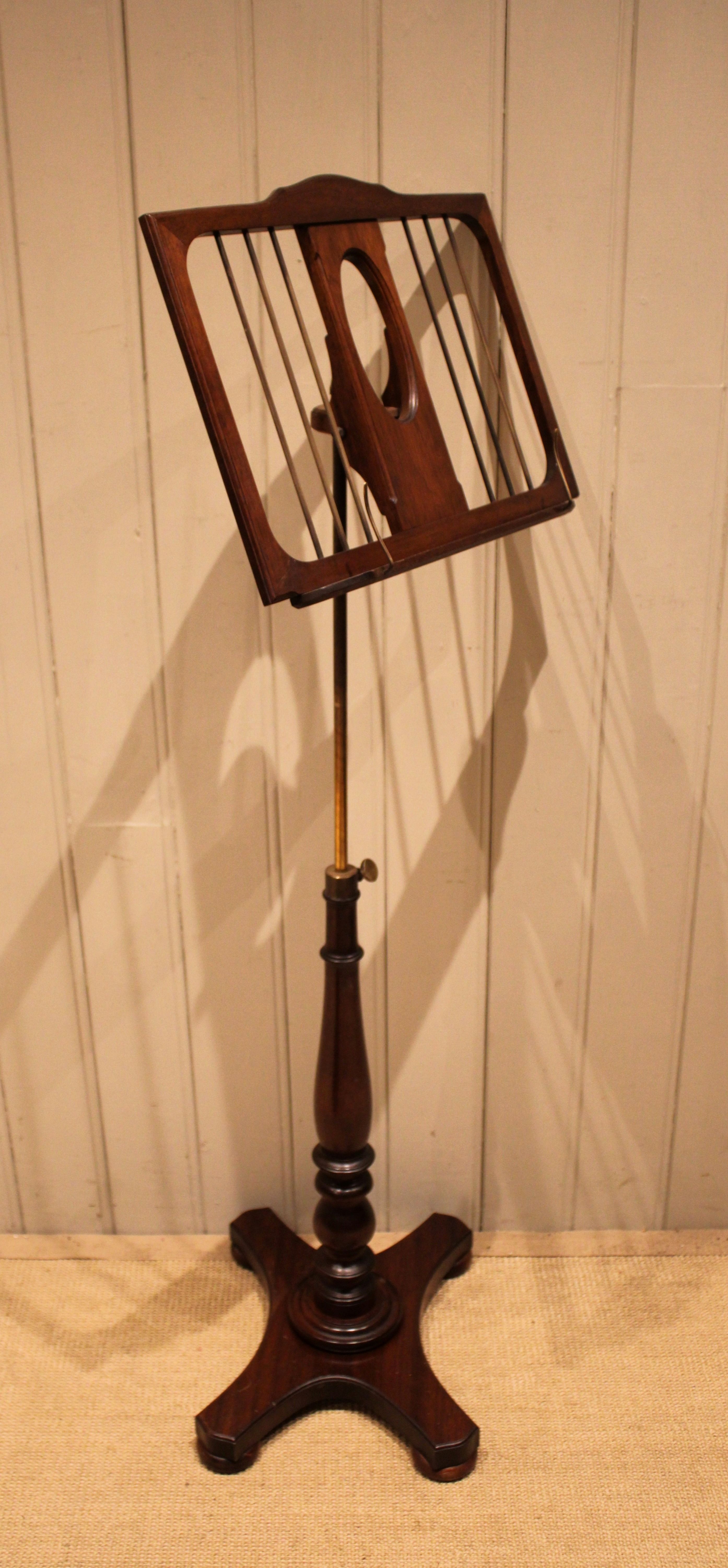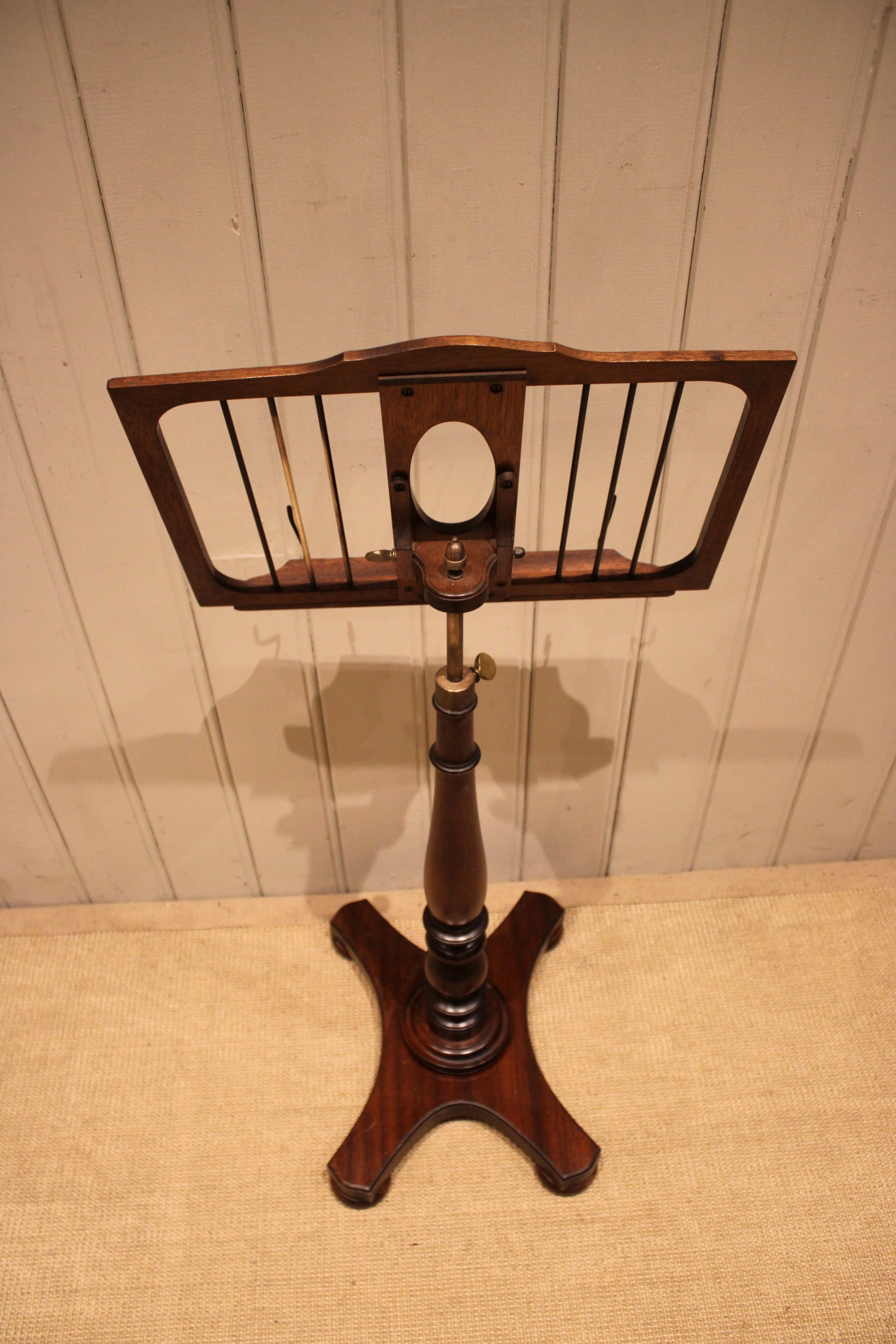 Mahogany music stand having a turned central column , standing on a platform base . The adjustable height and angled top is secured with brass fixings , the height can be adjusted from 147 cm to 89 cm .