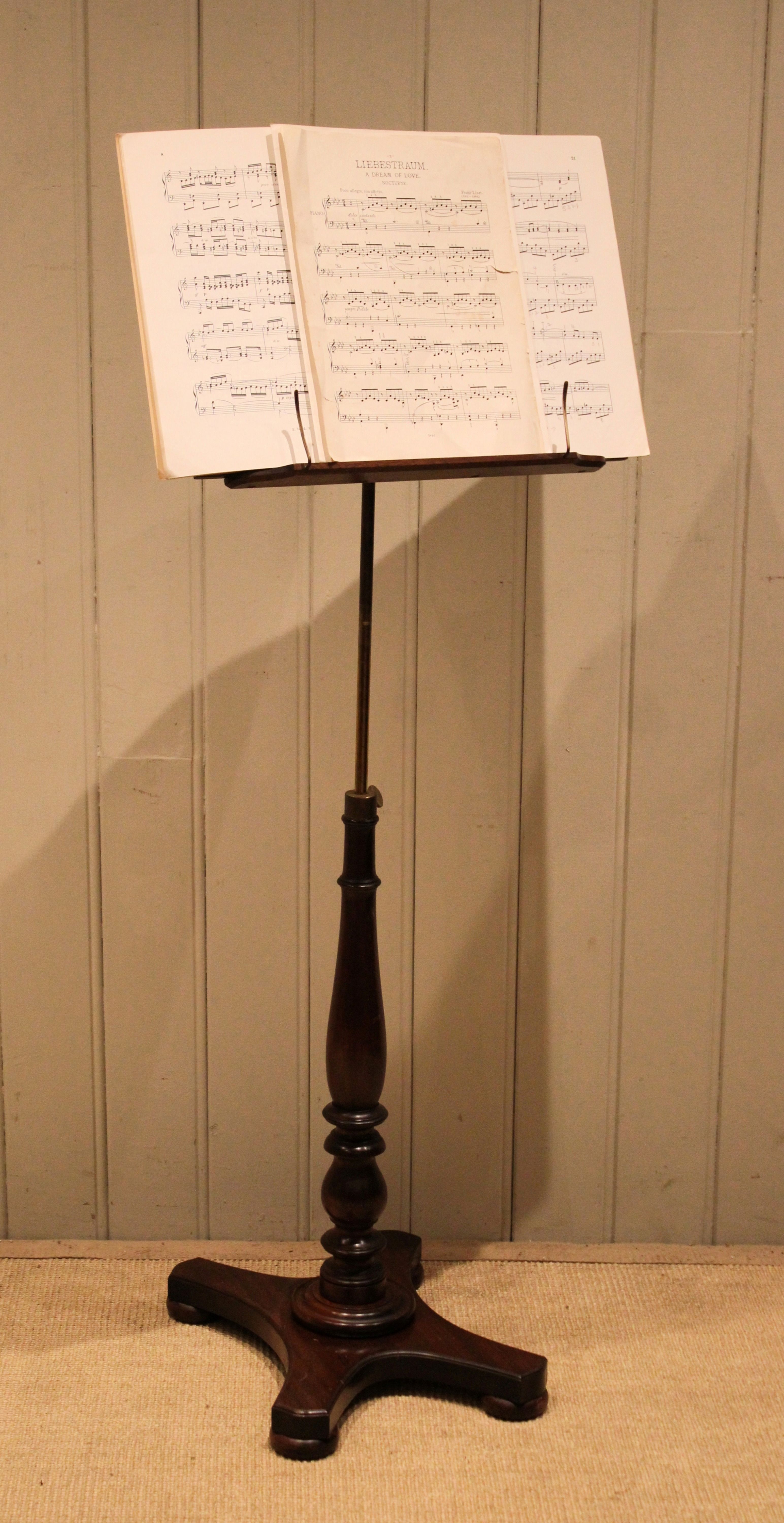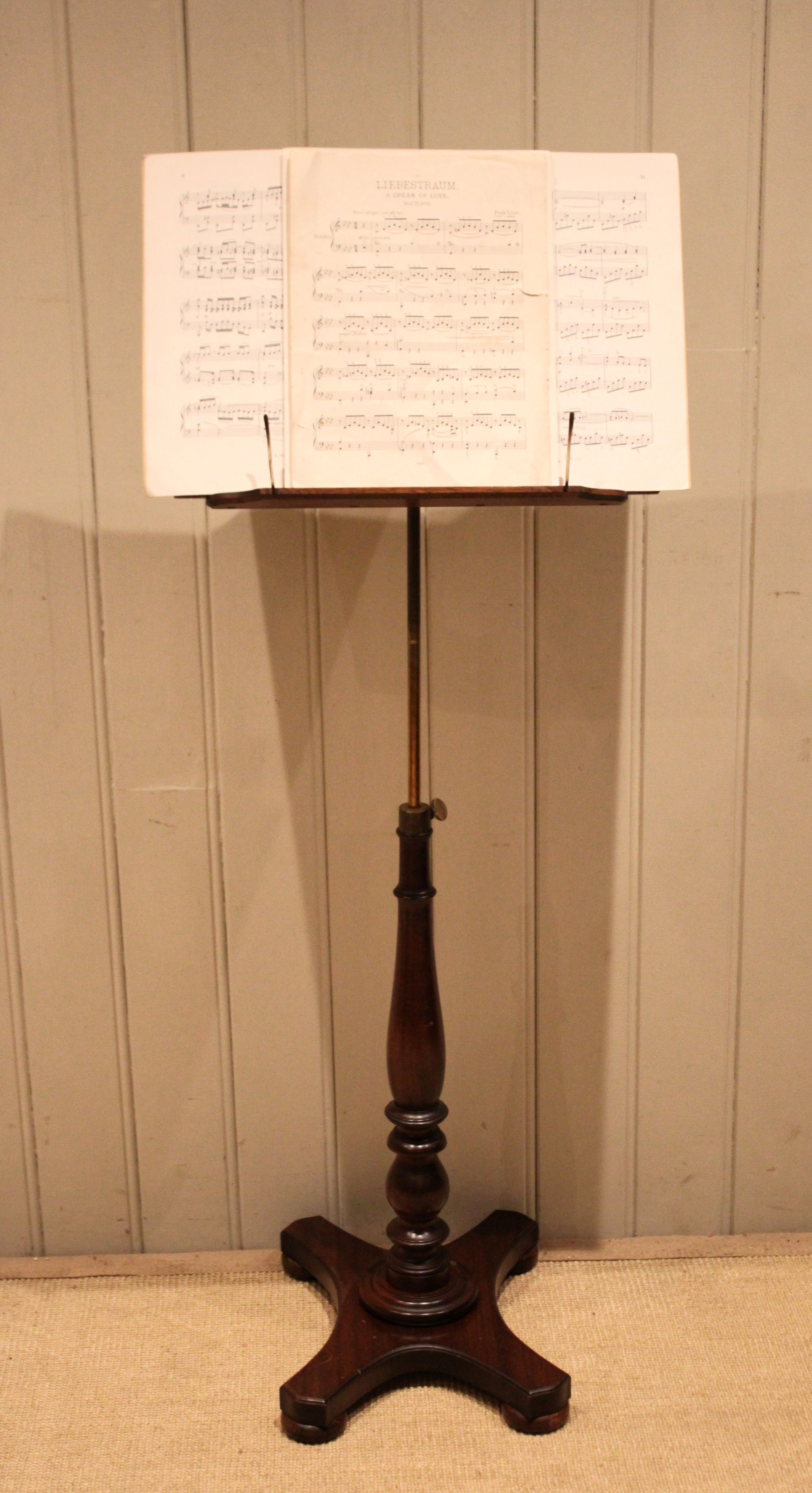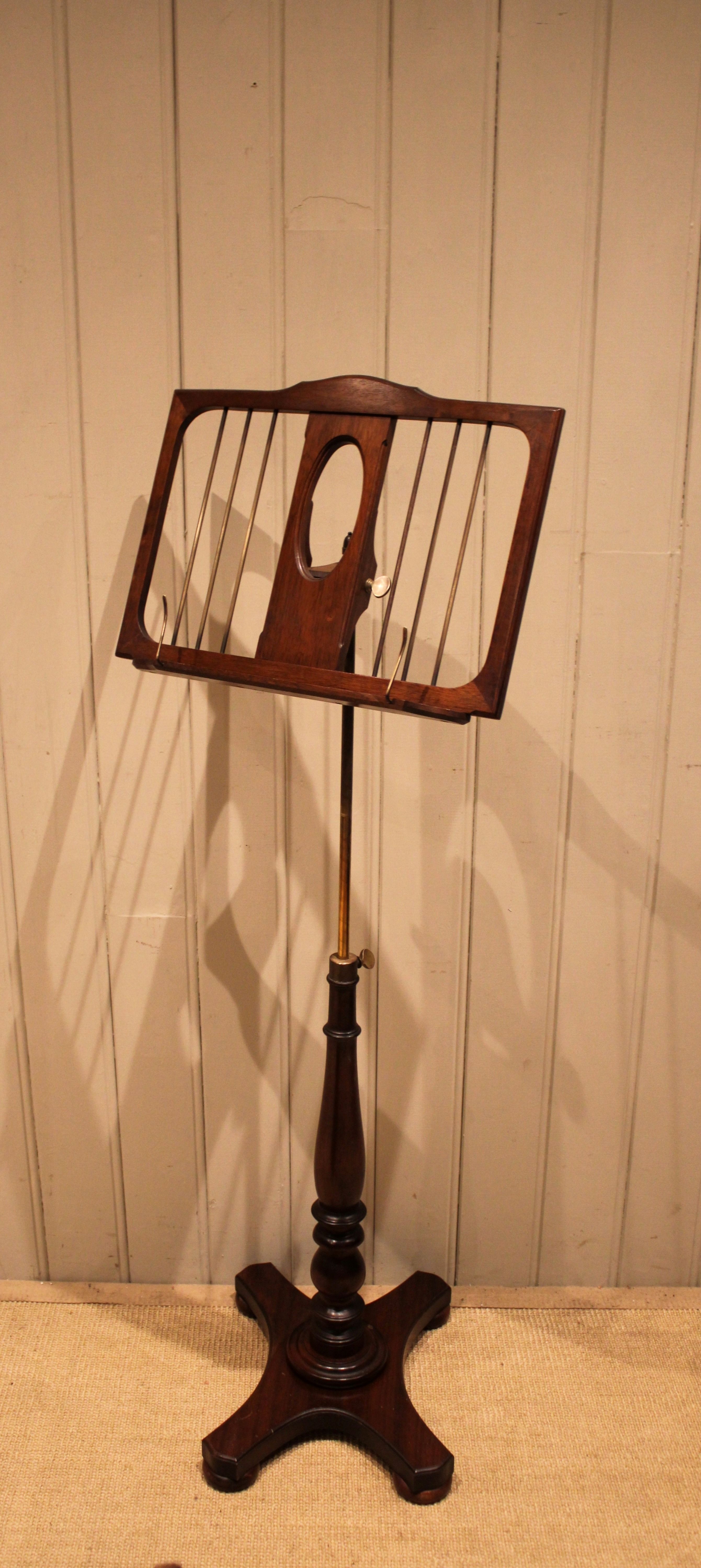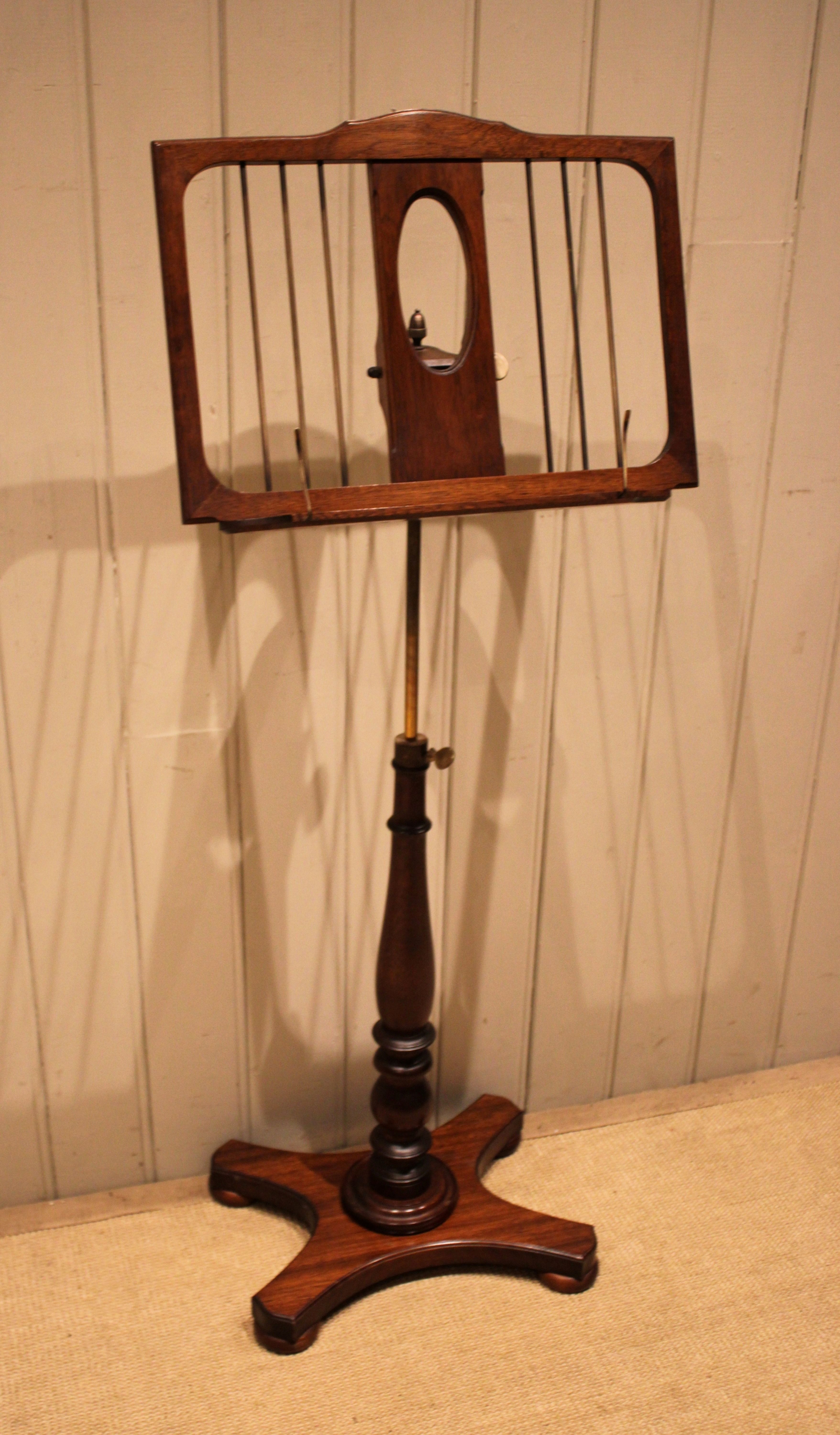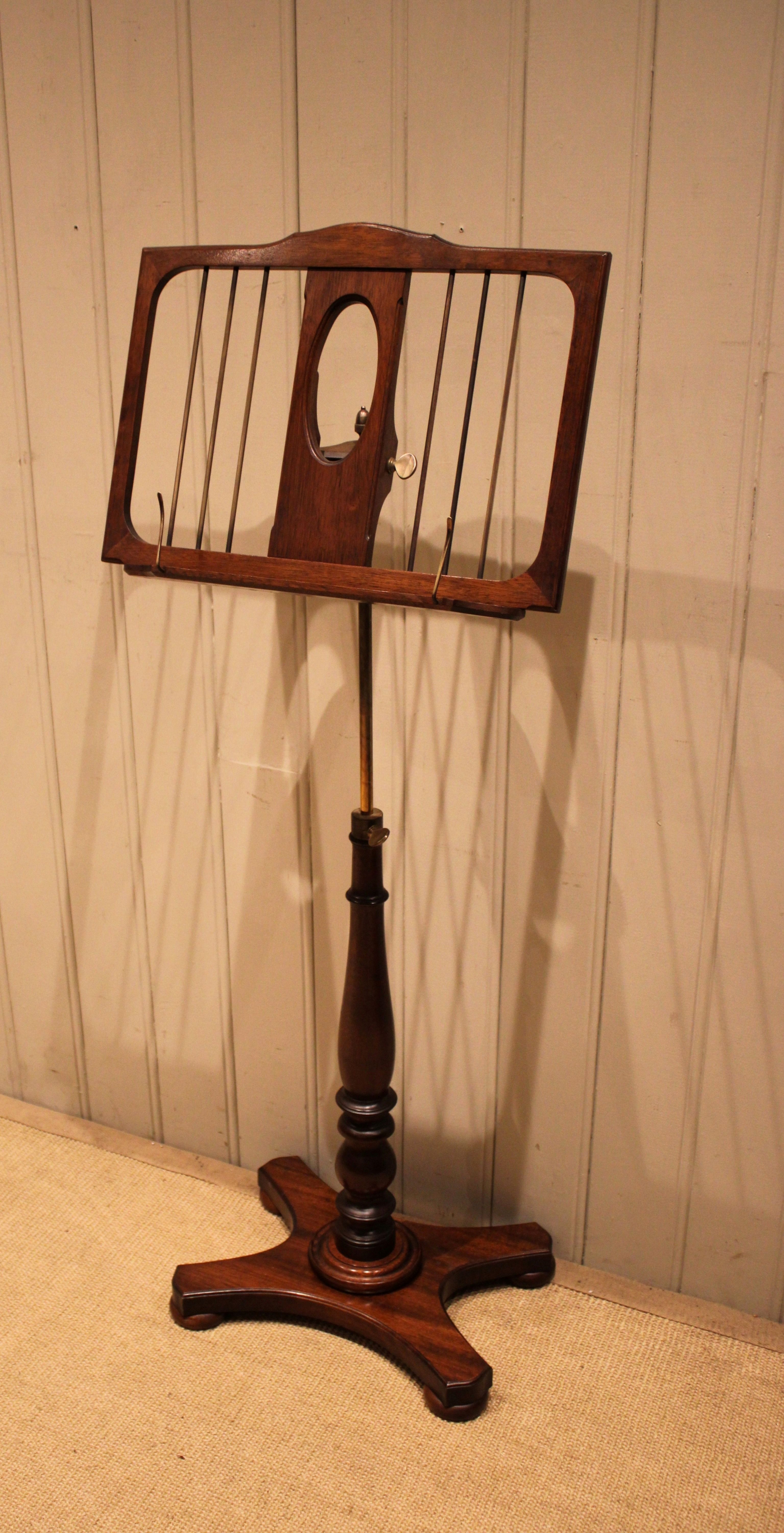Mahogany music stand having a turned central column , standing on a platform base . The adjustable height and angled top is secured with brass fixings , the height can be adjusted from 147 cm to 89 cm .