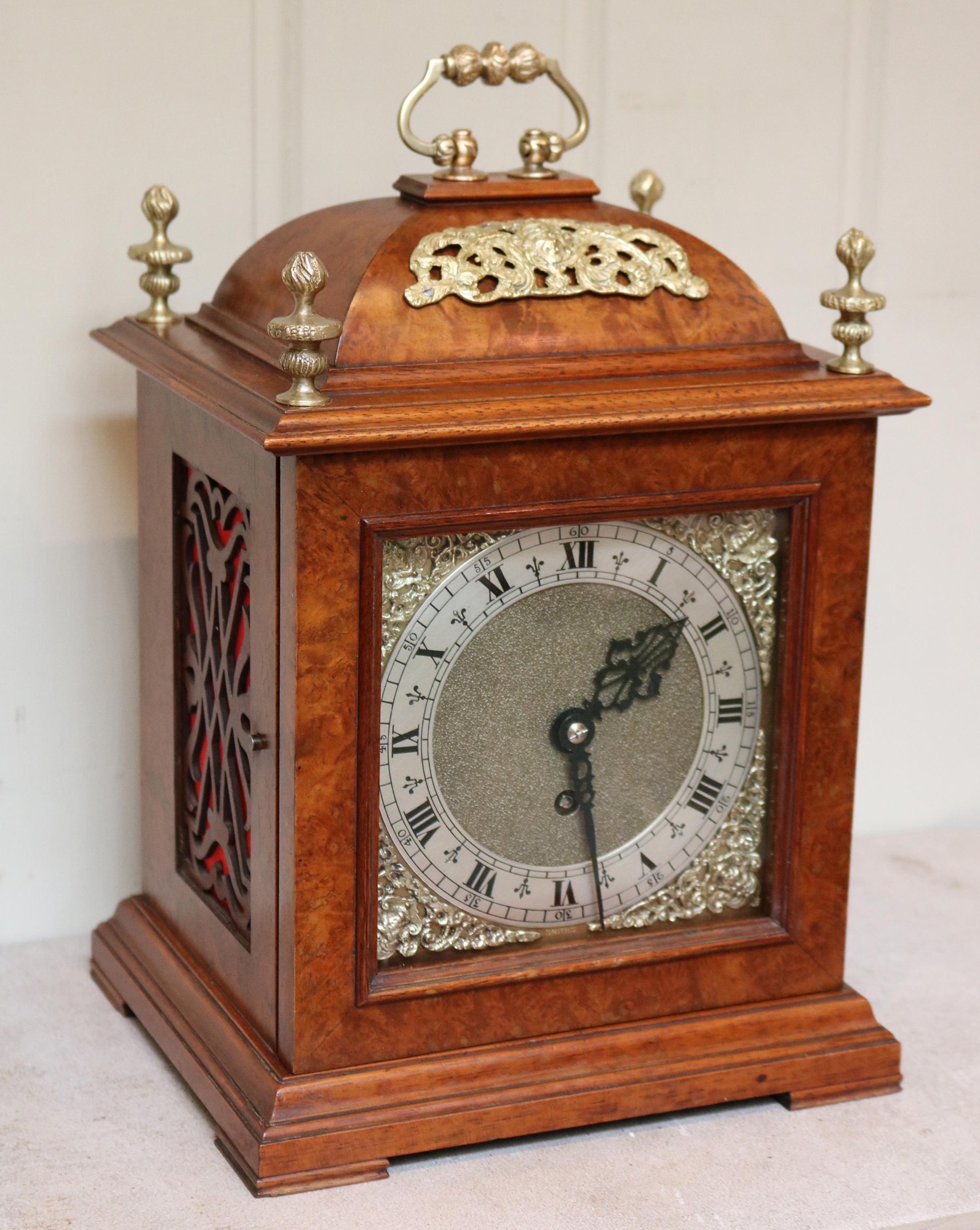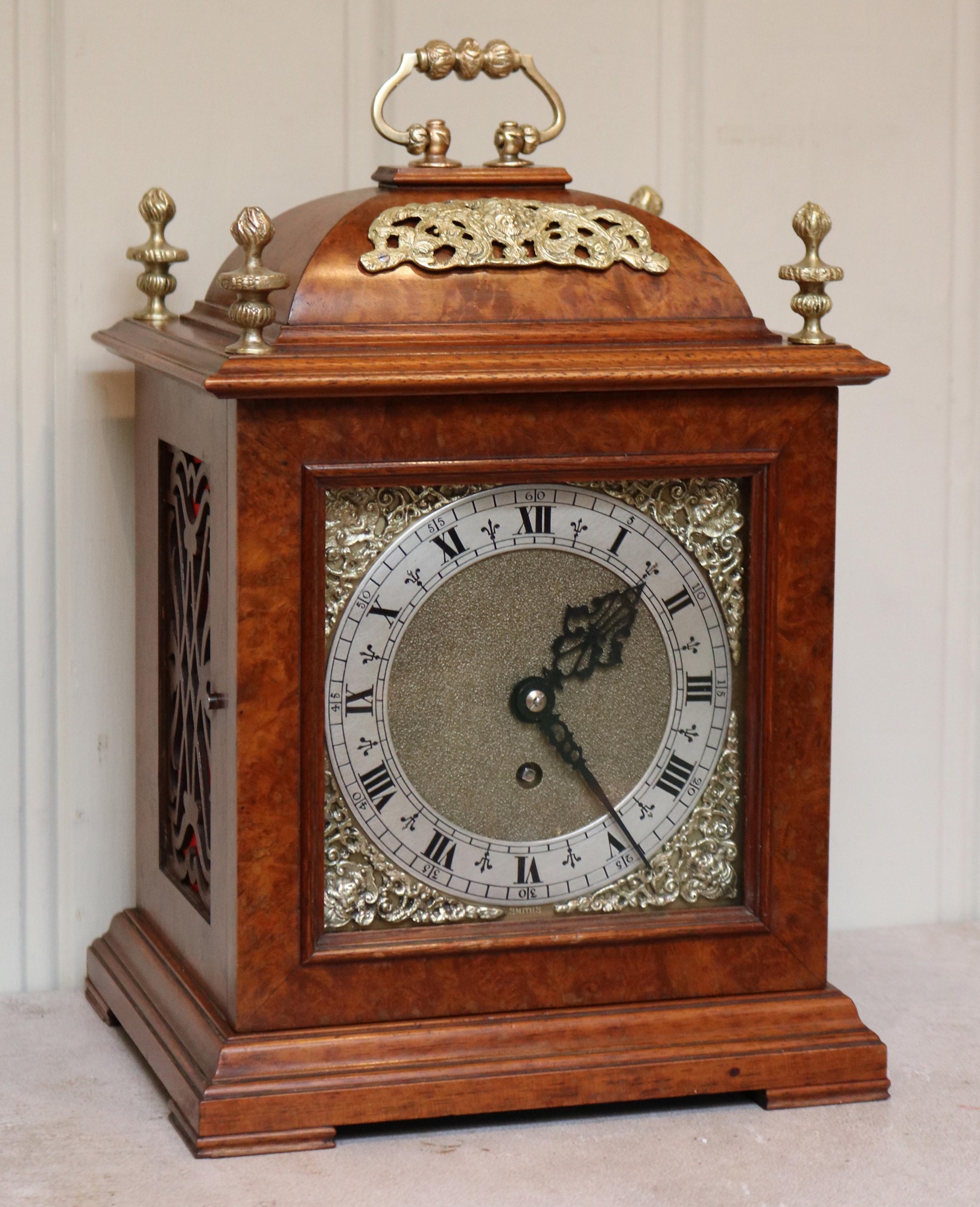 A Walnut bell top bracket clock in the late 17th Century style, made during The George V period. It has a traditional caddy top with a brass carrying handle with brass corner finials, a square dial and silk lined fret work sides. The dial has a silvered chapter ring and brass corner spandrels. It has an 8 day jewelled movement made by Smiths.