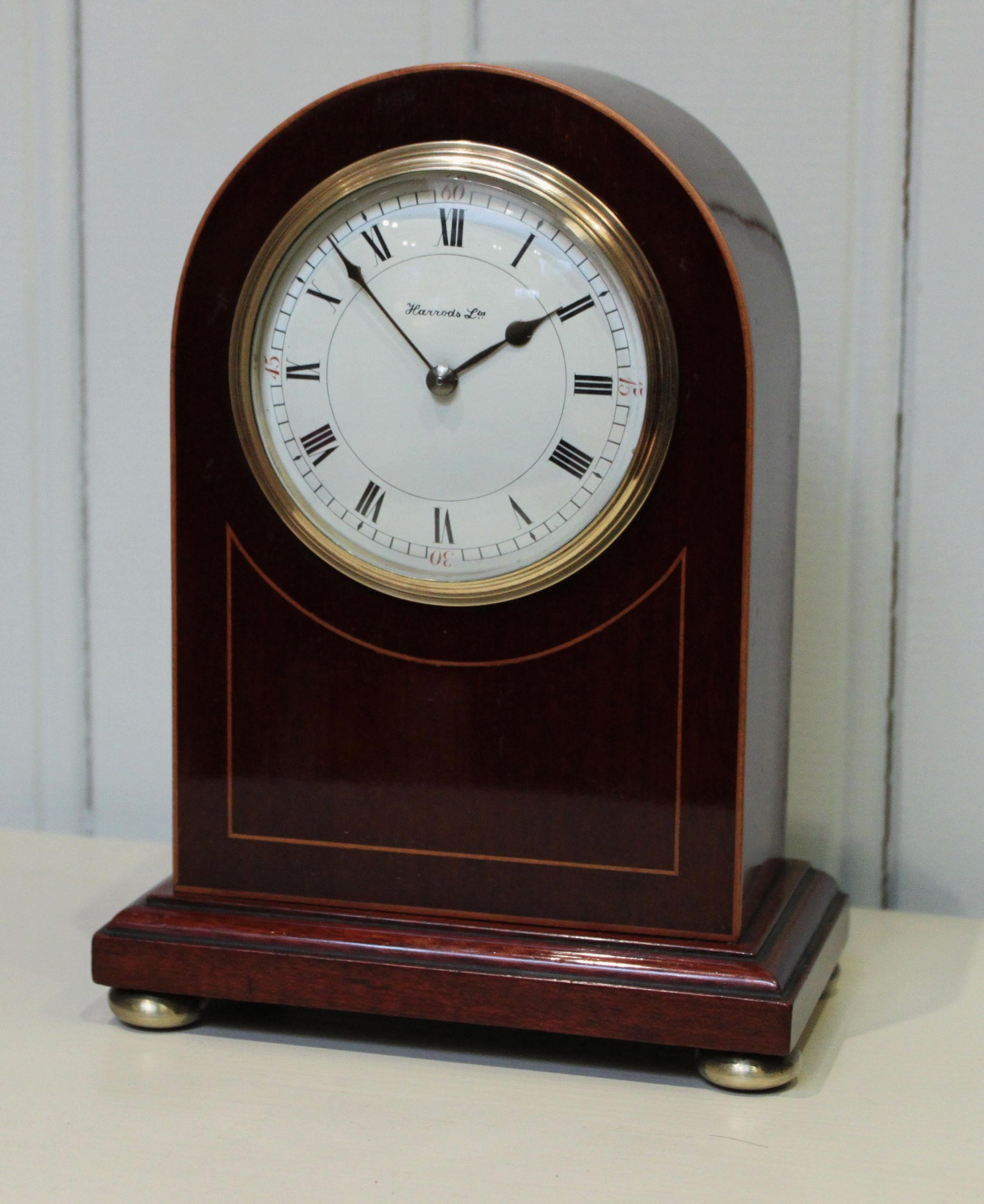 A solid mahogany arch top mantel clock, having boxwood stringing. The convex enamel dial has a convex glass and is signed by the original retailer, Harrods of London. It has a French 8 day lever platform movement.