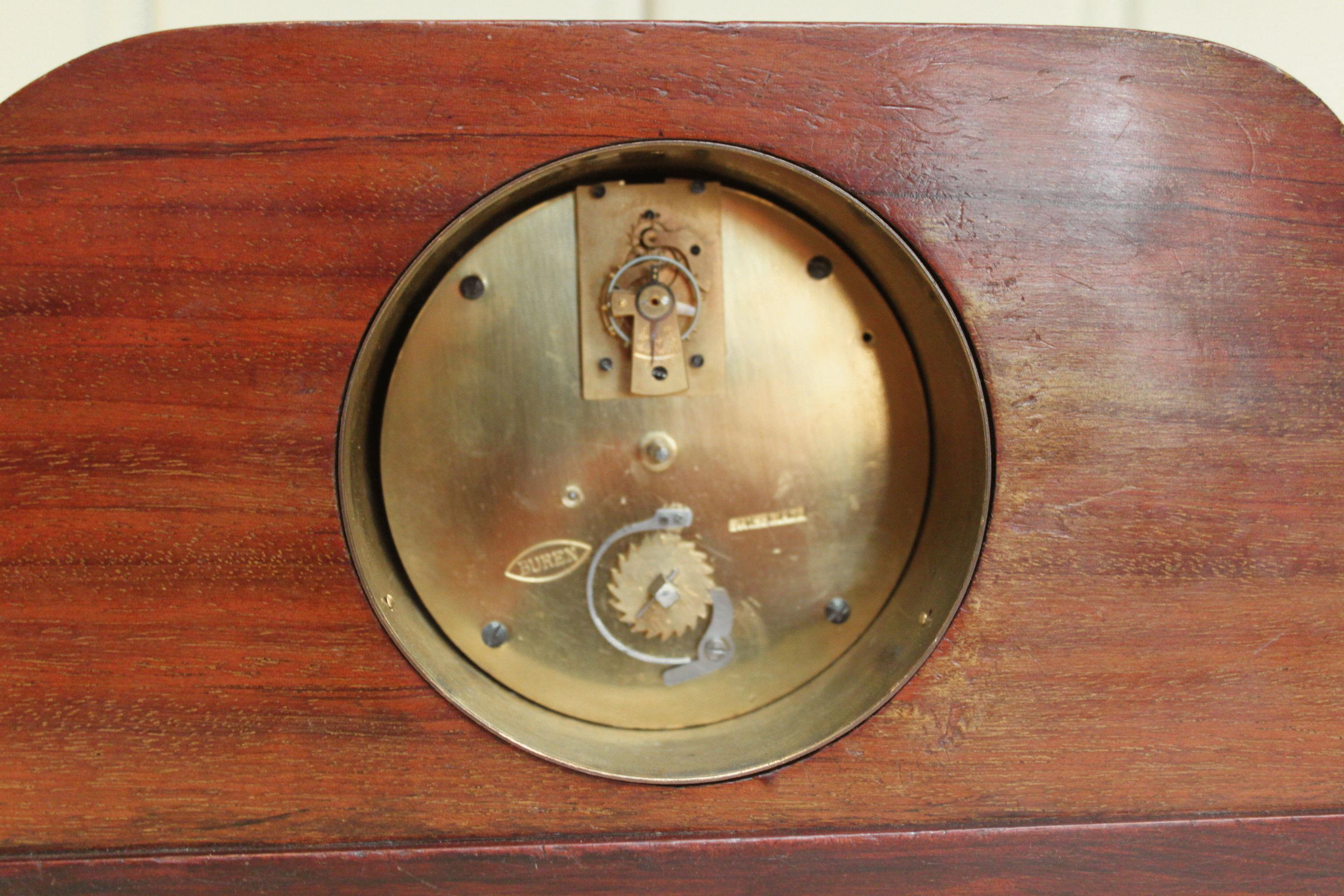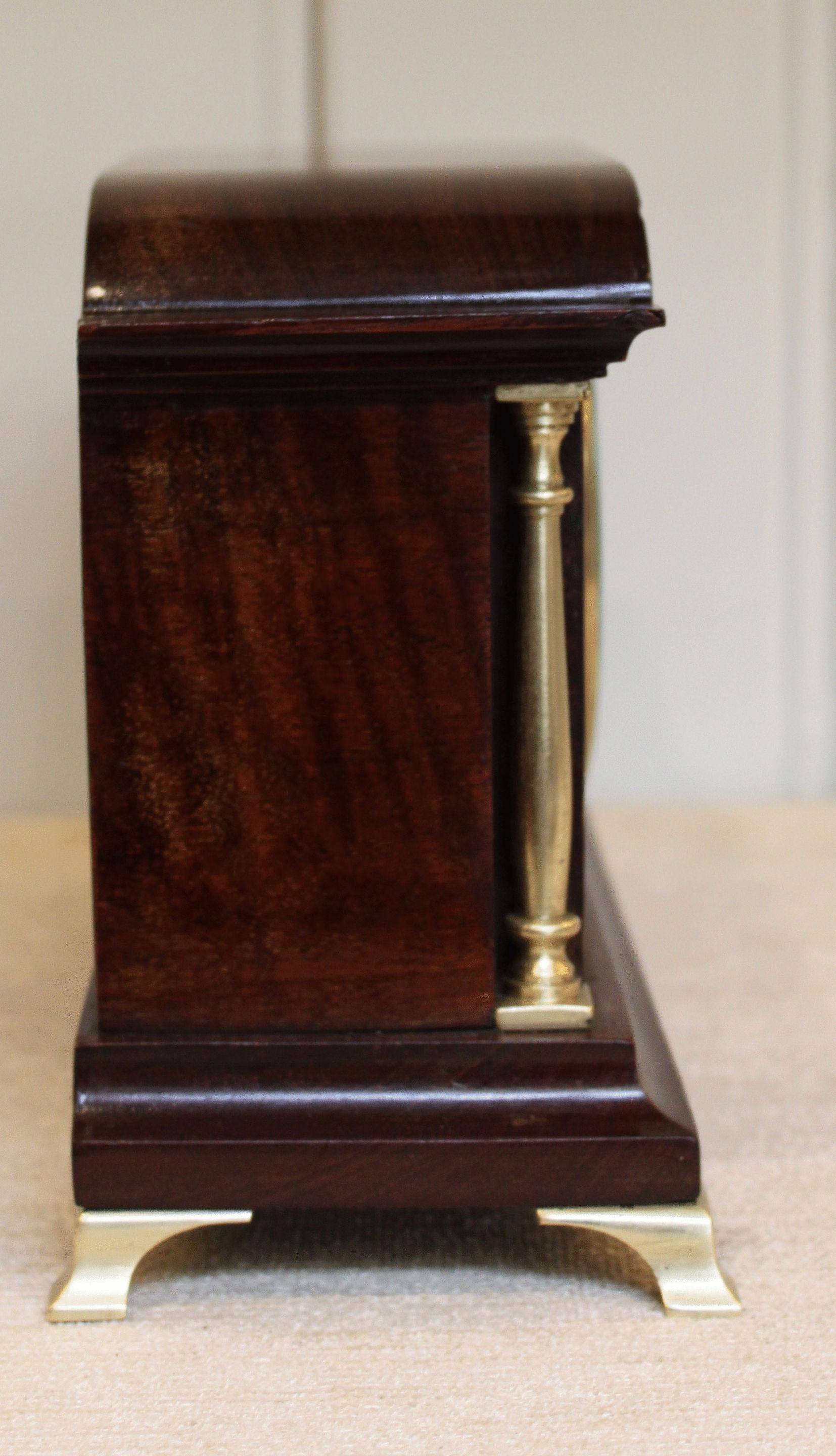 A solid mahogany mantel clock, having an elongated arch top, with brass side pilasters. The enamel dial has a thick bevel edge glass. It has a Swiss 8 day lever platform movement by Buren c.1910