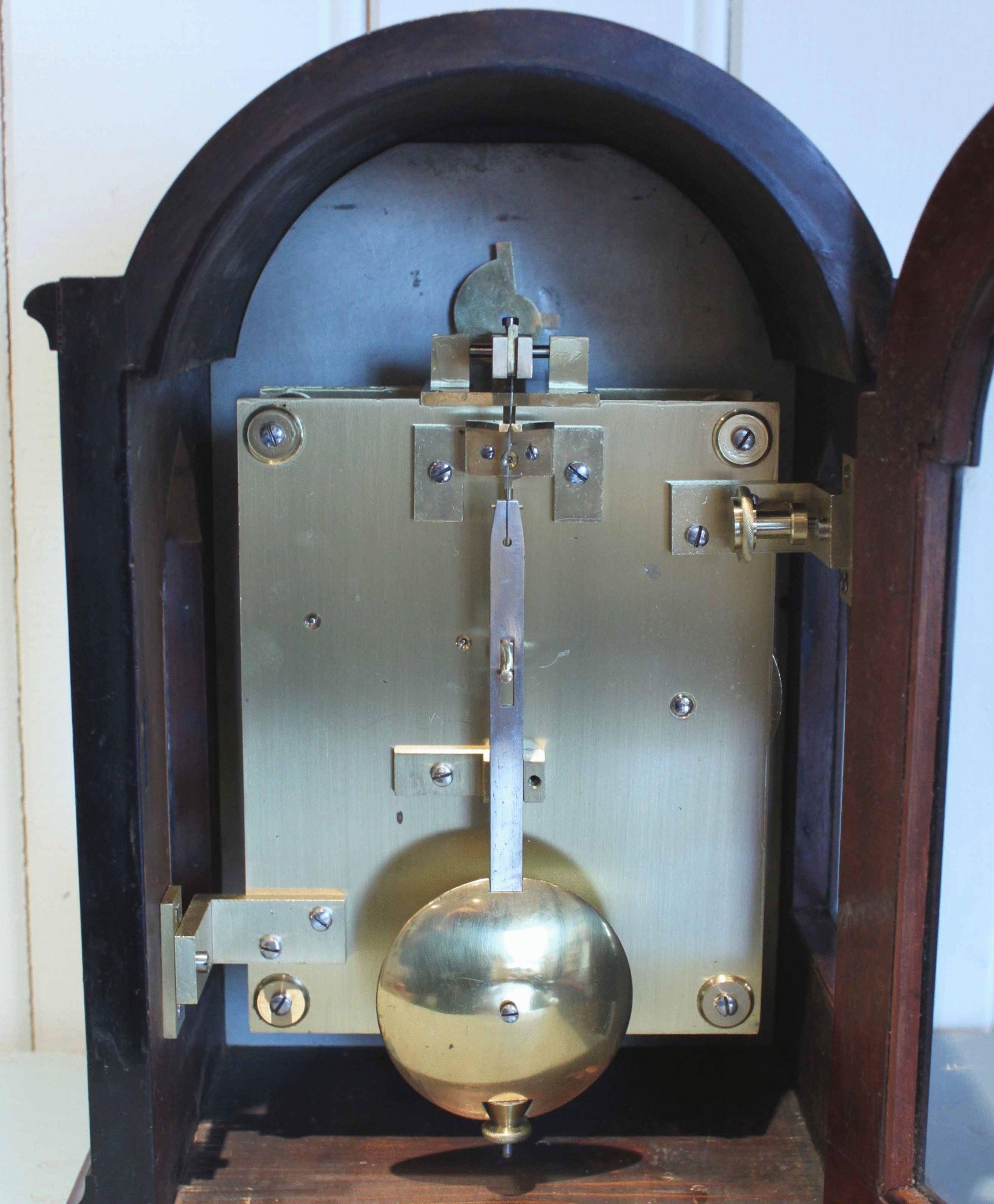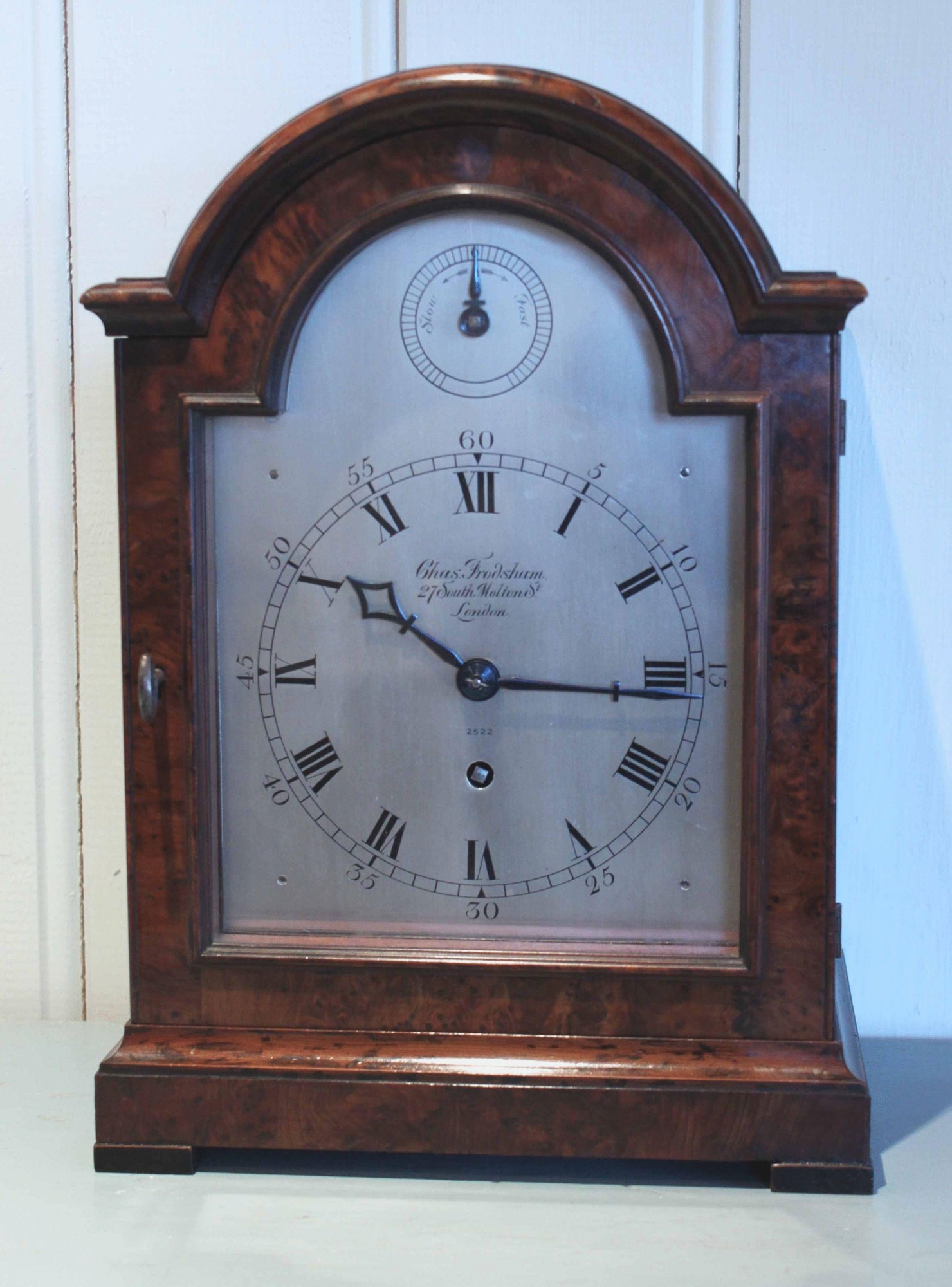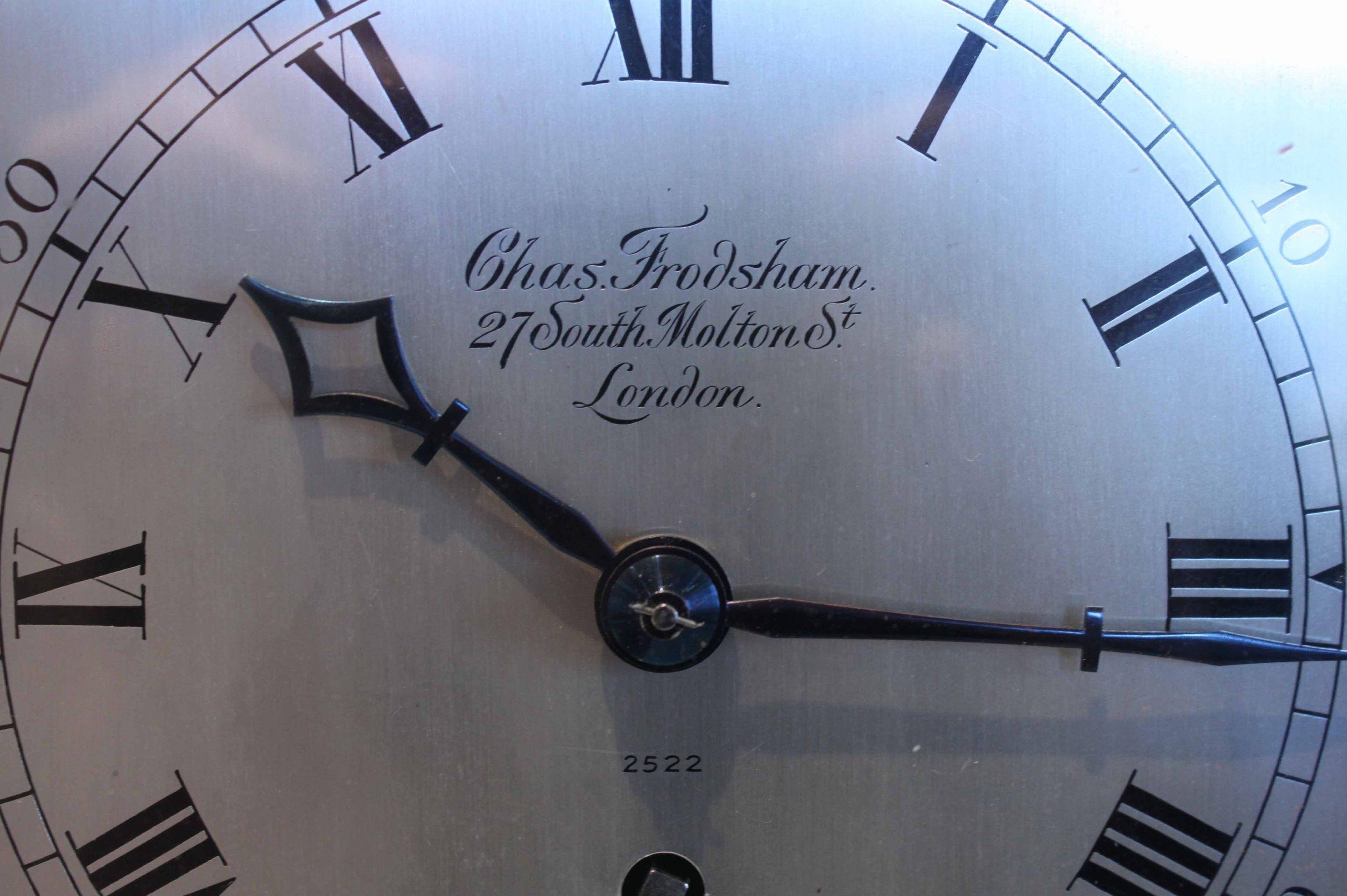 A very high quality bracket clock by Charles Frodsham. It has a figured yew wood break arch case with glazed side windows and back door. The silvered brass dial is engraved Chas. Frodsham, 27 South Molton St. London. numbered 2522. The dial has a pendulum rise and fall regulation scale within the arch. It has a very heavily engineered 8 day chain fusee timepiece movement, with a pendulum holdfast for transportation. Complete with original winder.